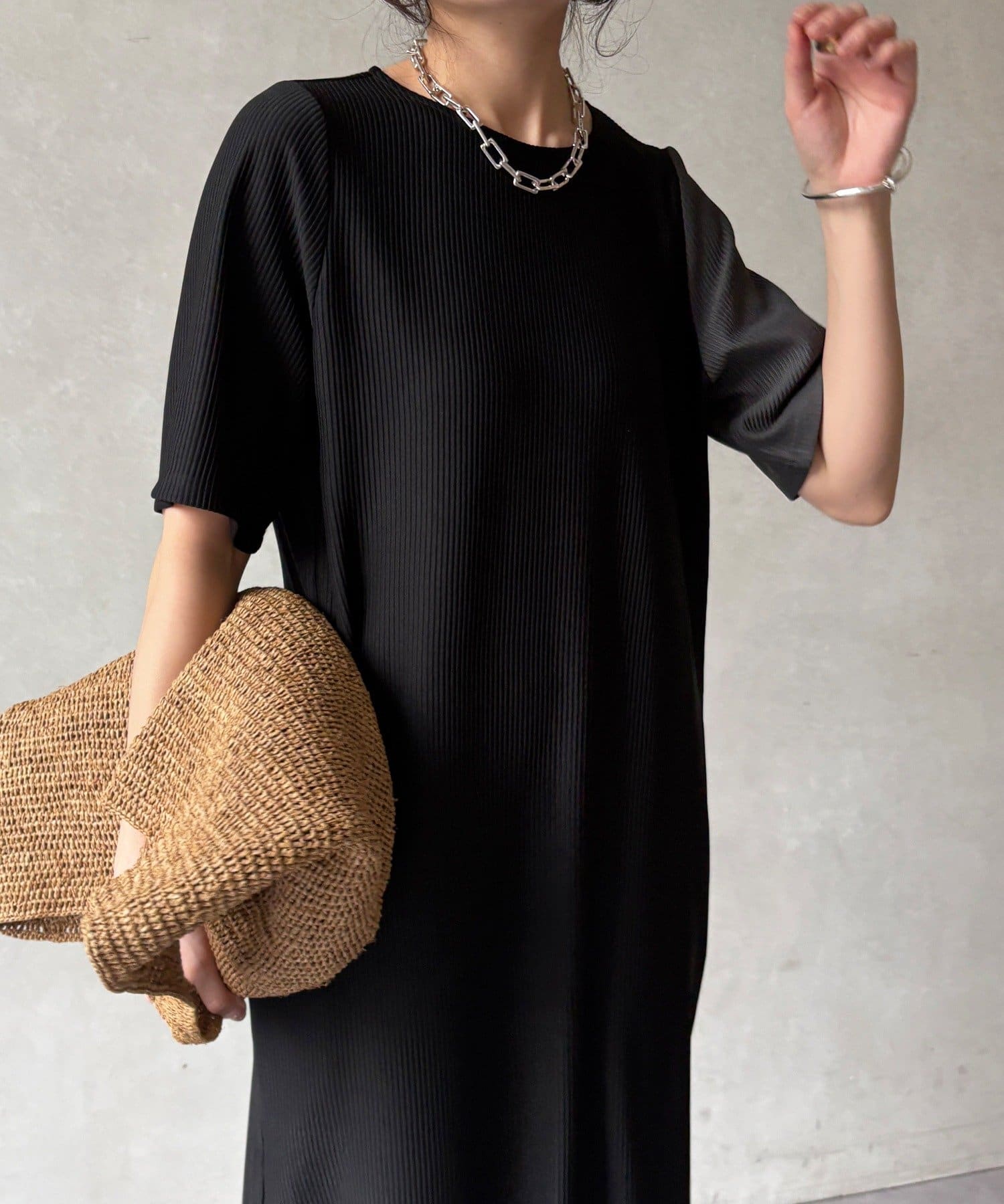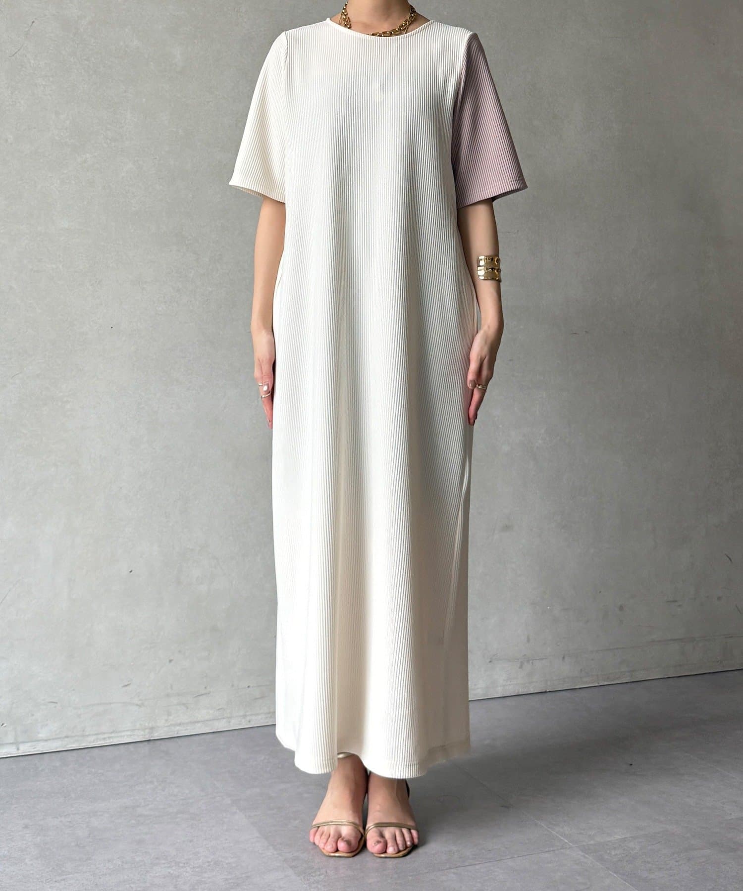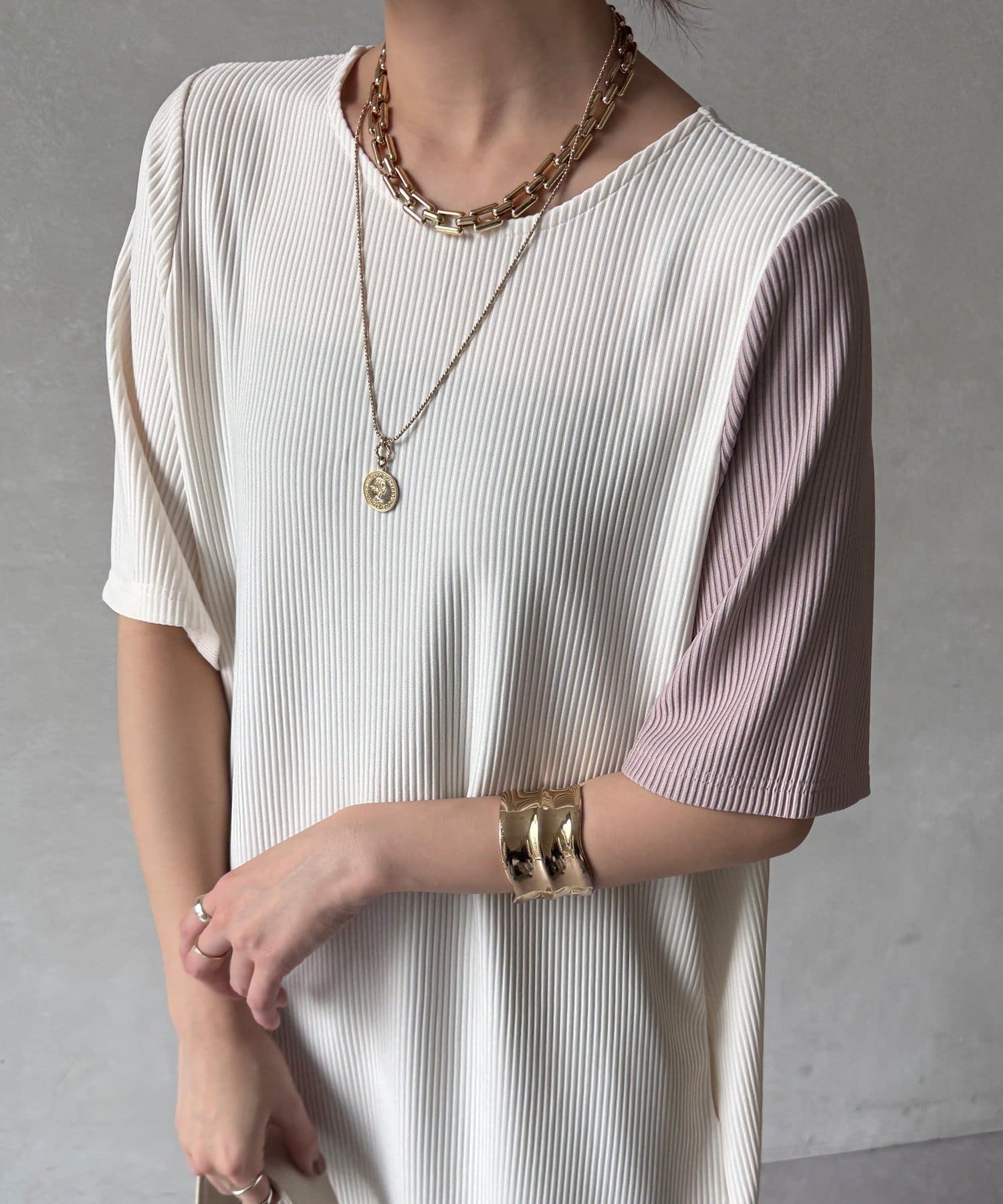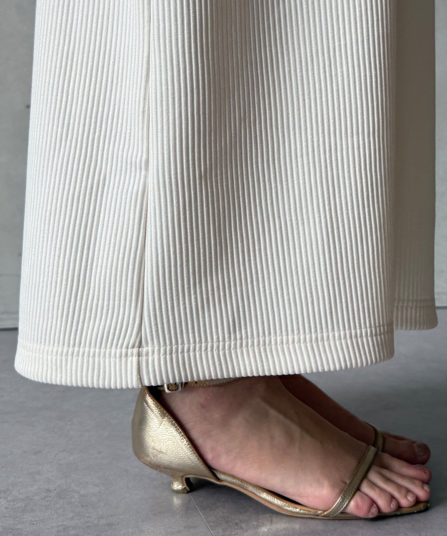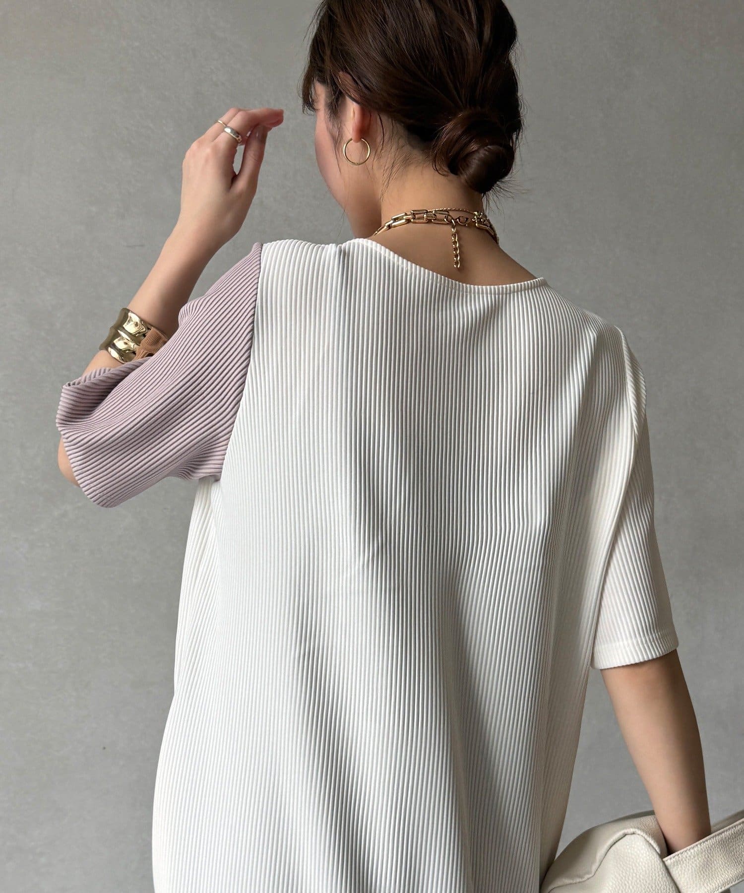 伸縮性のある柔らかいカットソー生地に、細かい縦方向のプリーツ加工を施した素材で、軽やかで動きのあるシルエットが特長。