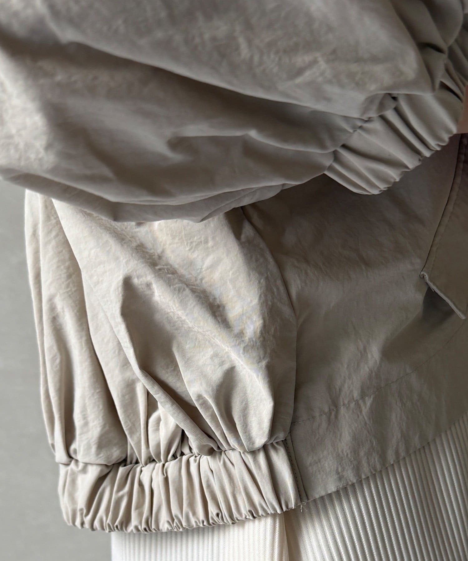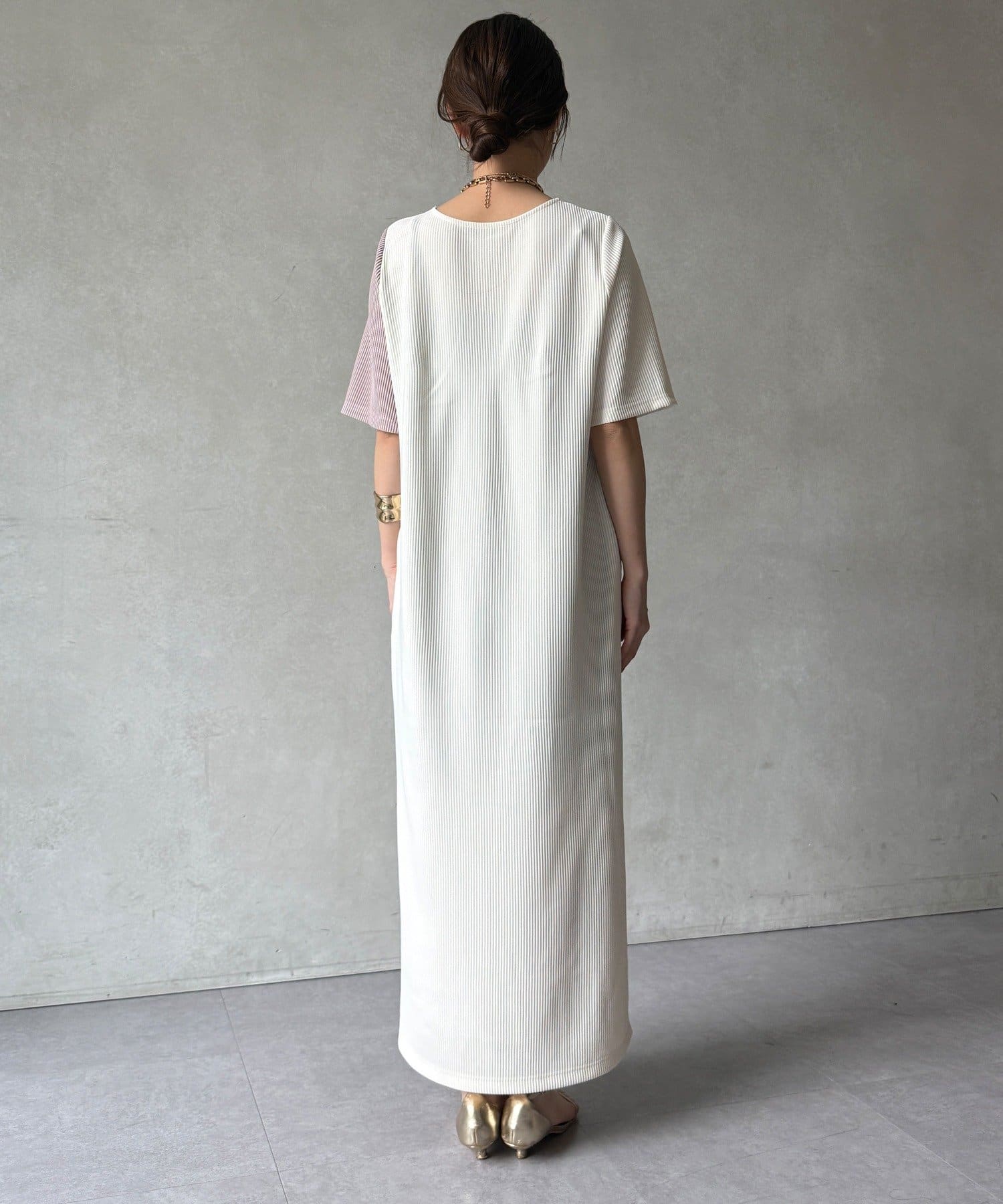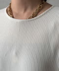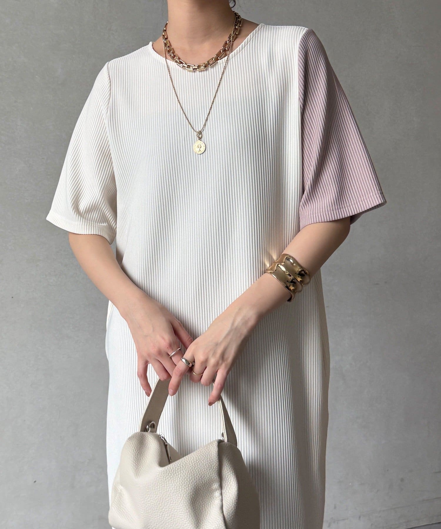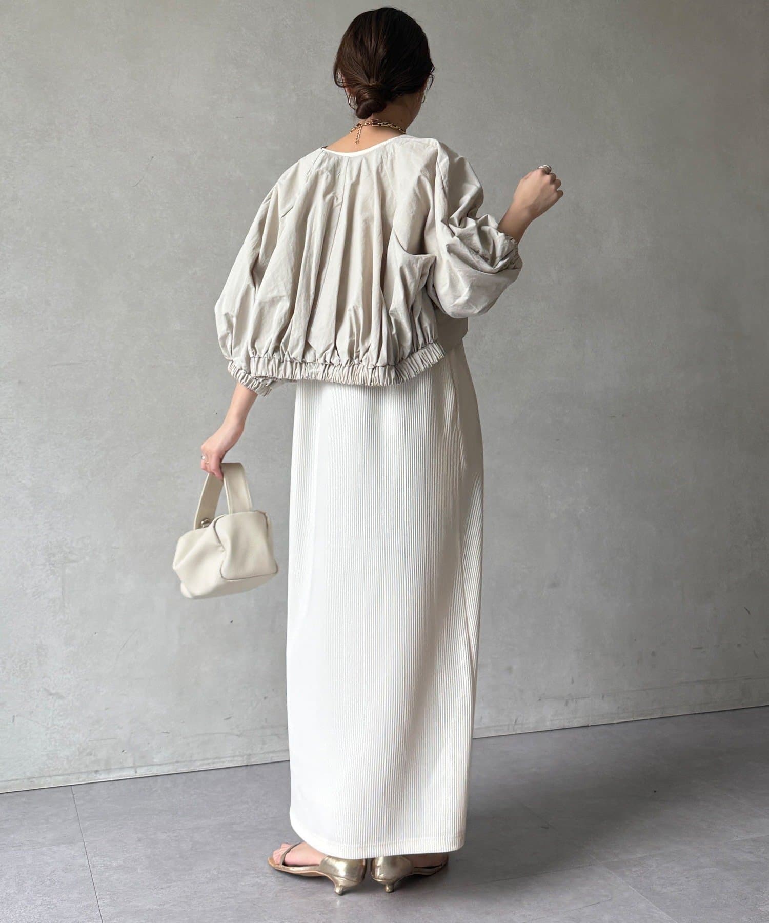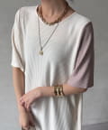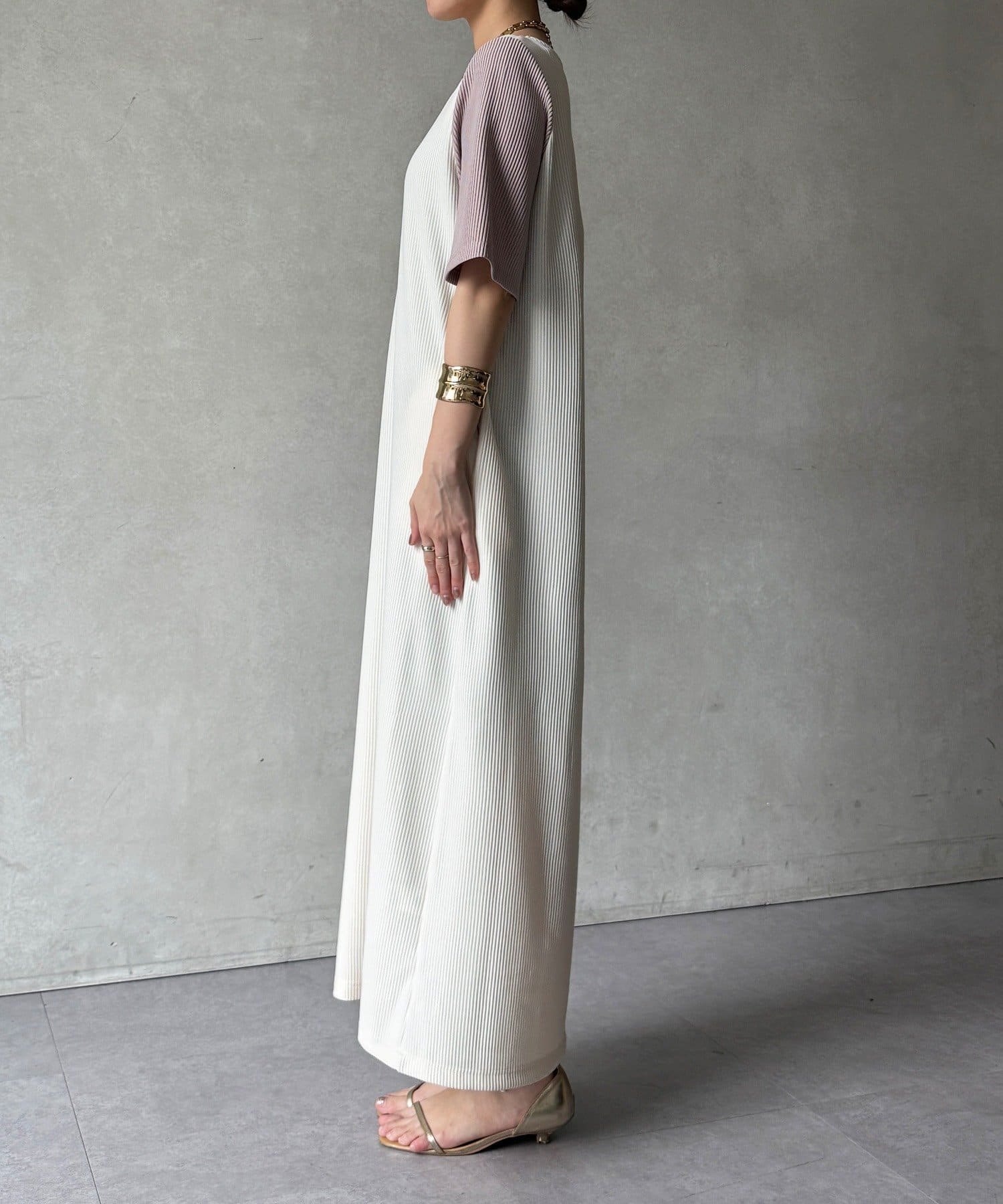 伸縮性のある柔らかいカットソー生地に、細かい縦方向のプリーツ加工を施した素材で、軽やかで動きのあるシルエットが特長。