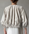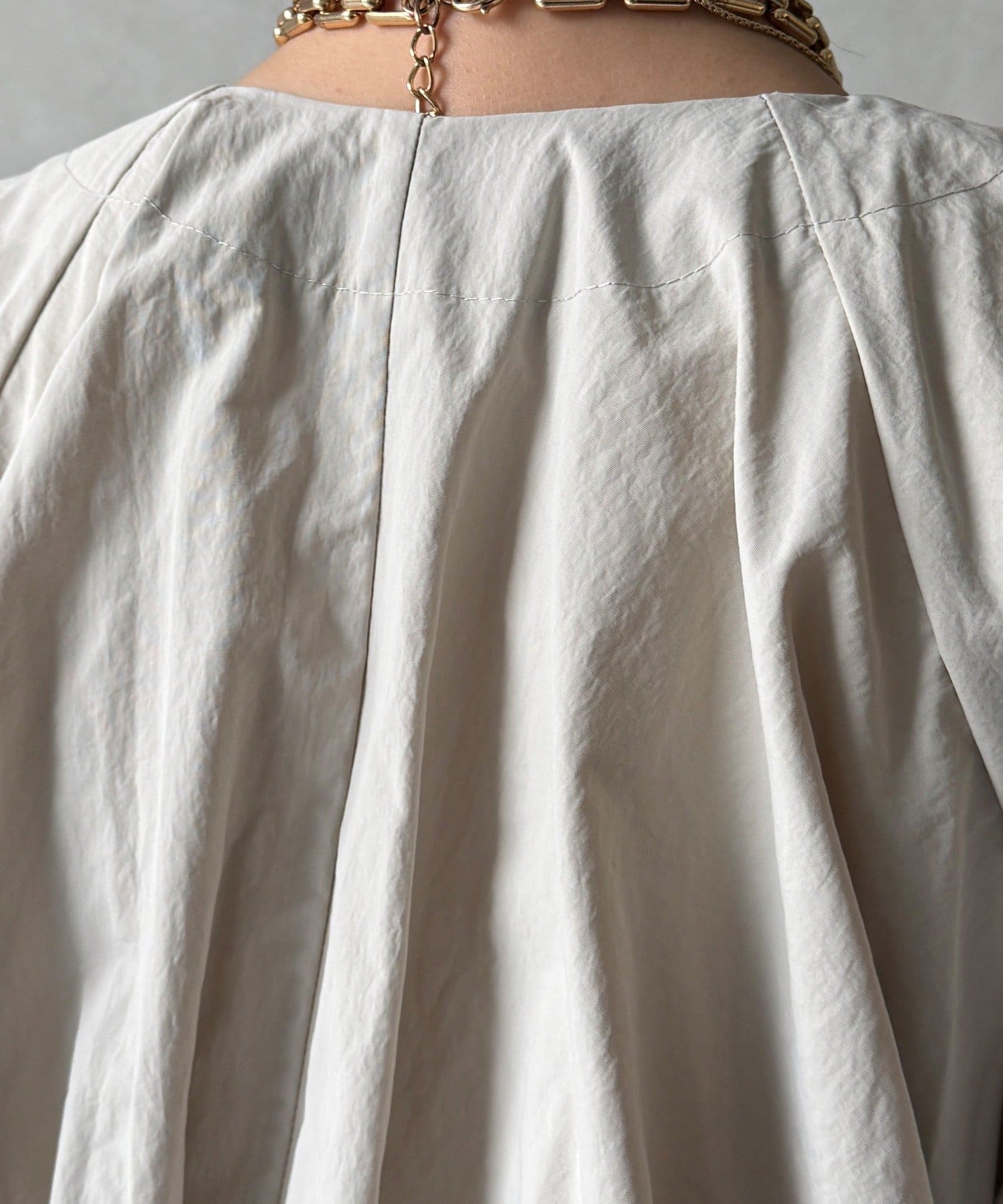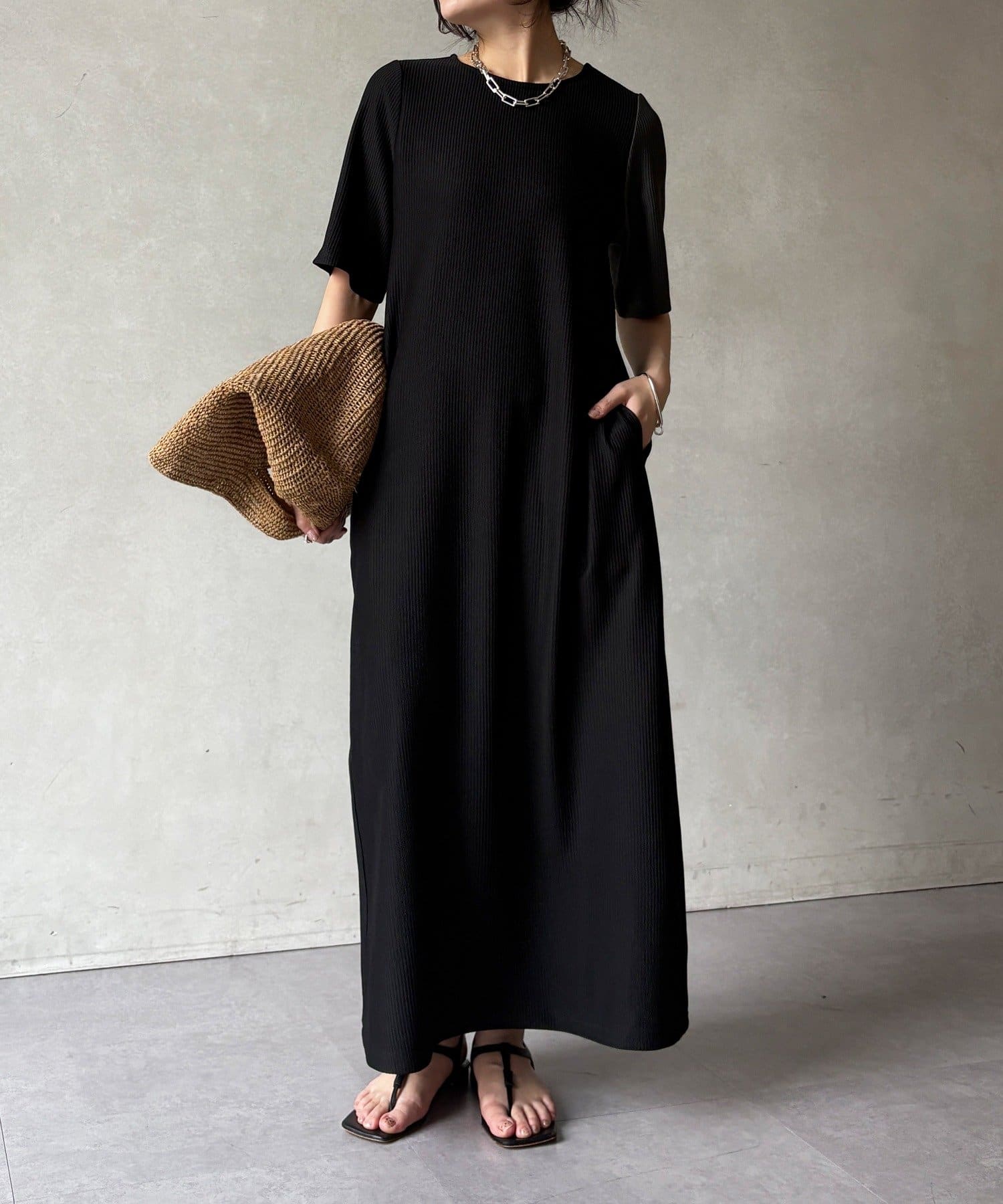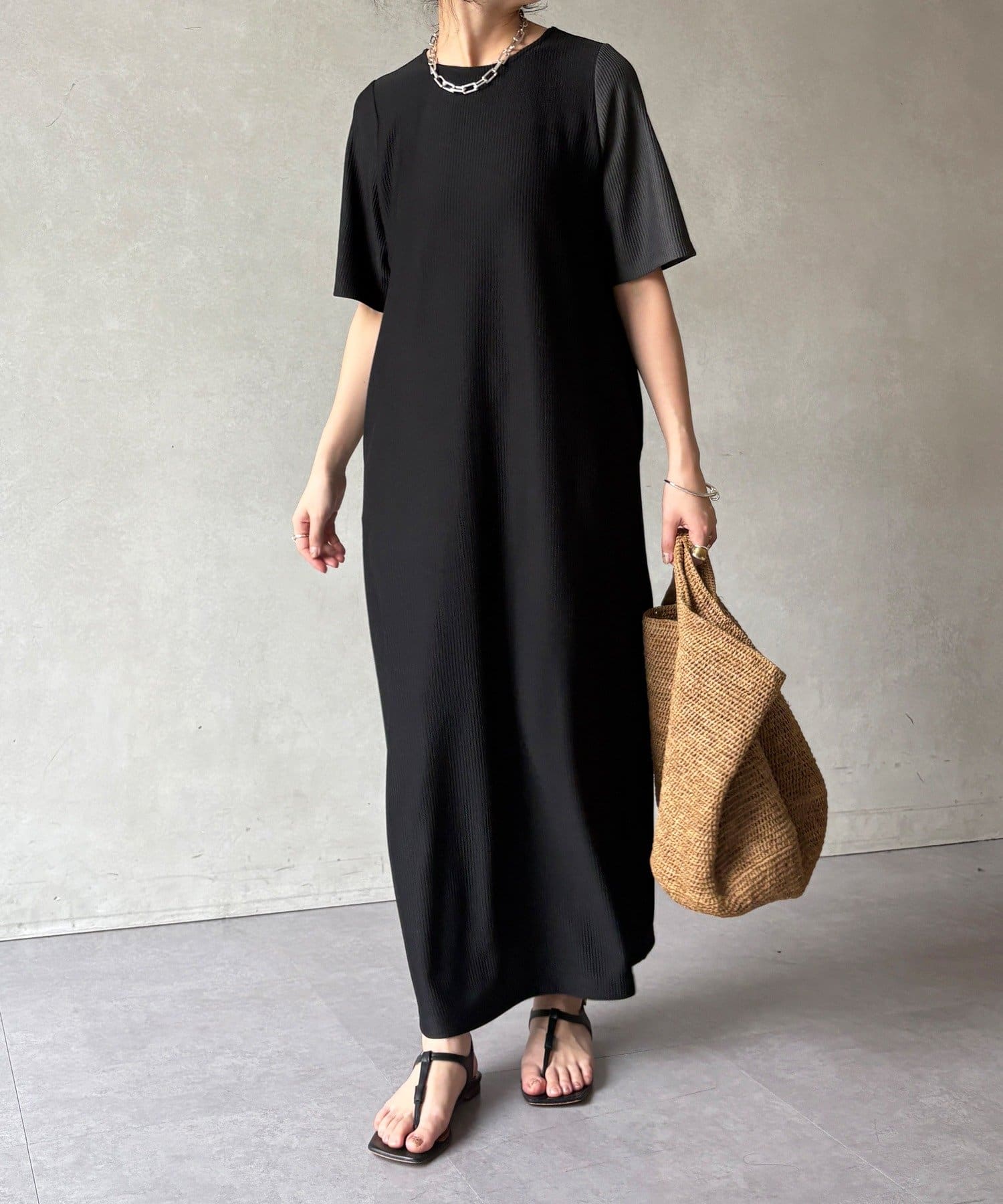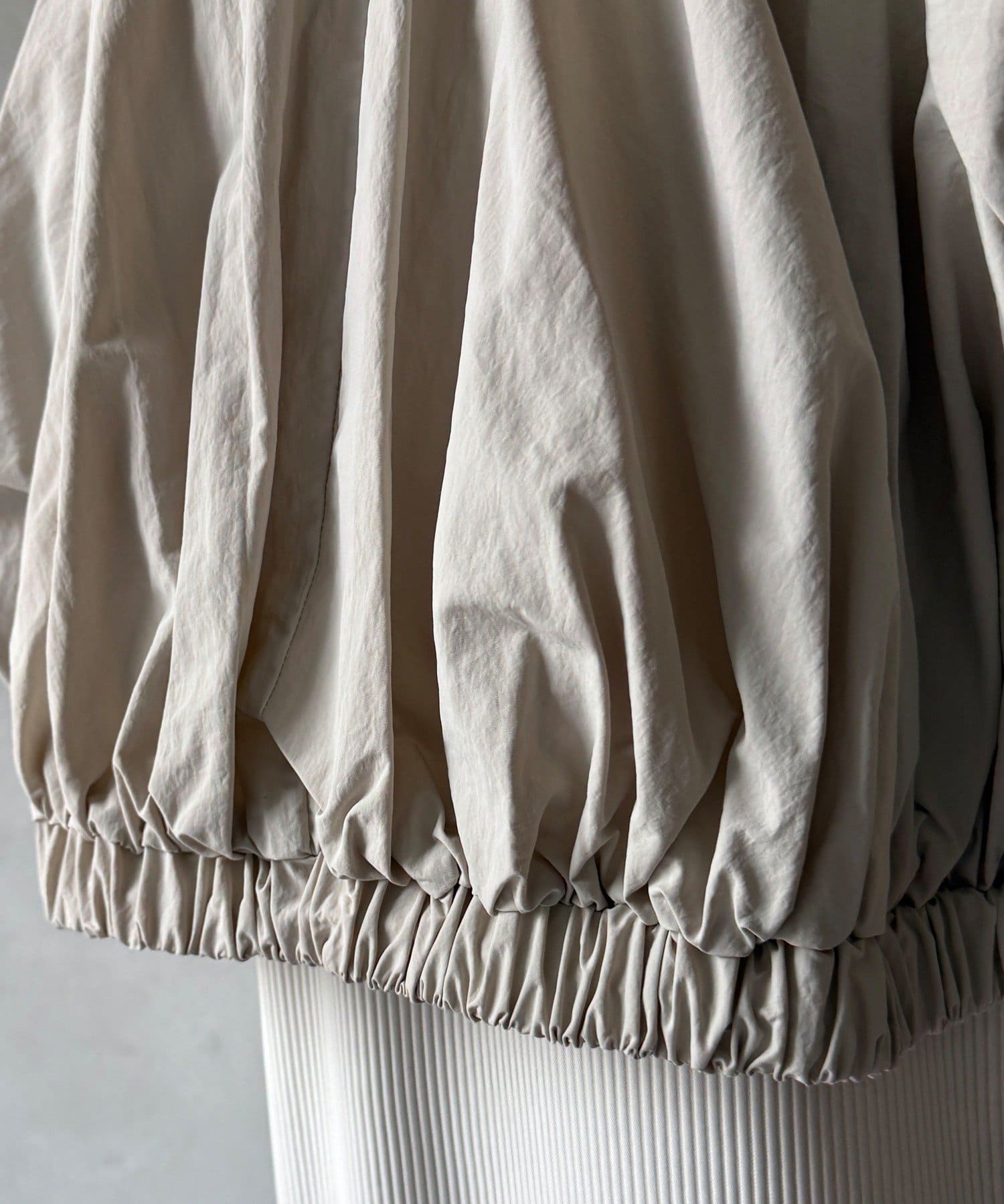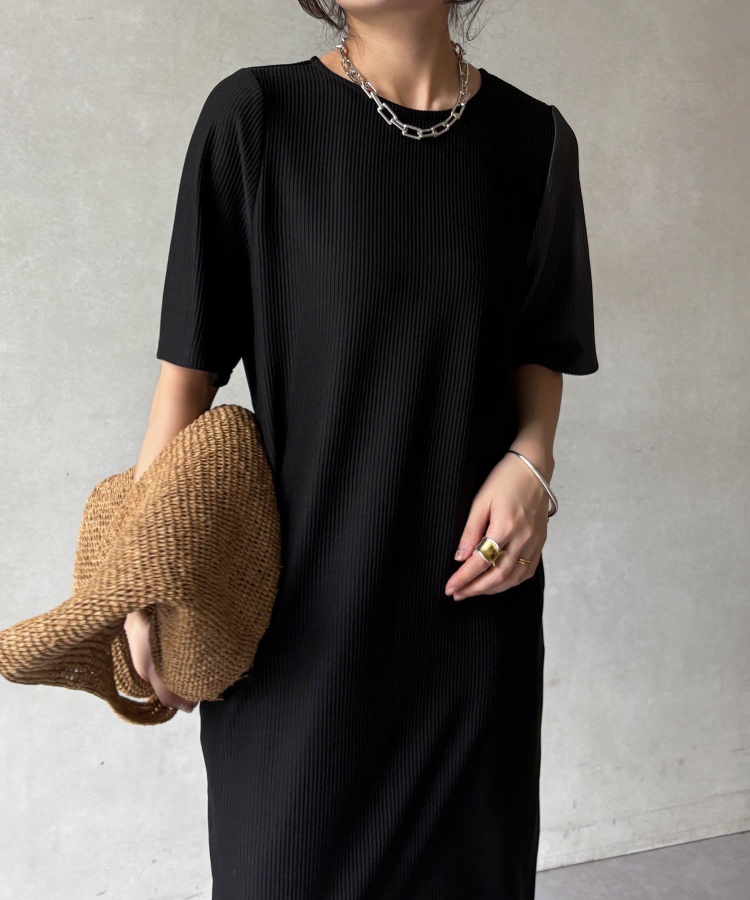 伸縮性のある柔らかいカットソー生地に、細かい縦方向のプリーツ加工を施した素材で、軽やかで動きのあるシルエットが特長。