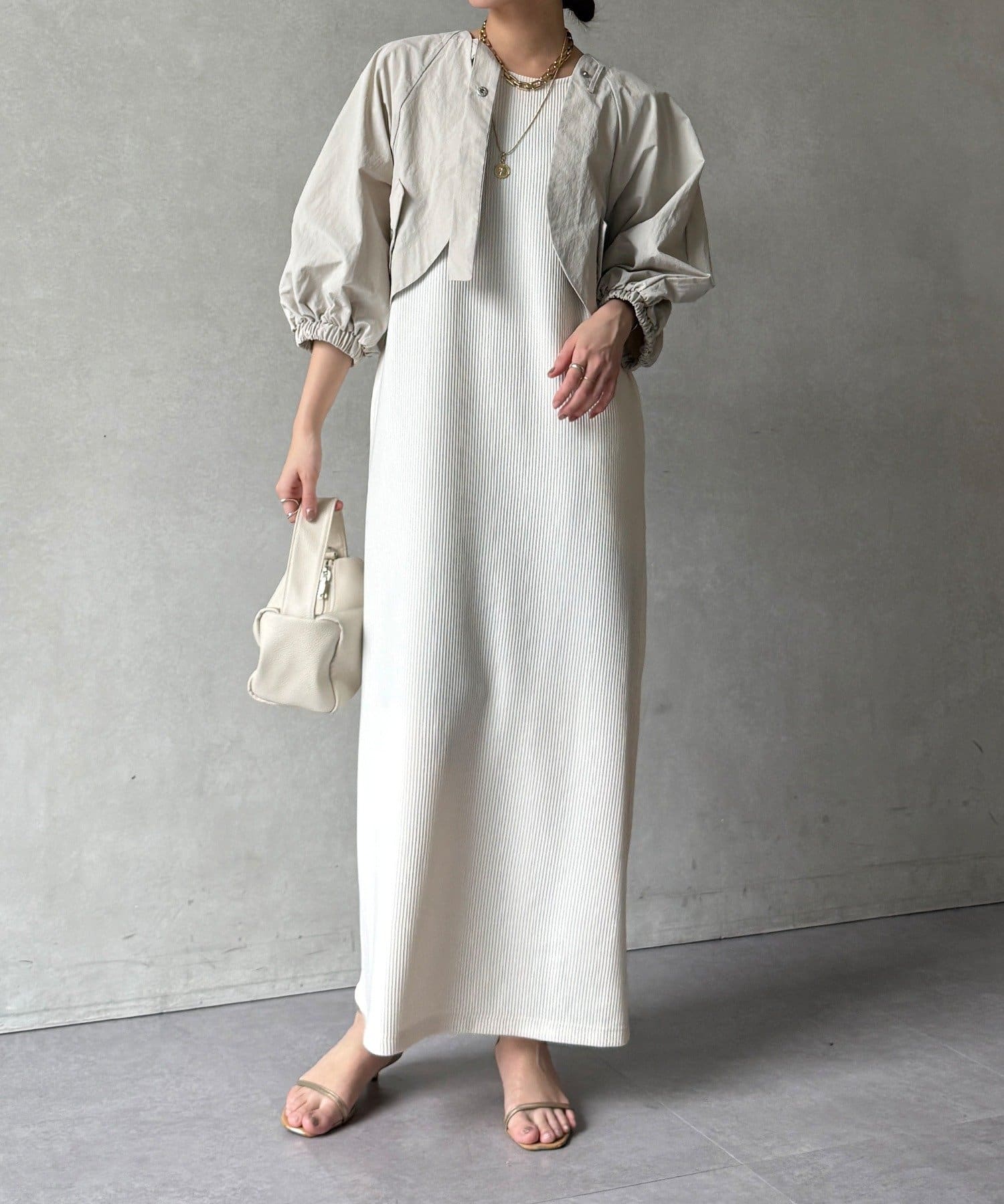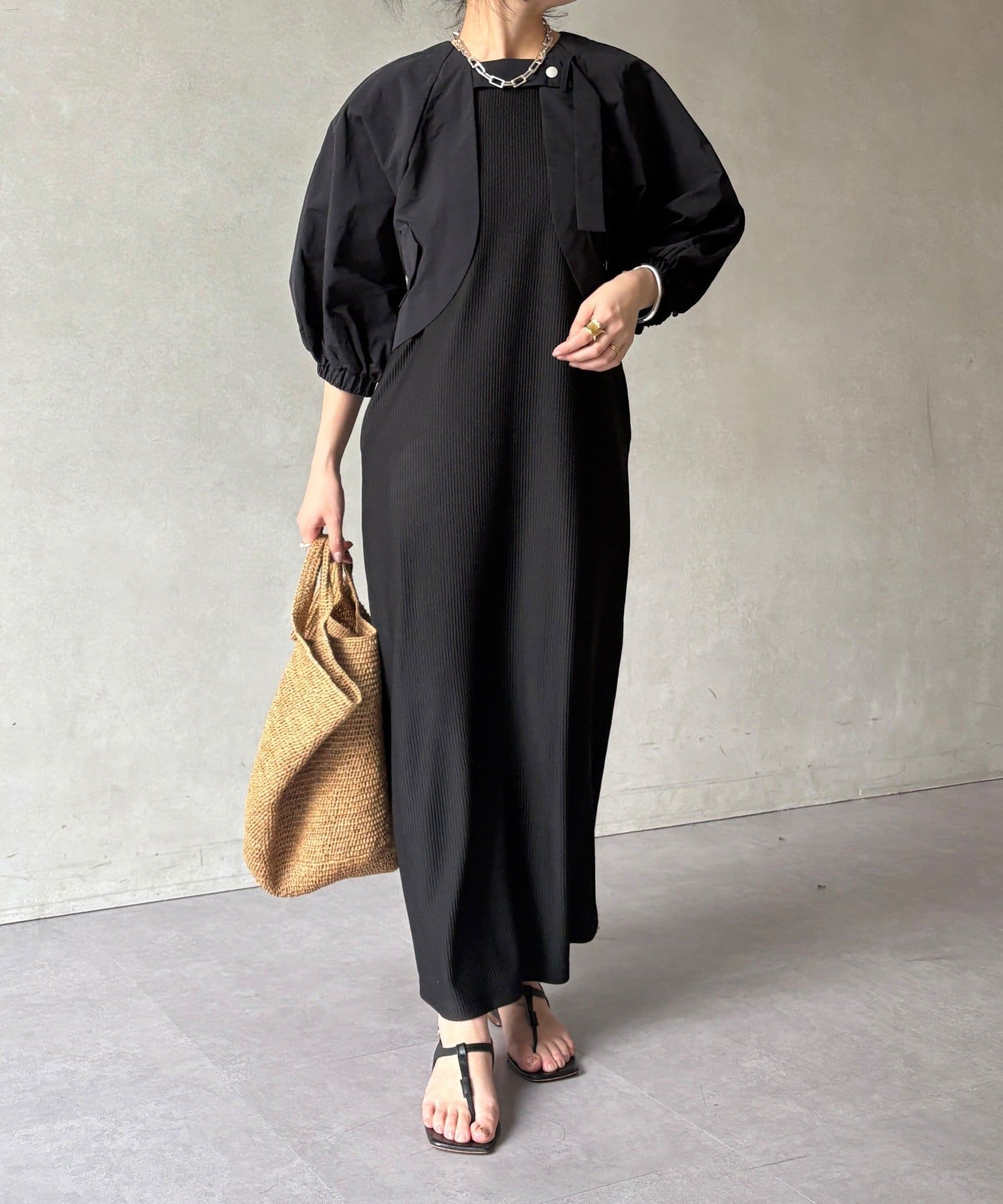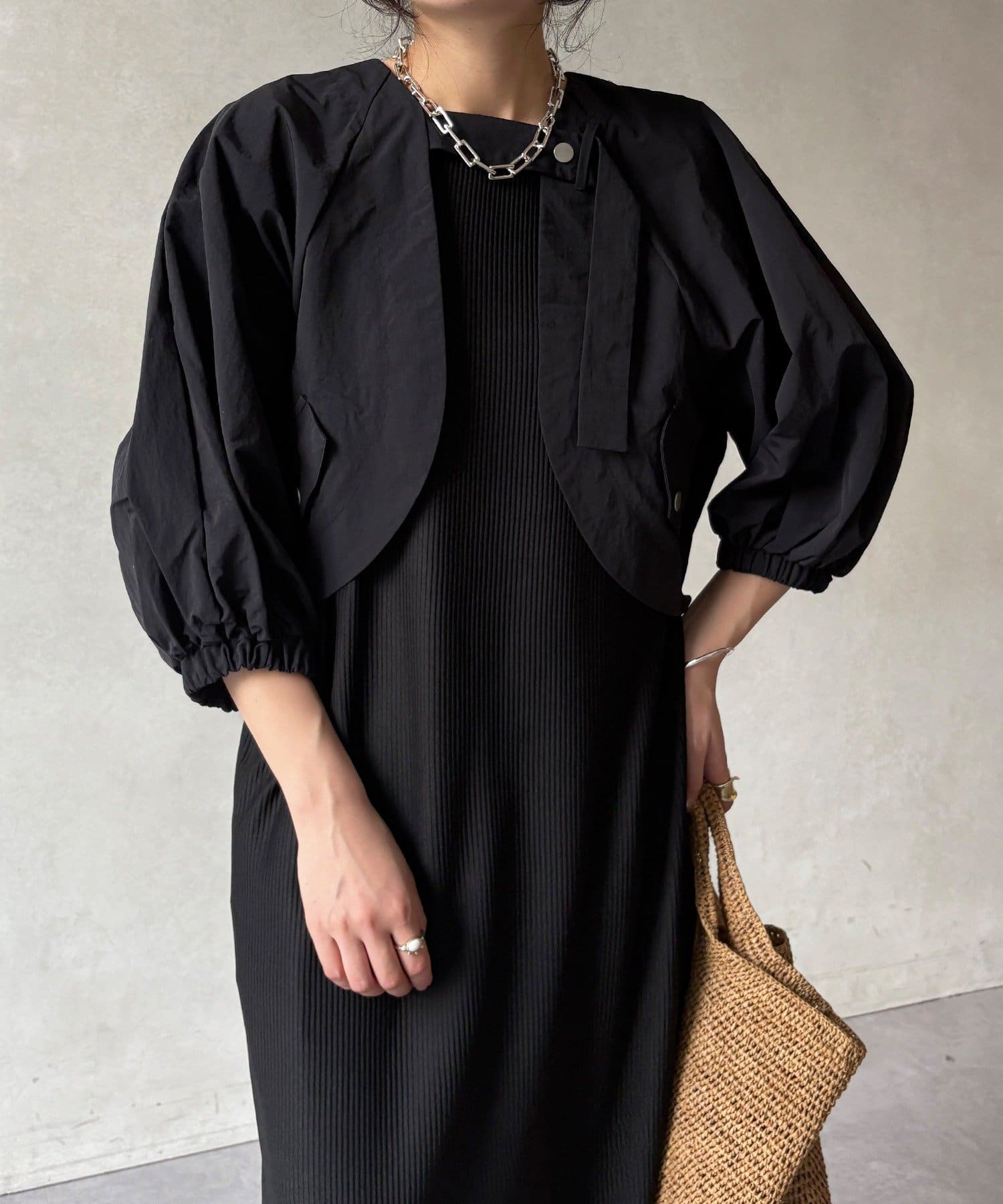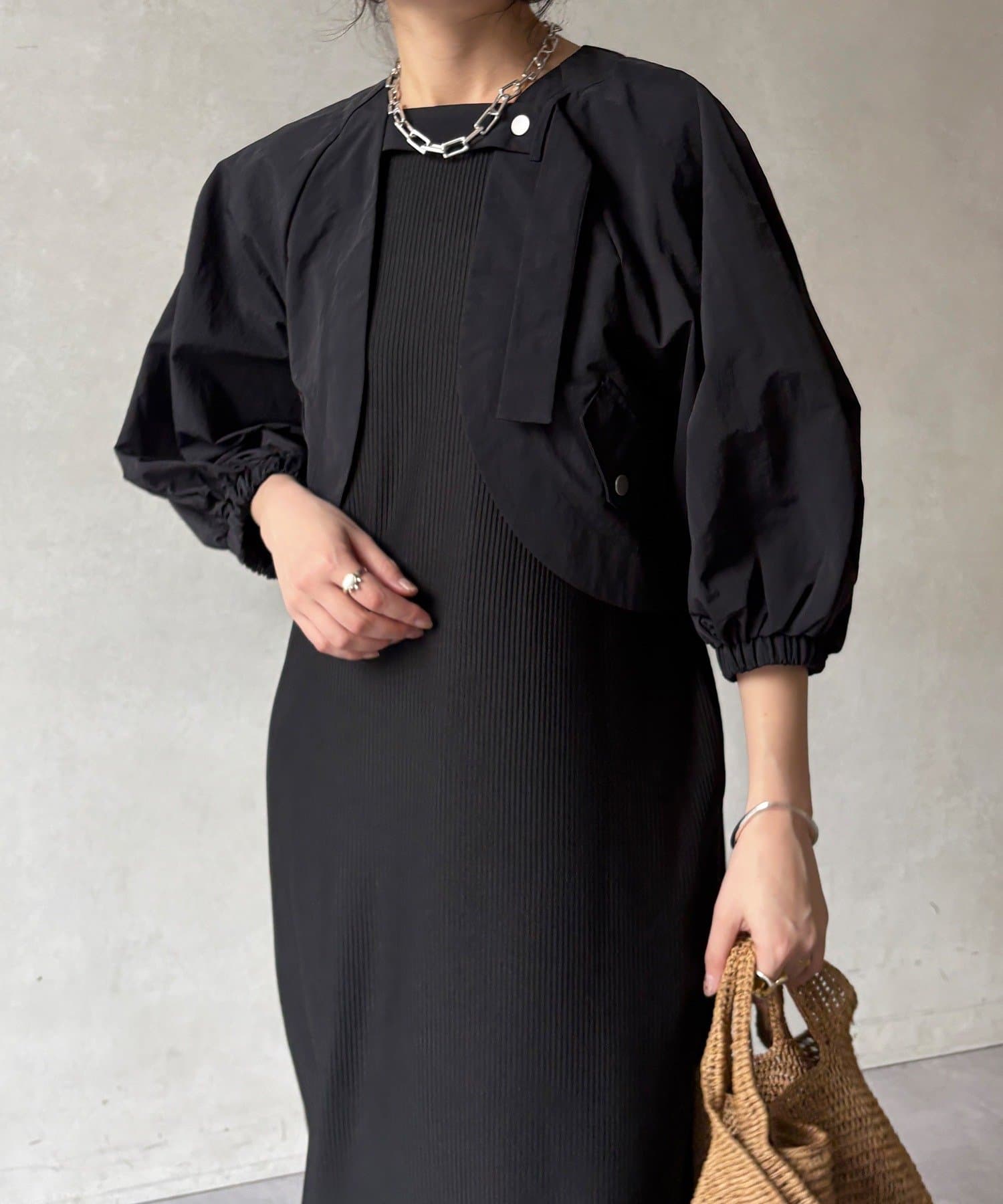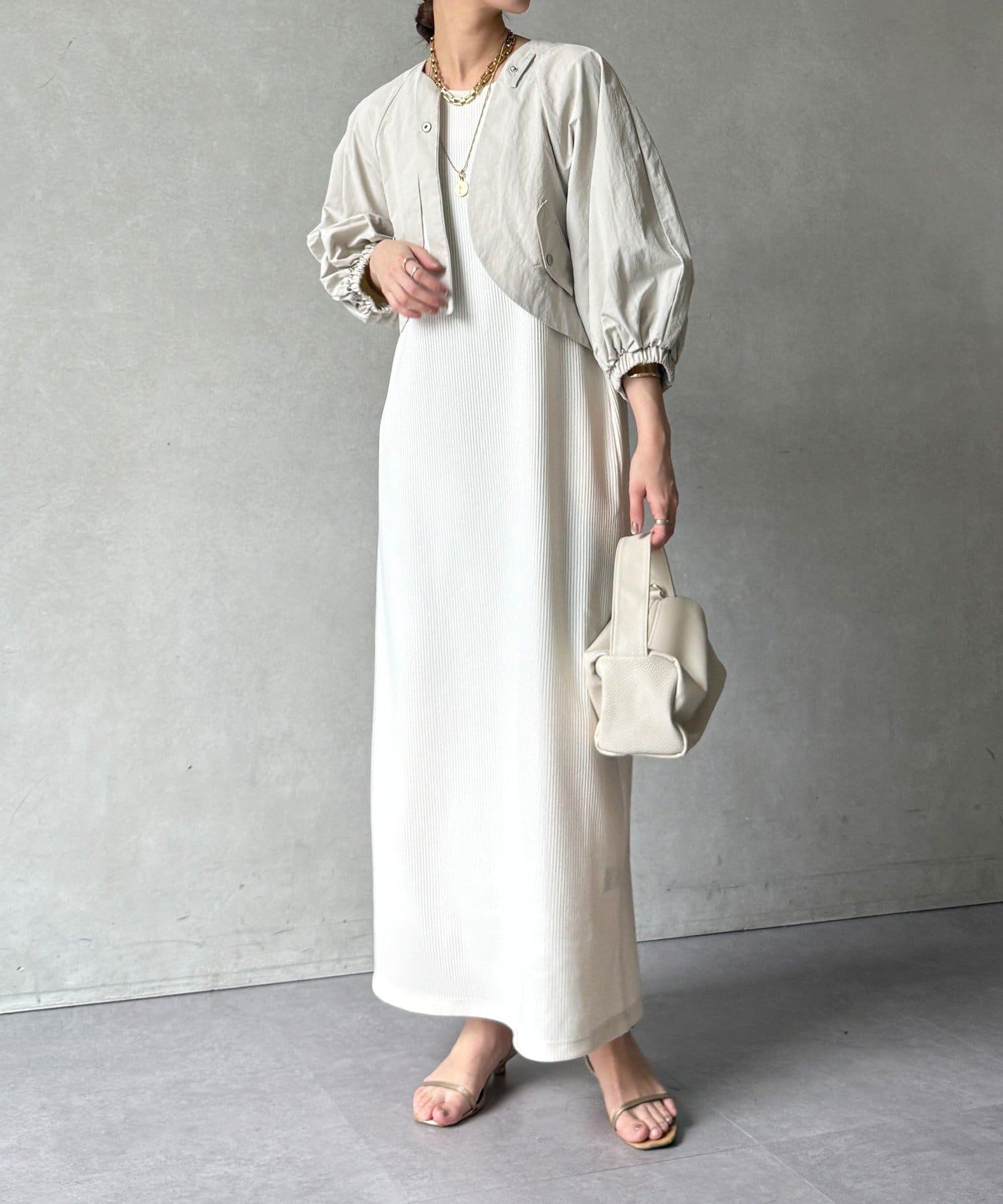 ボレロとワンピースがセットになった、着回し力の高い一枚。
