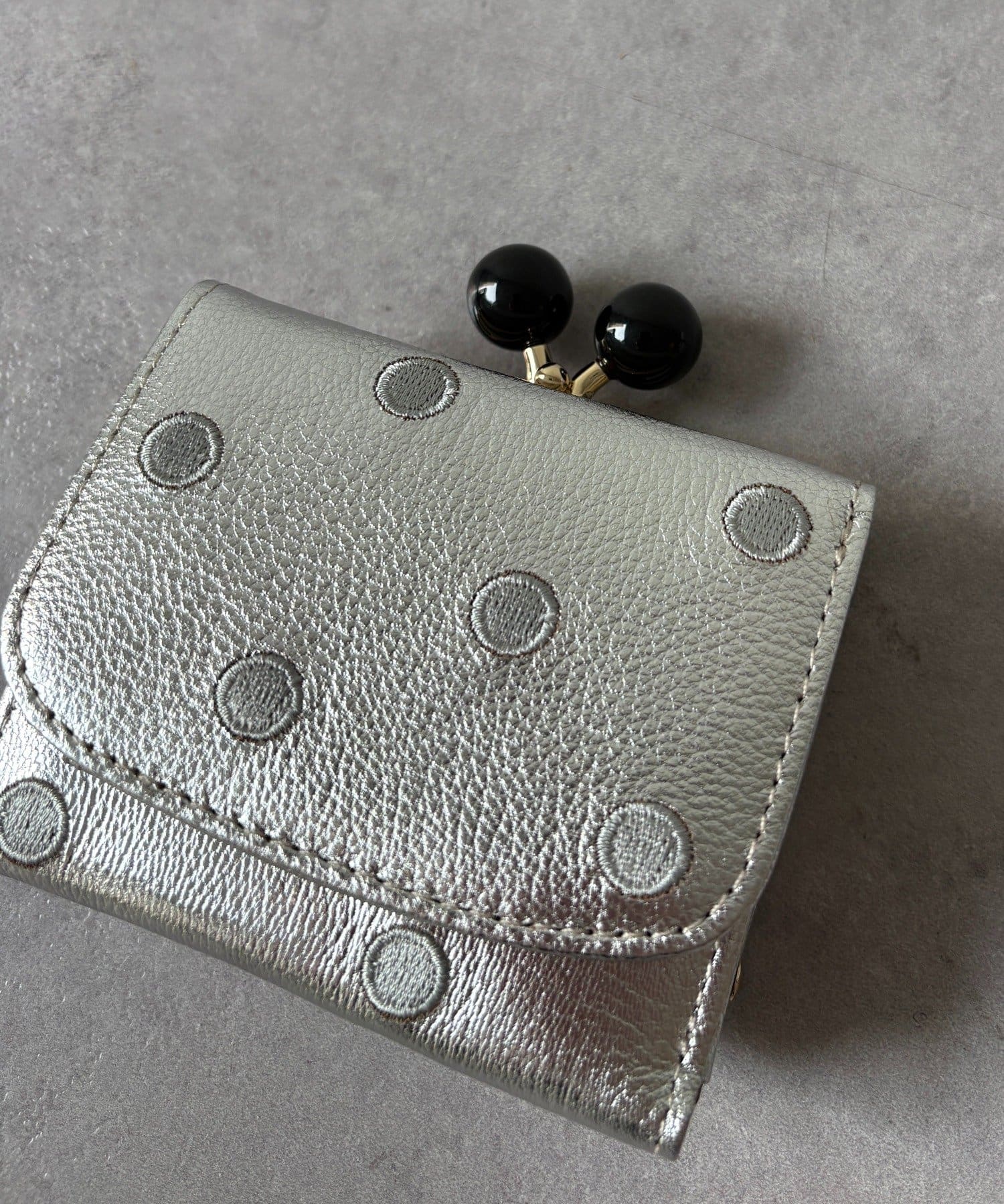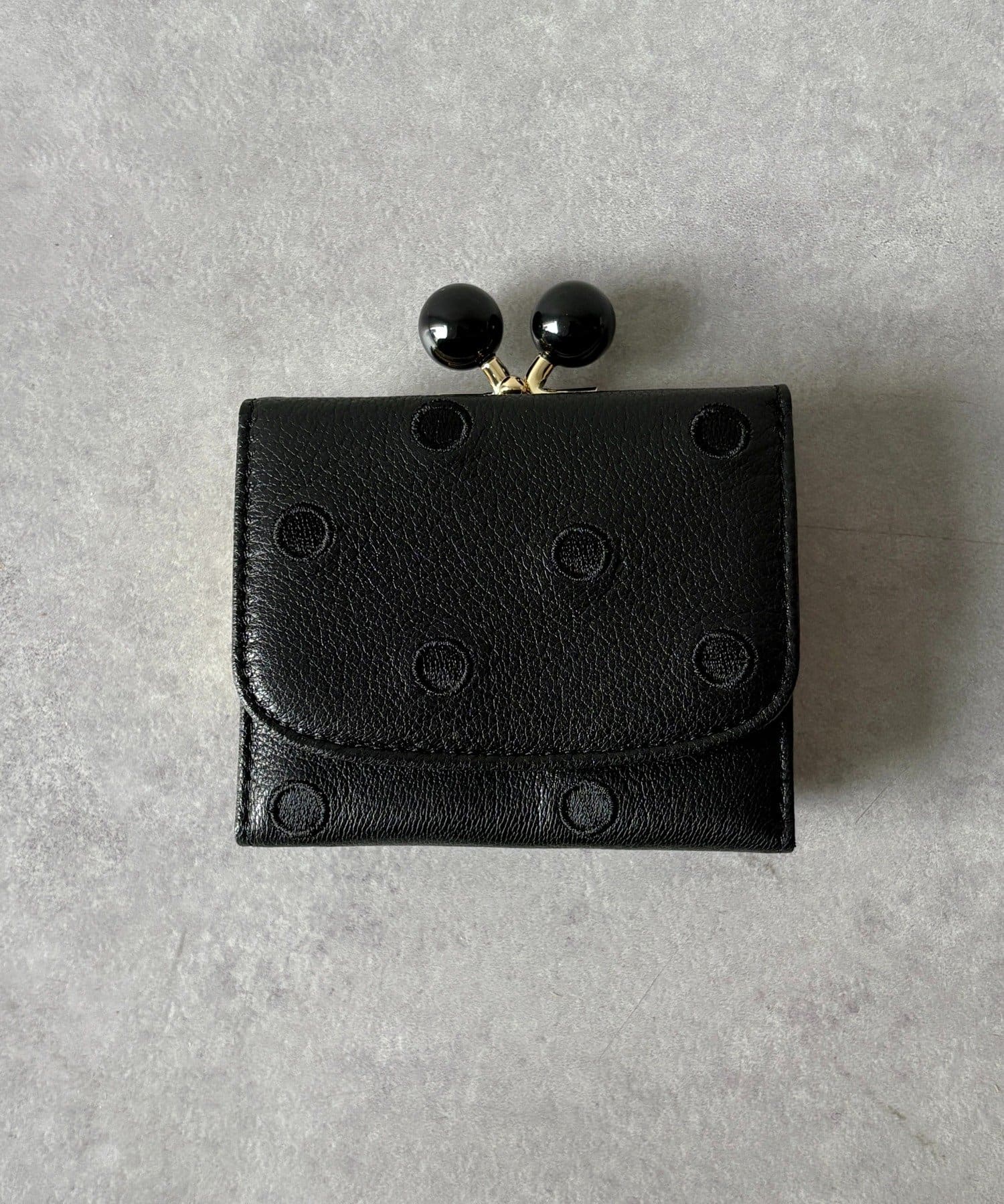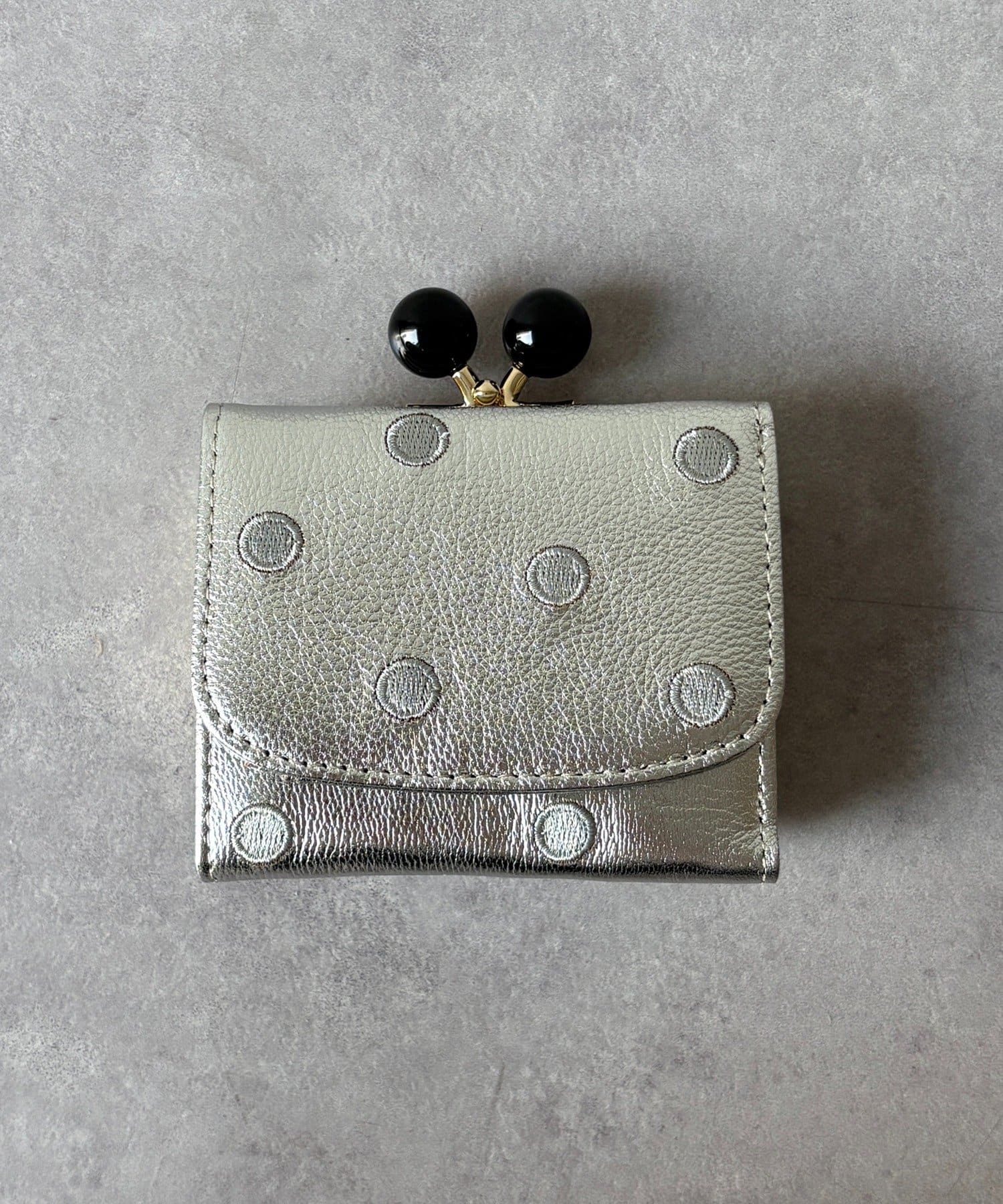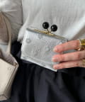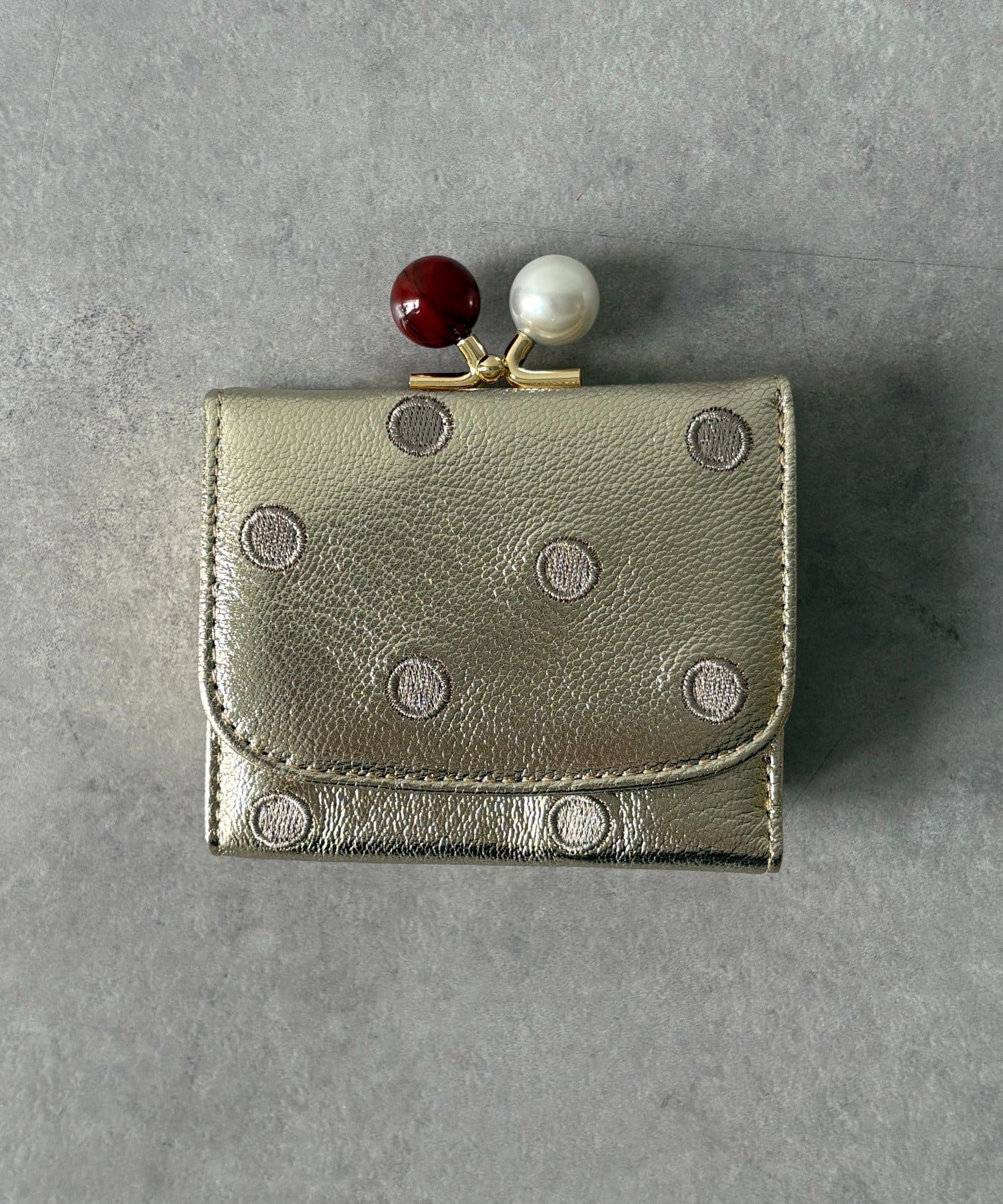 ころんとしたアクリル玉のがま口が目を引くアクリル玉3つ折りウォレット。