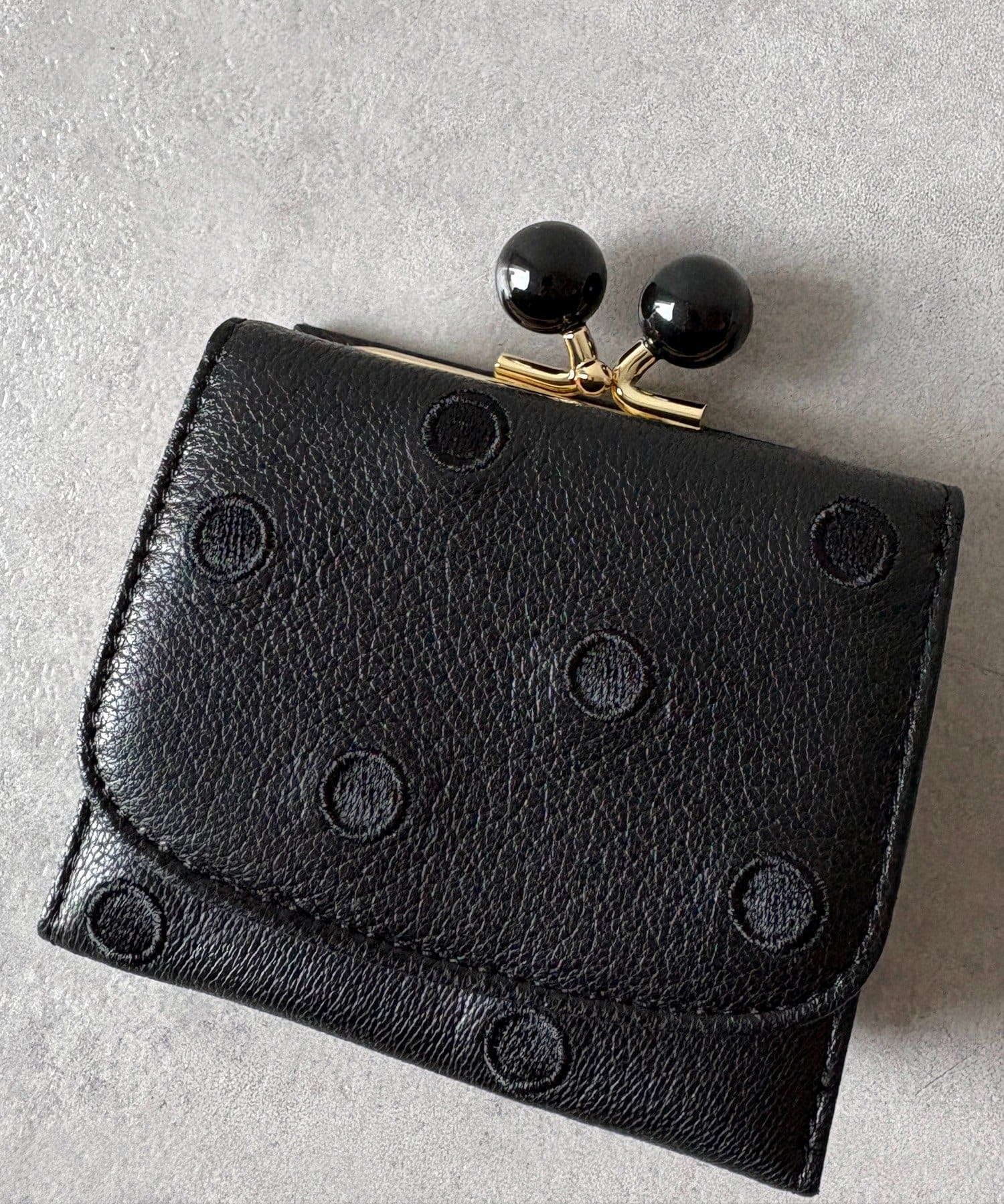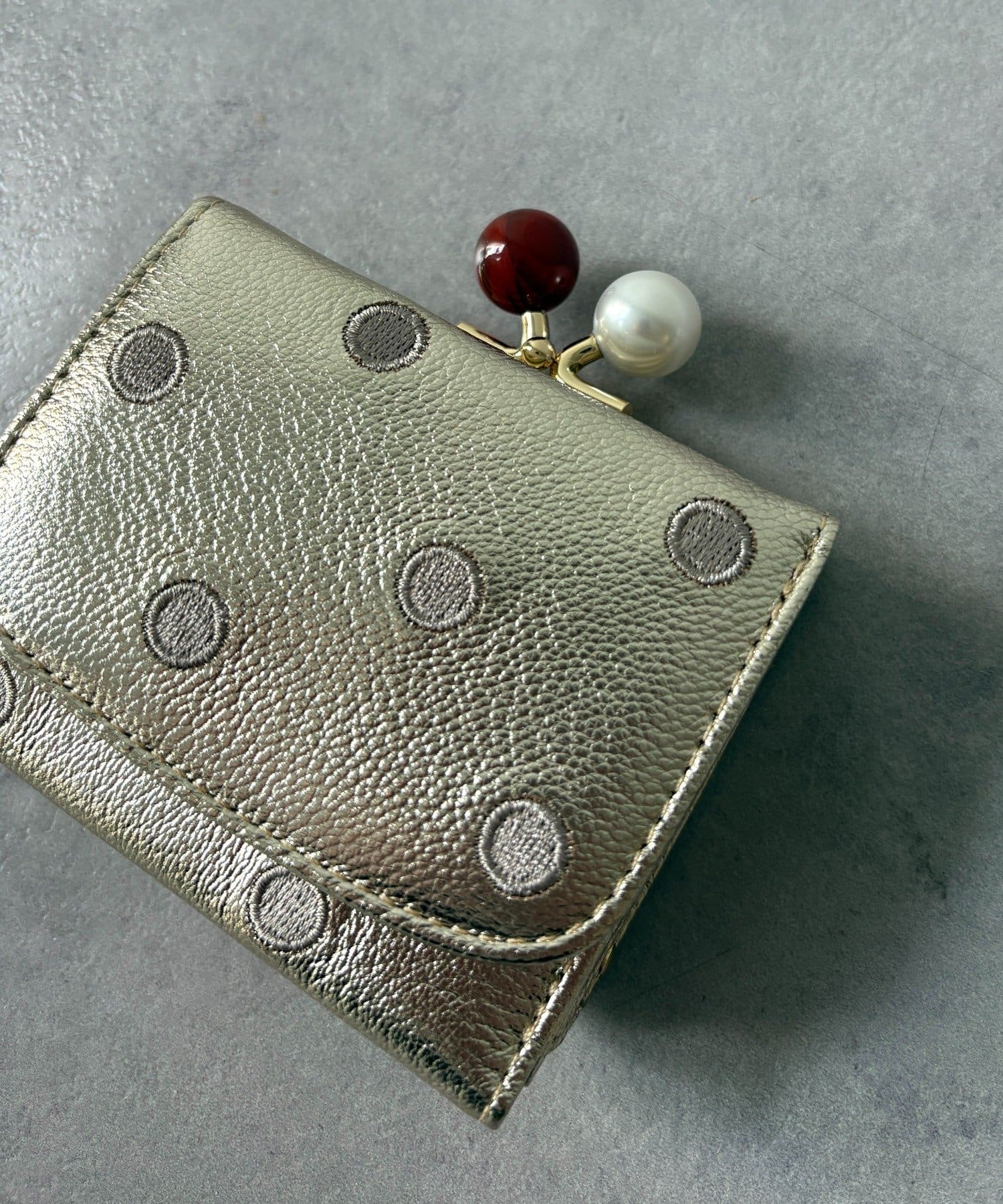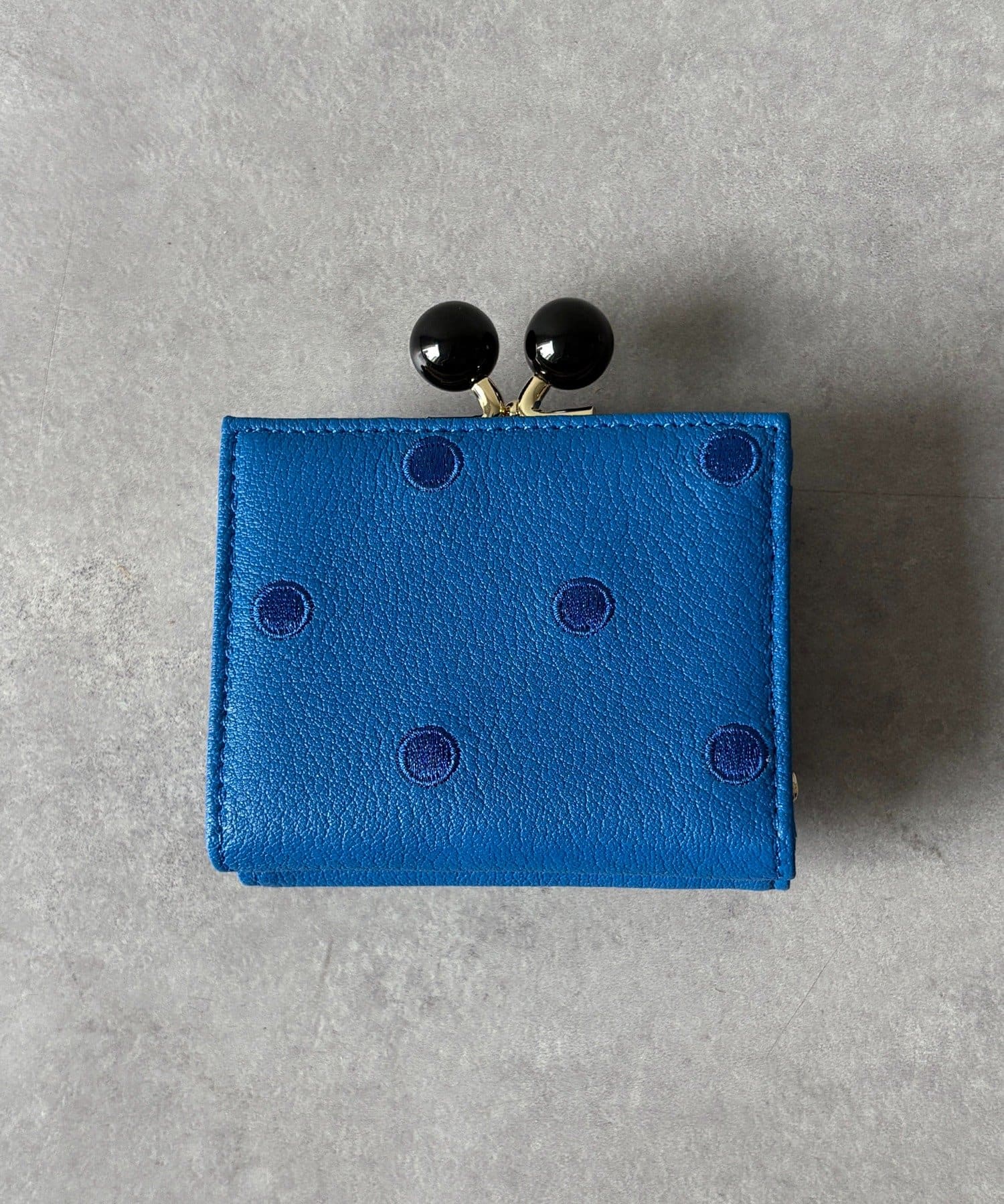 ころんとしたアクリル玉のがま口が目を引くアクリル玉3つ折りウォレット。