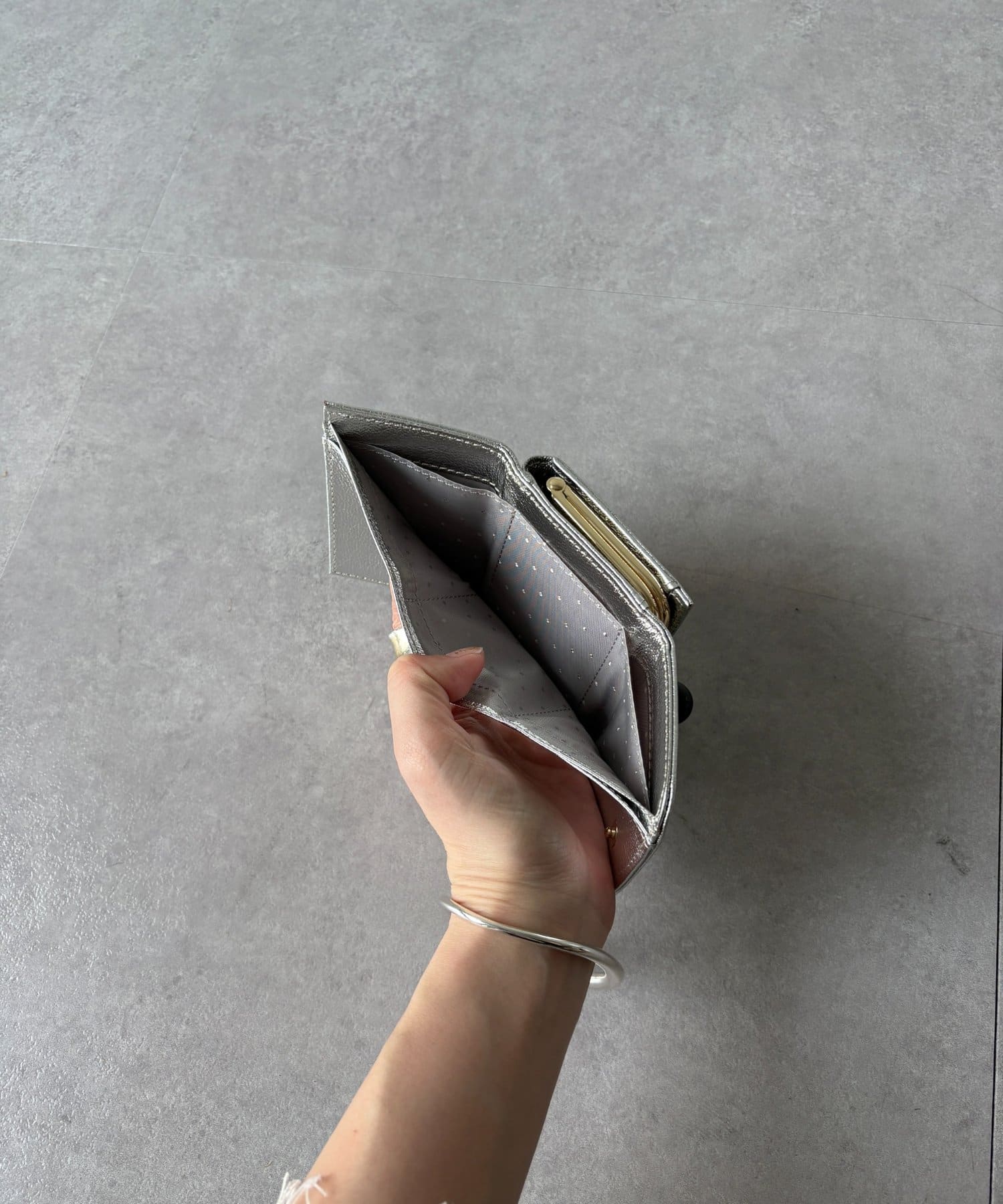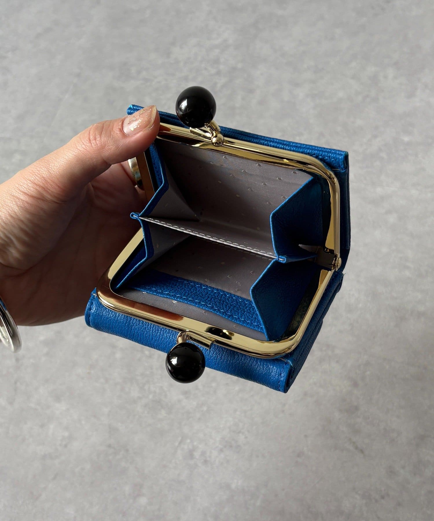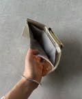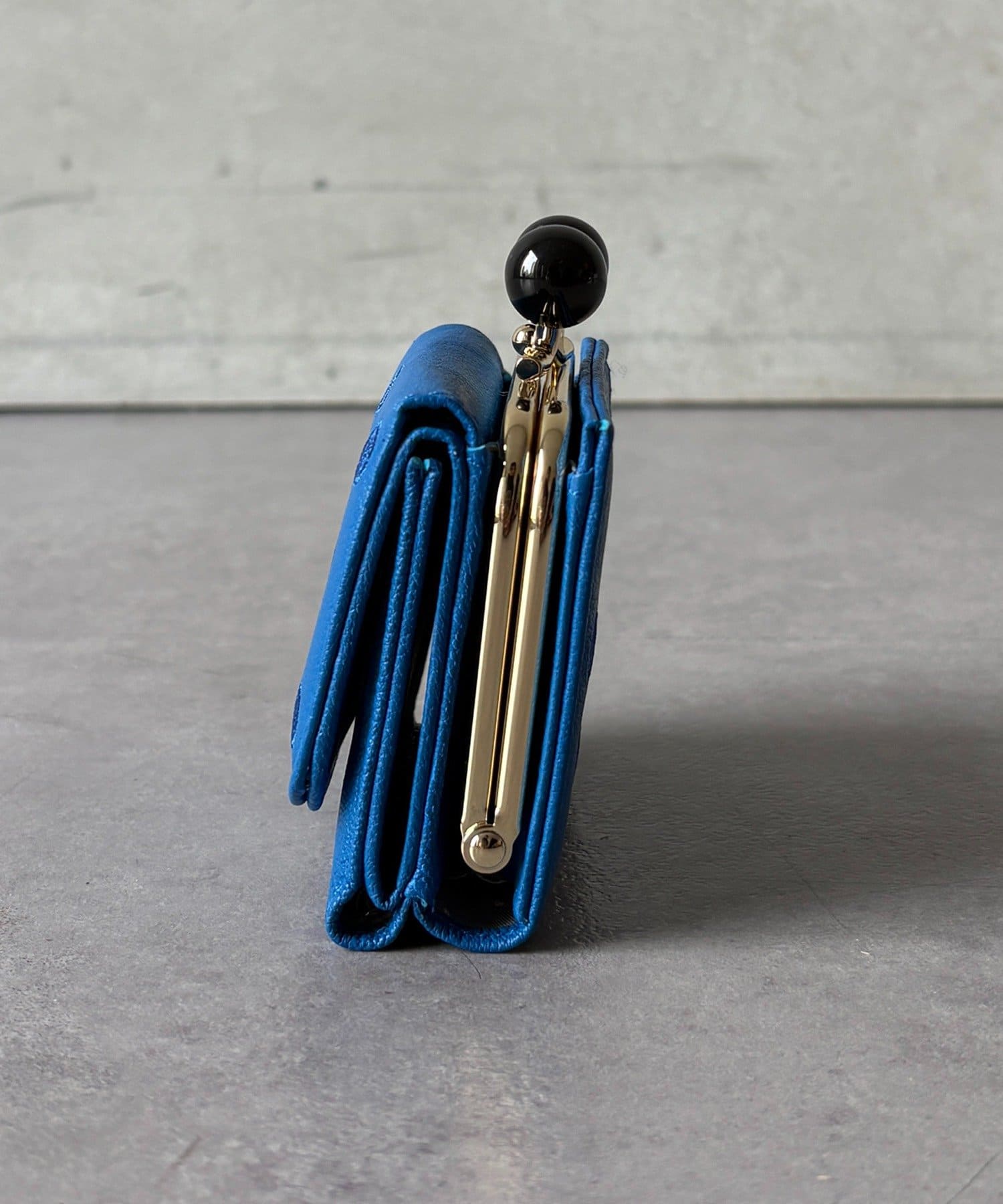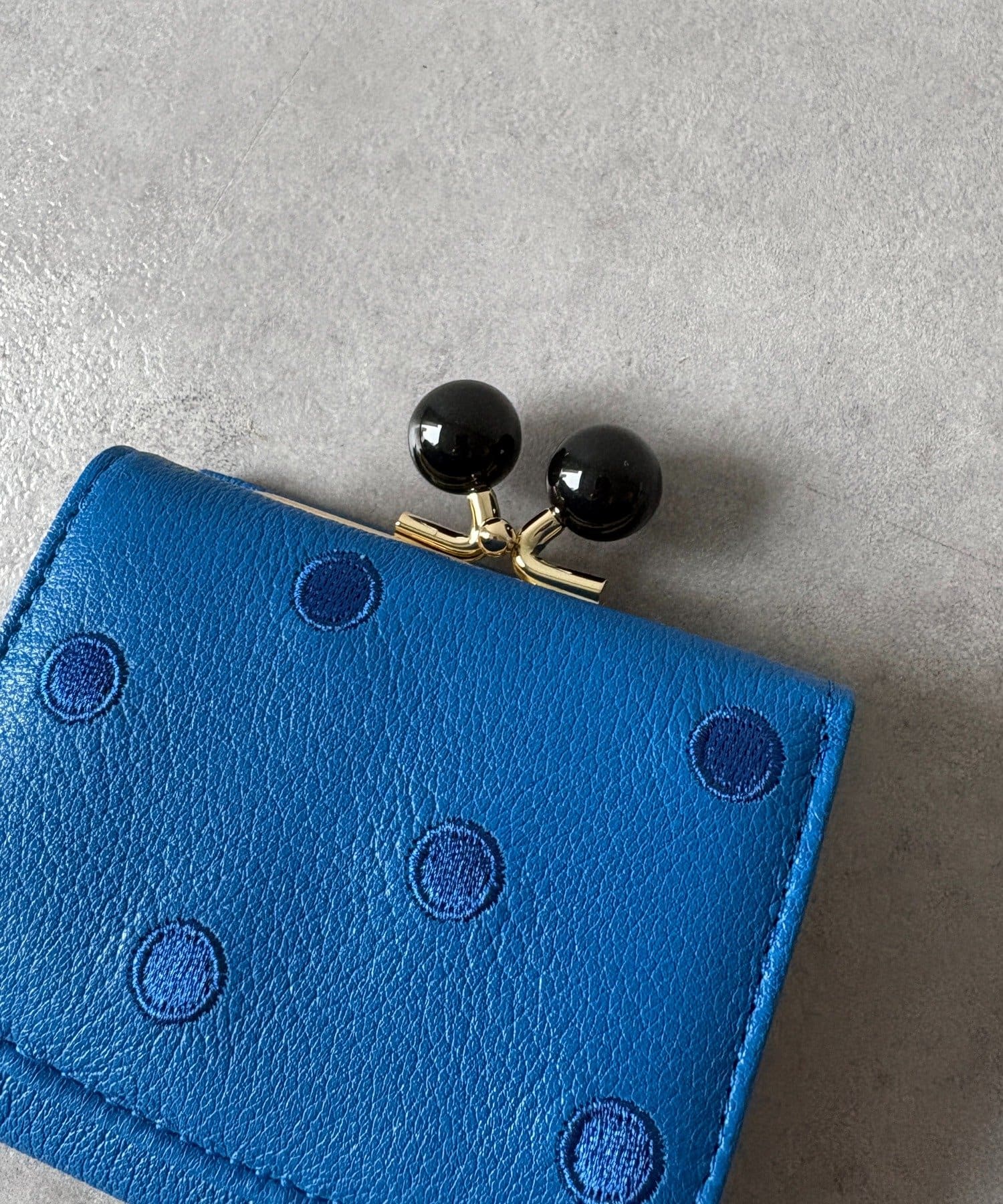 ころんとしたアクリル玉のがま口が目を引くアクリル玉3つ折りウォレット。