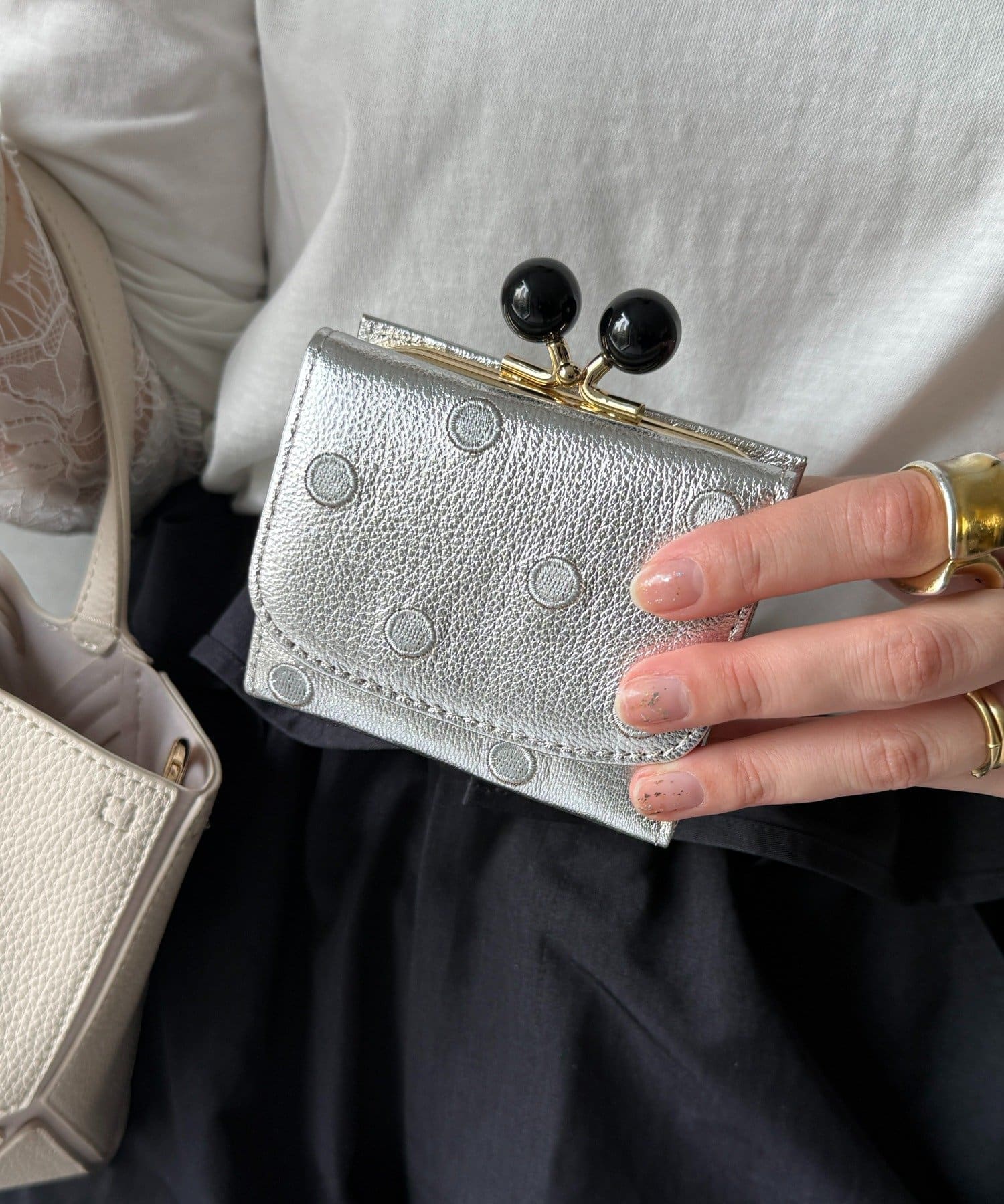 がま口部分にあしらわれた印象的なダブルのアクリル玉。丸みのあるフォルムが可愛らしさを演出。