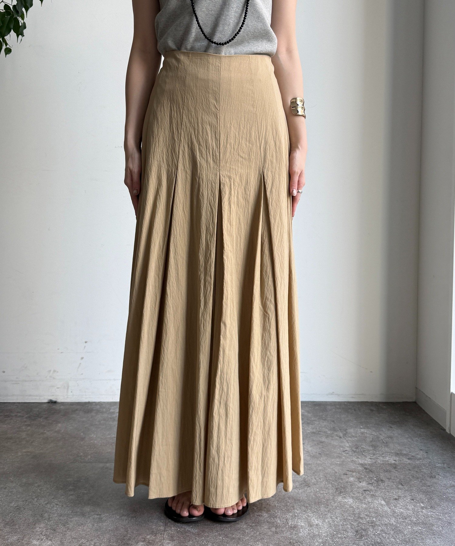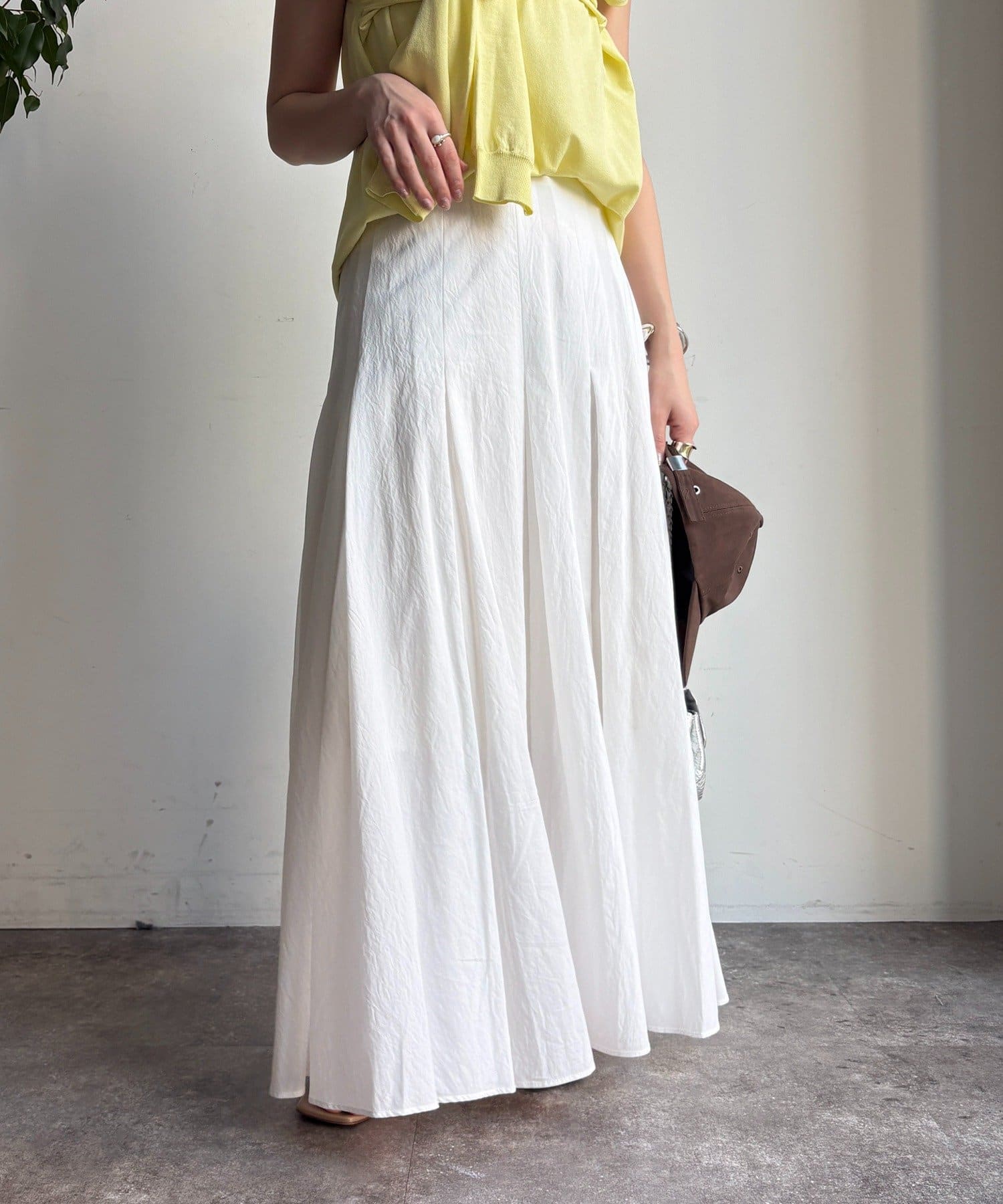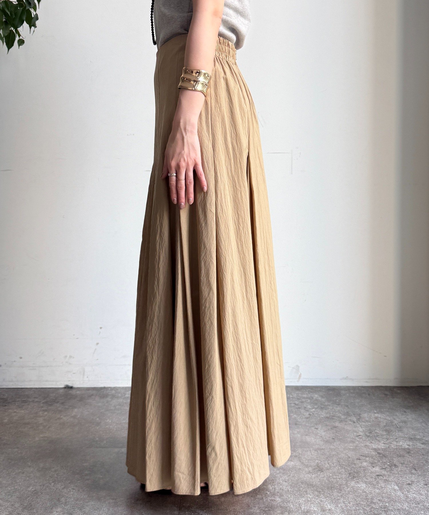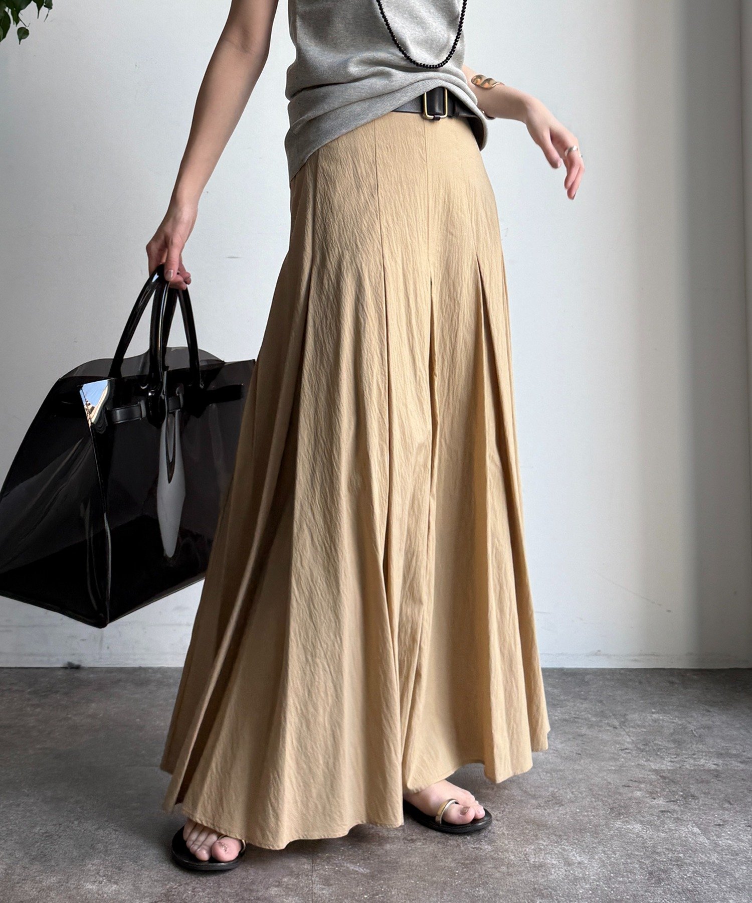 ウエストから裾にかけて施されたタックデザインが、立体感のあるフレアラインを生み出し自然でな広がりを演出。
