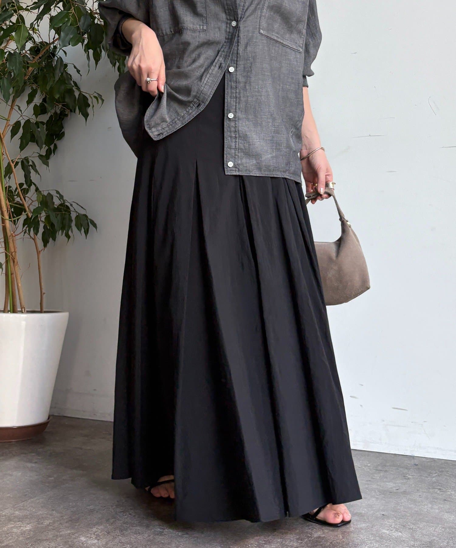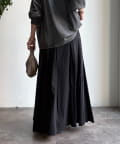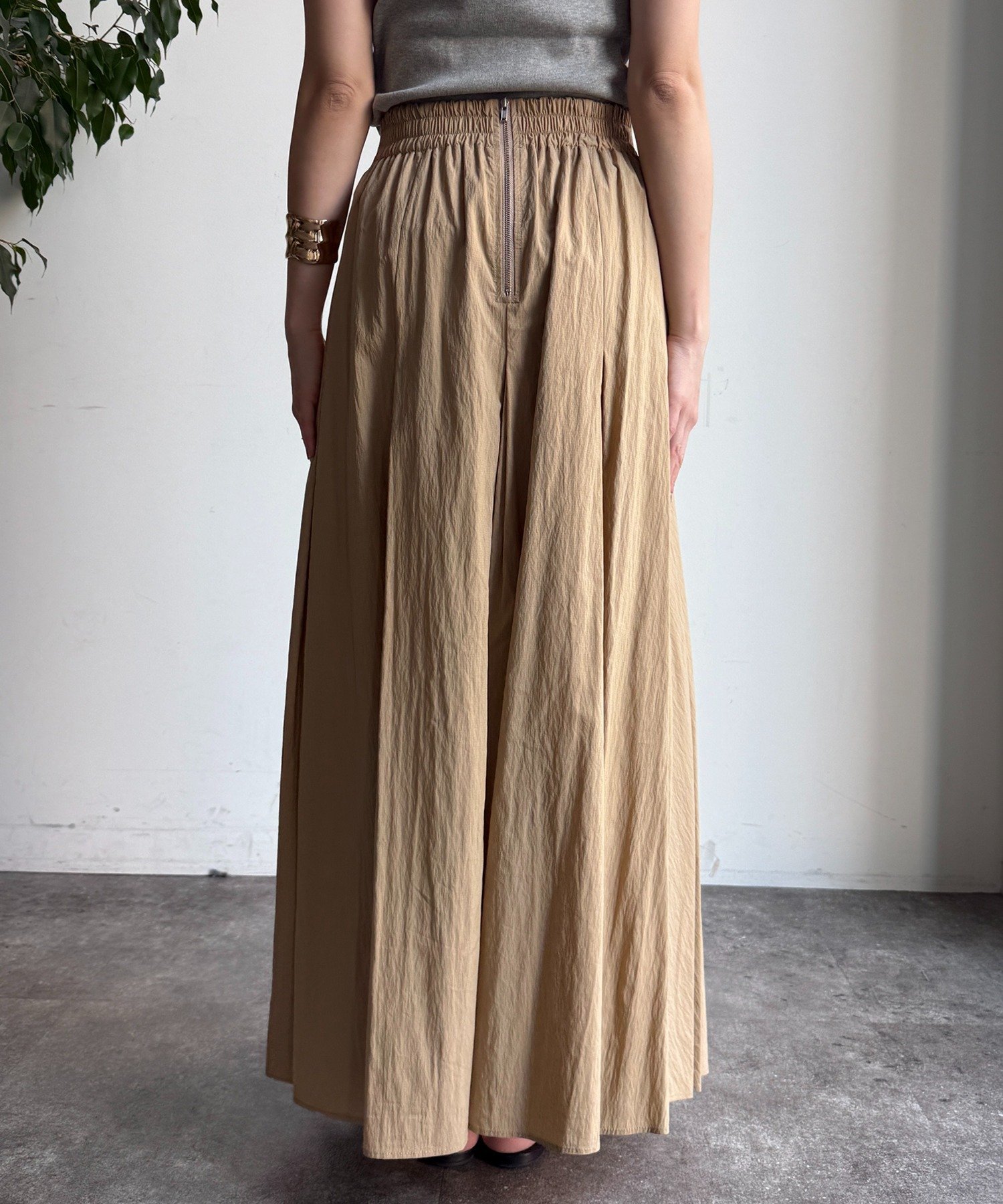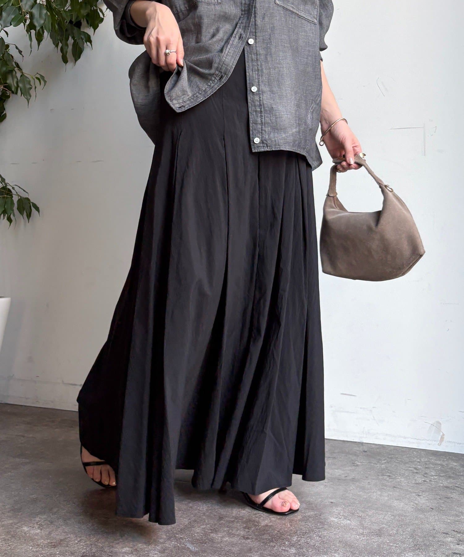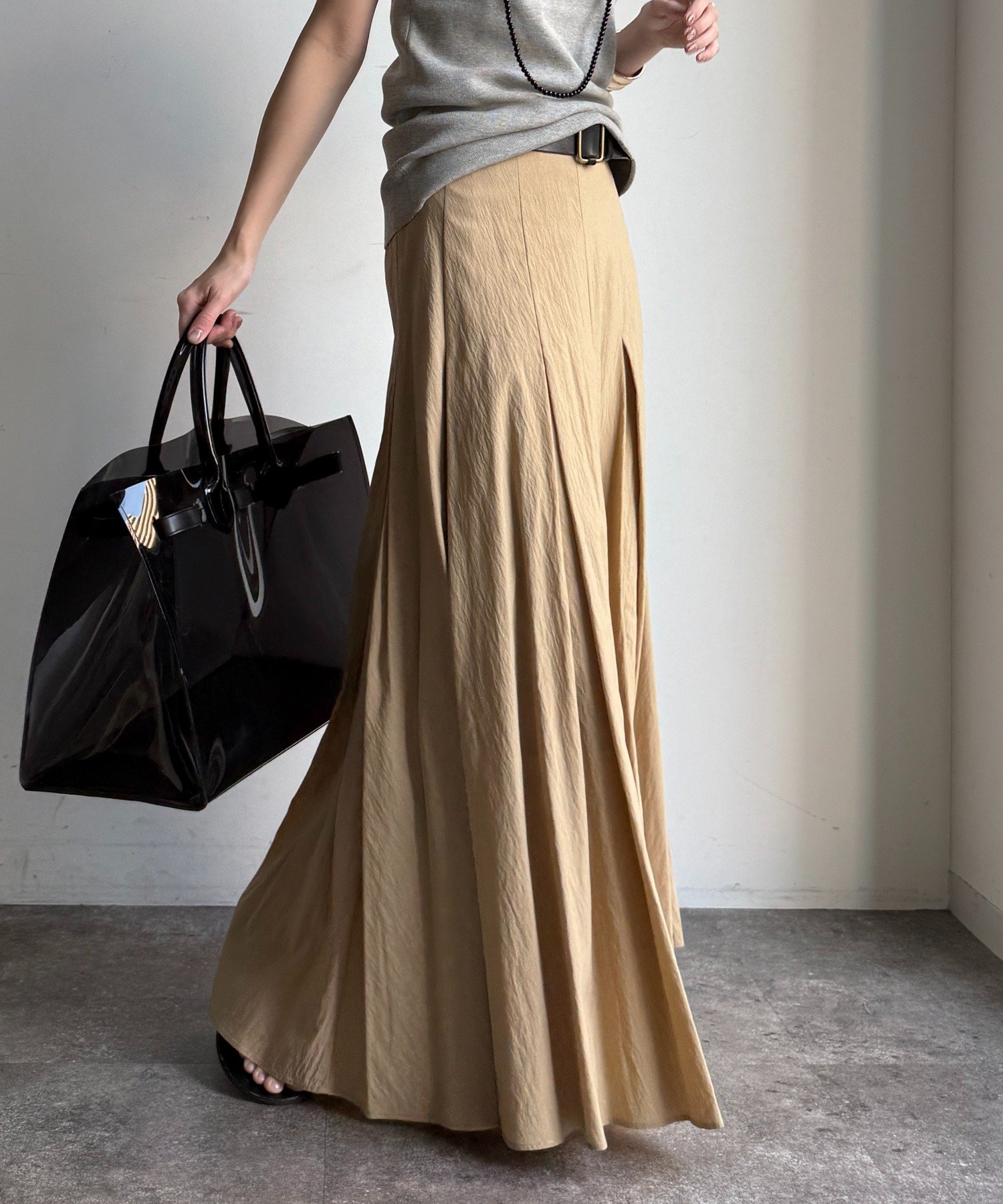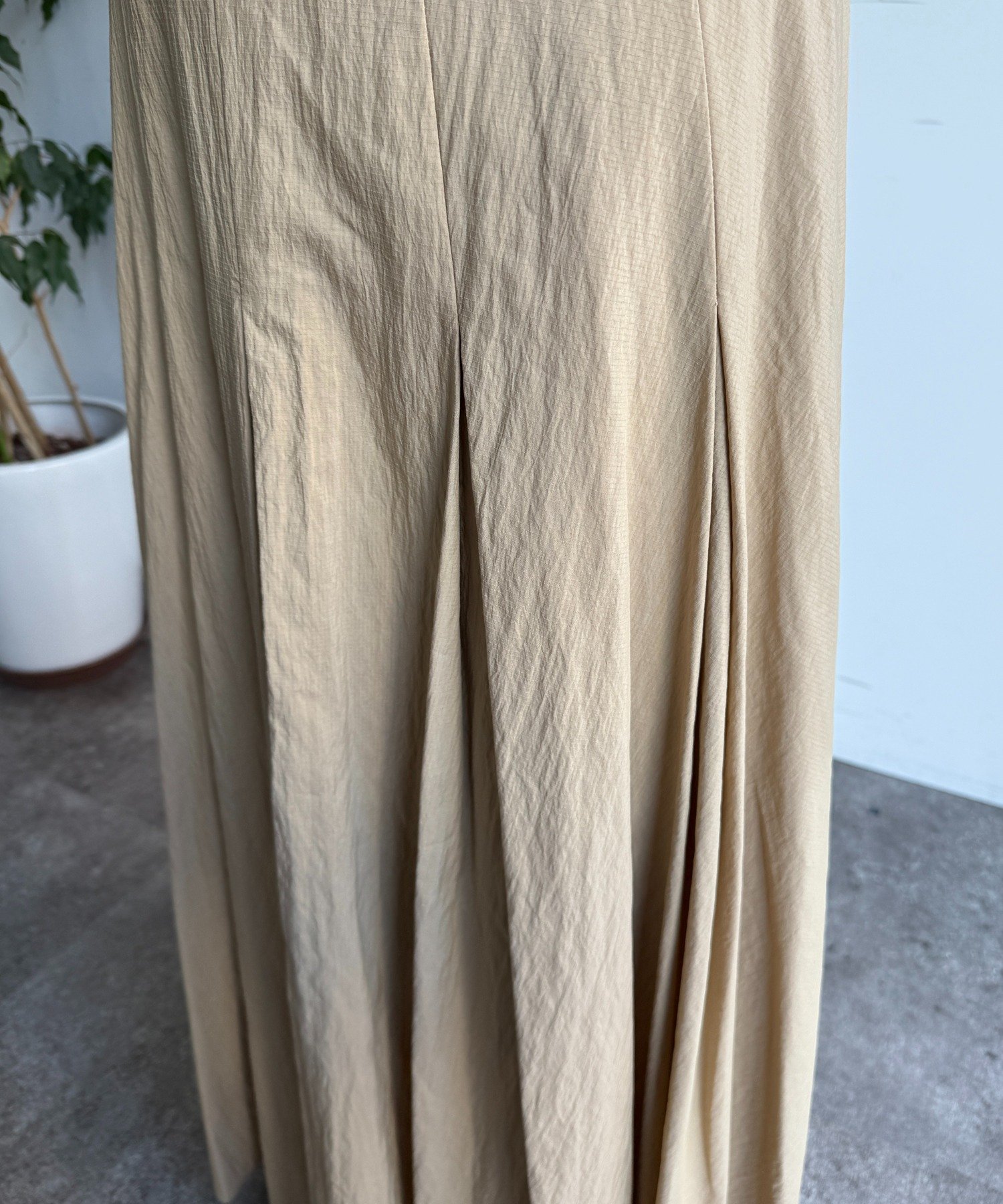 ウエストから裾にかけて施されたタックデザインが、立体感のあるフレアラインを生み出し自然でな広がりを演出。