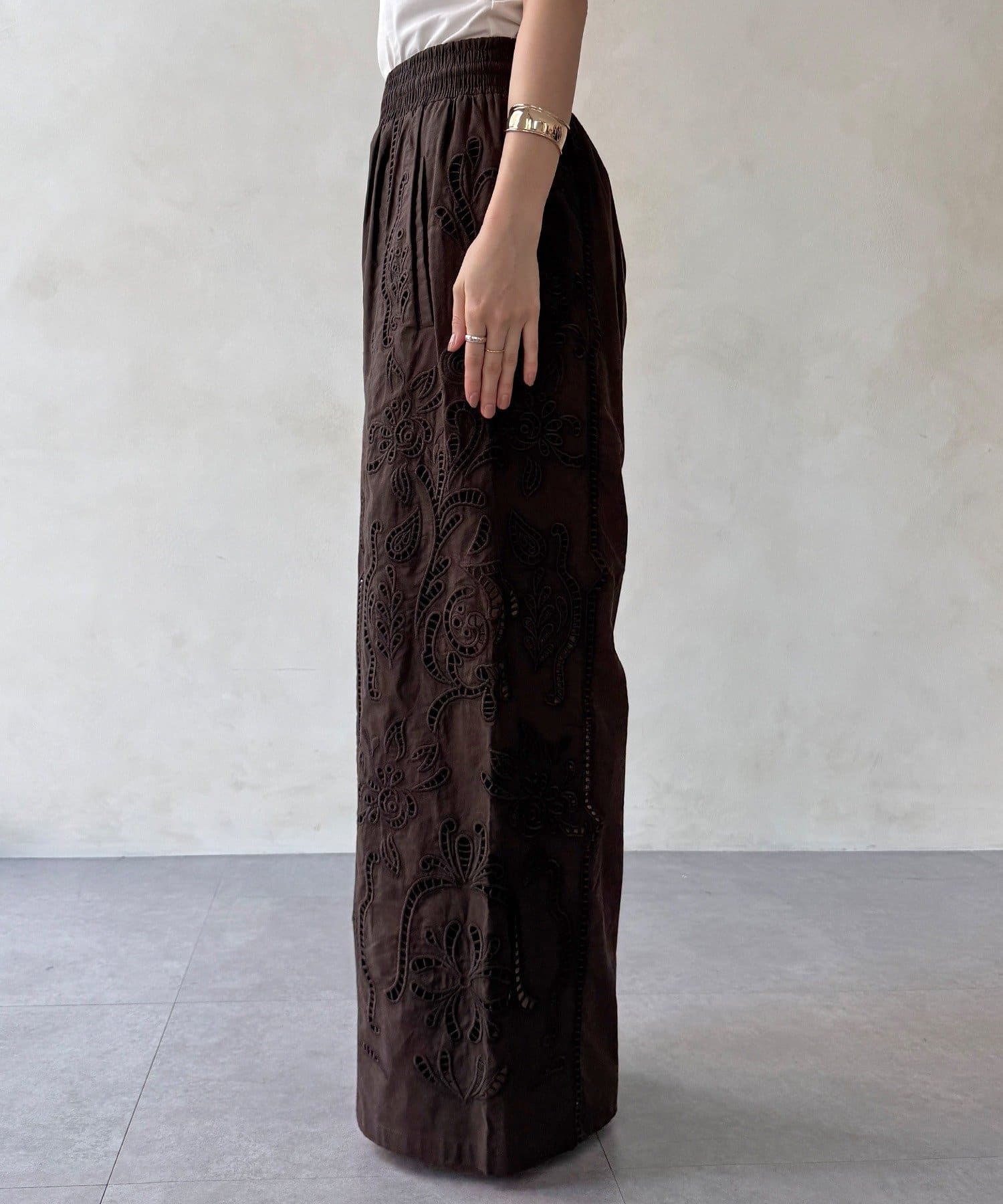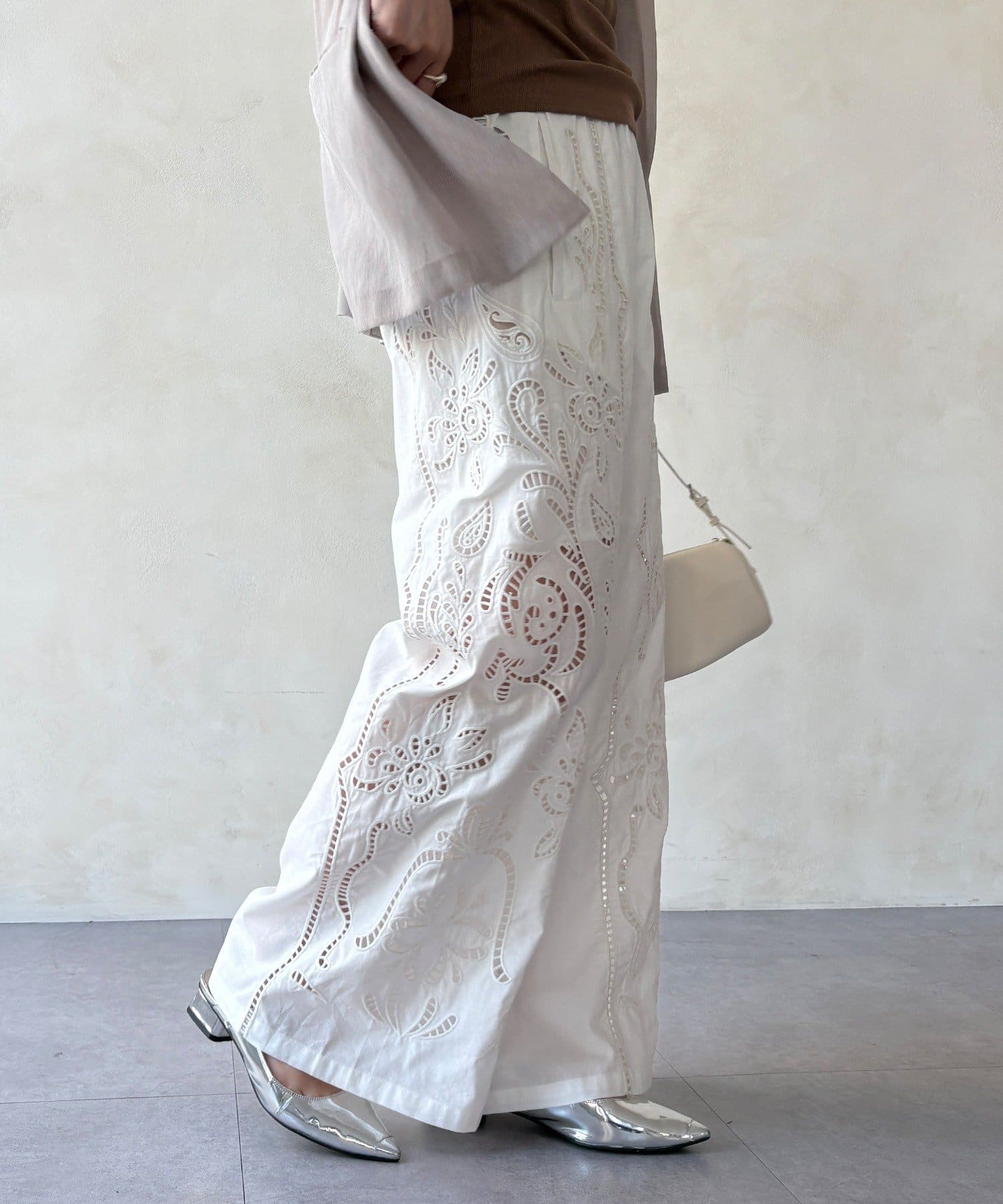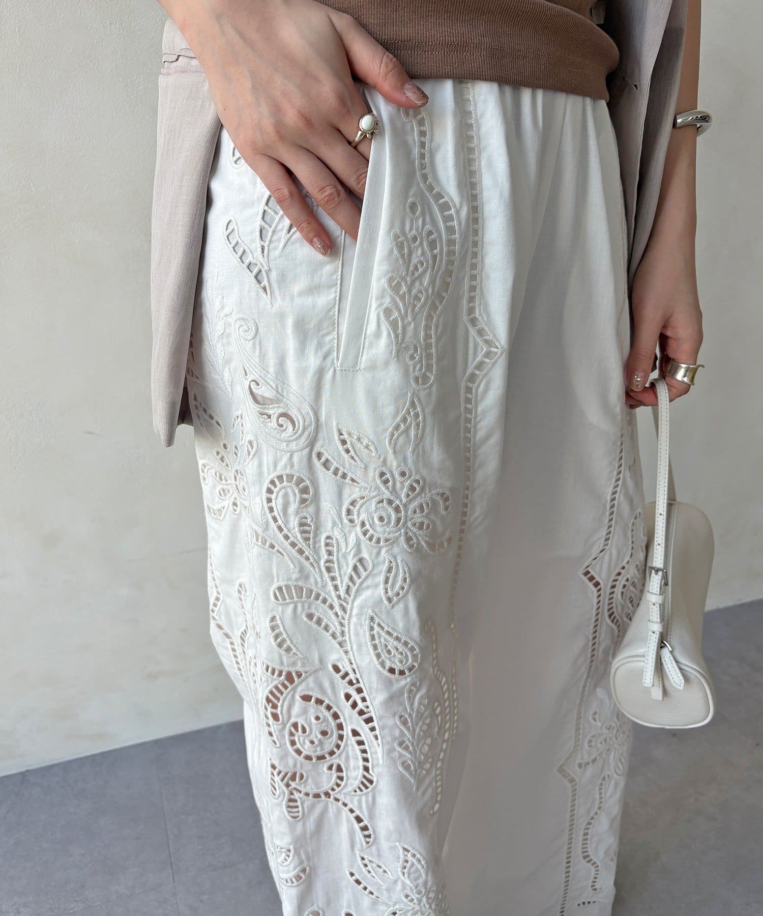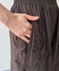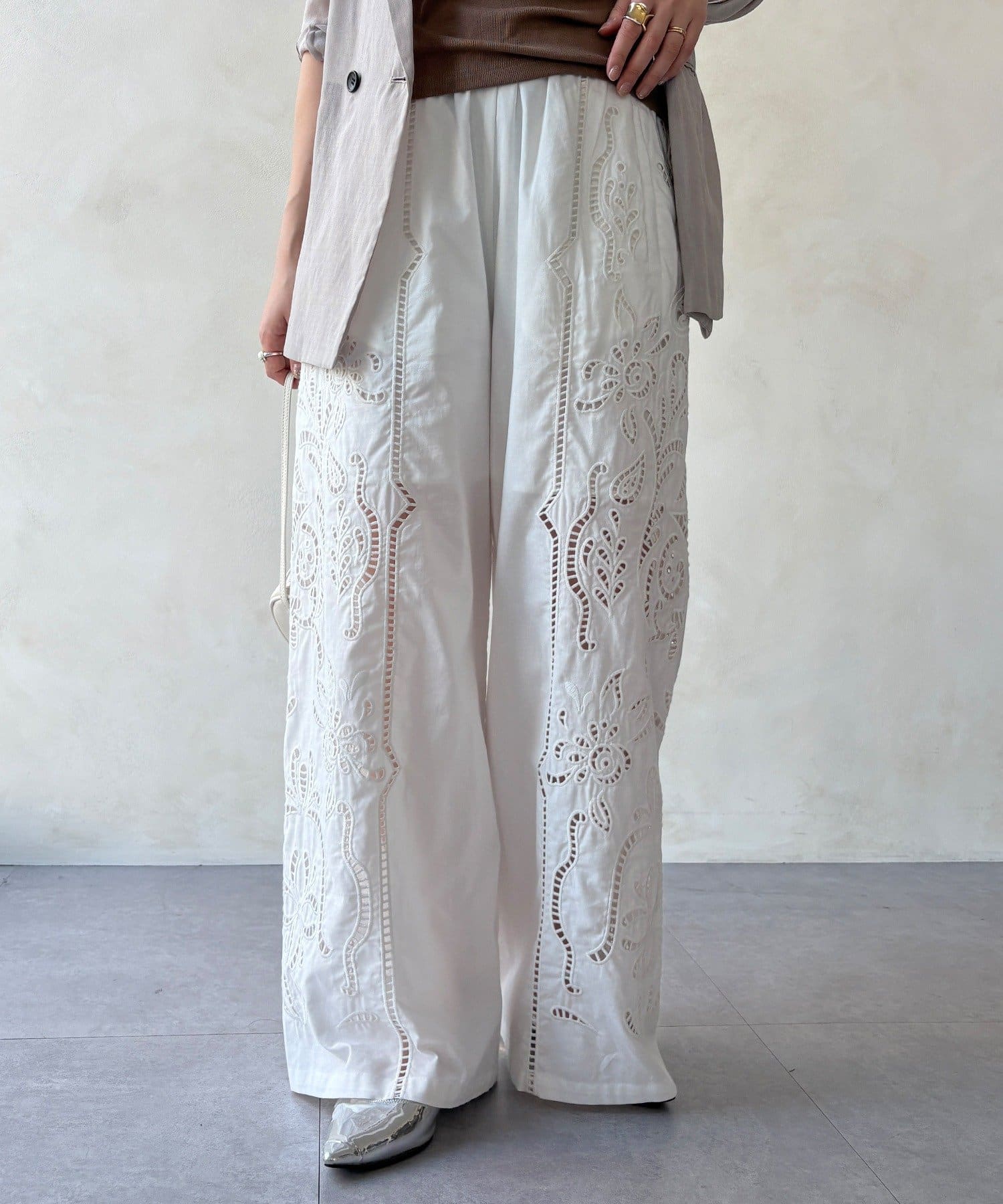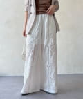 ナチュラルなコットンの質感に繊細で大胆な刺繍を施した主役級のレースパンツ。