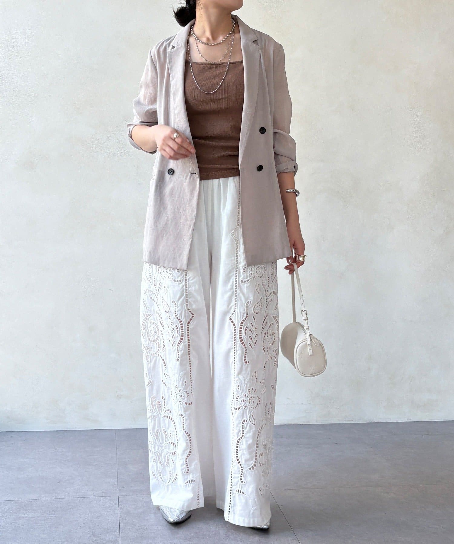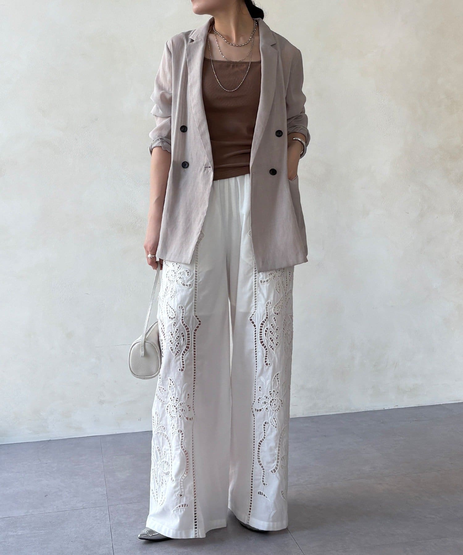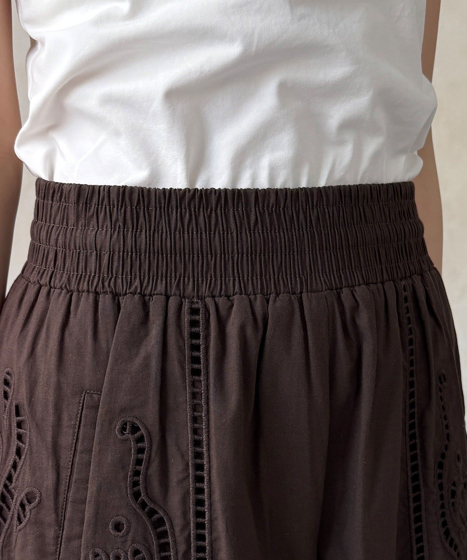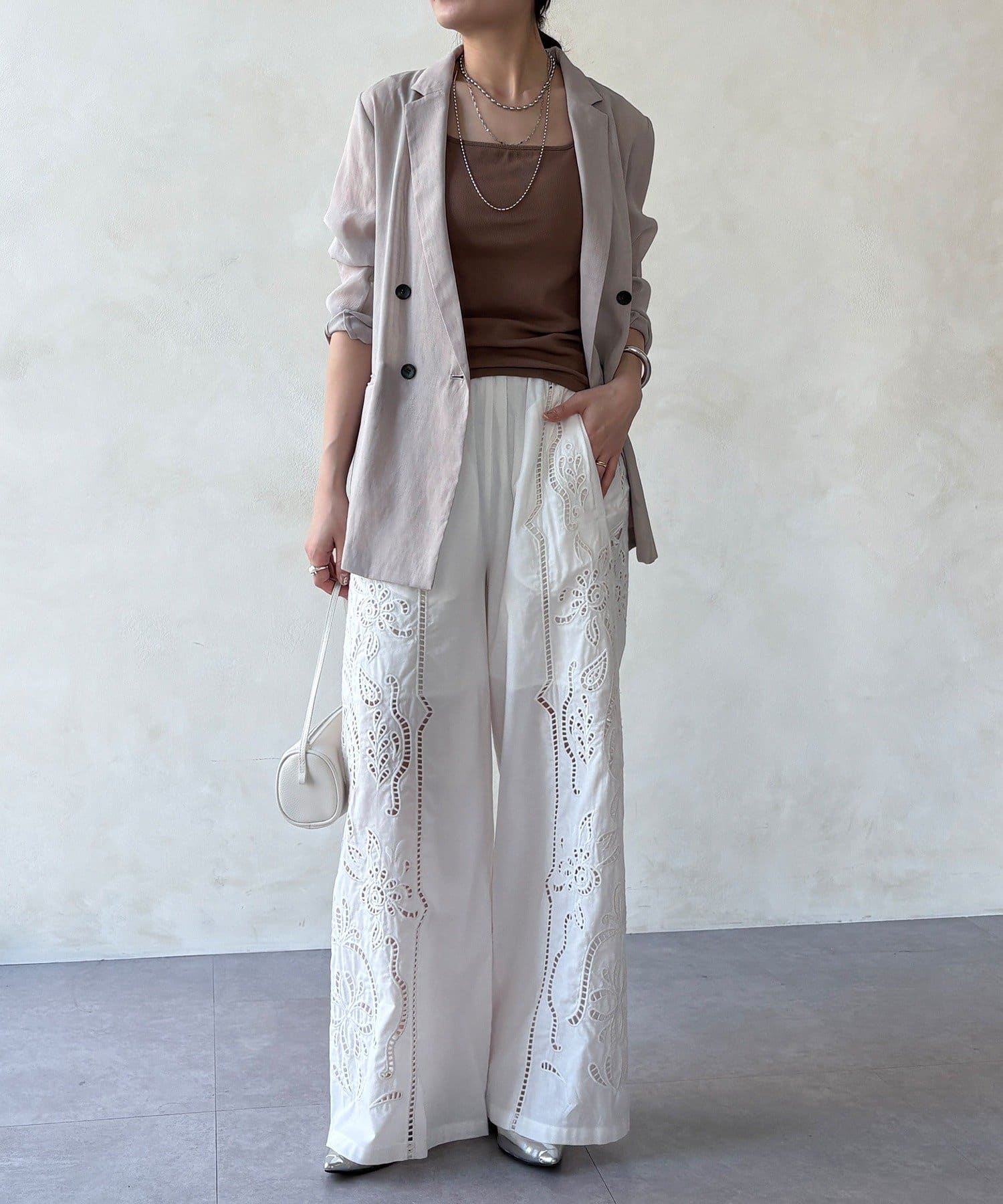 ナチュラルなコットンの質感に繊細で大胆な刺繍を施した主役級のレースパンツ。