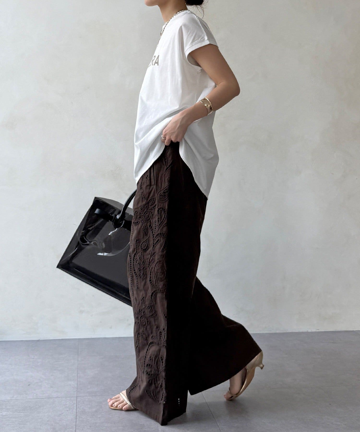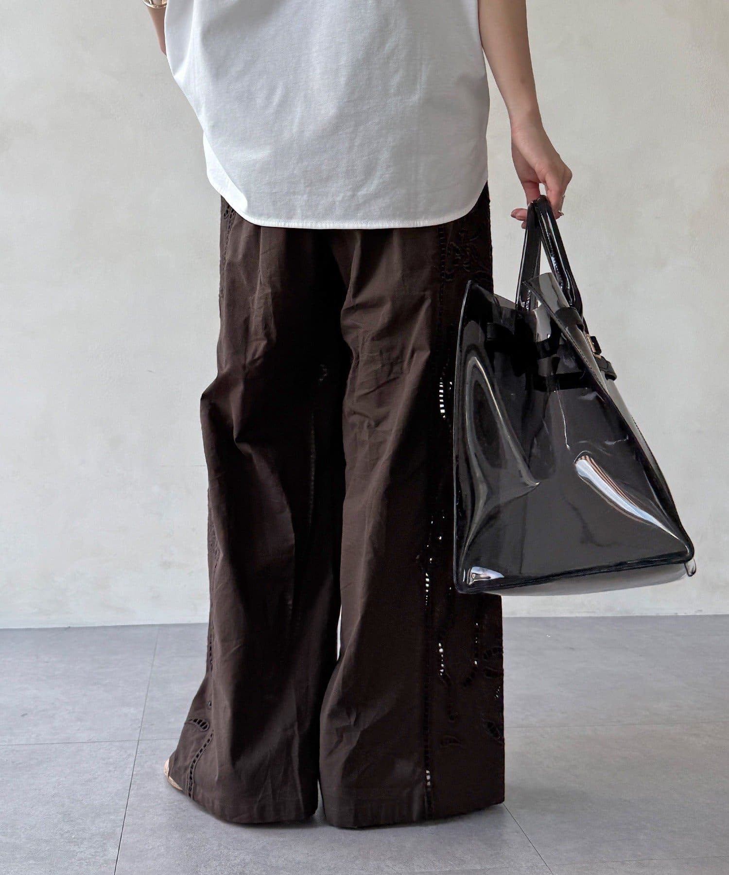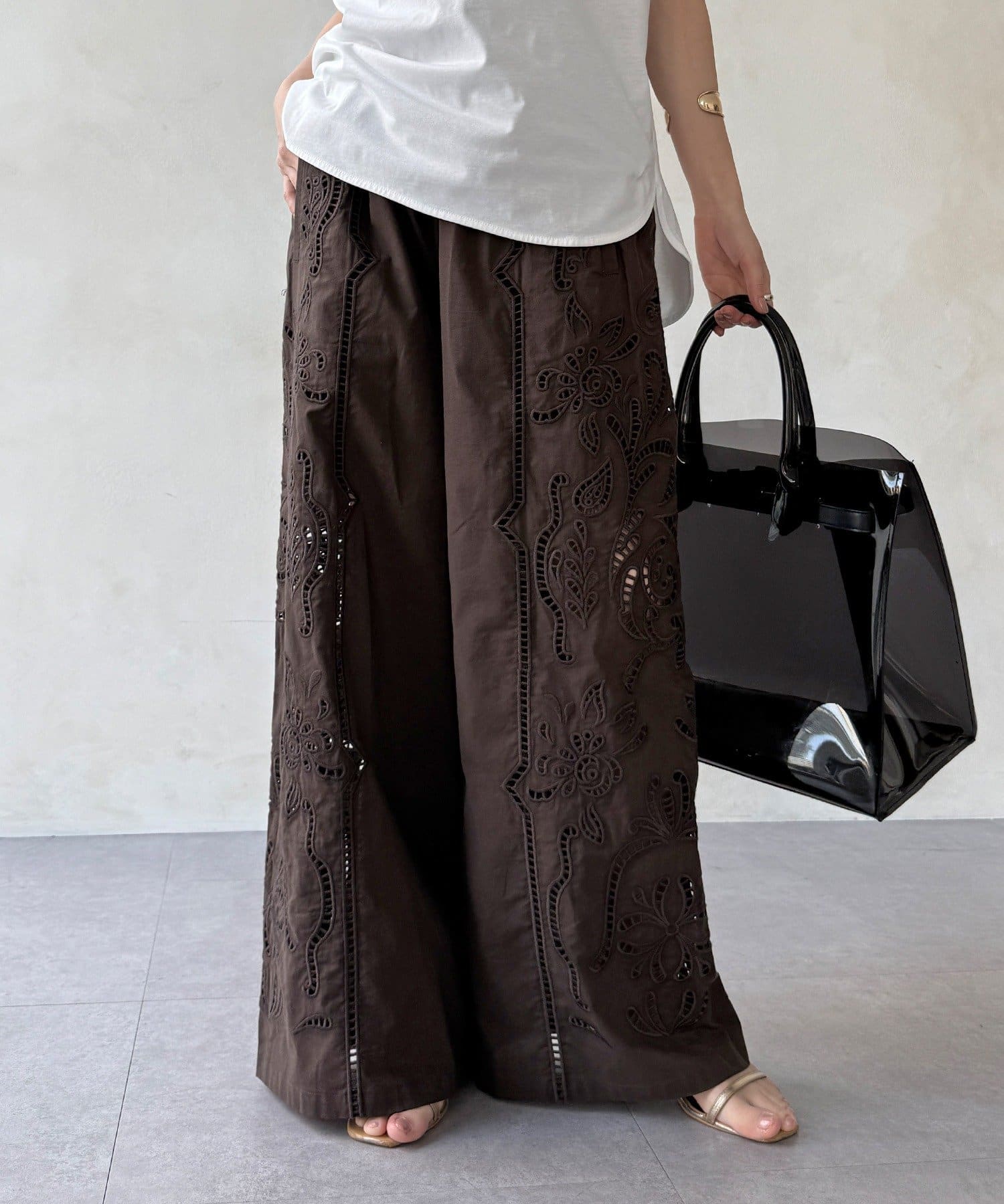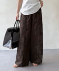 さりげなく肌が見える大人のレースワイドパンツ