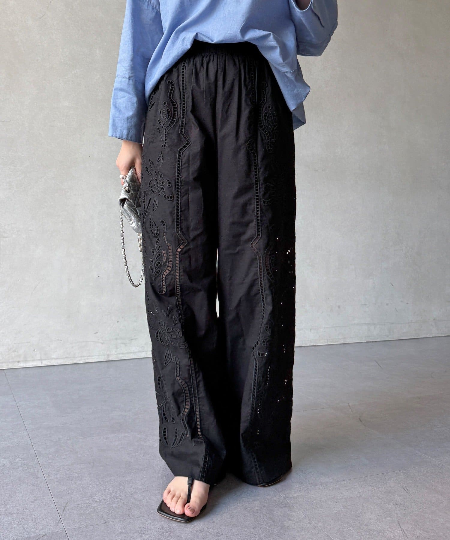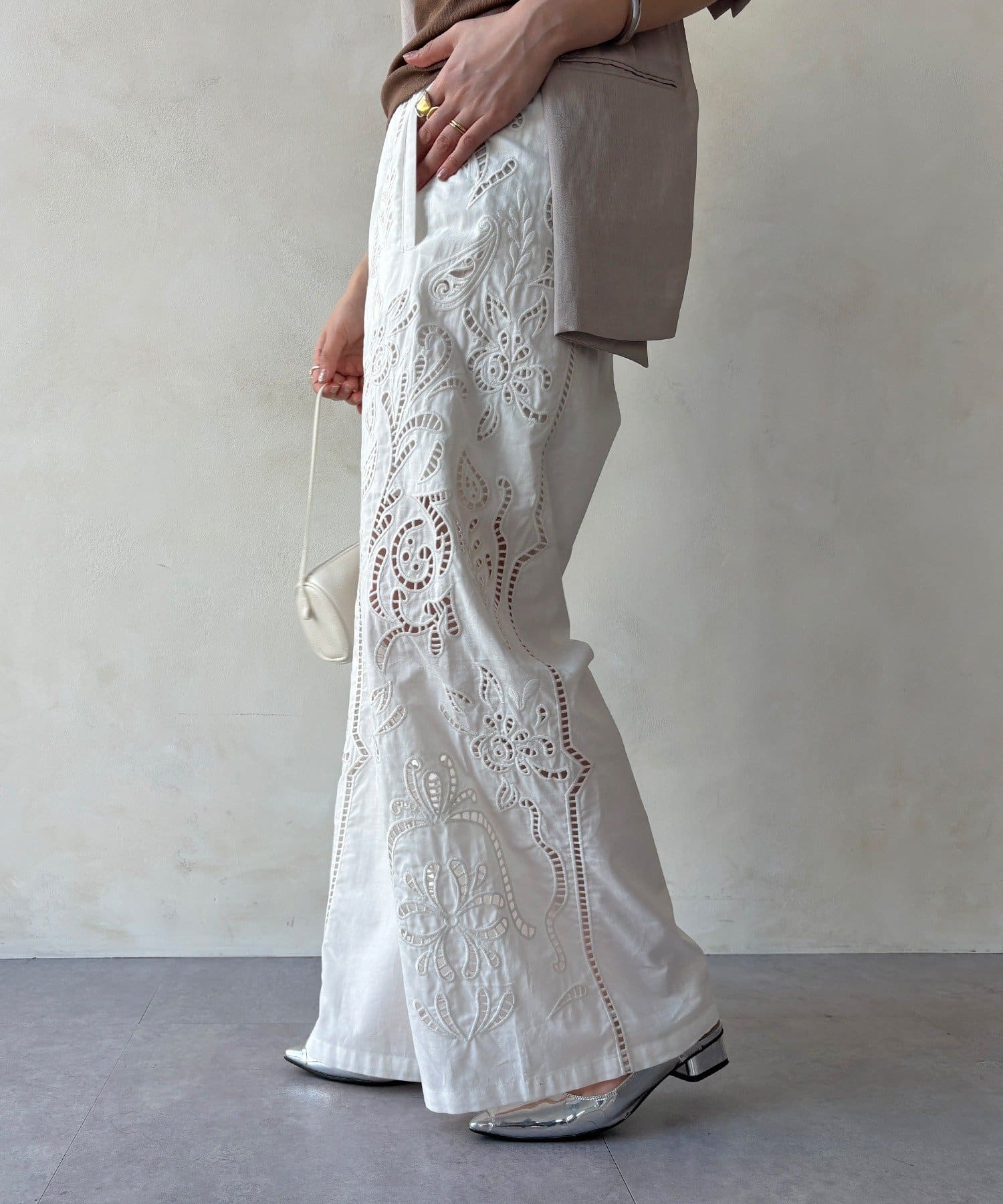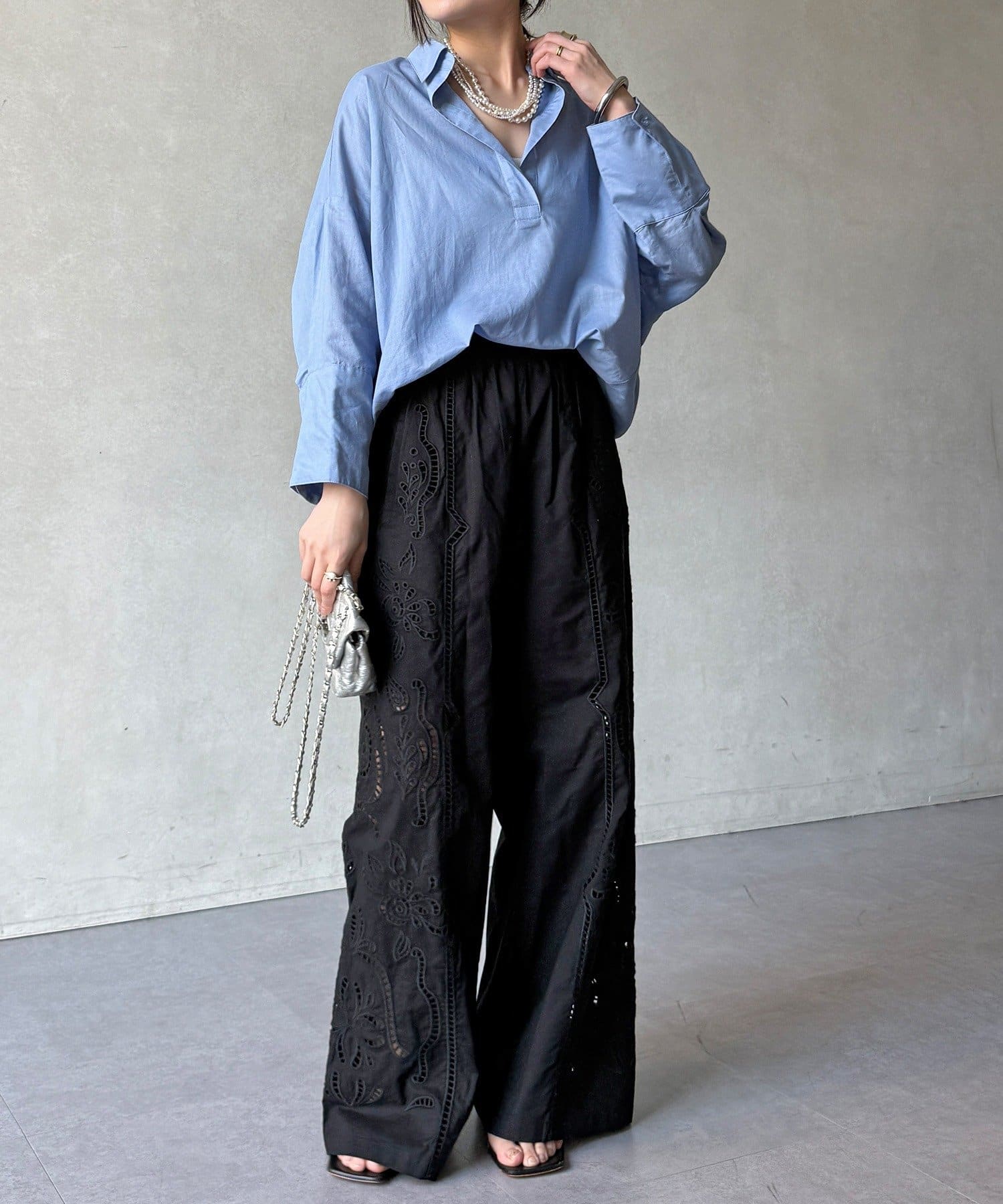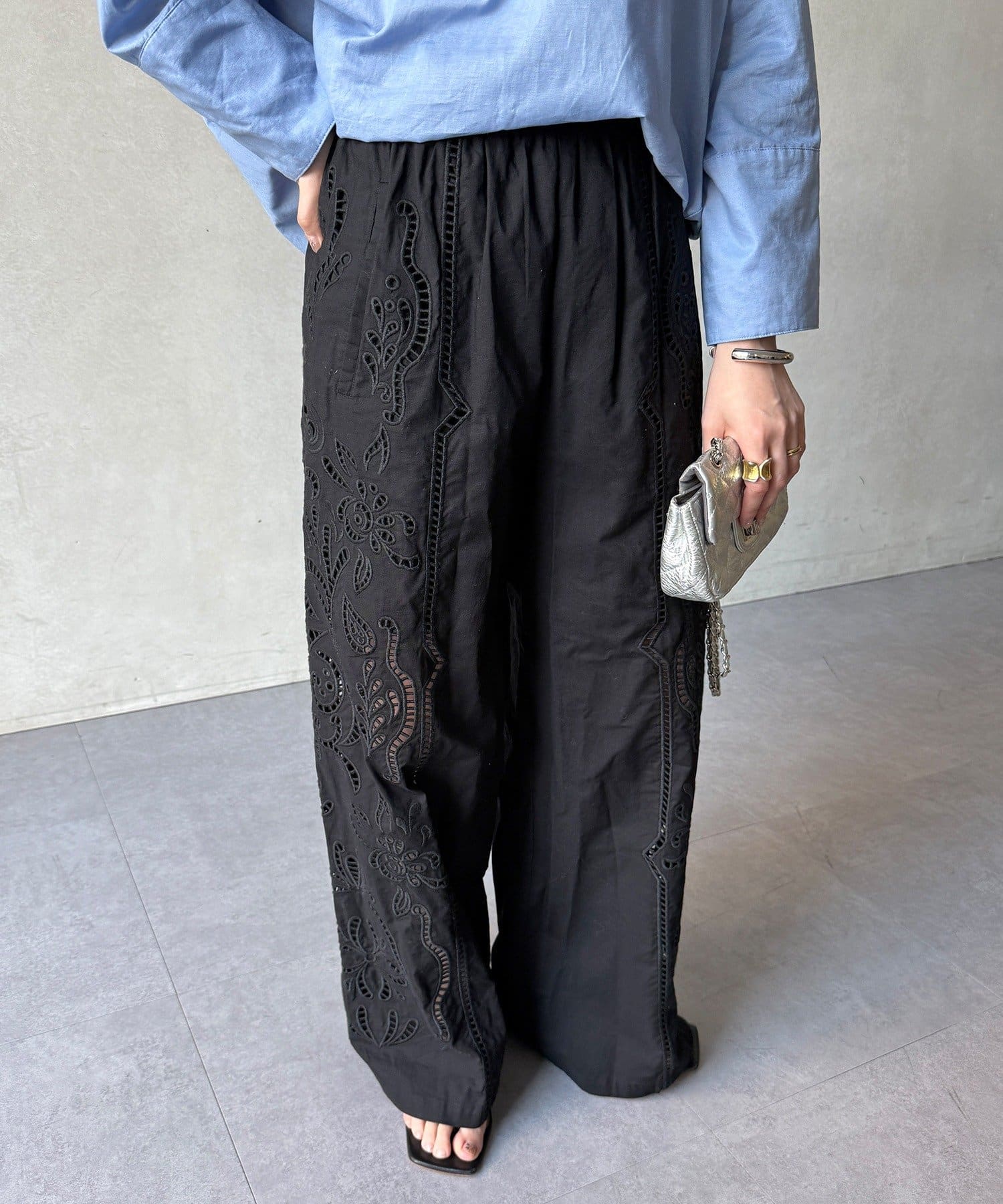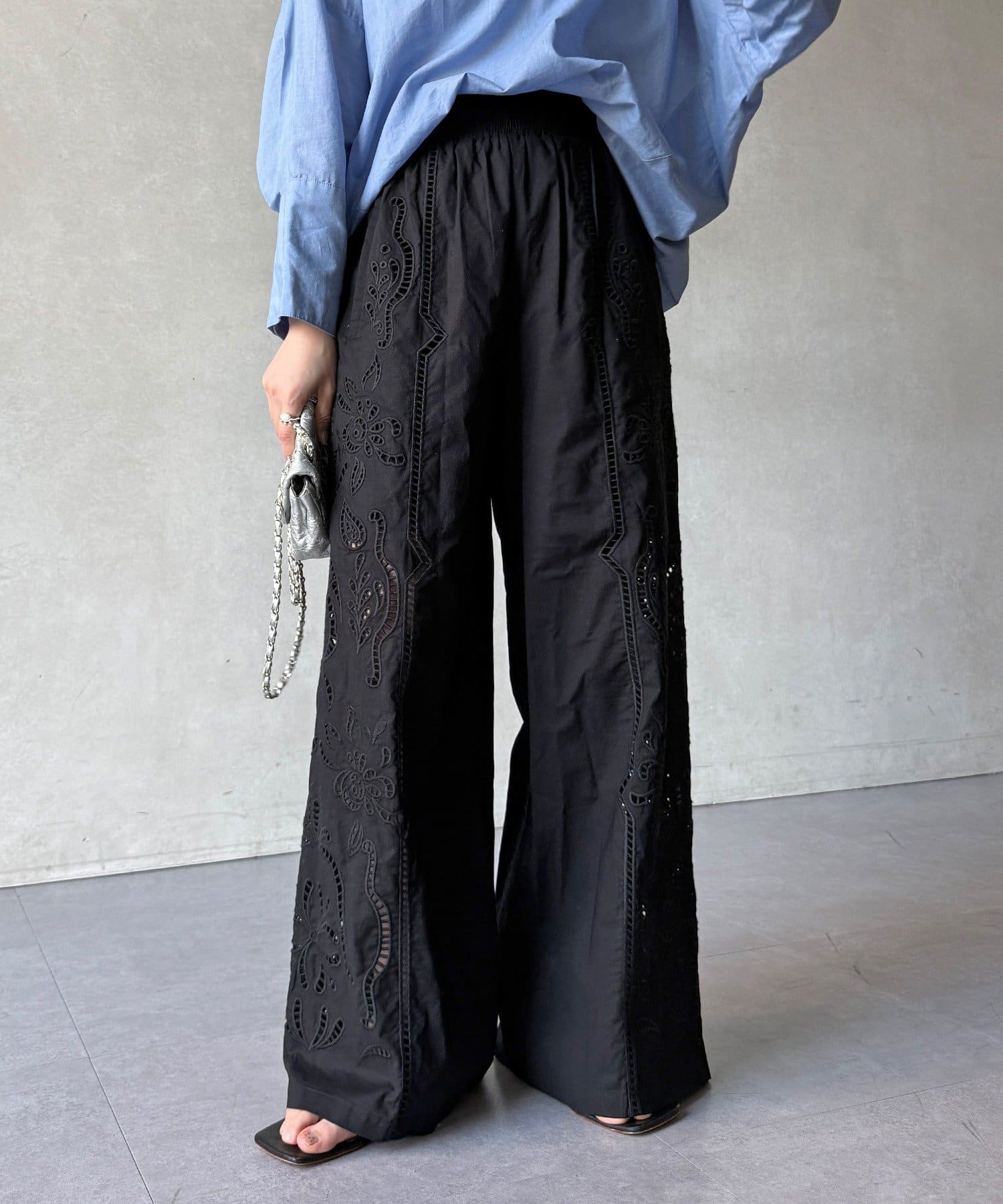 ・繊細で大胆な刺繍を施した主役級パンツ
