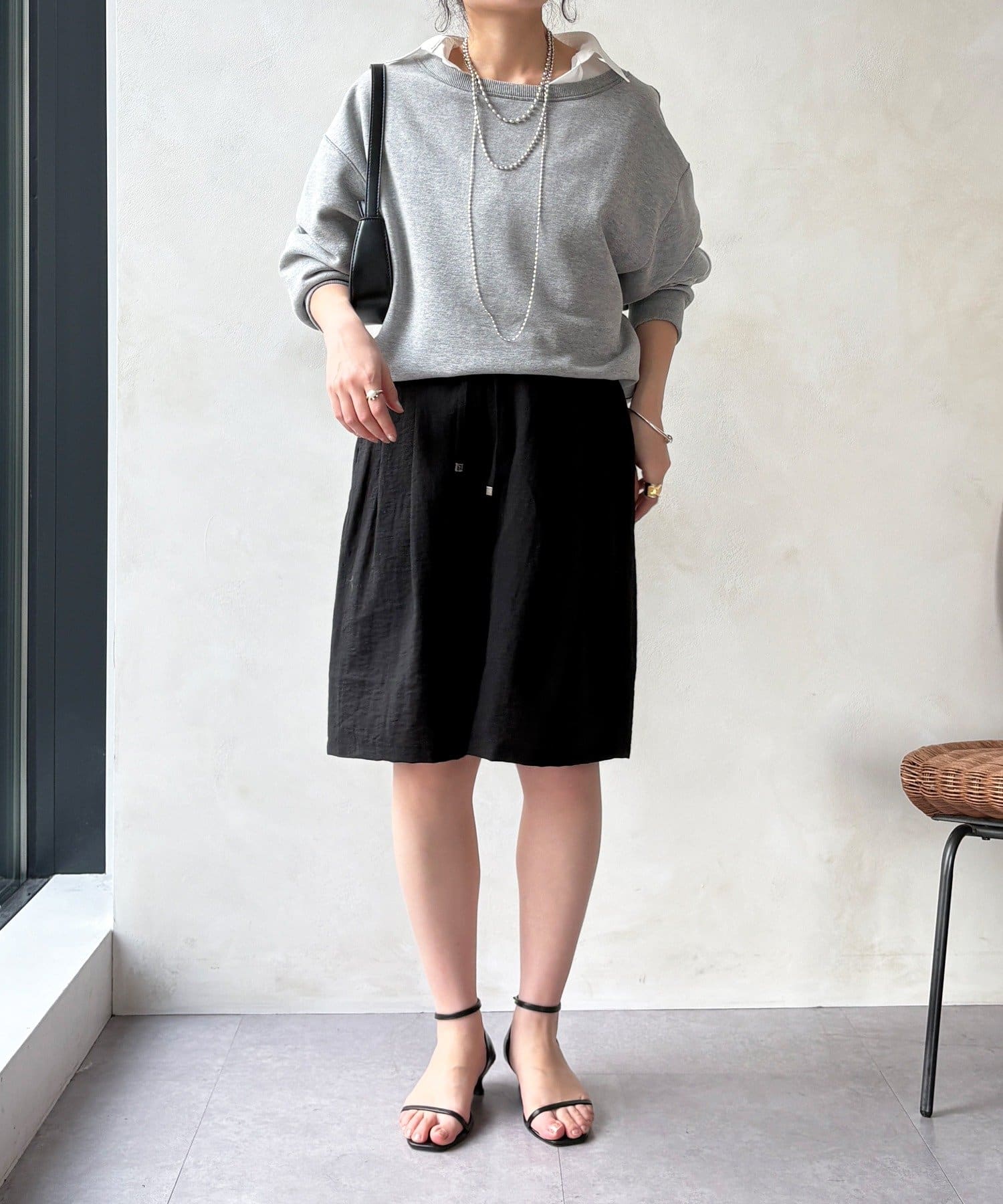 膝が隠れる絶妙な丈感と程よいゆとりが、カジュアルになりすぎず
