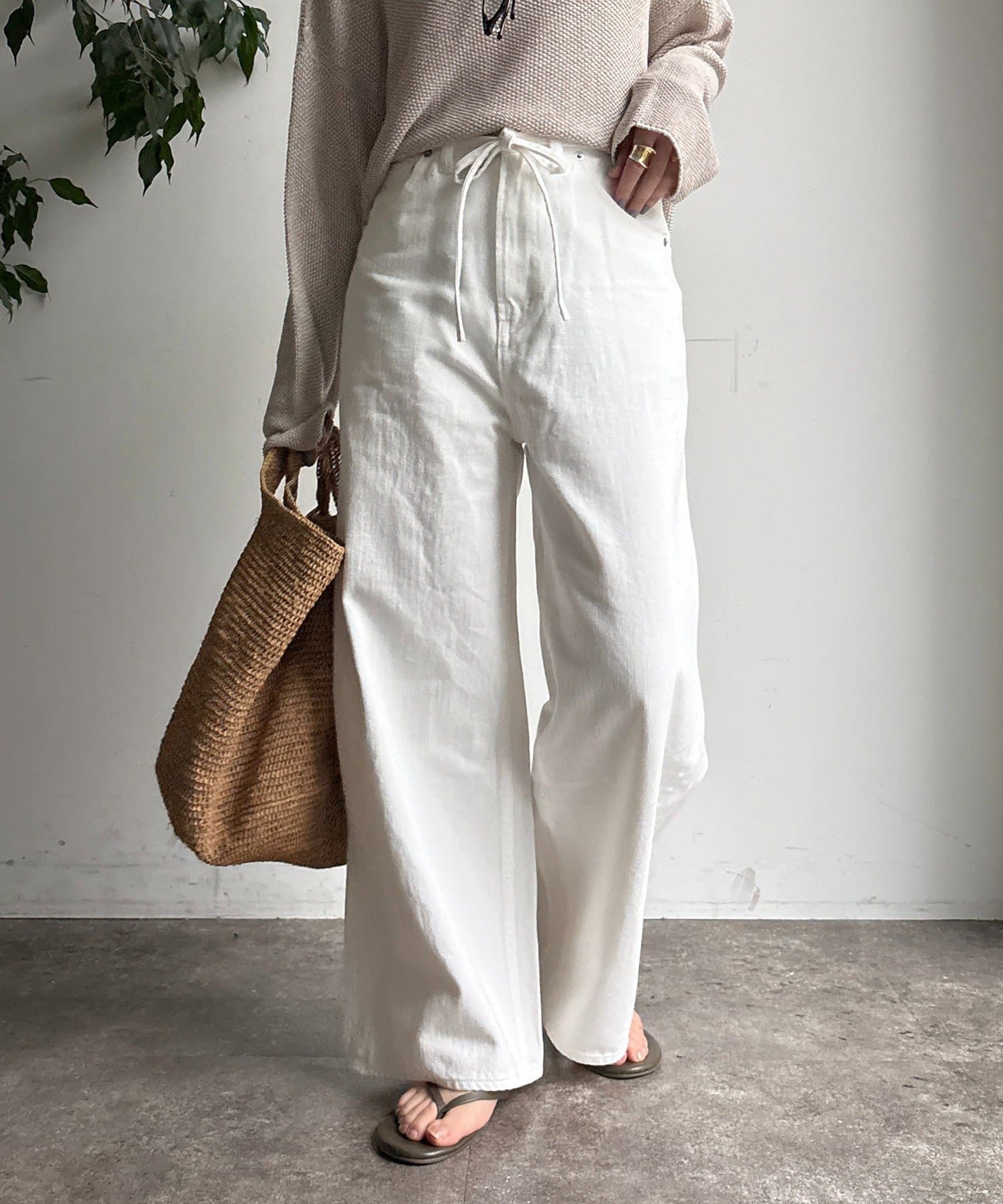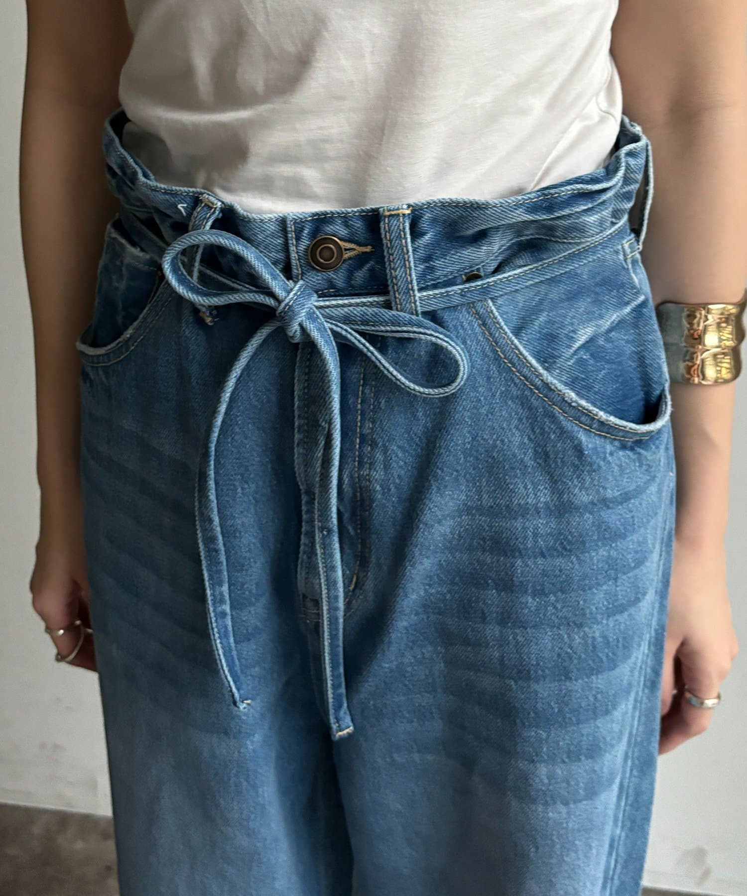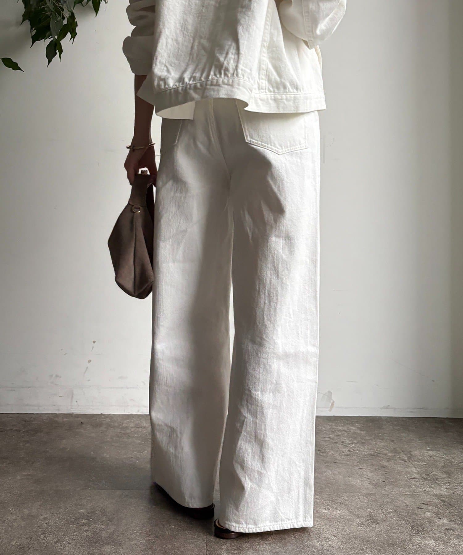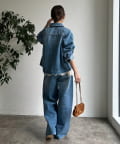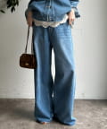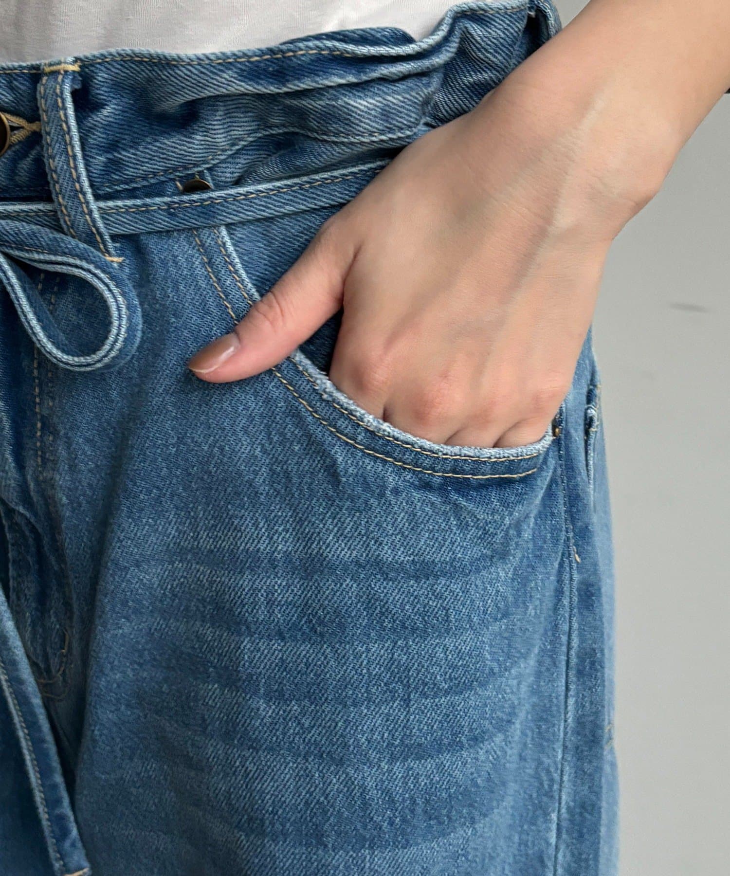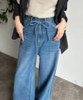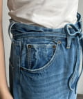 ウエスト部分にはベルトデザインを施し、シンプルなデニムにさりげないアクセントをプラス。