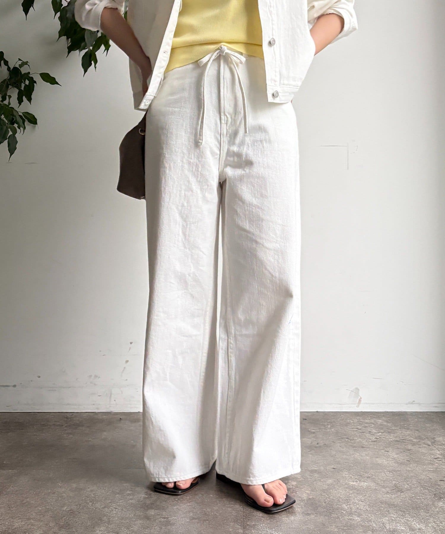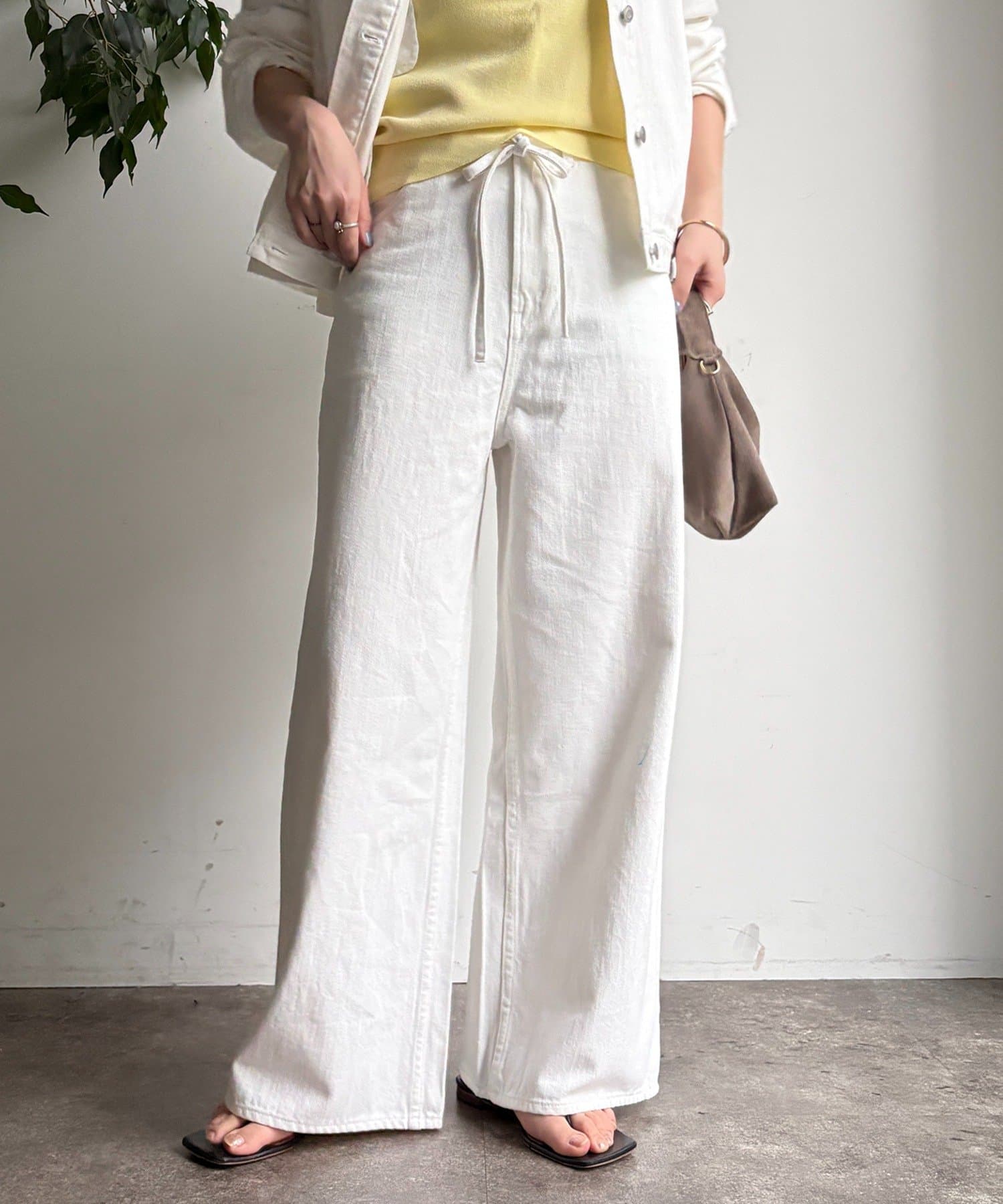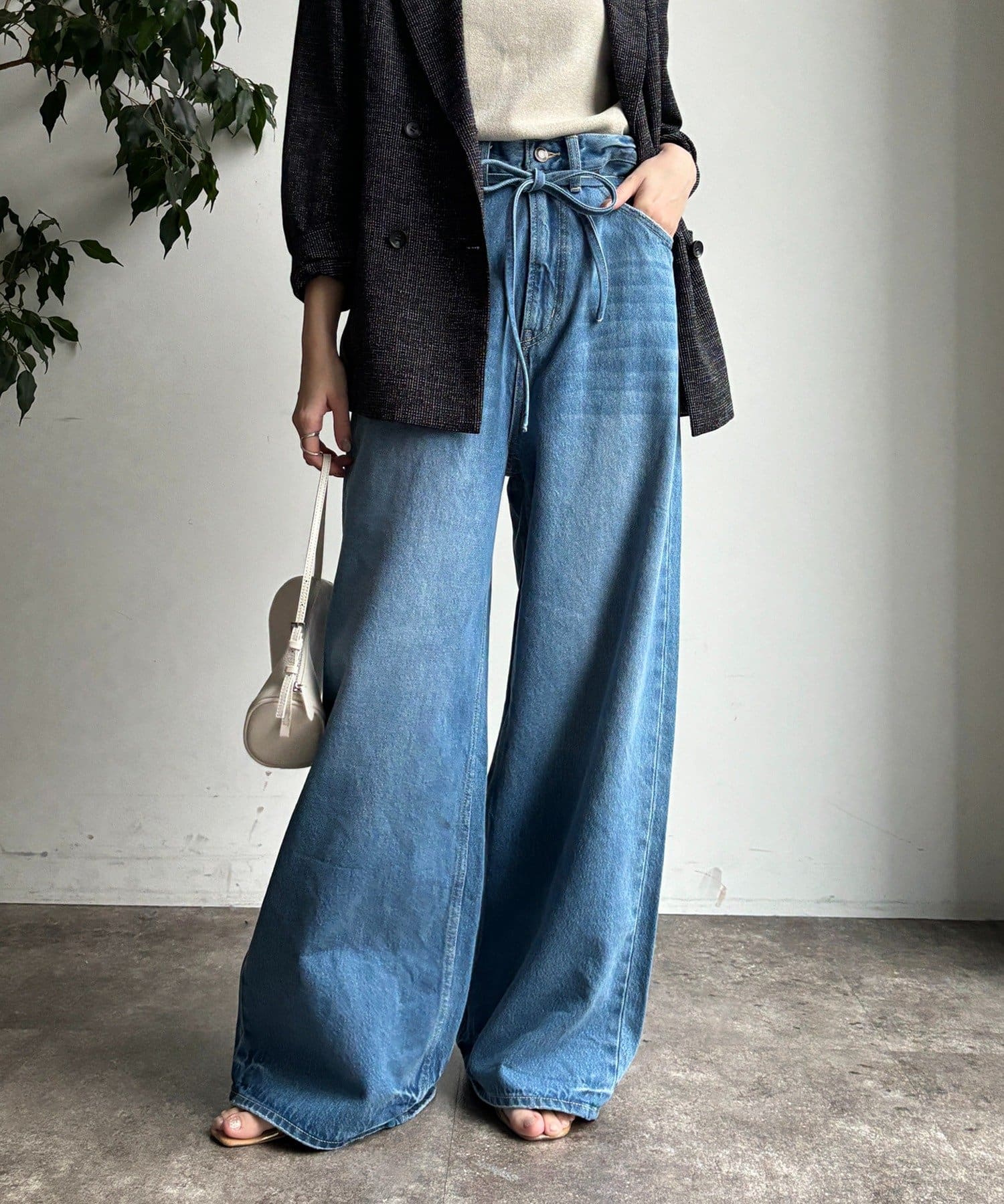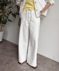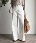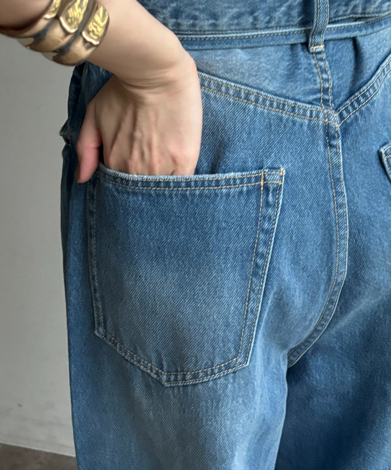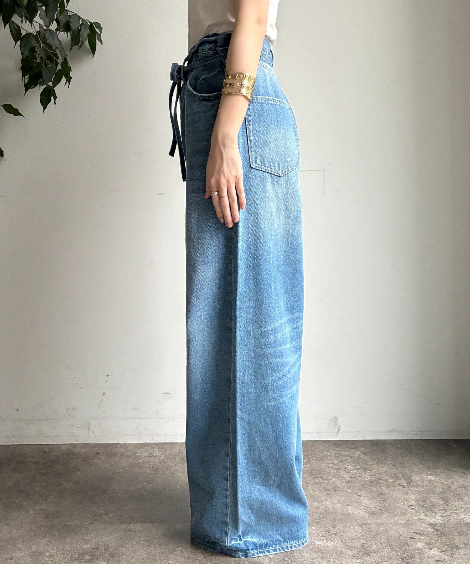 ウエスト部分にはベルトデザインを施し、シンプルなデニムにさりげないアクセントをプラス。
