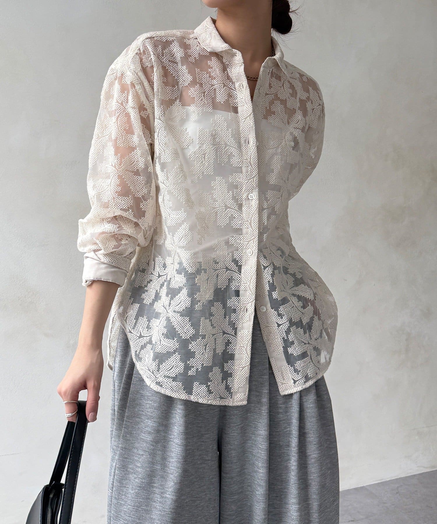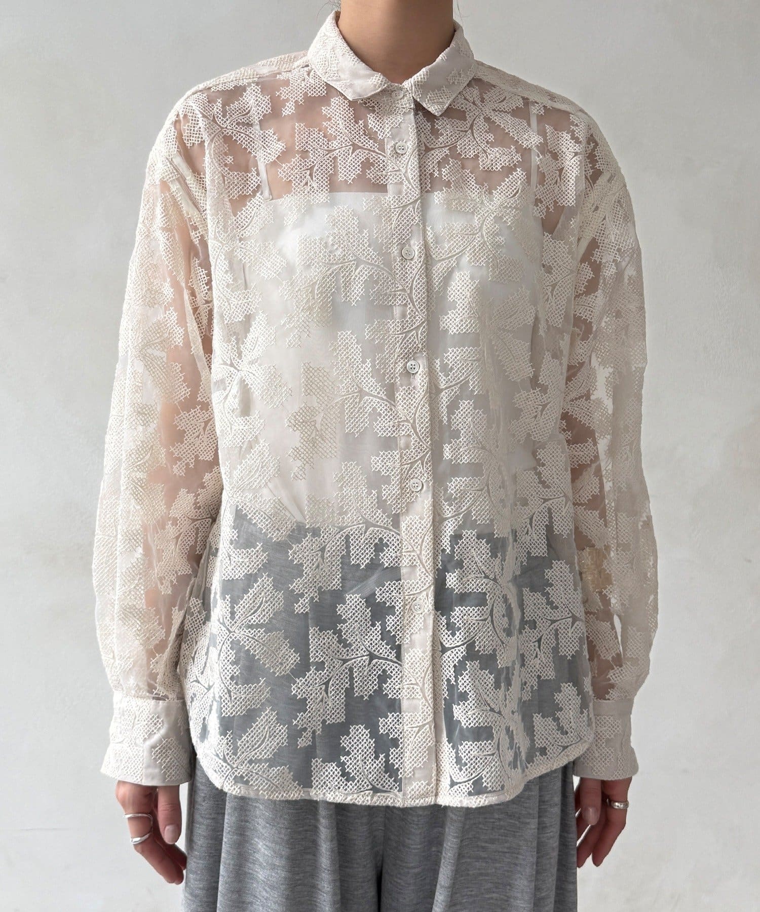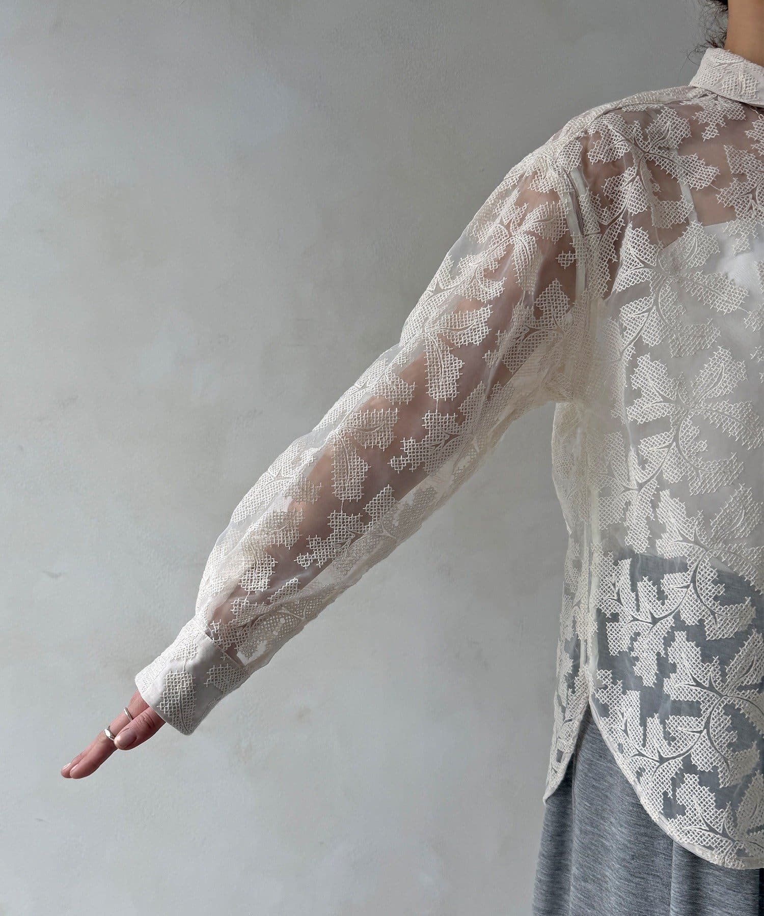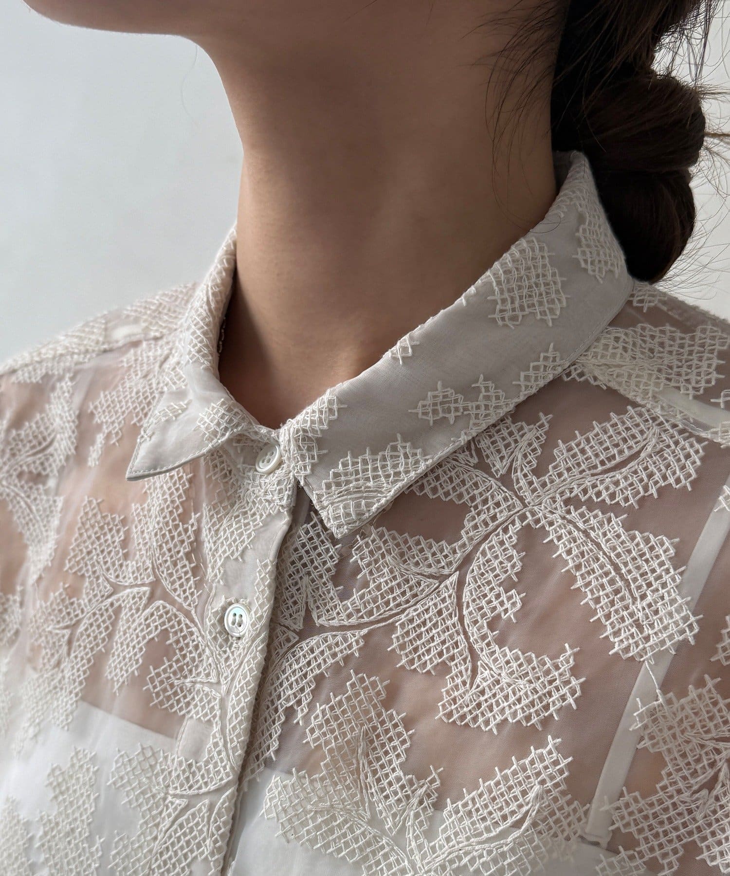 透け感のある繊細なデザインが目を引く、洗練されたシャツ