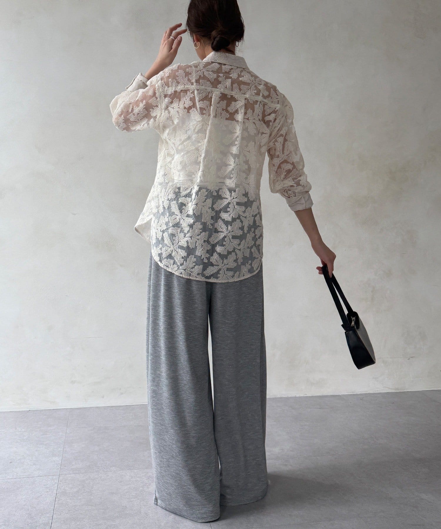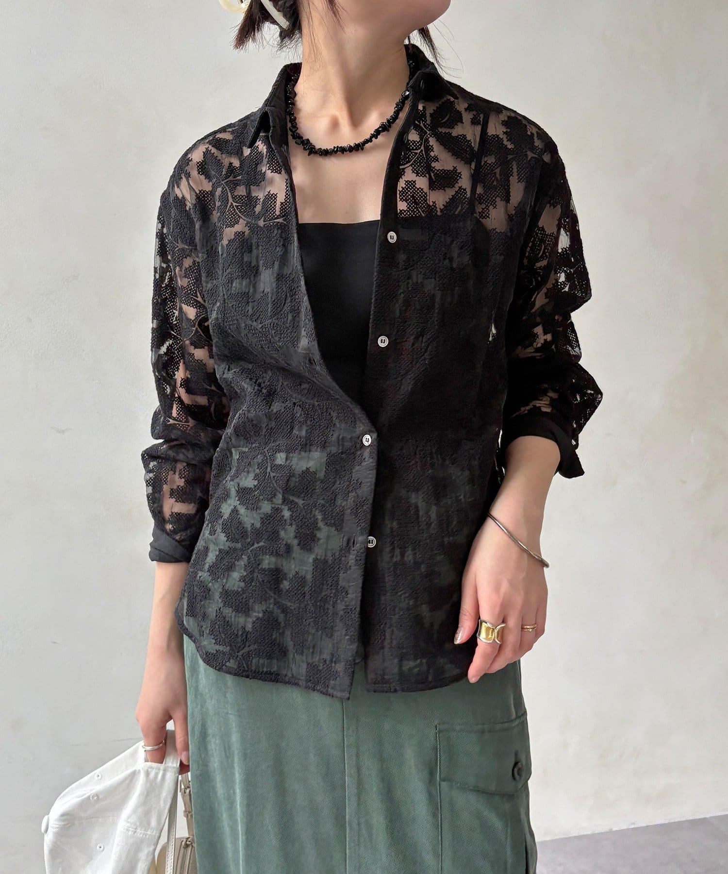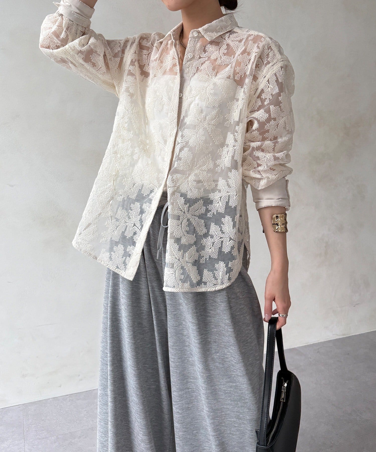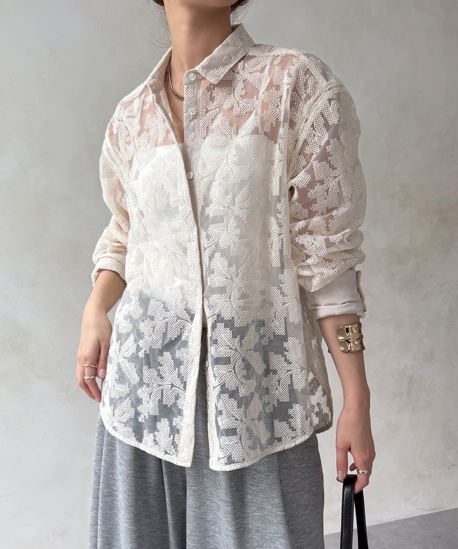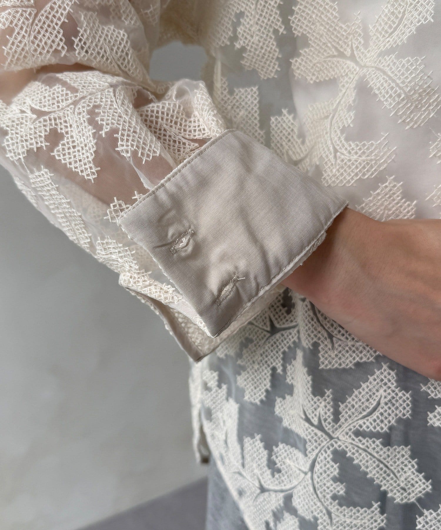 透け感のある繊細なデザインが目を引く、洗練されたシャツ