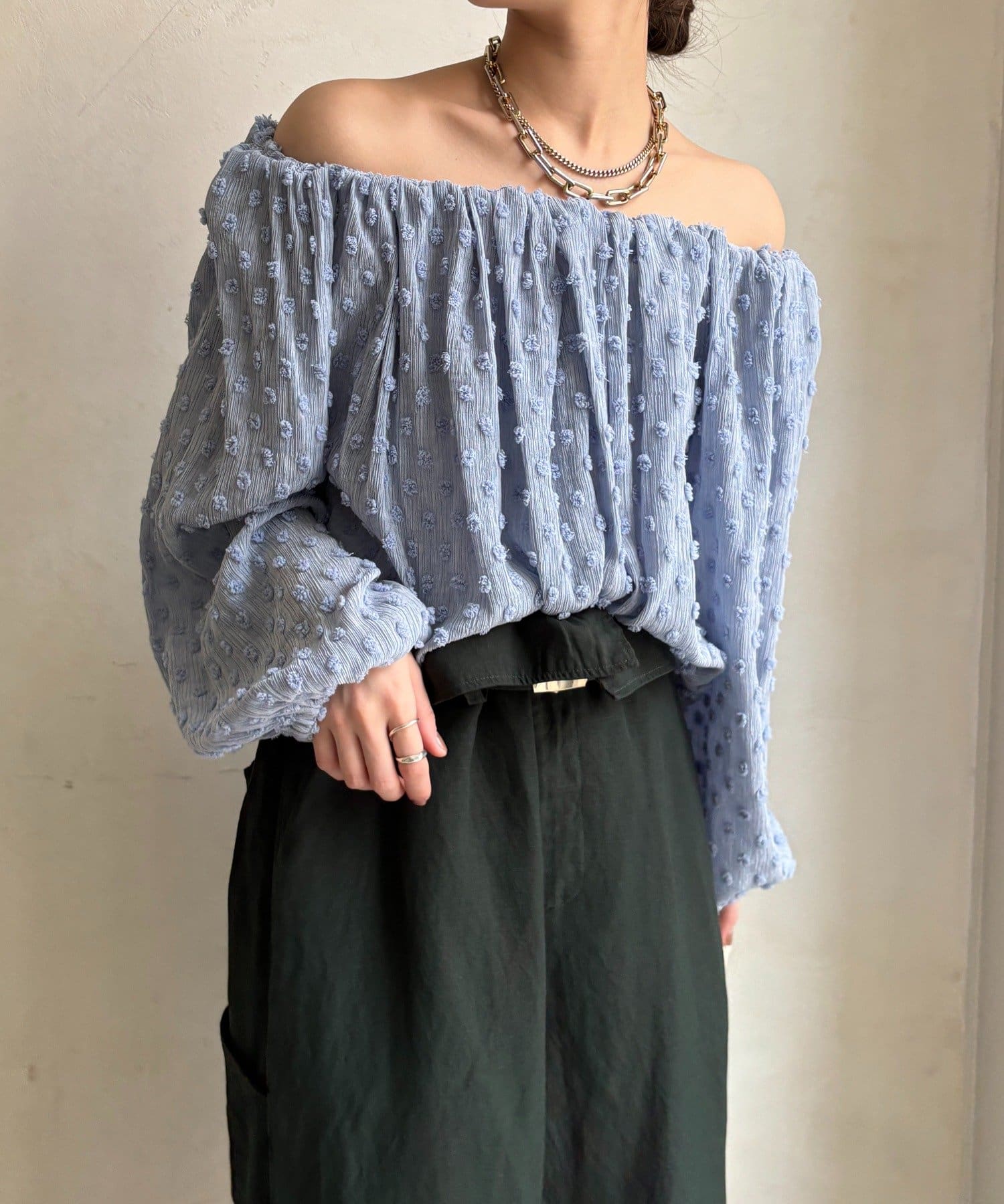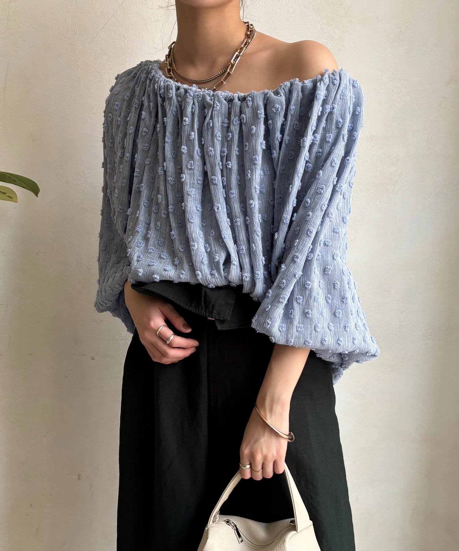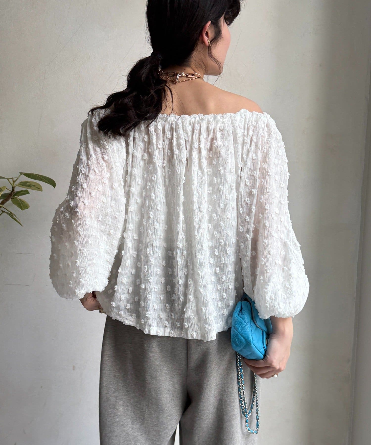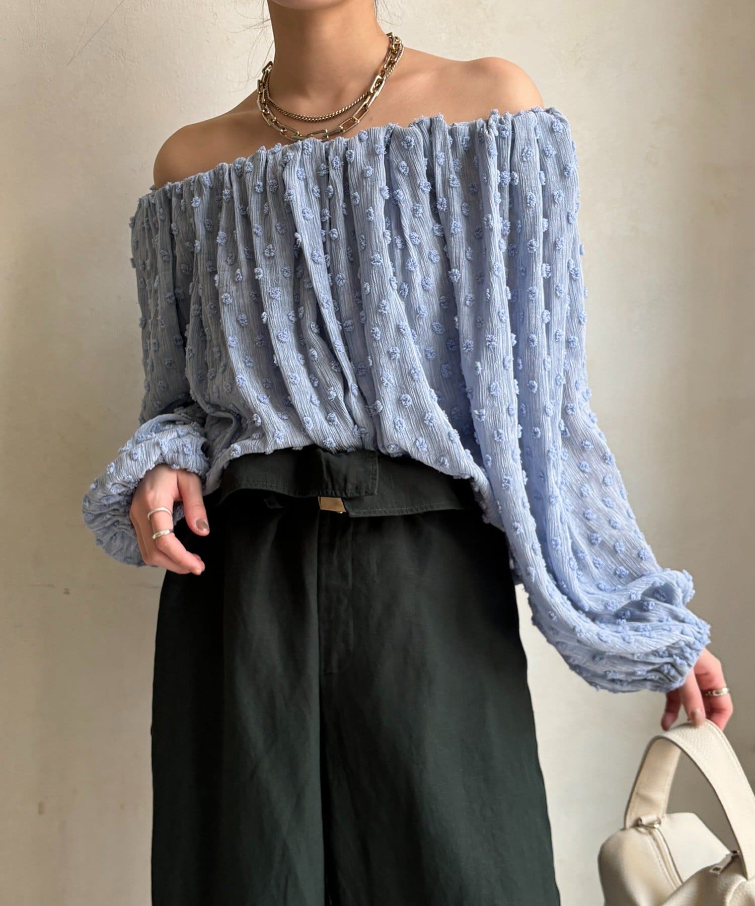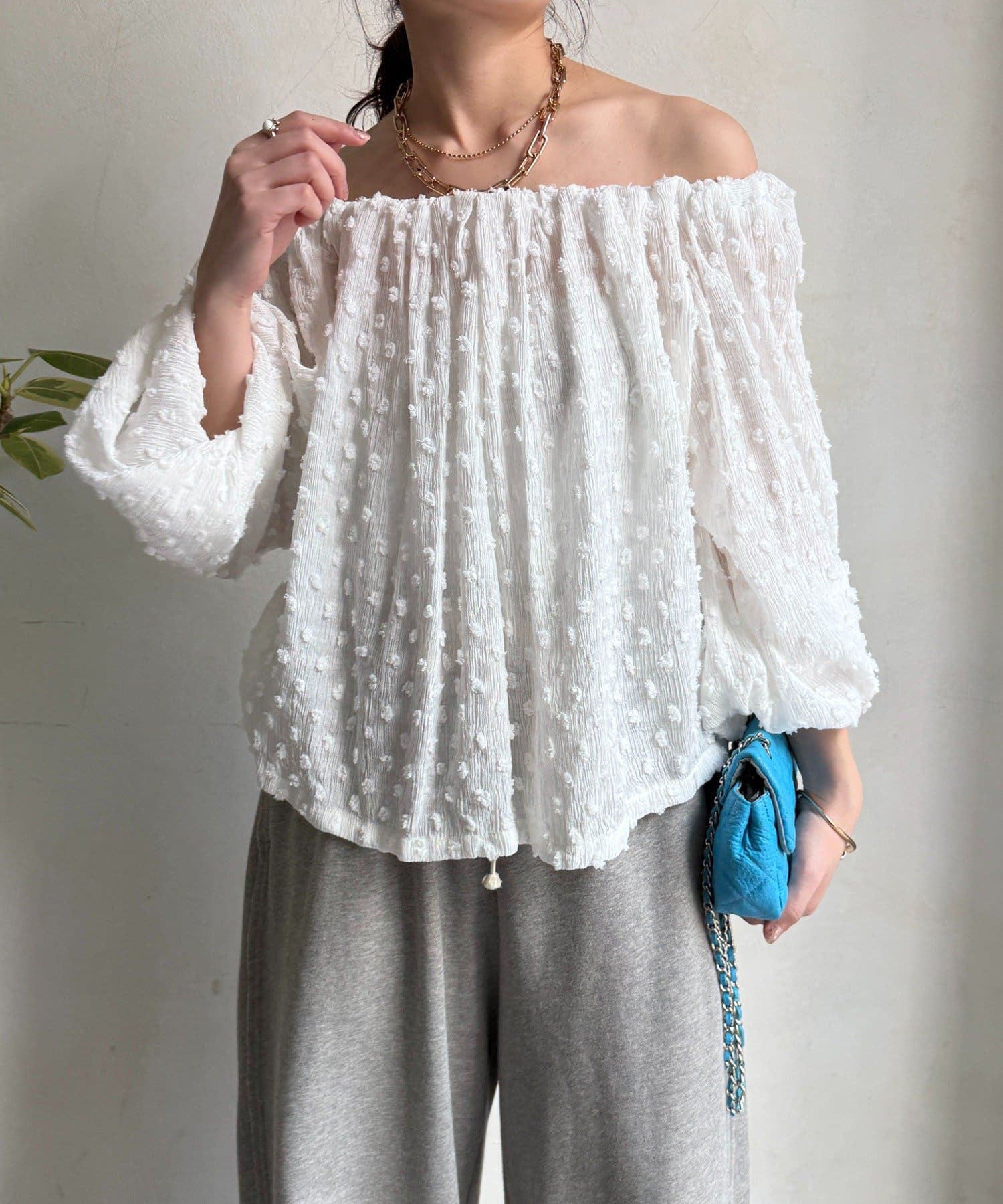 ふんわりとした立体感と繊細な表情が魅力のオフショルブラウス。