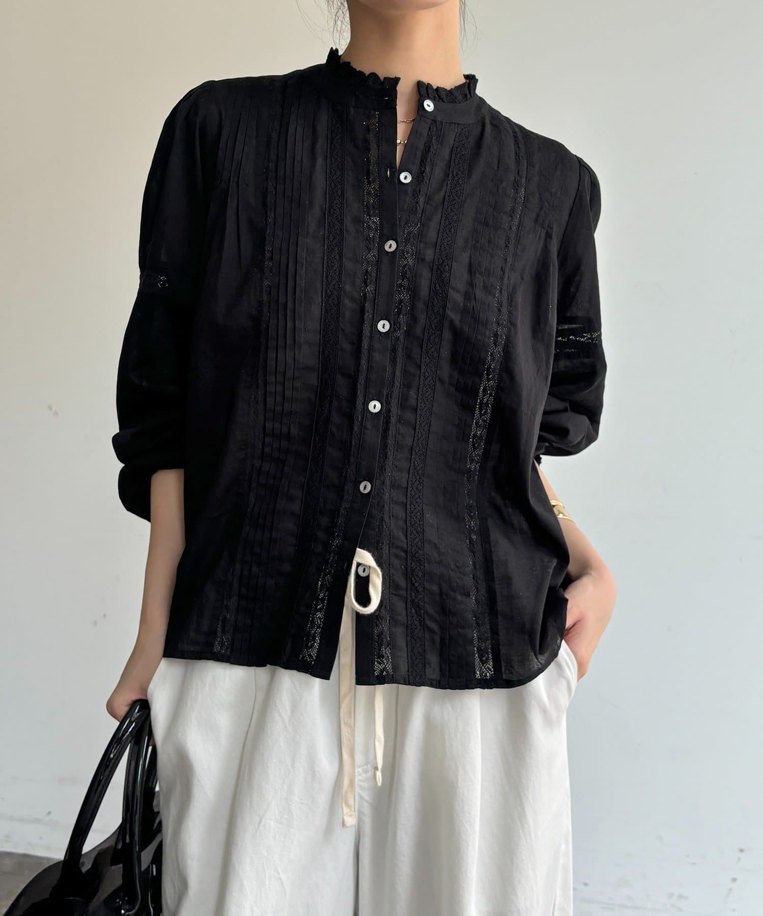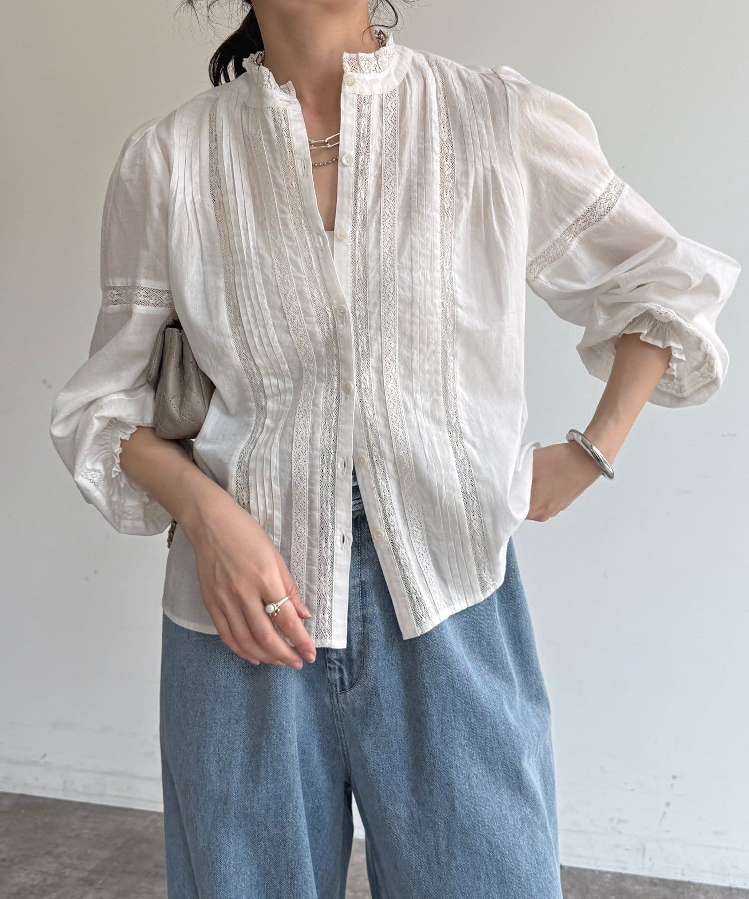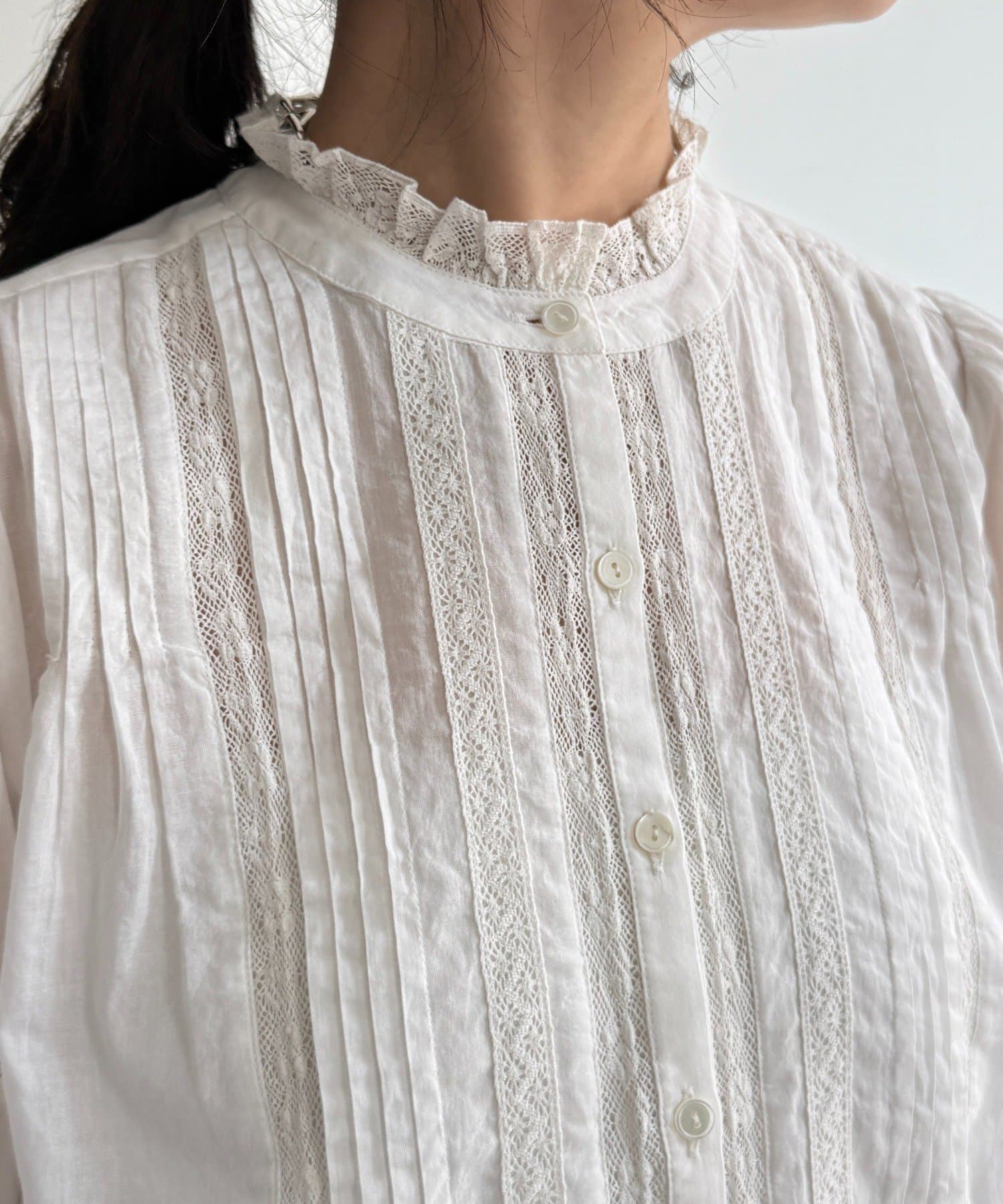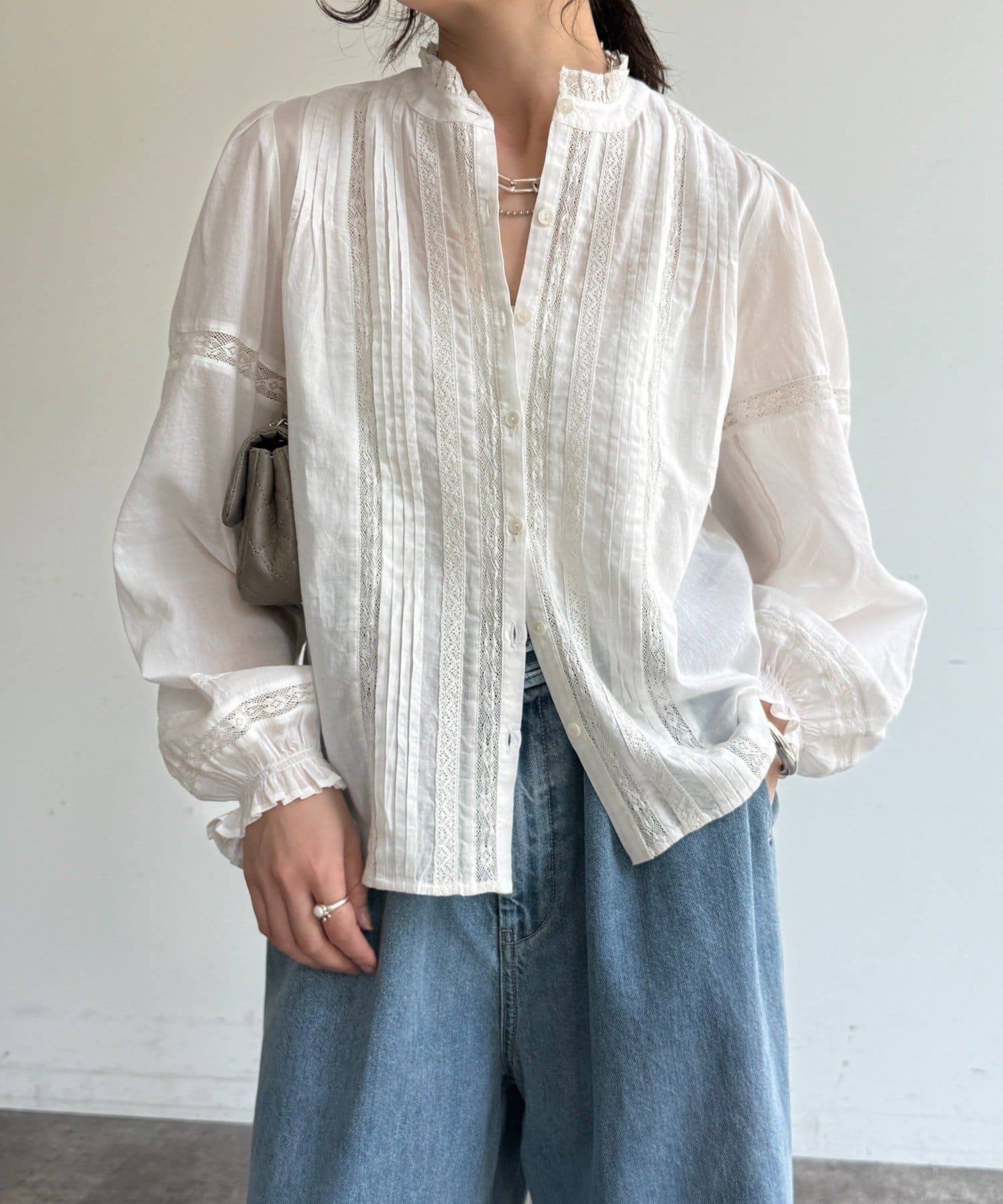 フロントには縦に施されたピンタックとレースが並び、シンプルながらも奥行きのある表情に。