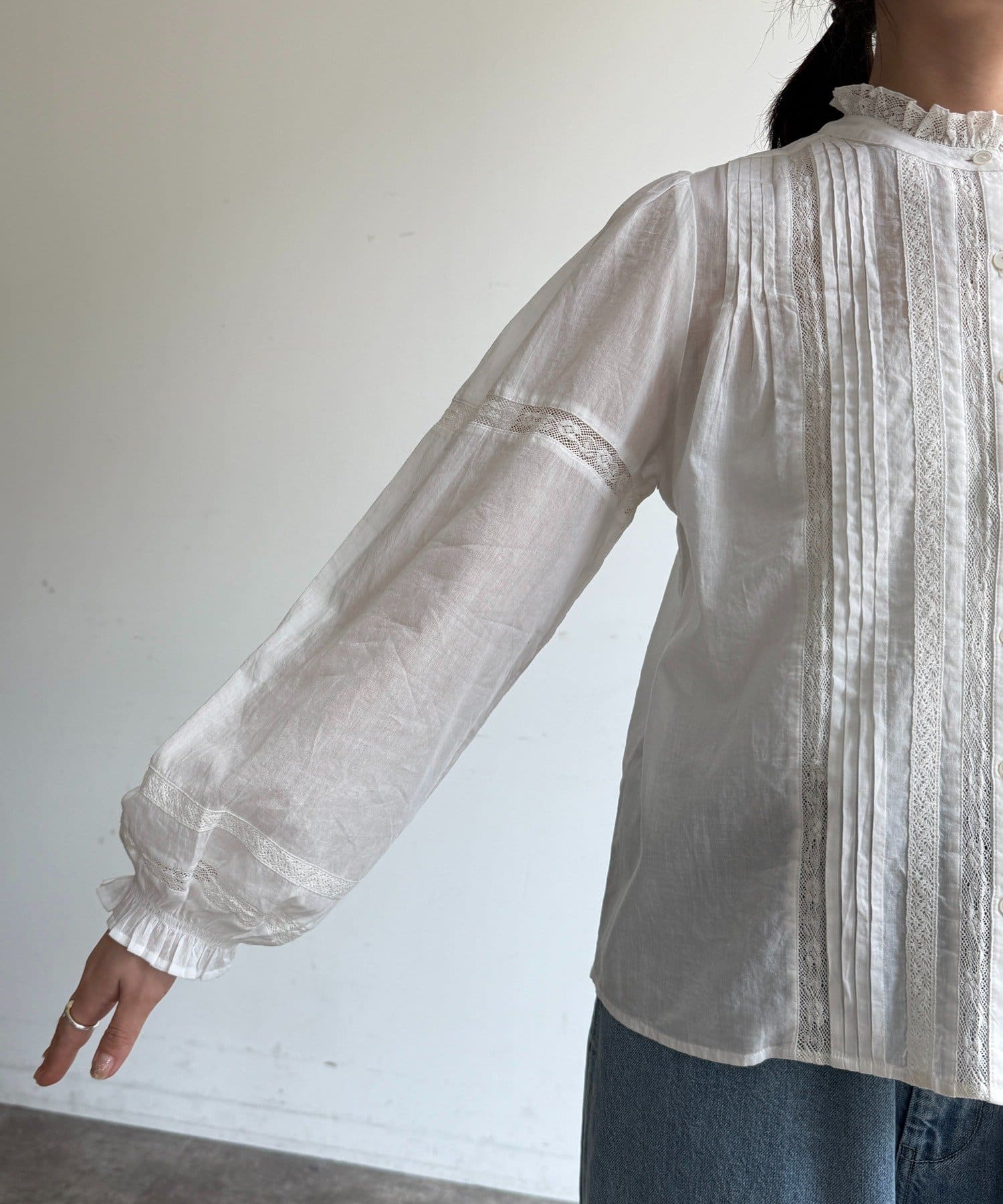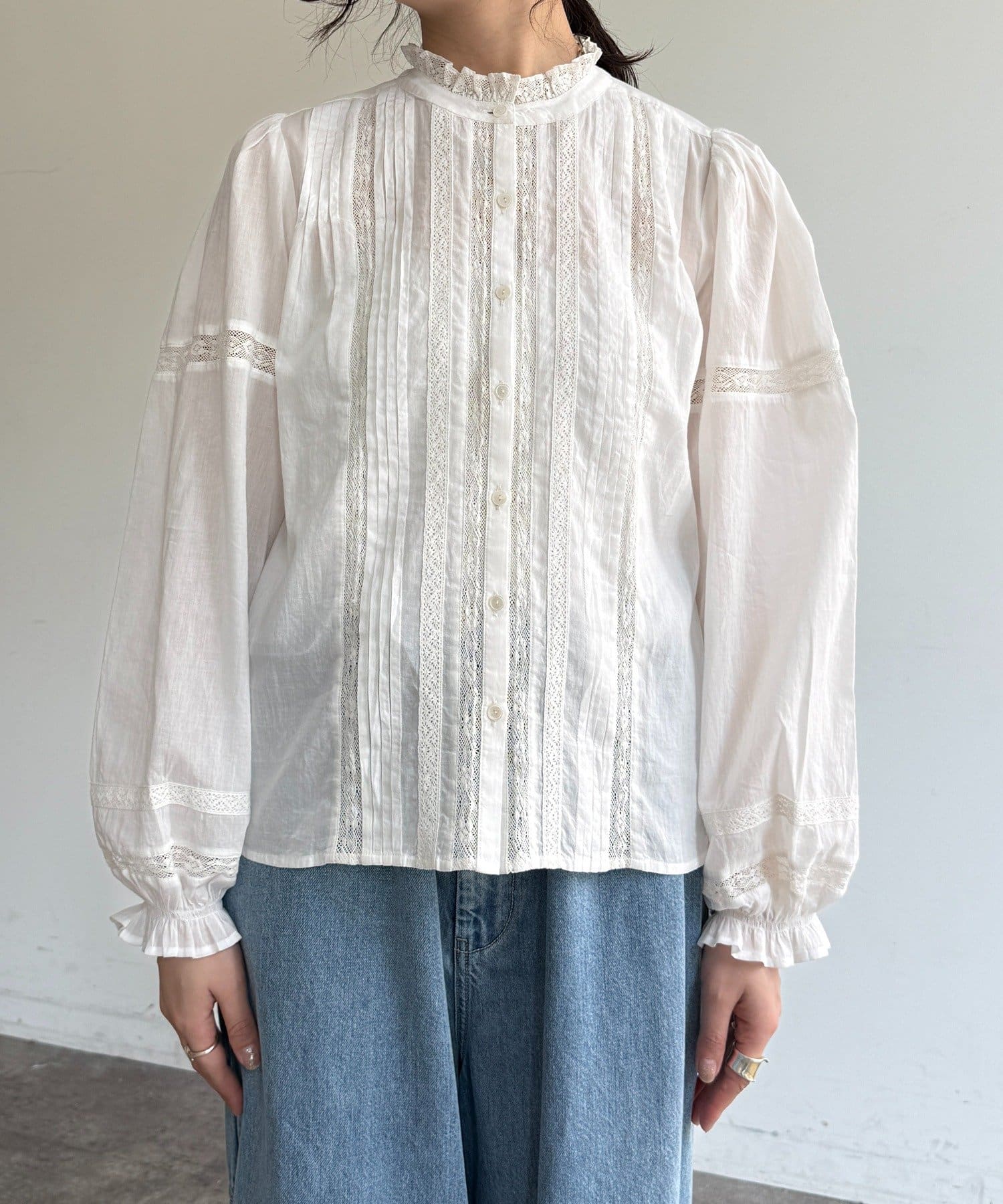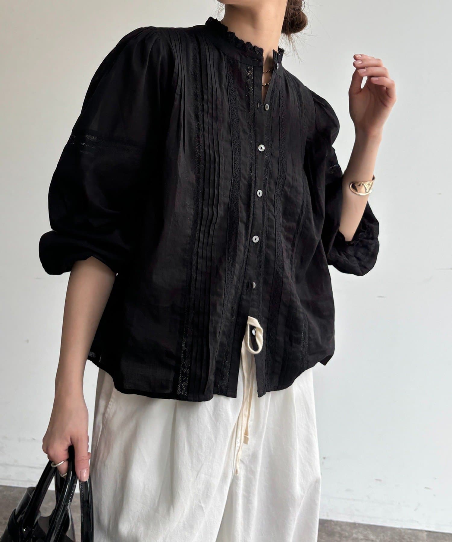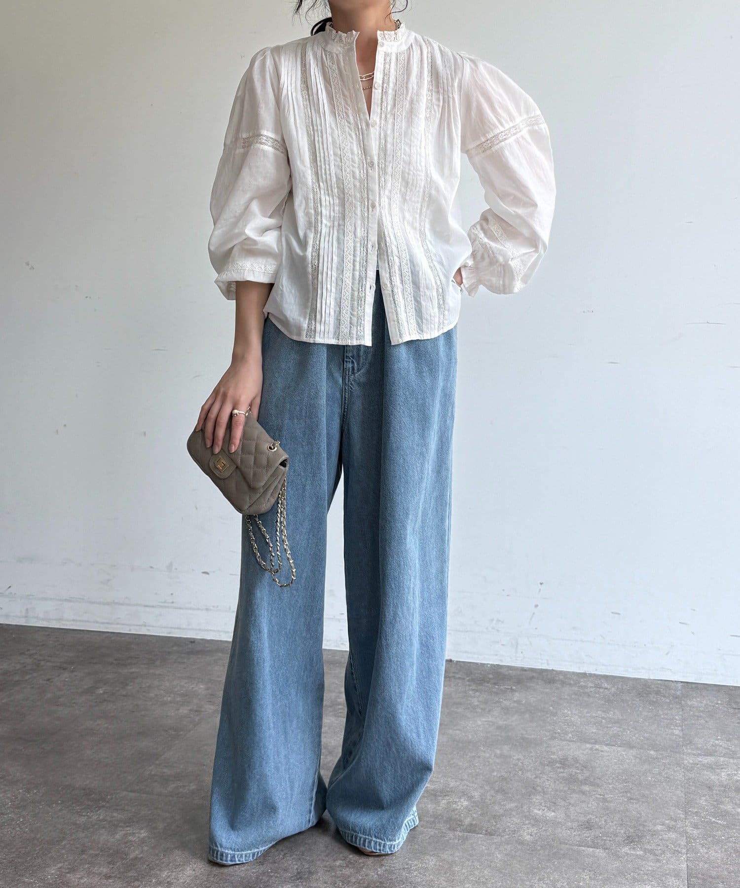 フロントには縦に施されたピンタックとレースが並び、シンプルながらも奥行きのある表情に。