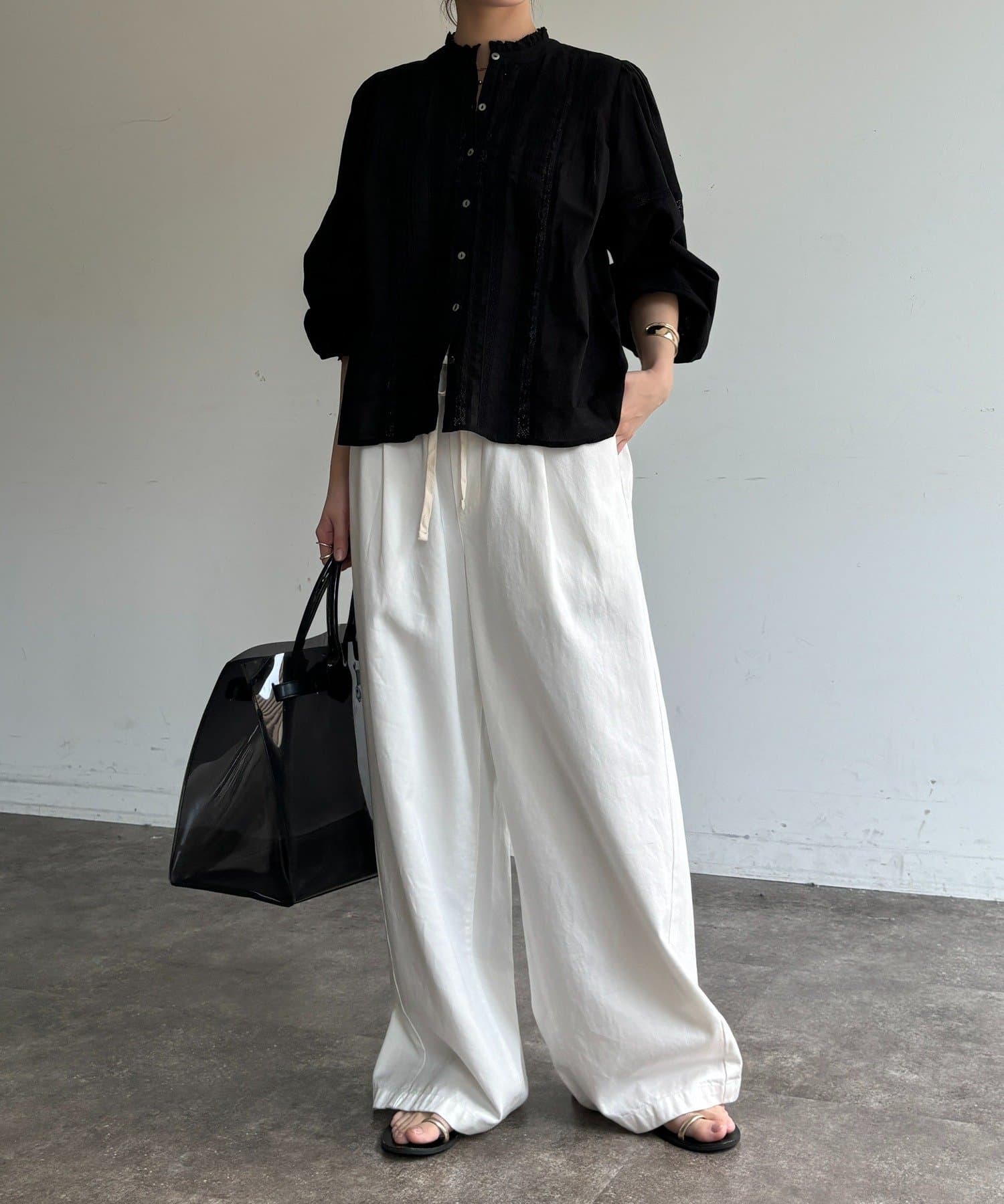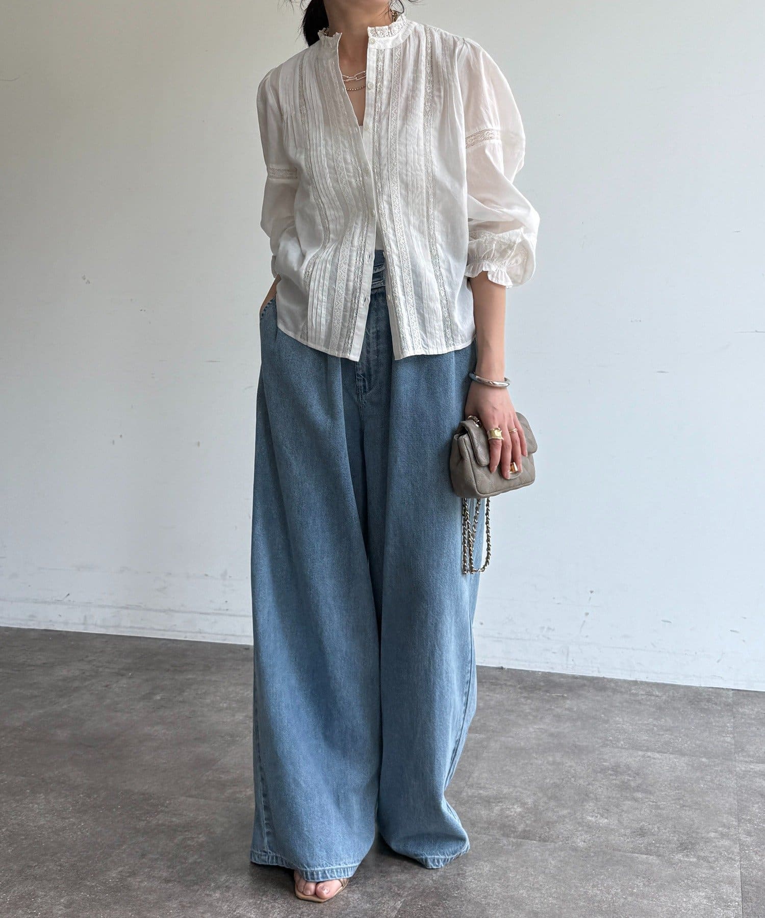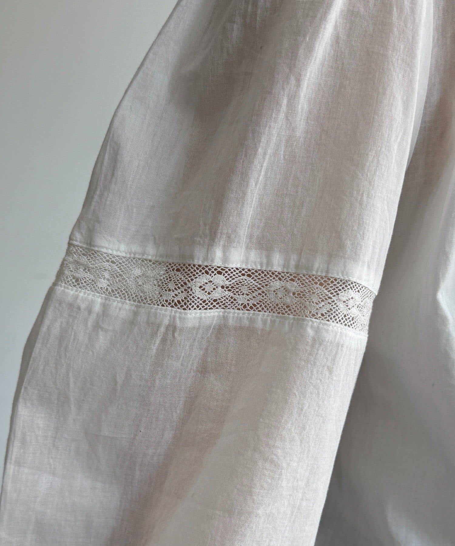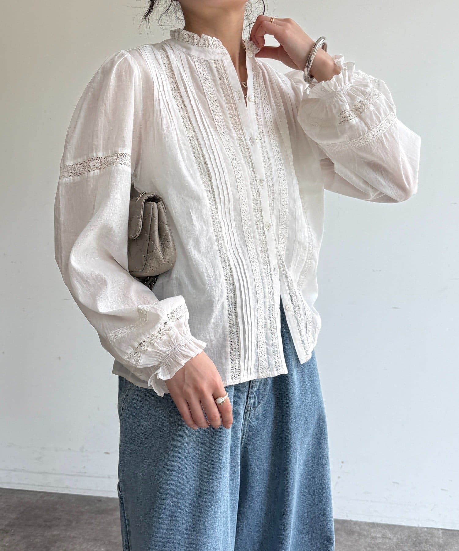 フロントには縦に施されたピンタックとレースが並び、シンプルながらも奥行きのある表情に。