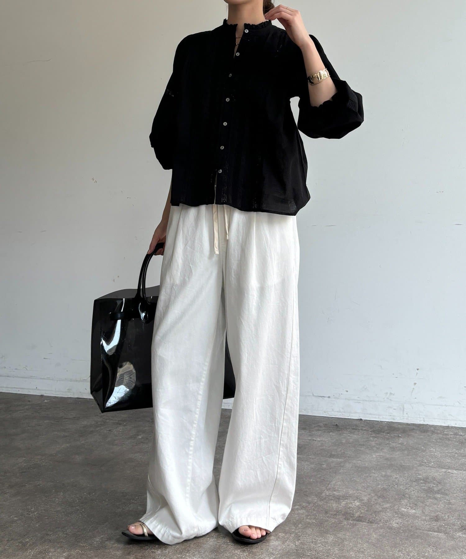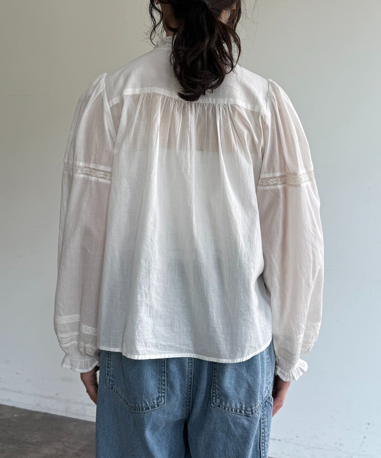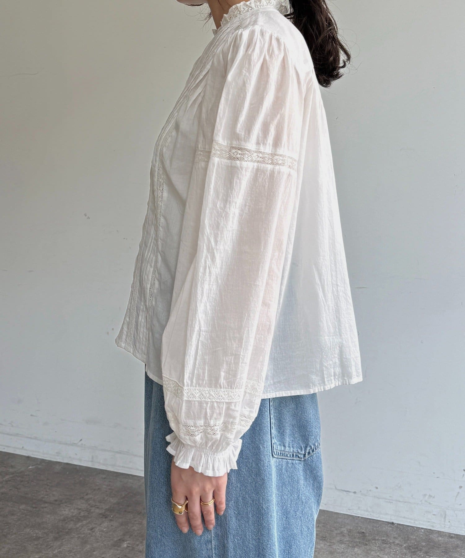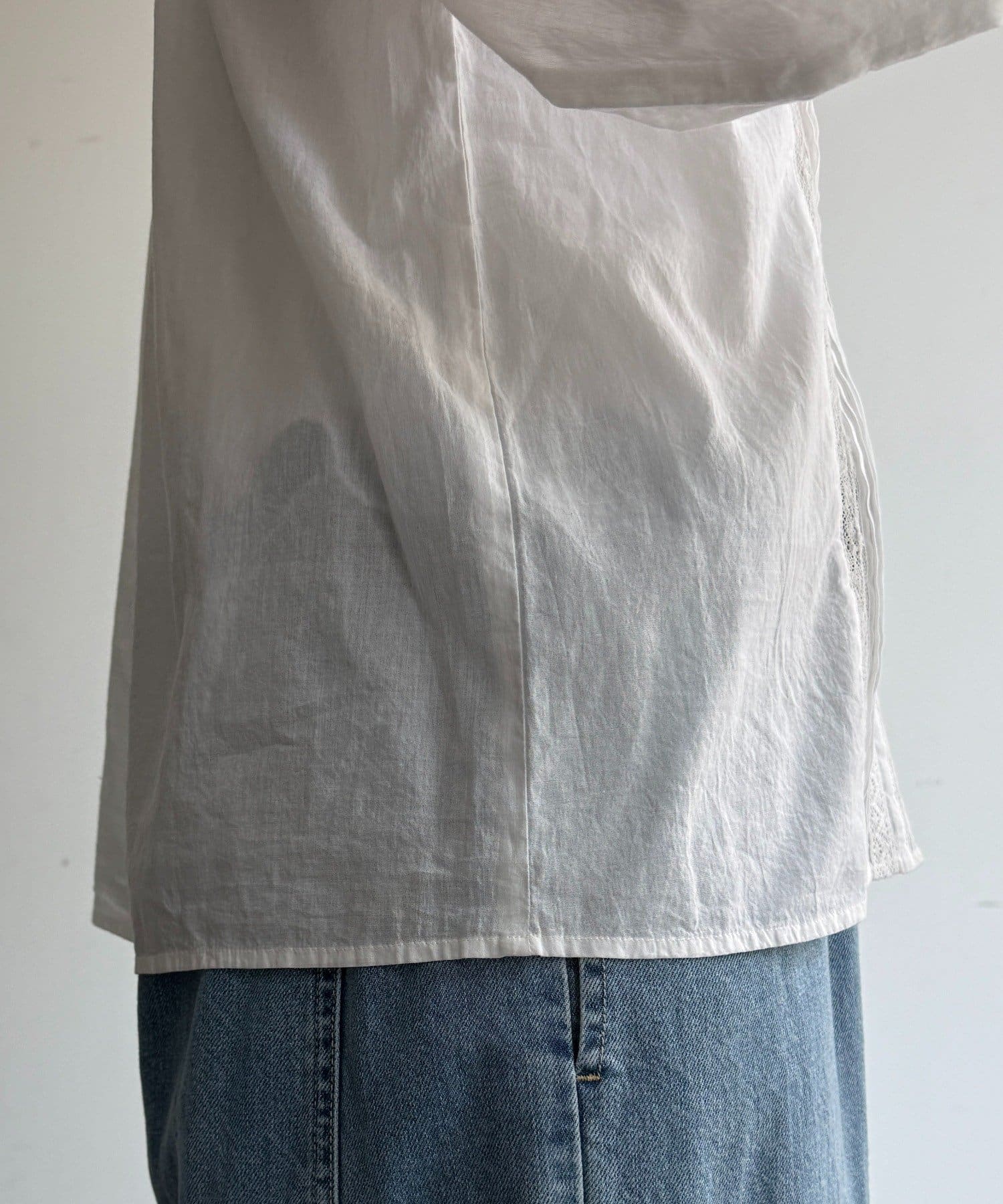 フロントには縦に施されたピンタックとレースが並び、シンプルながらも奥行きのある表情に。
