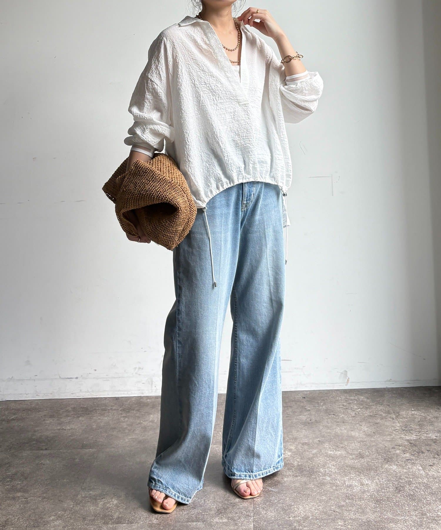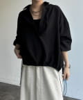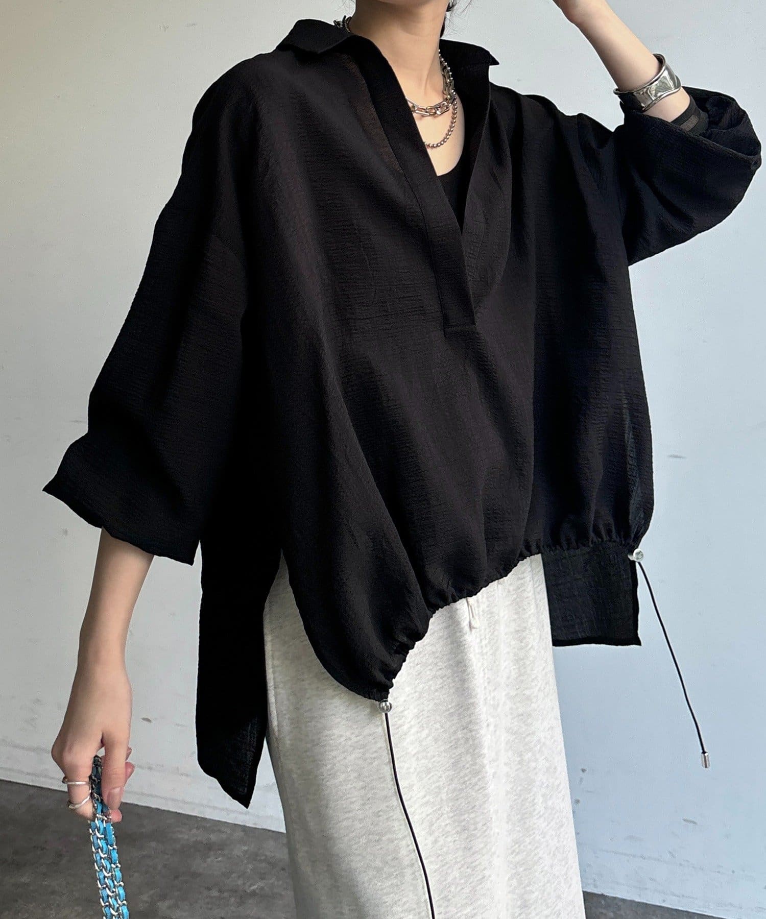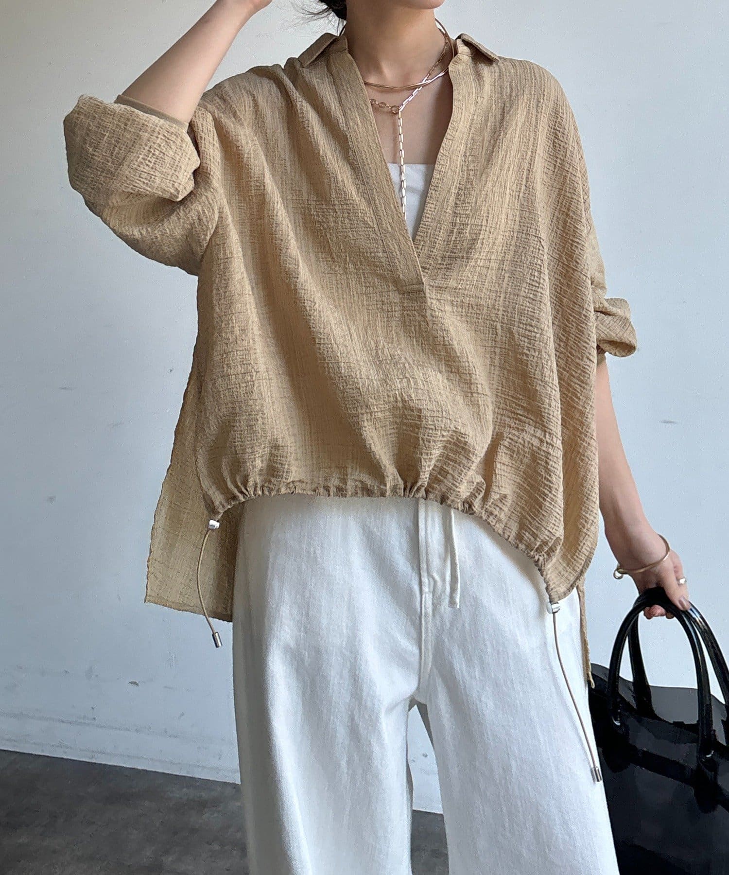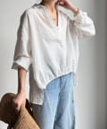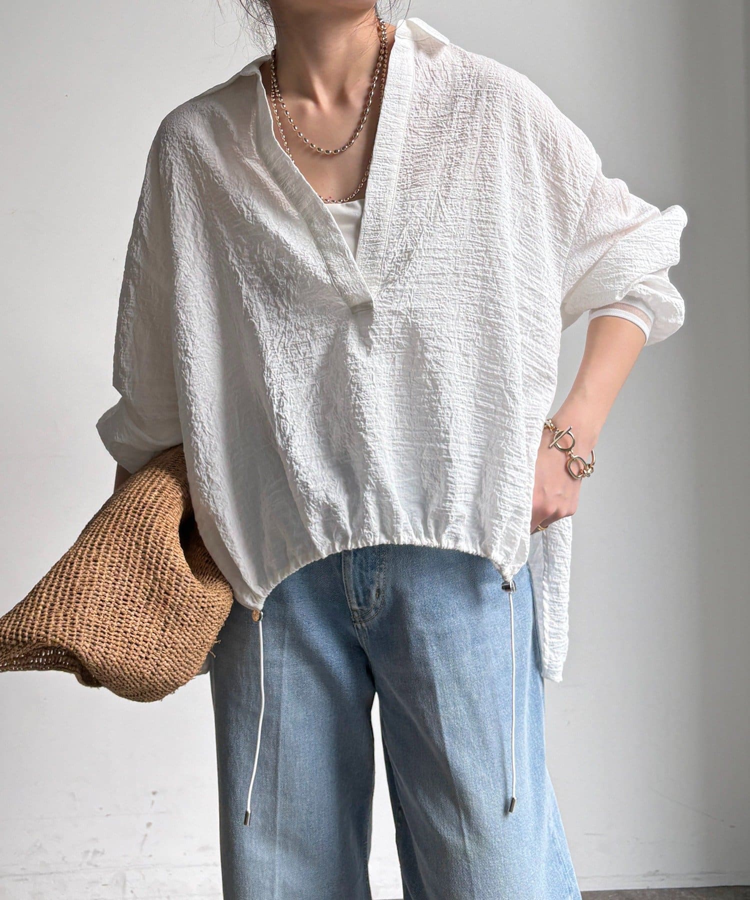 顔まわりをすっきりと見せてくれるスキッパーデザインと、シルエットに変化をつけられるドローストリング仕様が魅力の一枚です。