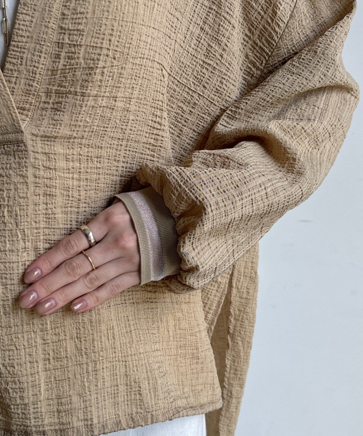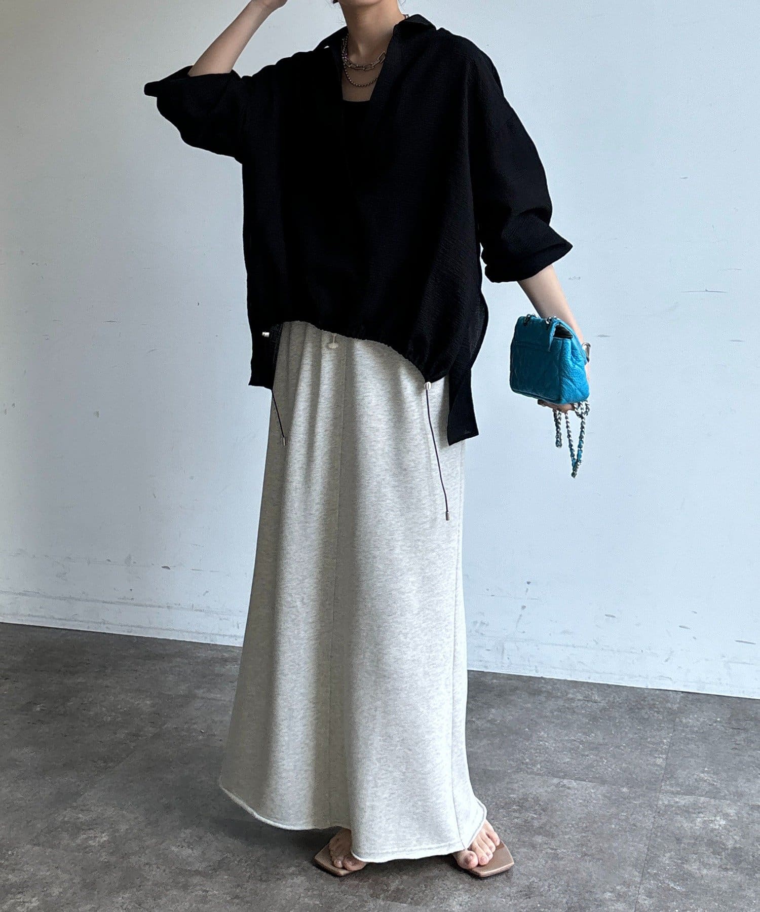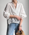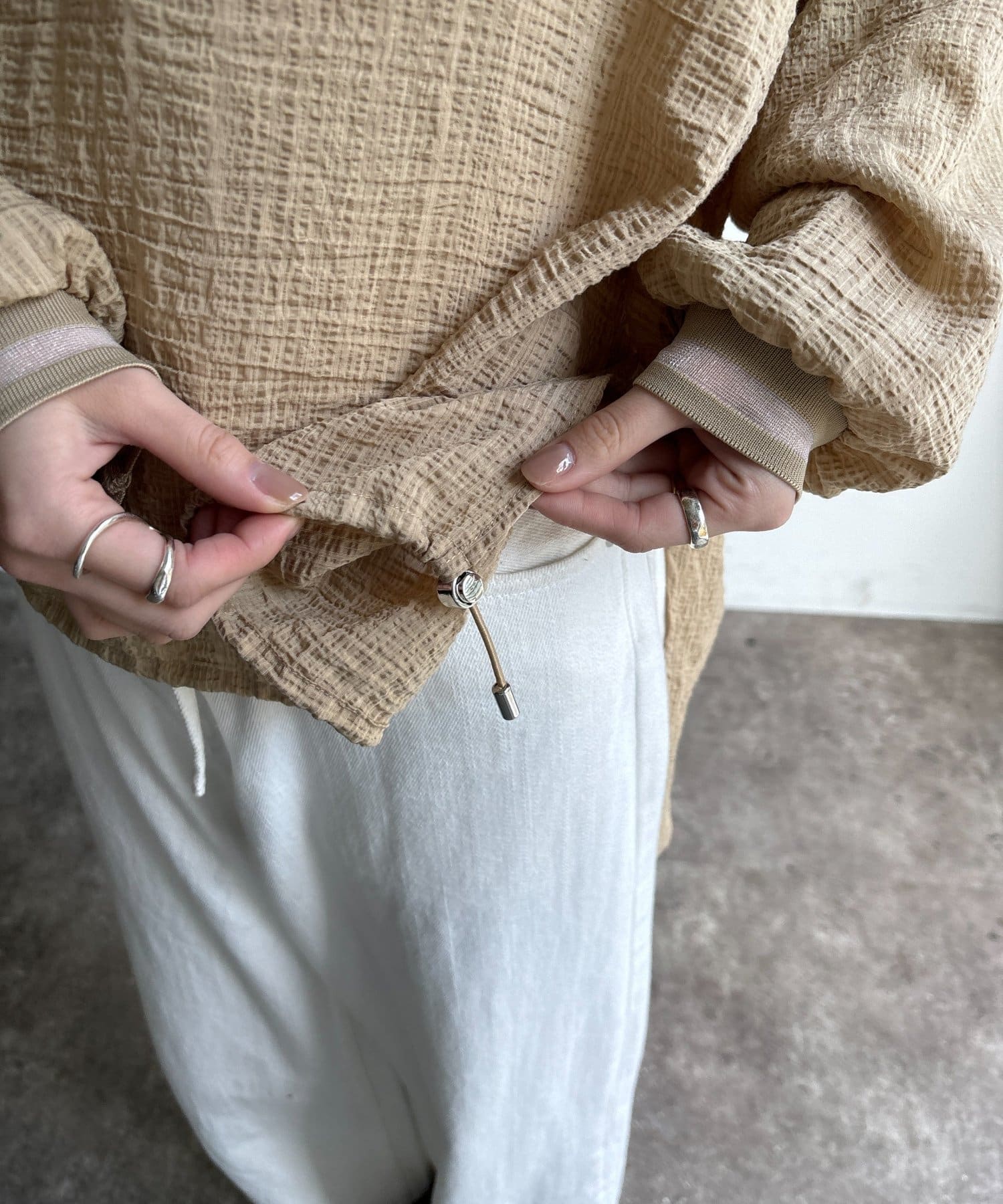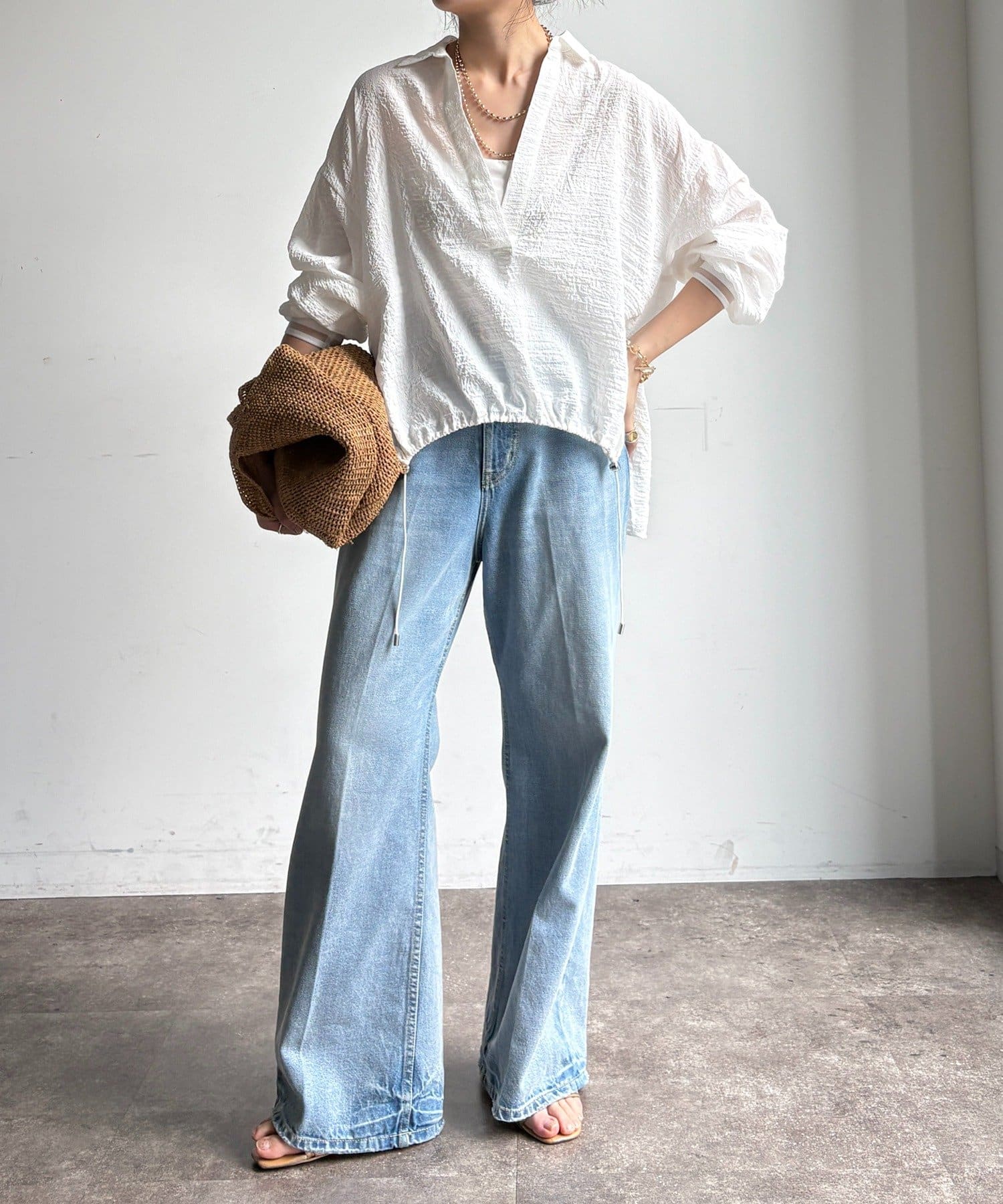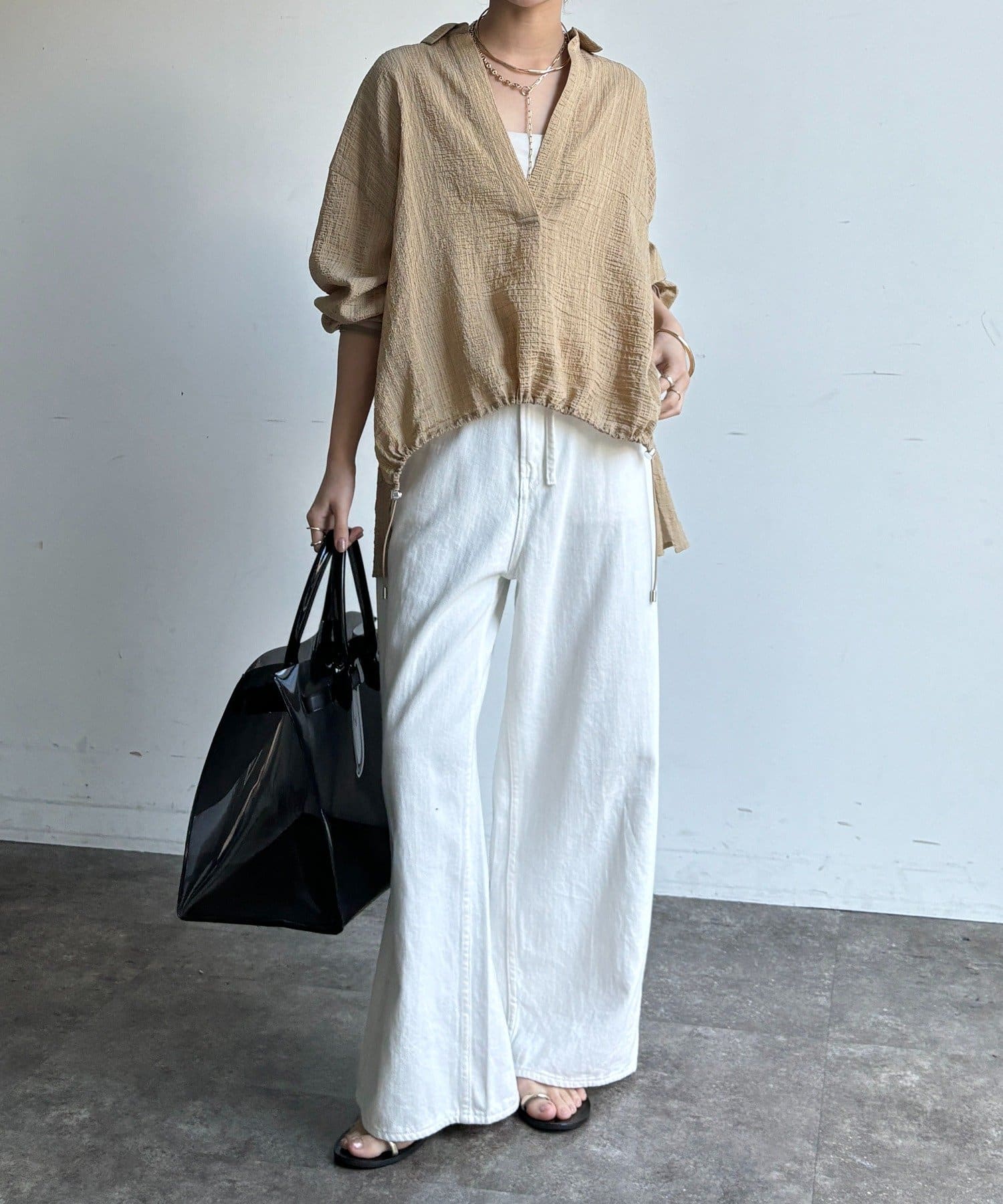 顔まわりをすっきりと見せてくれるスキッパーデザインと、シルエットに変化をつけられるドローストリング仕様が魅力の一枚です。