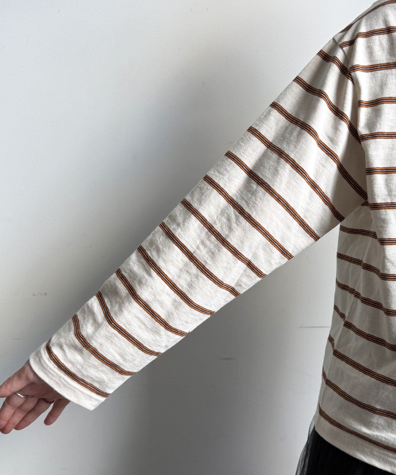 身頃は程よくゆとりを持たせたシルエットで、身体のラインを拾いすぎず、リラックスした着心地。