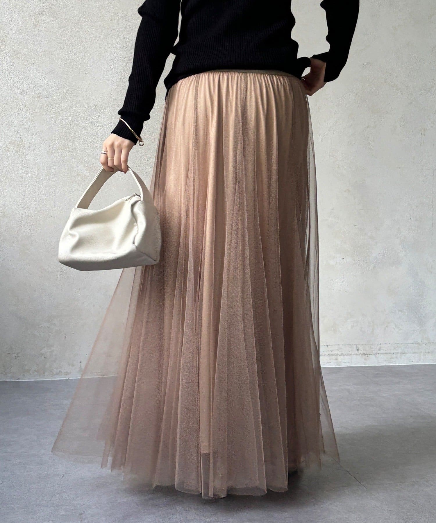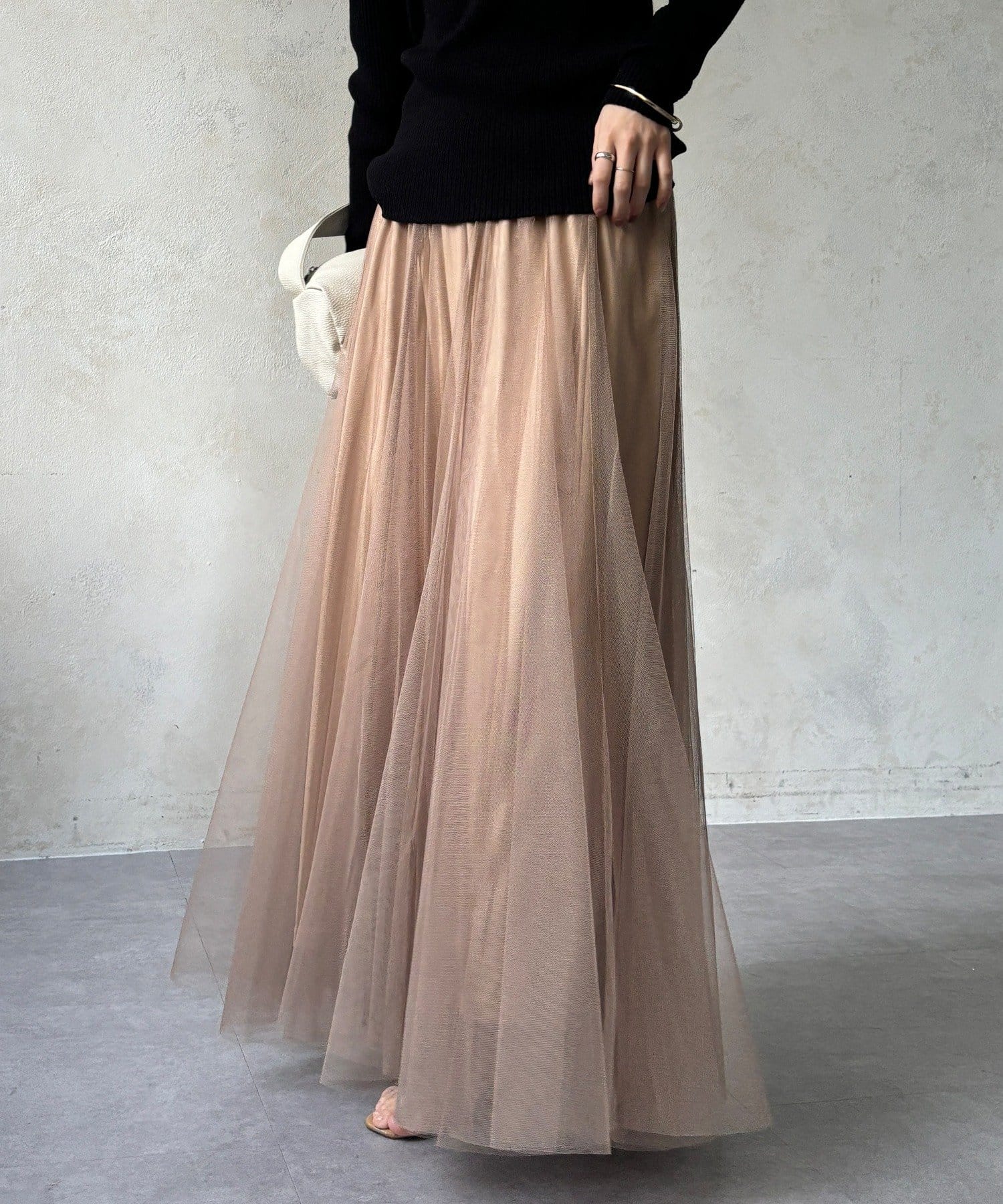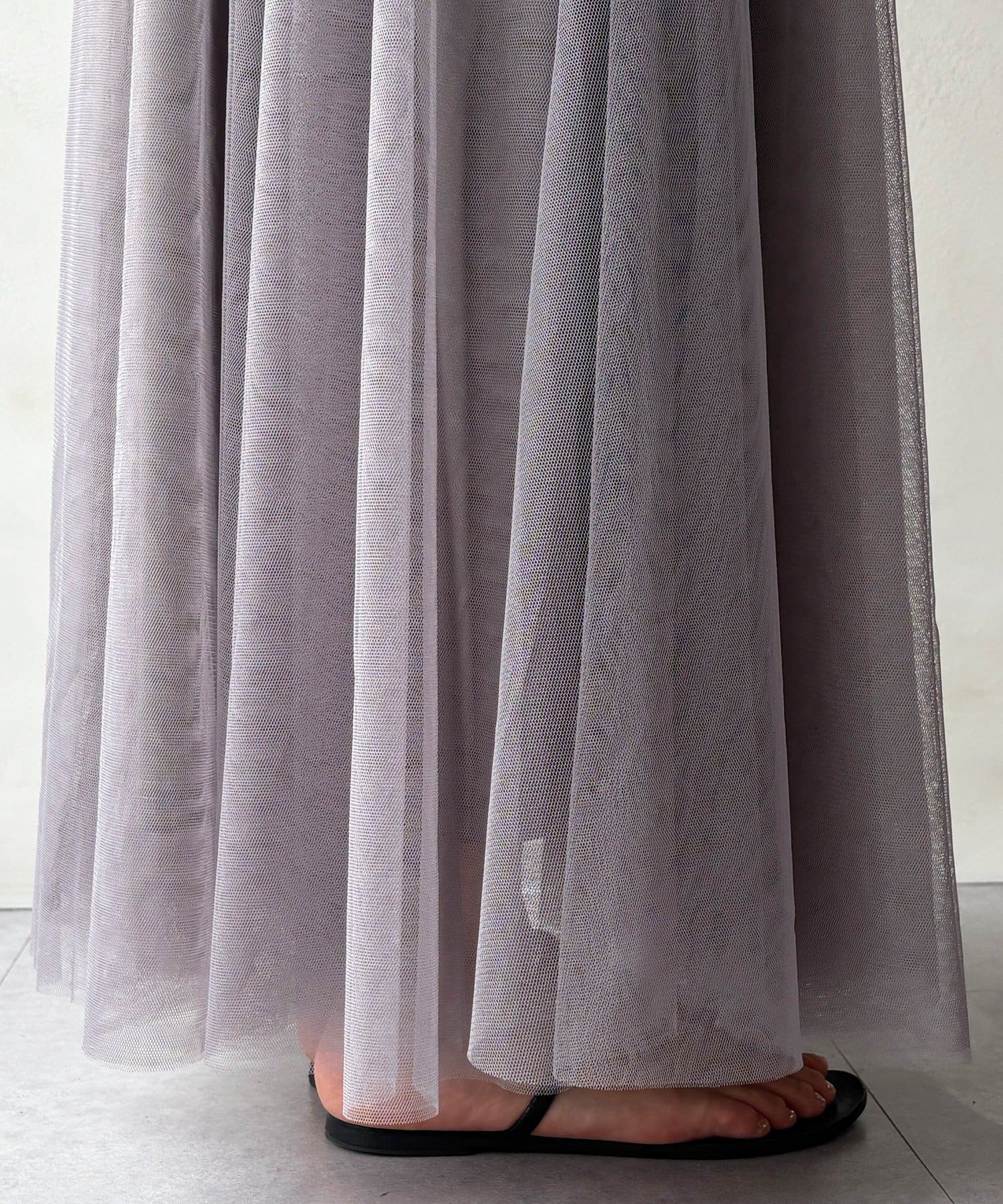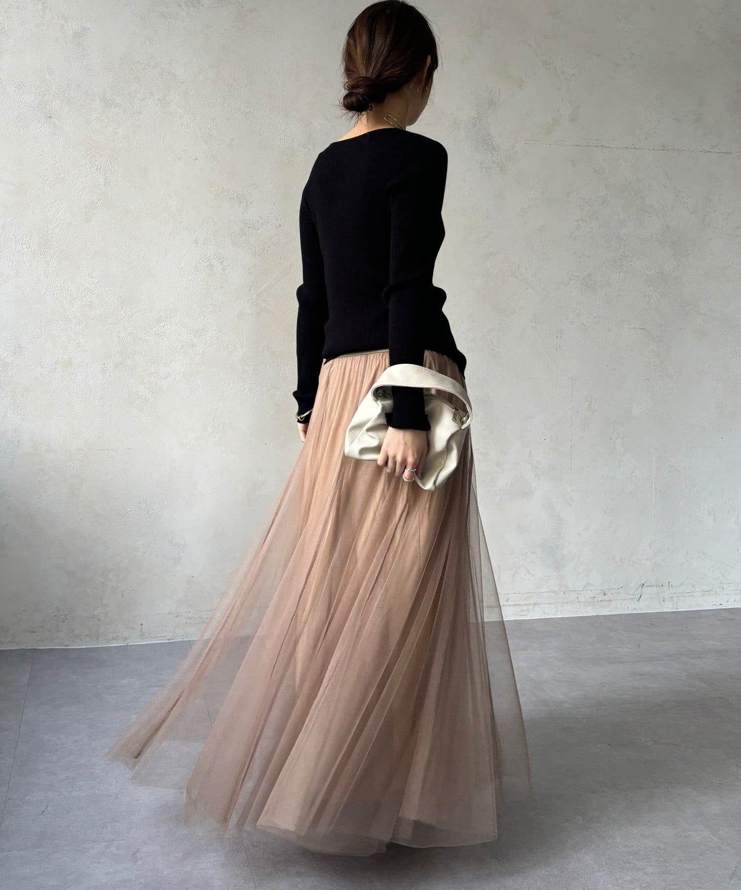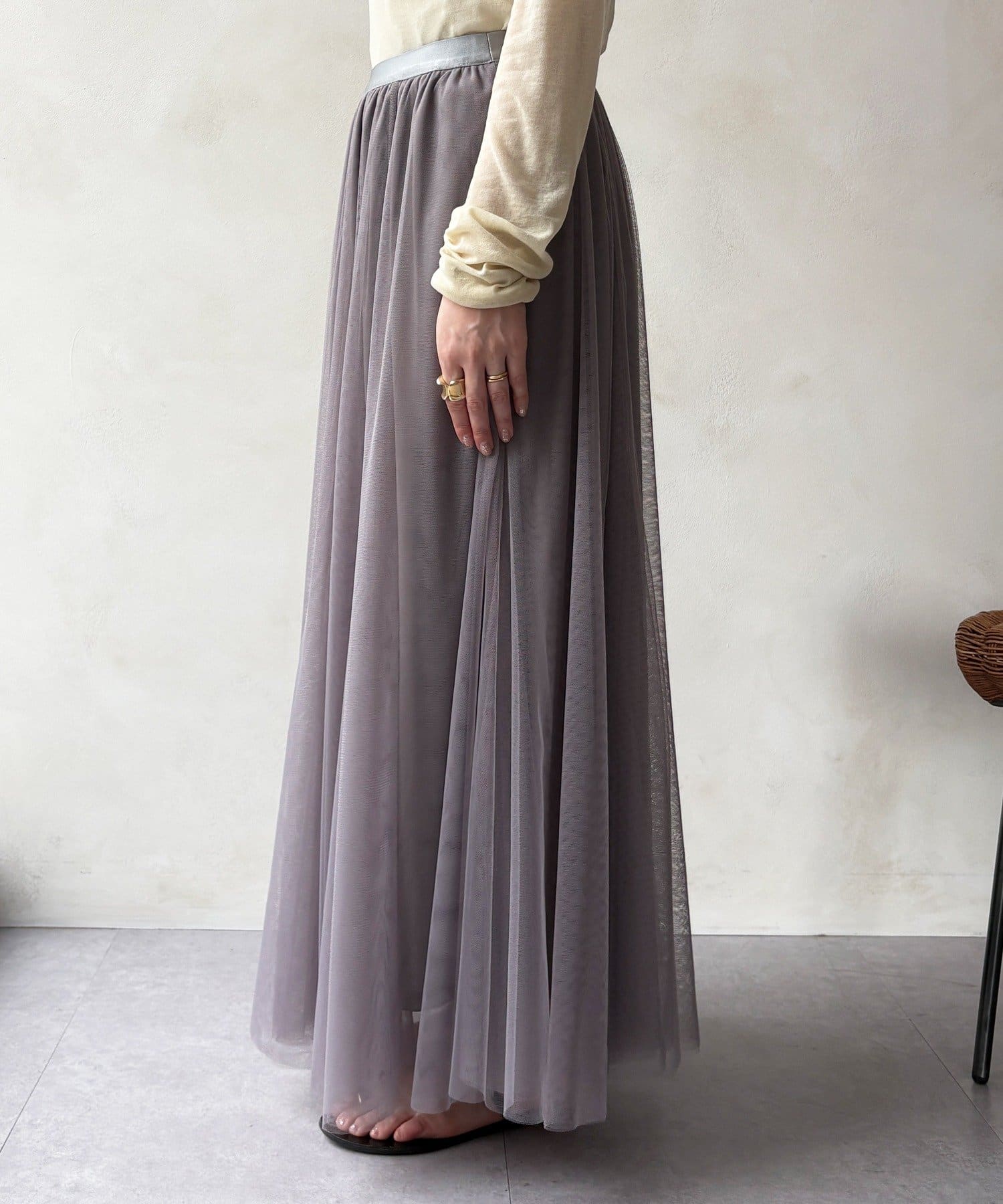 柔らかく揺れるチュールが、上品で女性らしい雰囲気を演出します。