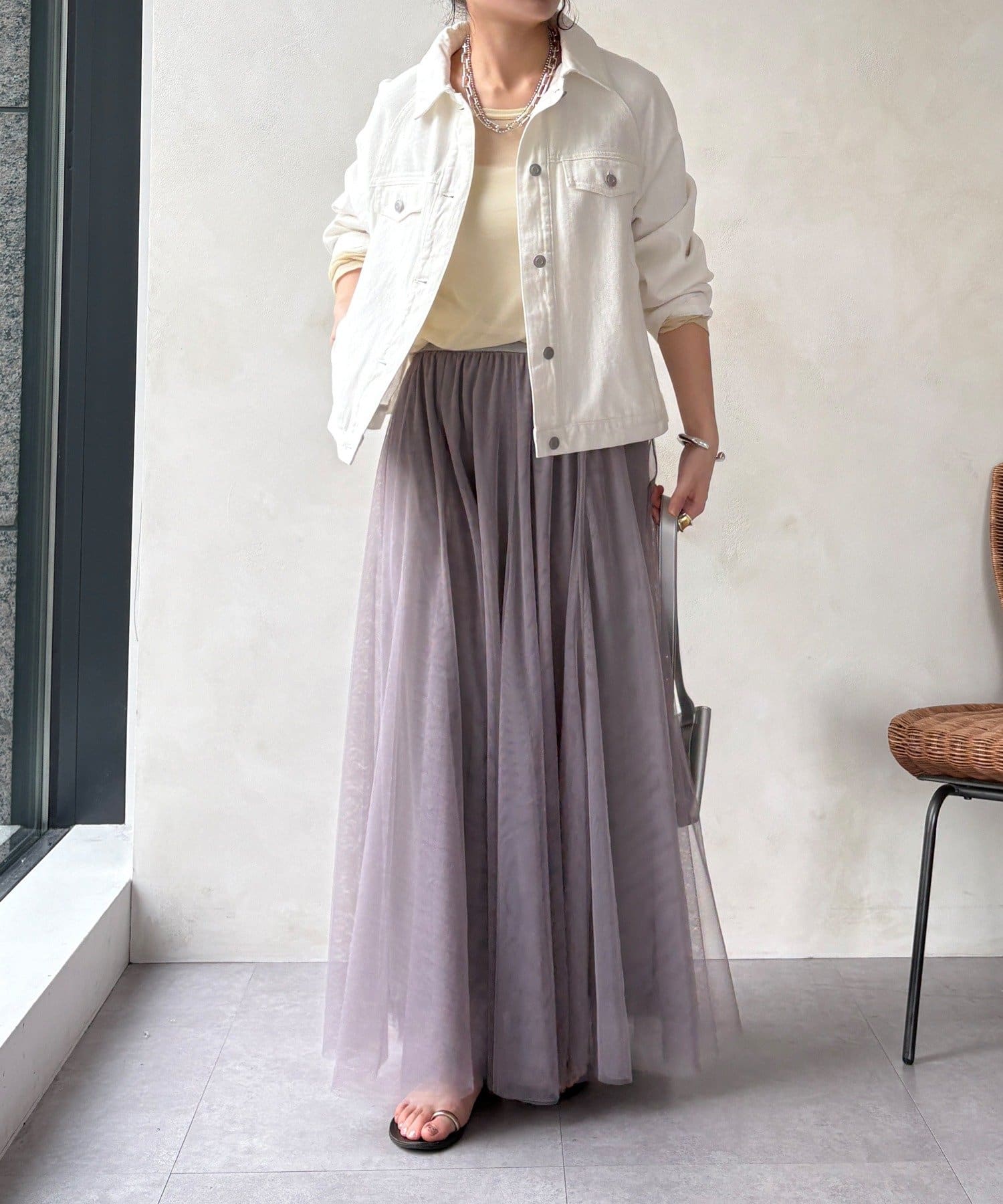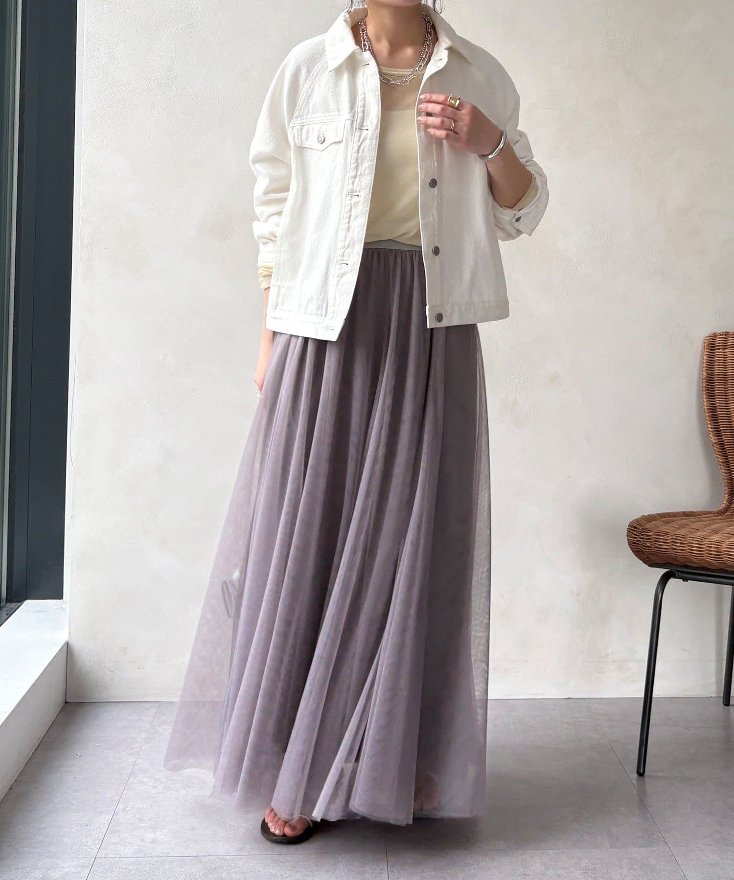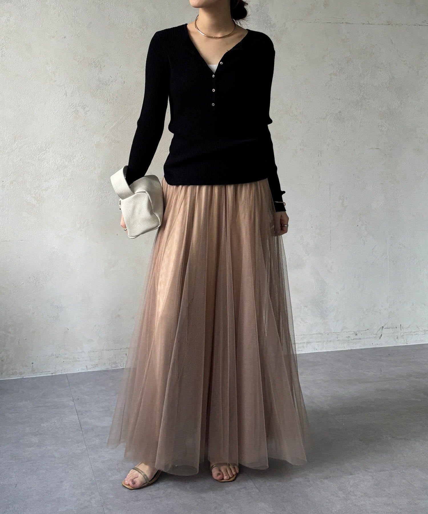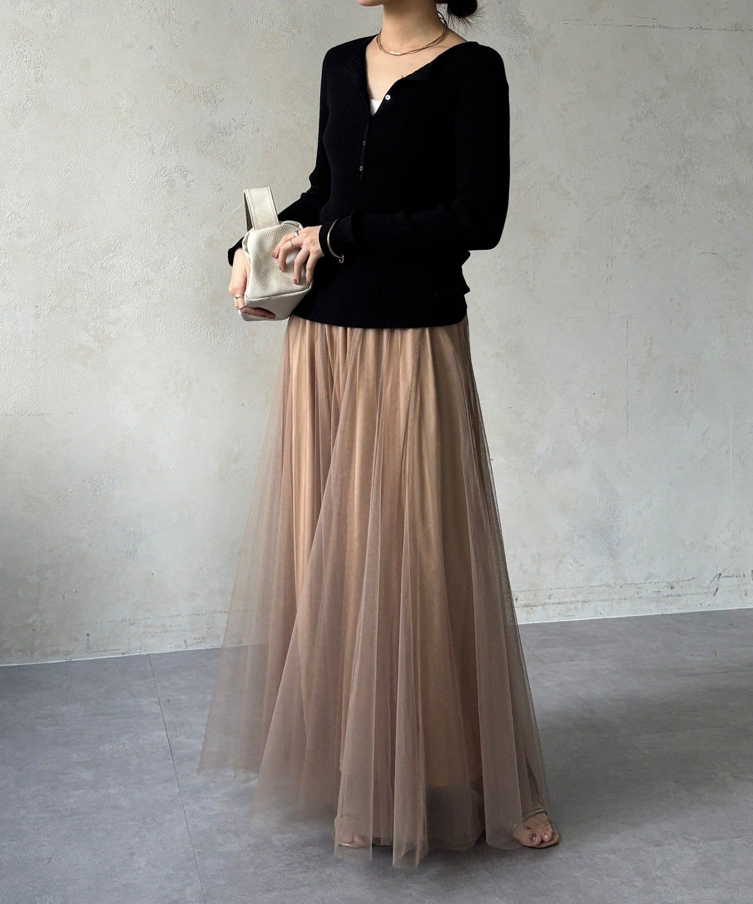 柔らかく揺れるチュールが、上品で女性らしい雰囲気を演出します。