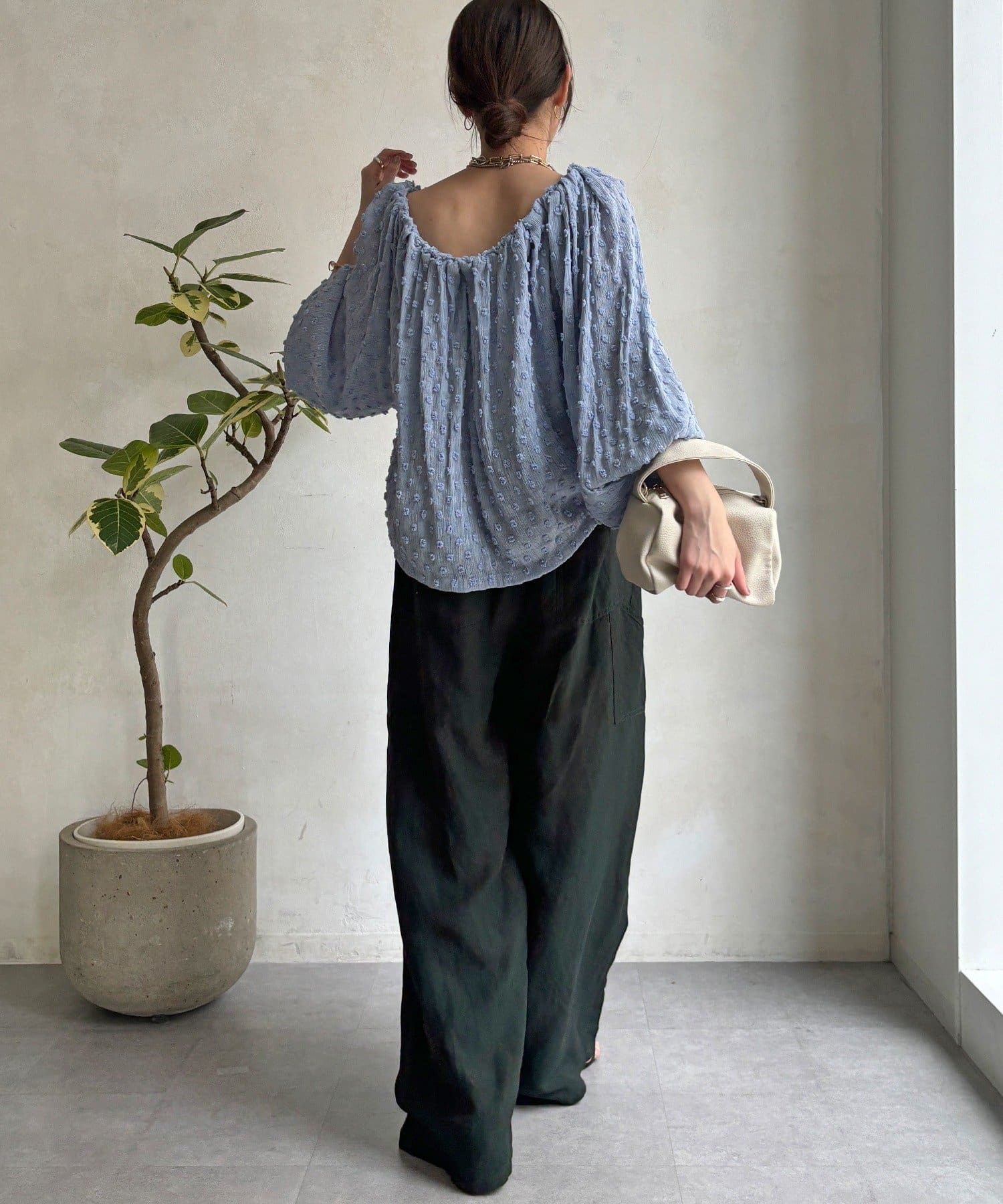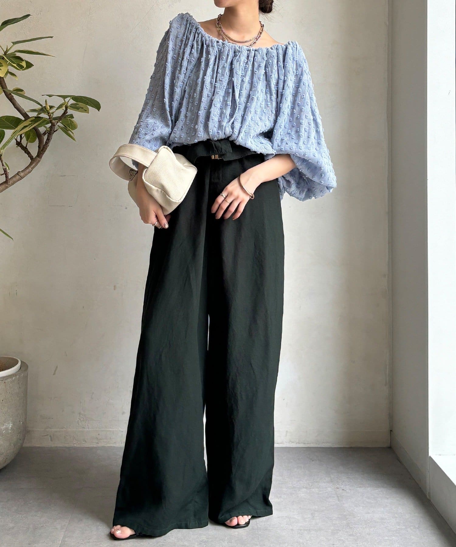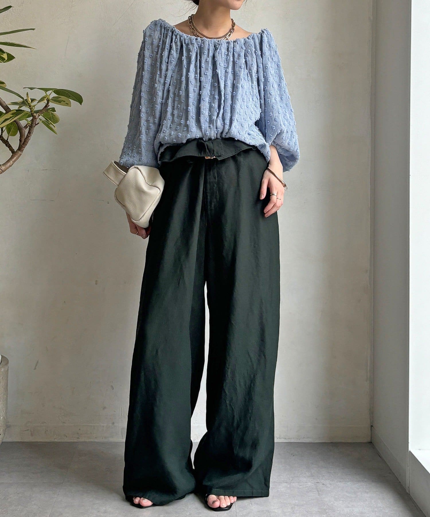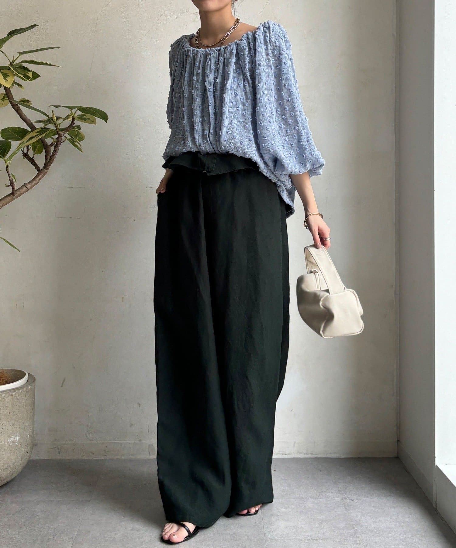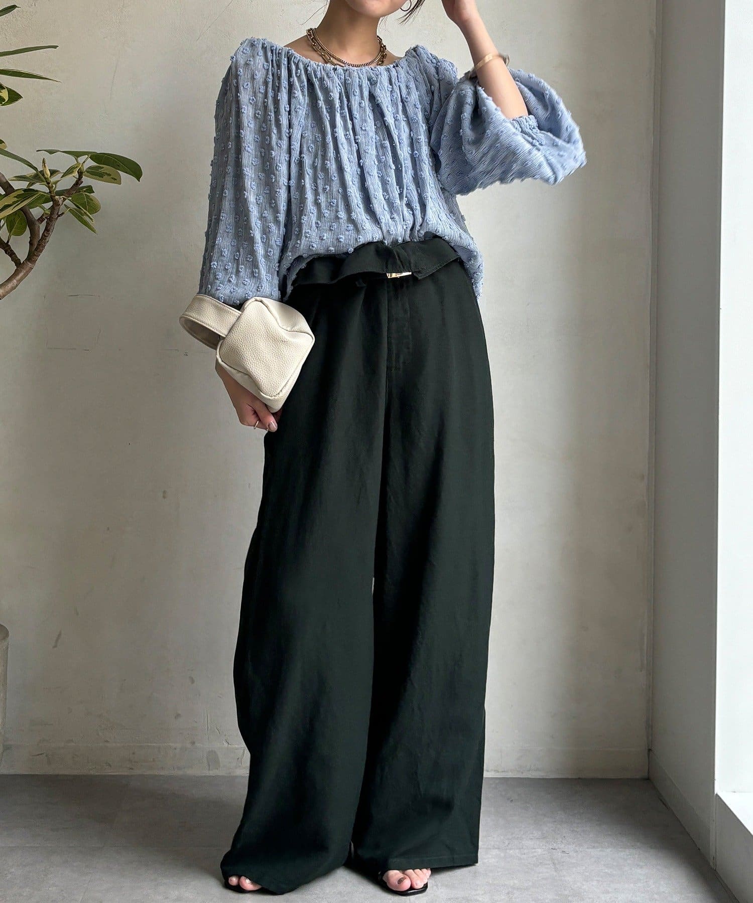 ・ウエストのギャザーがスタイルアップ効果に