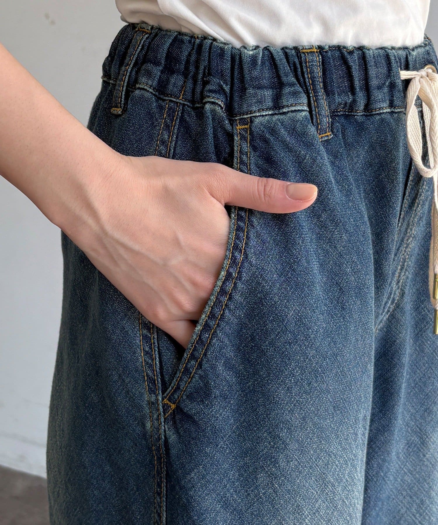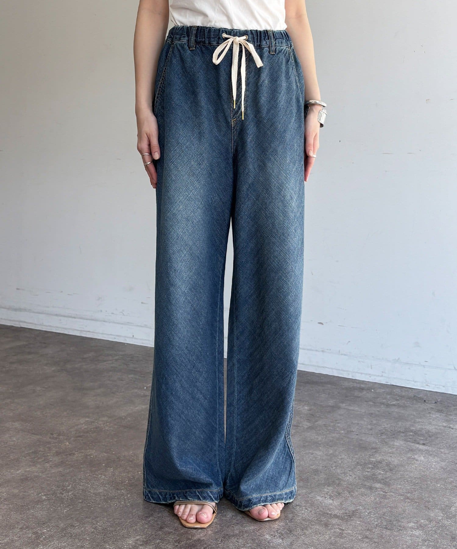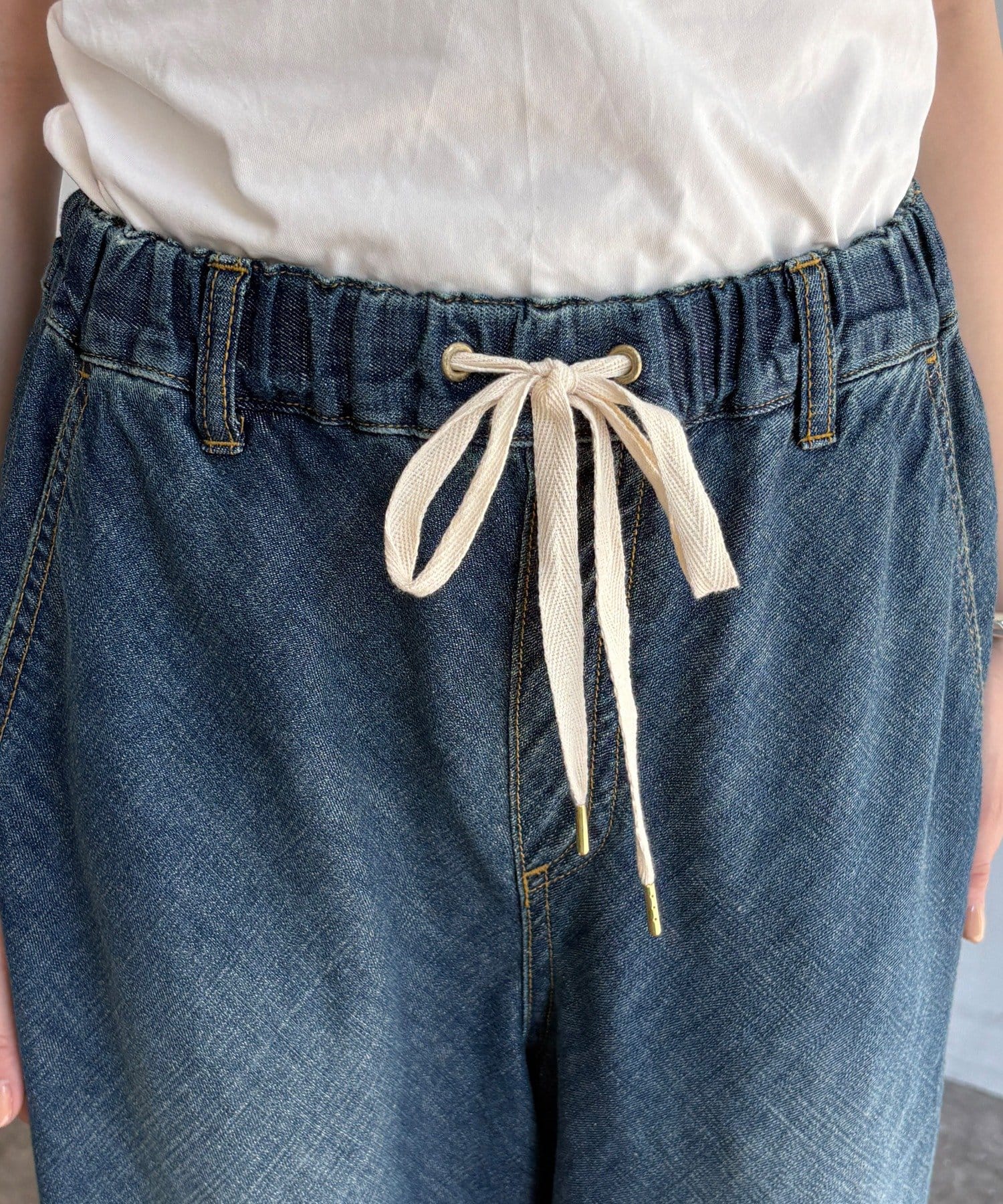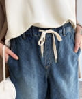 ウエストはオールゴム仕様でリラックスした穿き心地ながら、フロントの紐デザインがアクセントになり、ラフすぎないトレンドライクな着こなしを叶えます。
