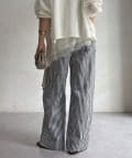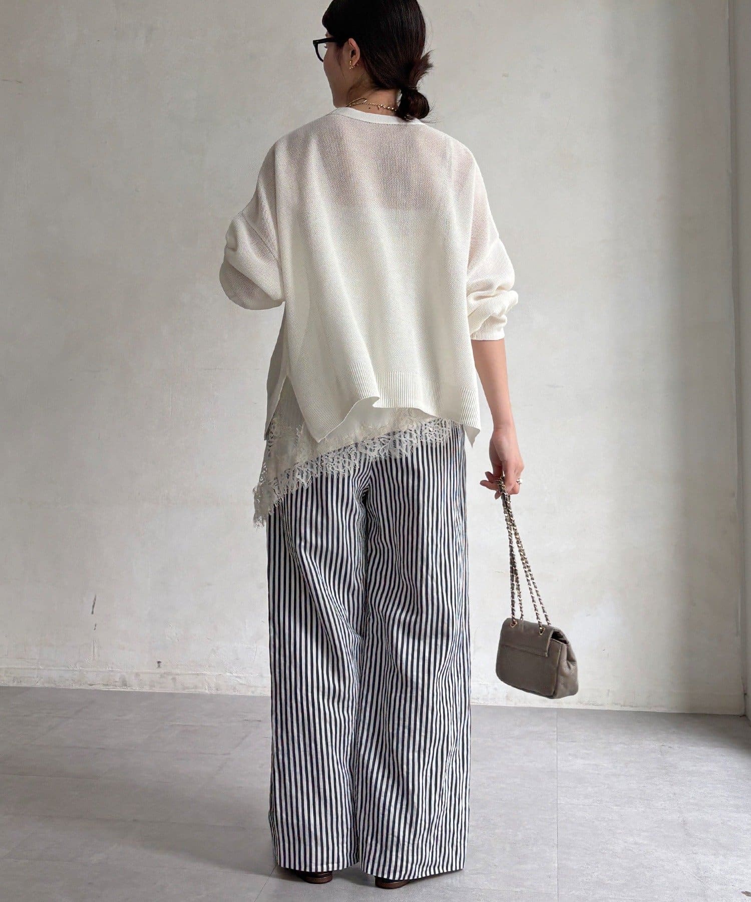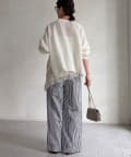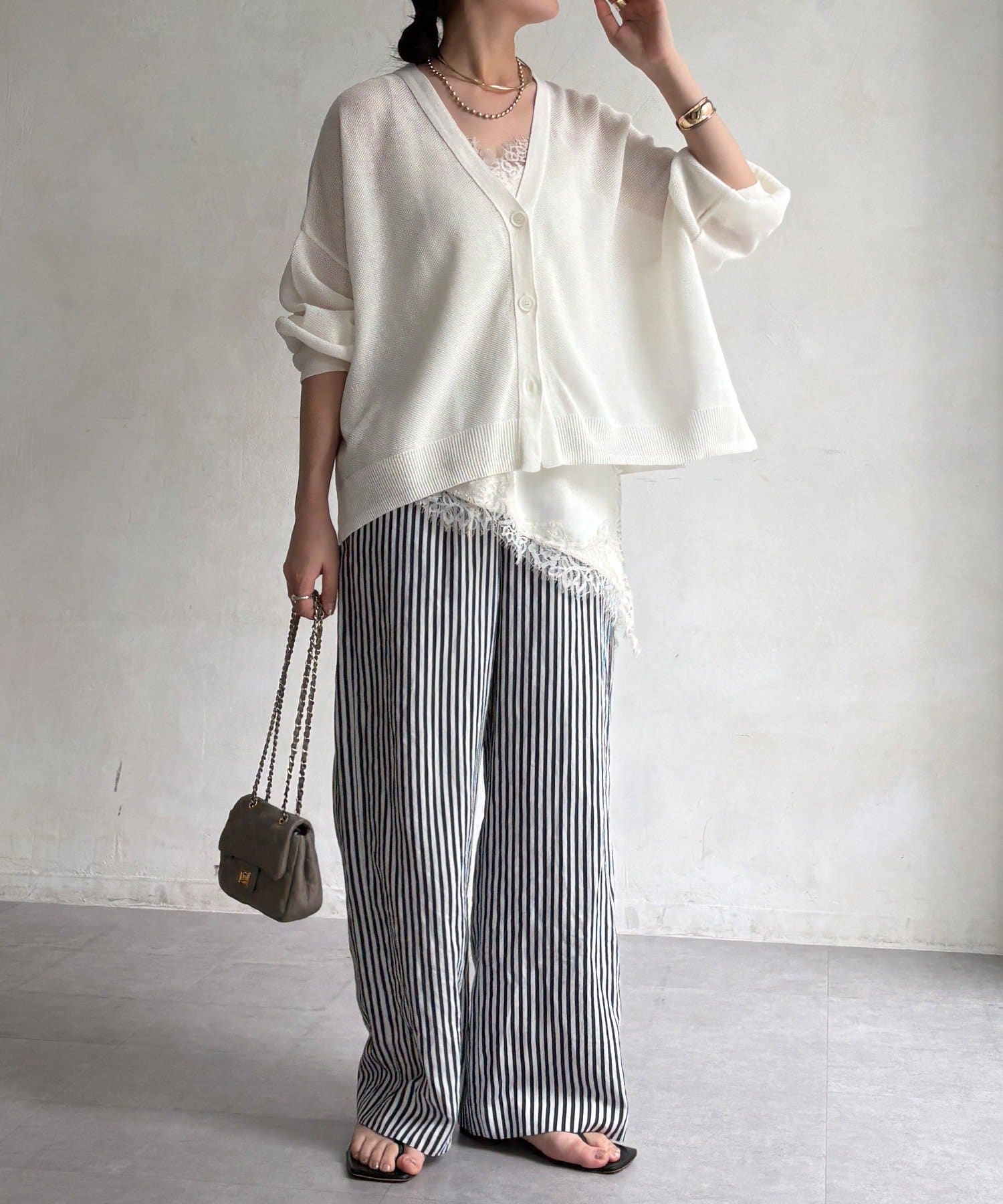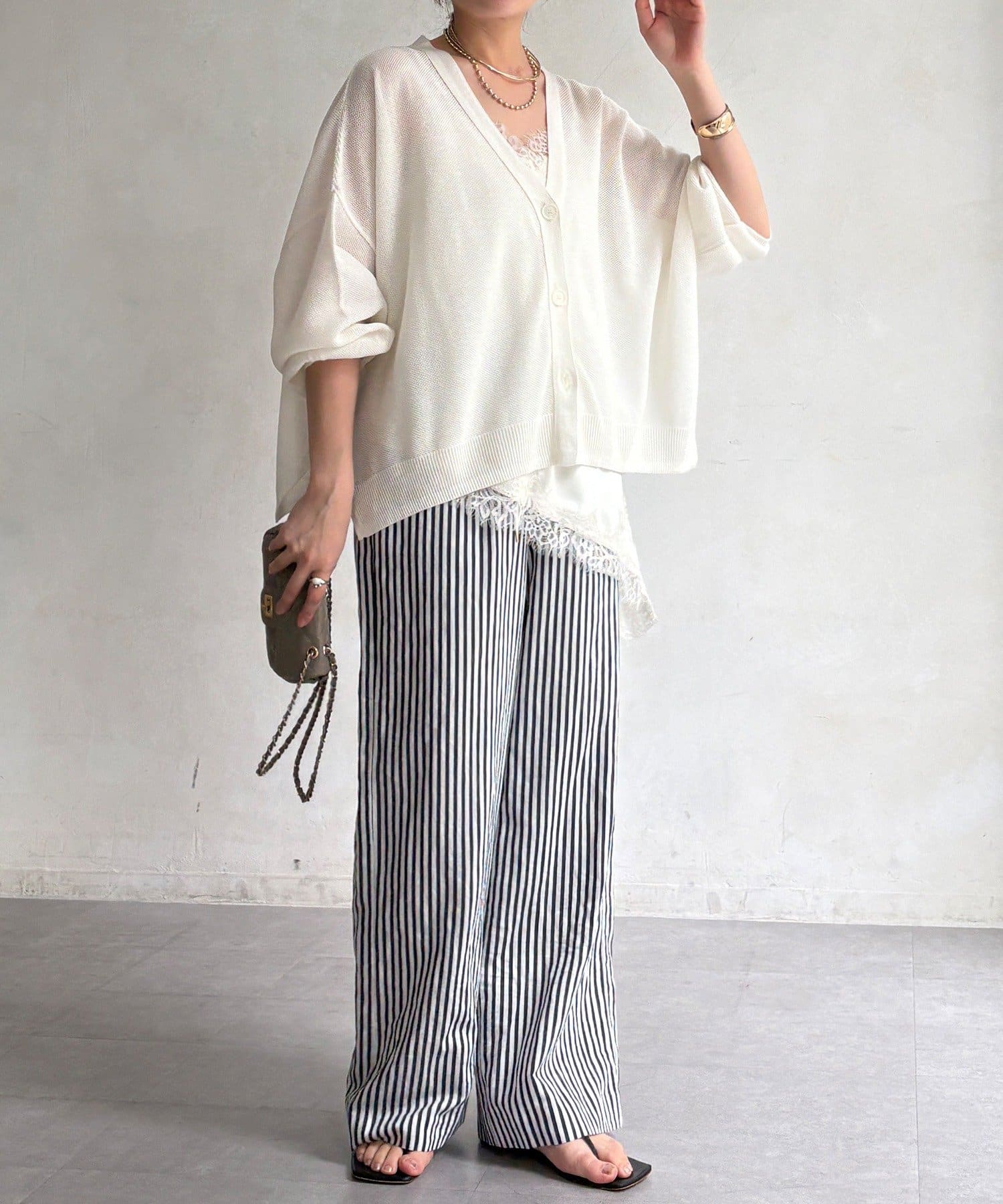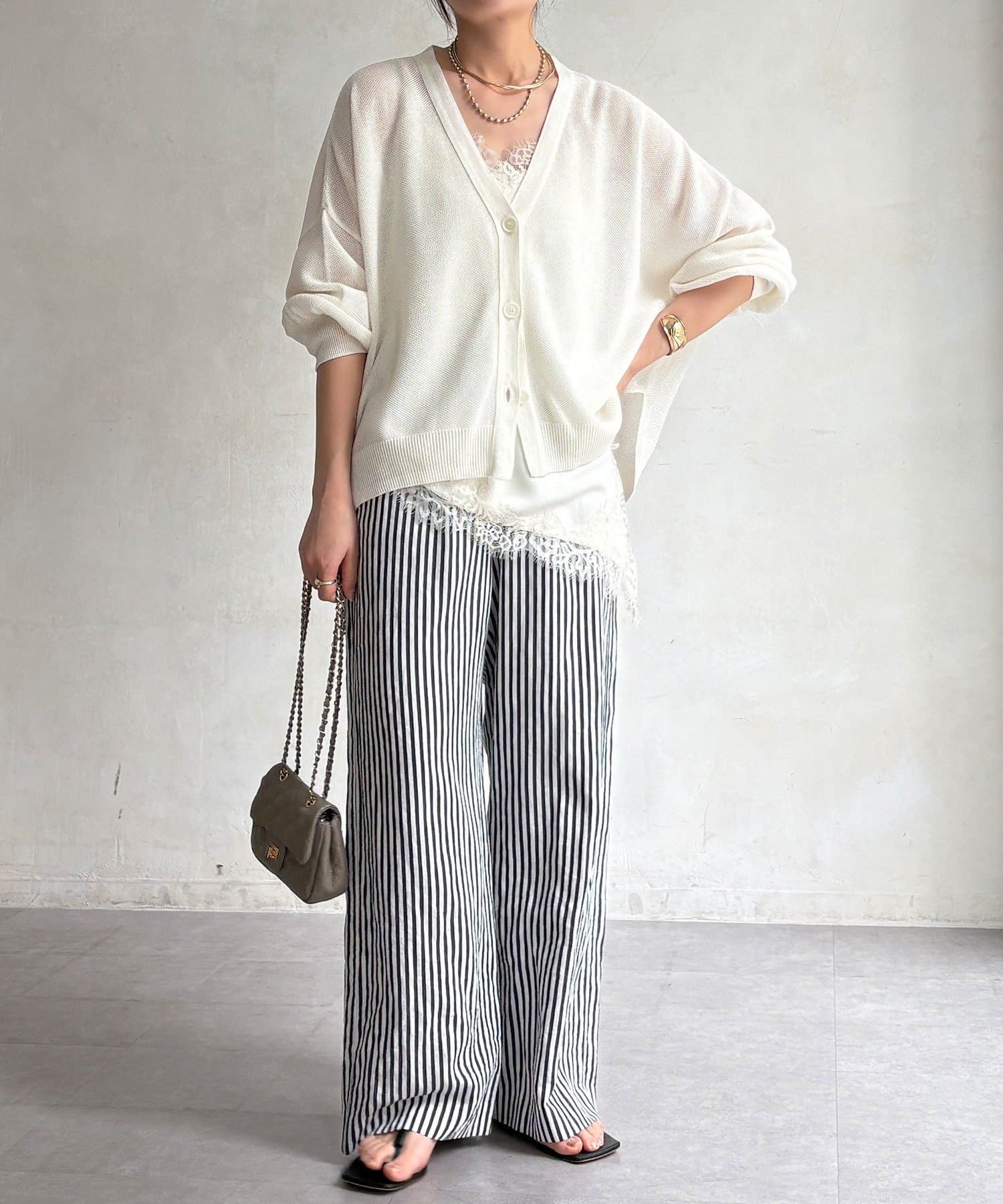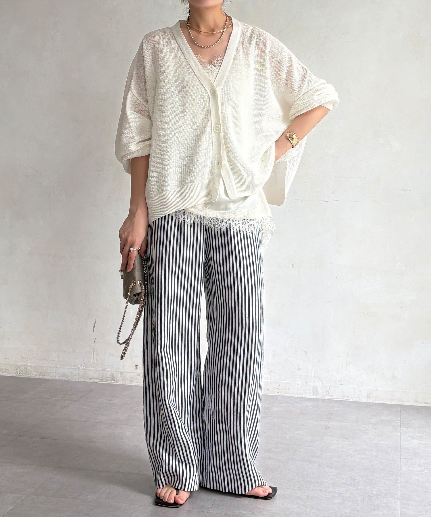 ストライプ柄が持つ知的な印象とワイドパンツの緩さが絶妙にミックスされ
