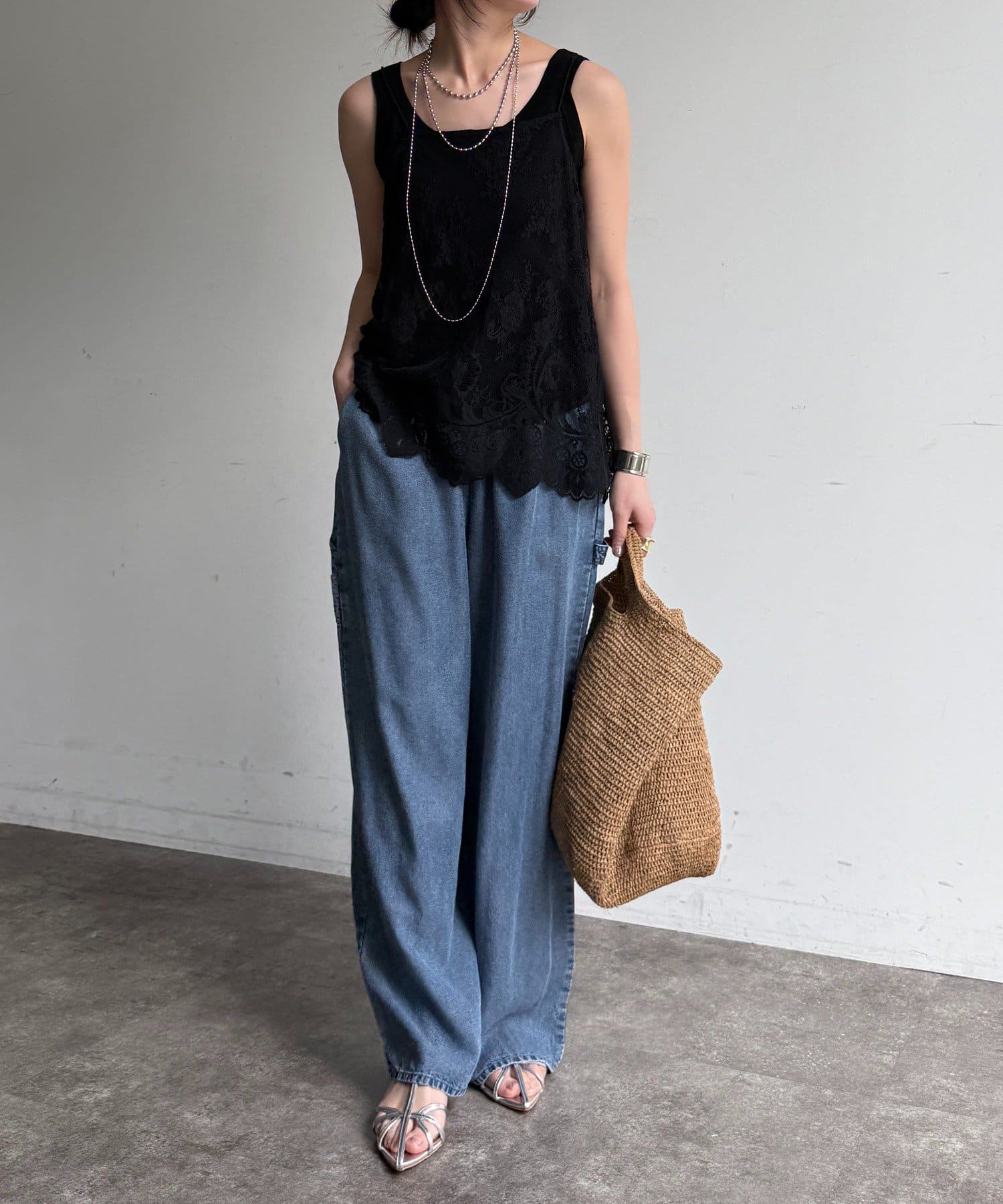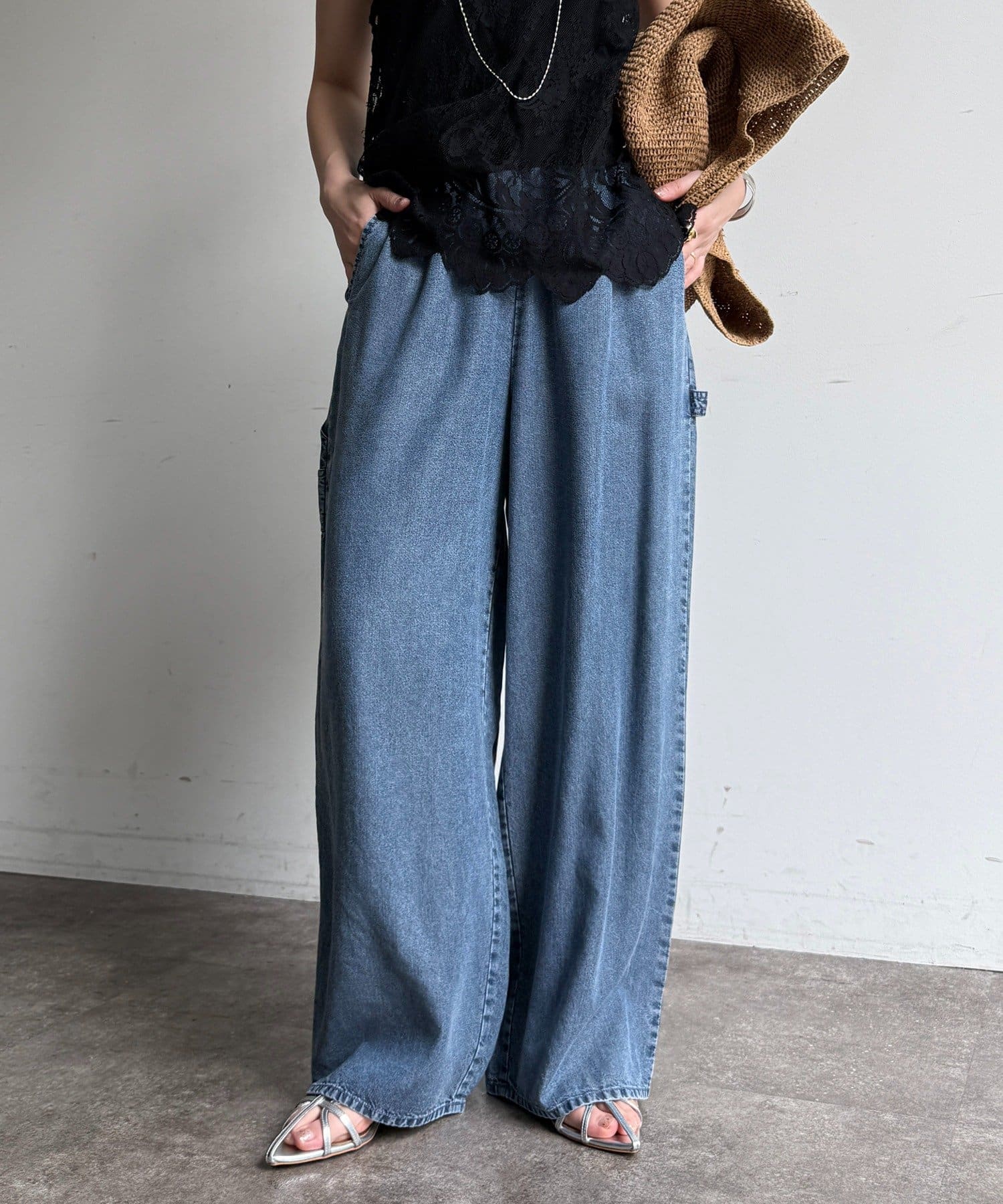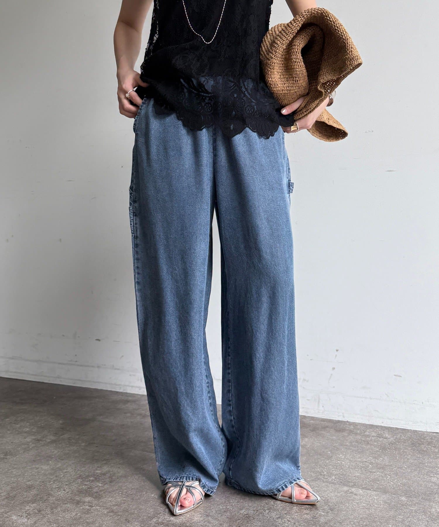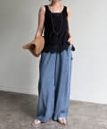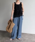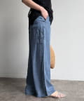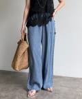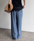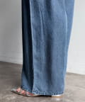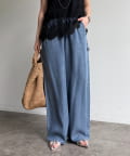 トレンドのワイドレッグを採用しつつ、腰回りはすっきりと、裾に向かってすとんと落ちるストレートのラインに仕上げています。