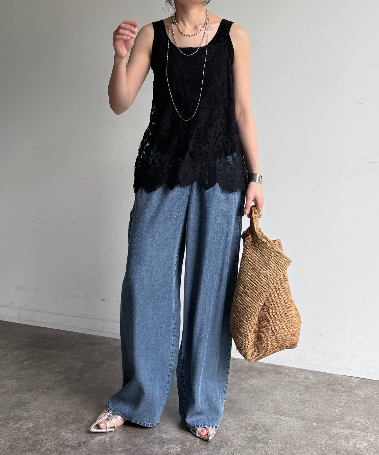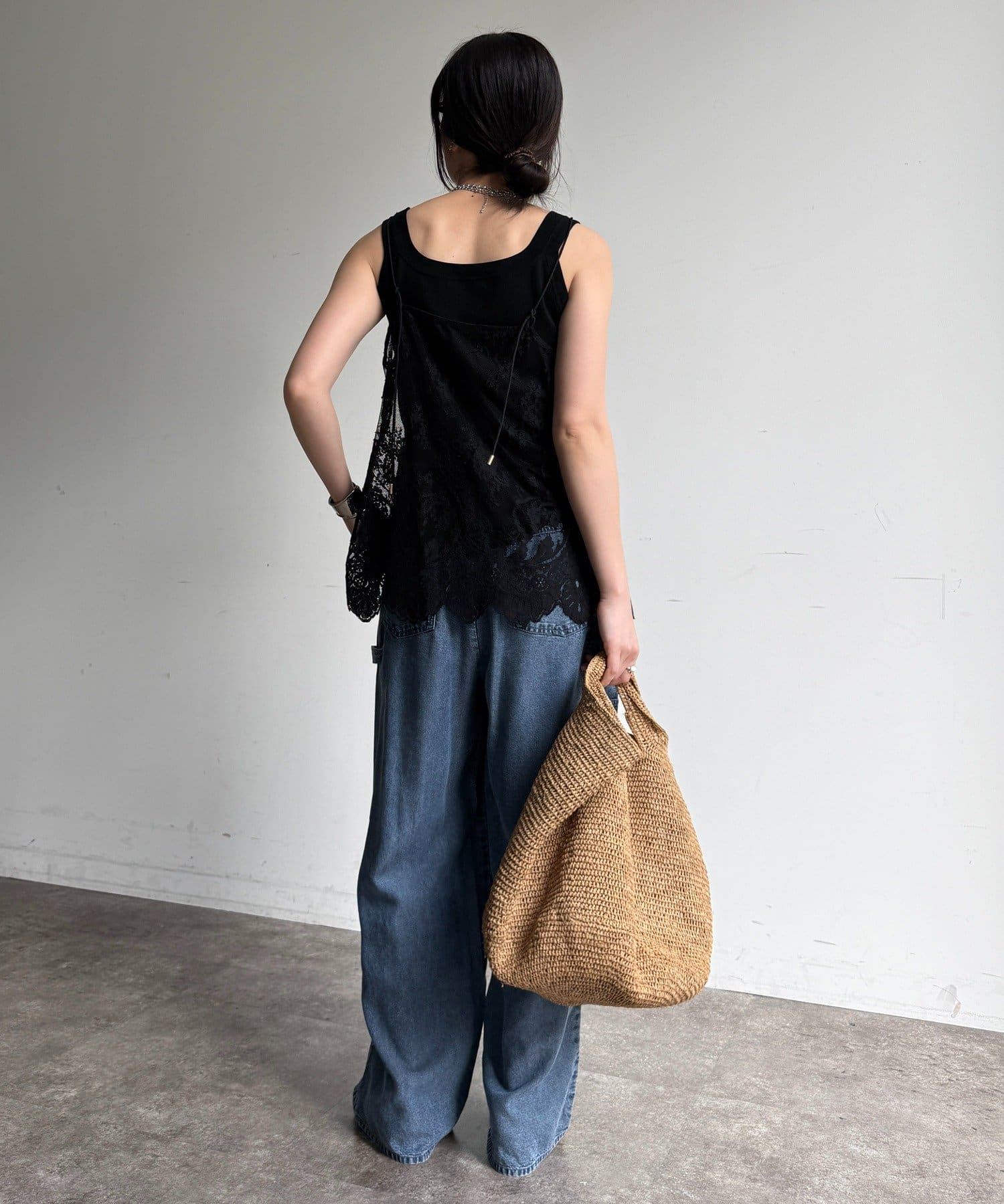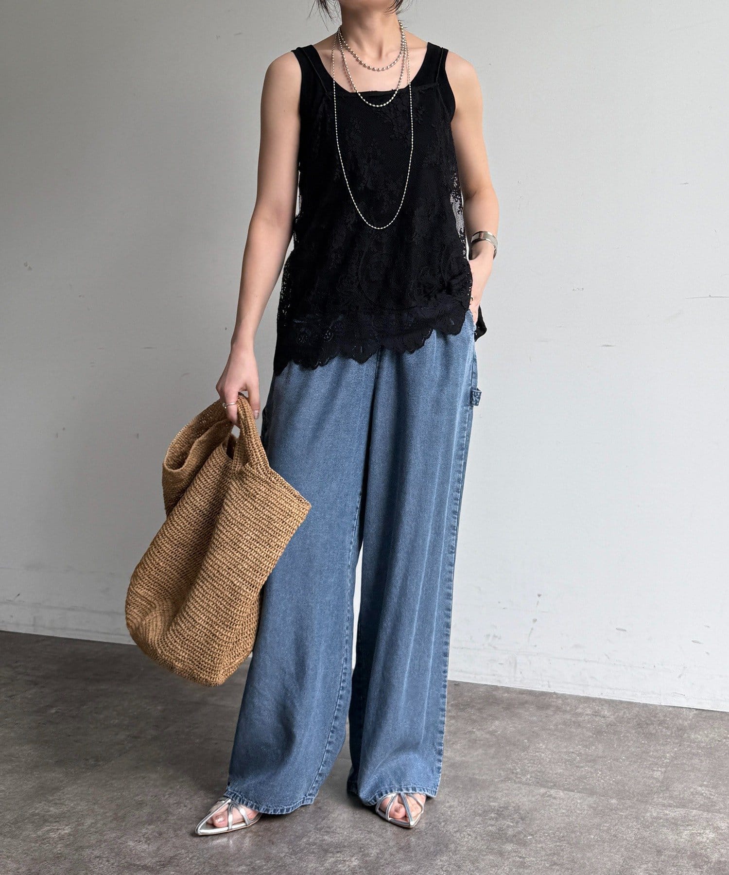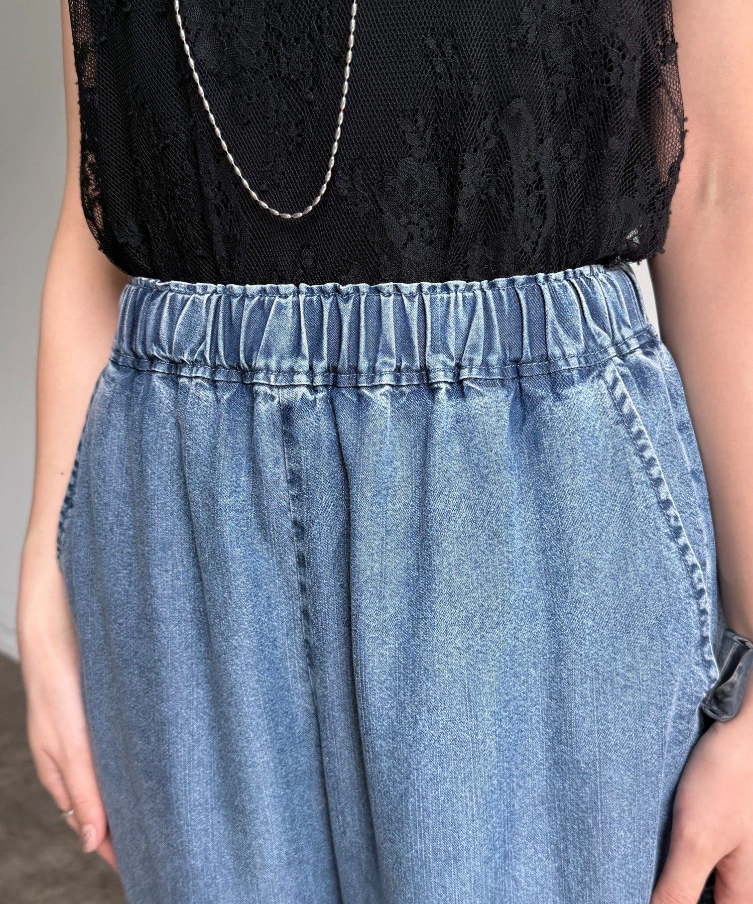 トレンドのワイドレッグを採用しつつ、腰回りはすっきりと、裾に向かってすとんと落ちるストレートのラインに仕上げています。