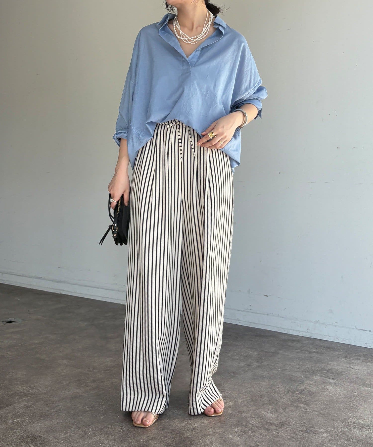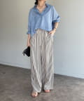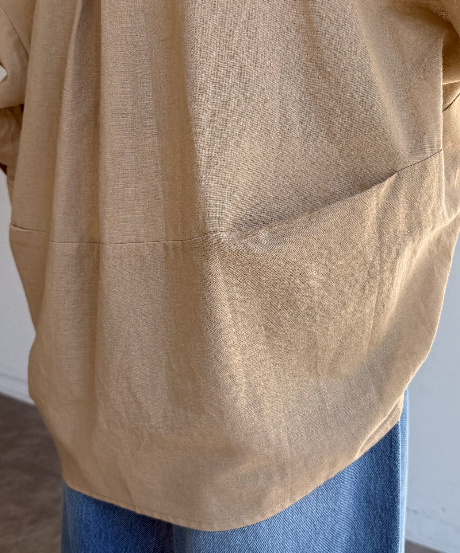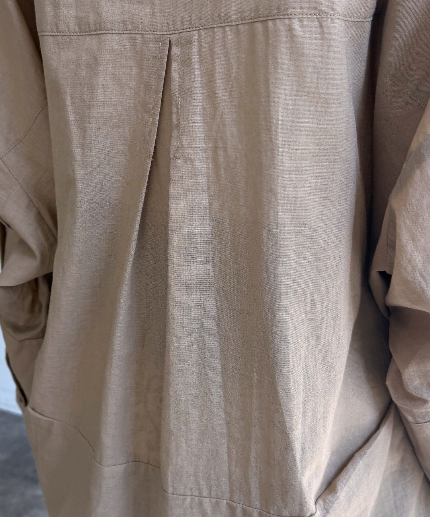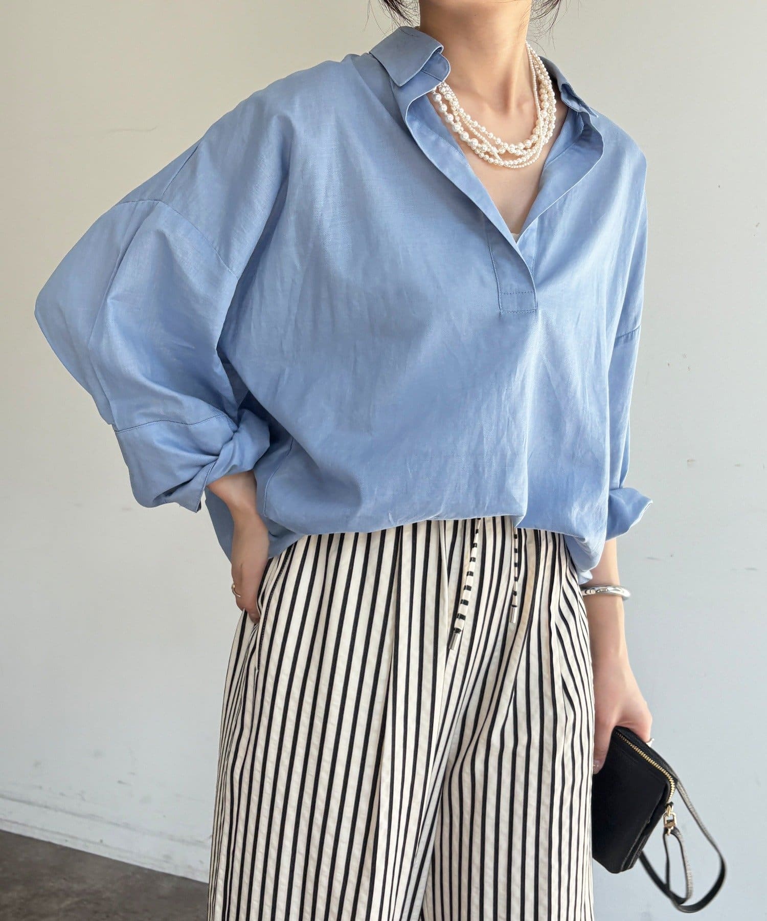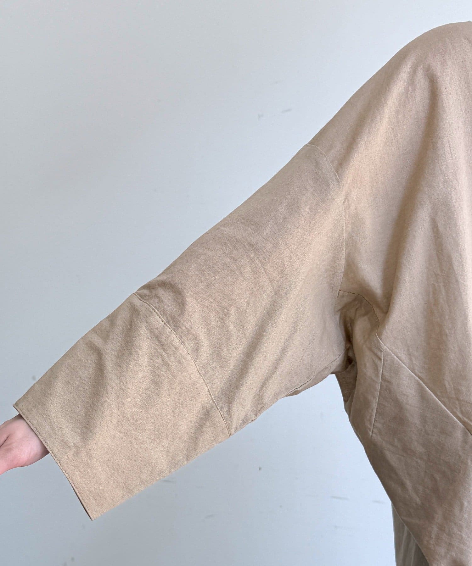 素材は、リネン混のナチュラルな風合いに、程よいシアー感をプラス。軽やかで清涼感があり、肌に張り付かず真夏でも快適に過ごせます。