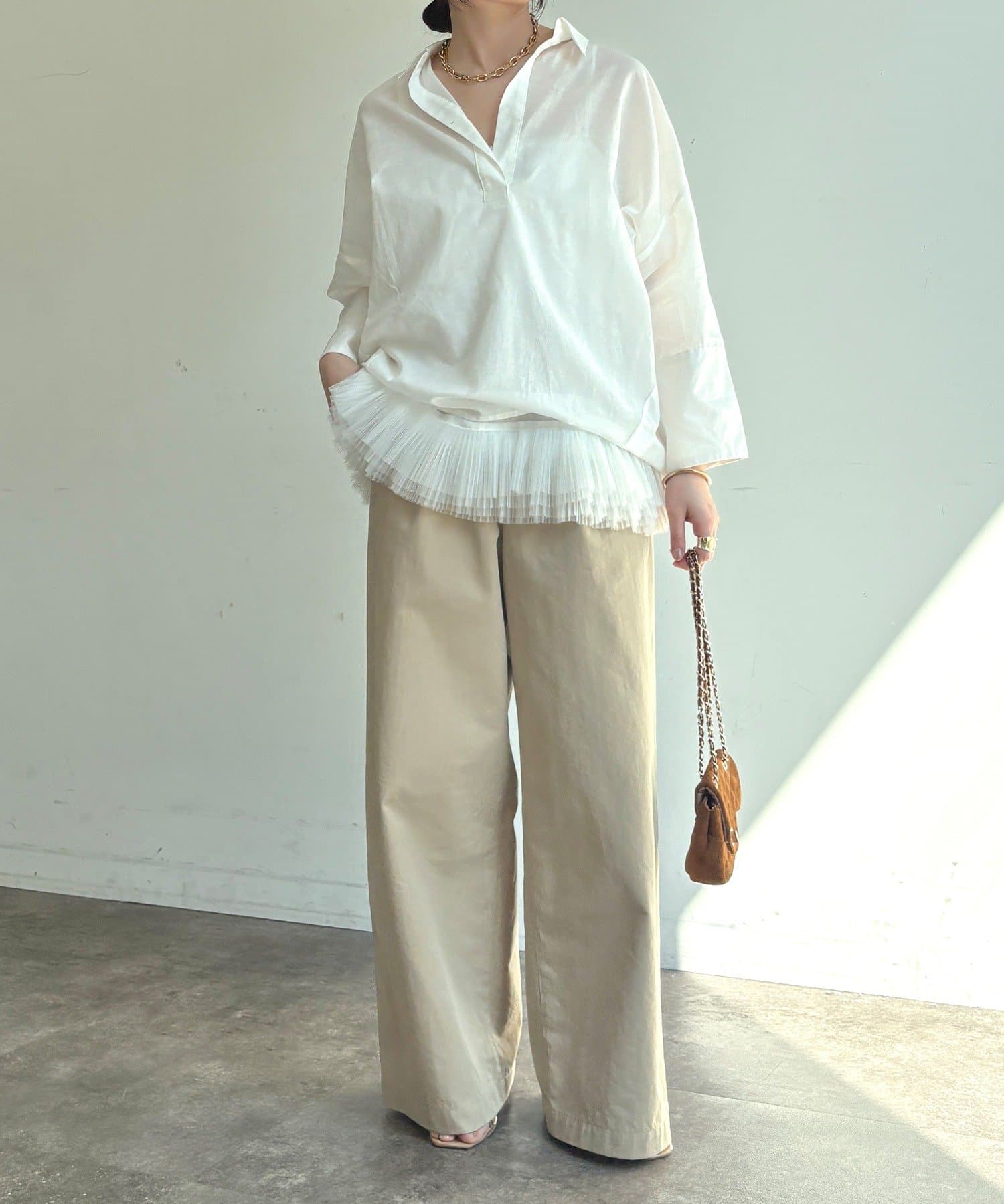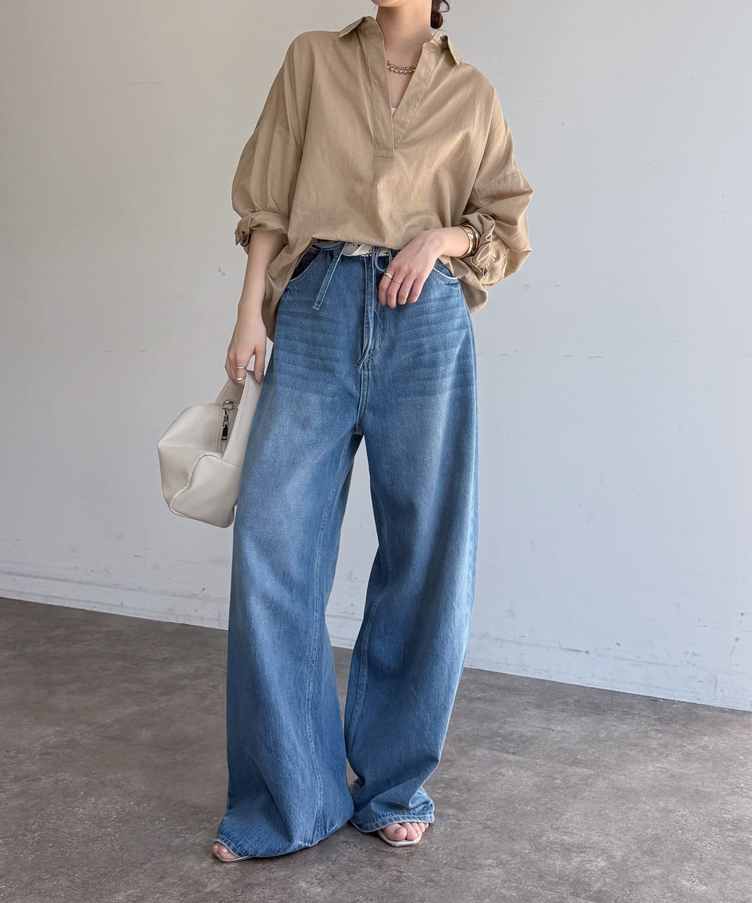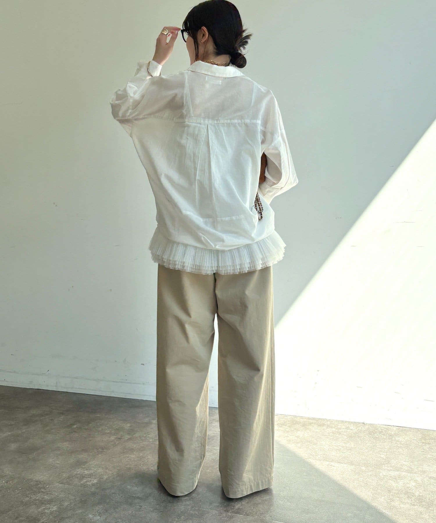 肩の力を抜いたオーバーシルエットで、大人の余裕を感じさせる一着です。