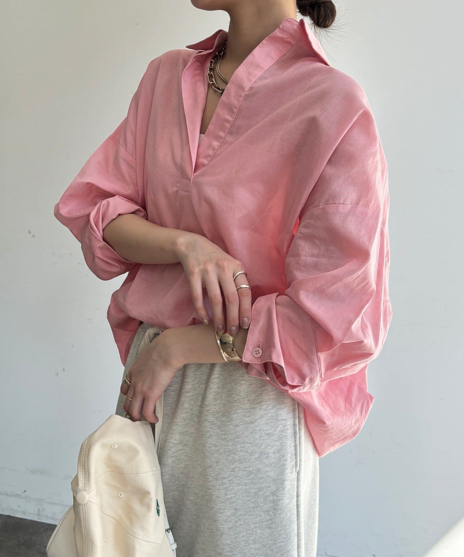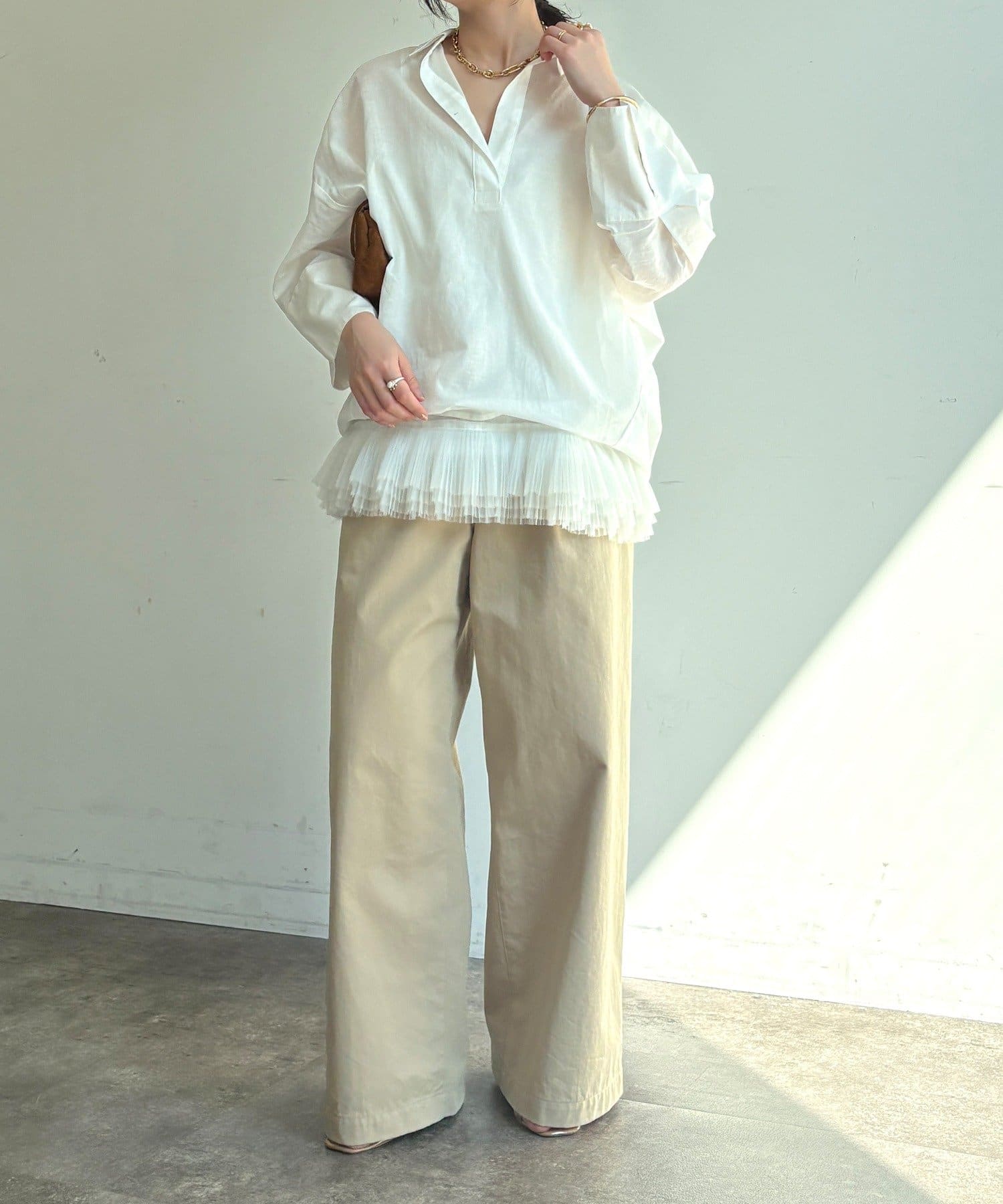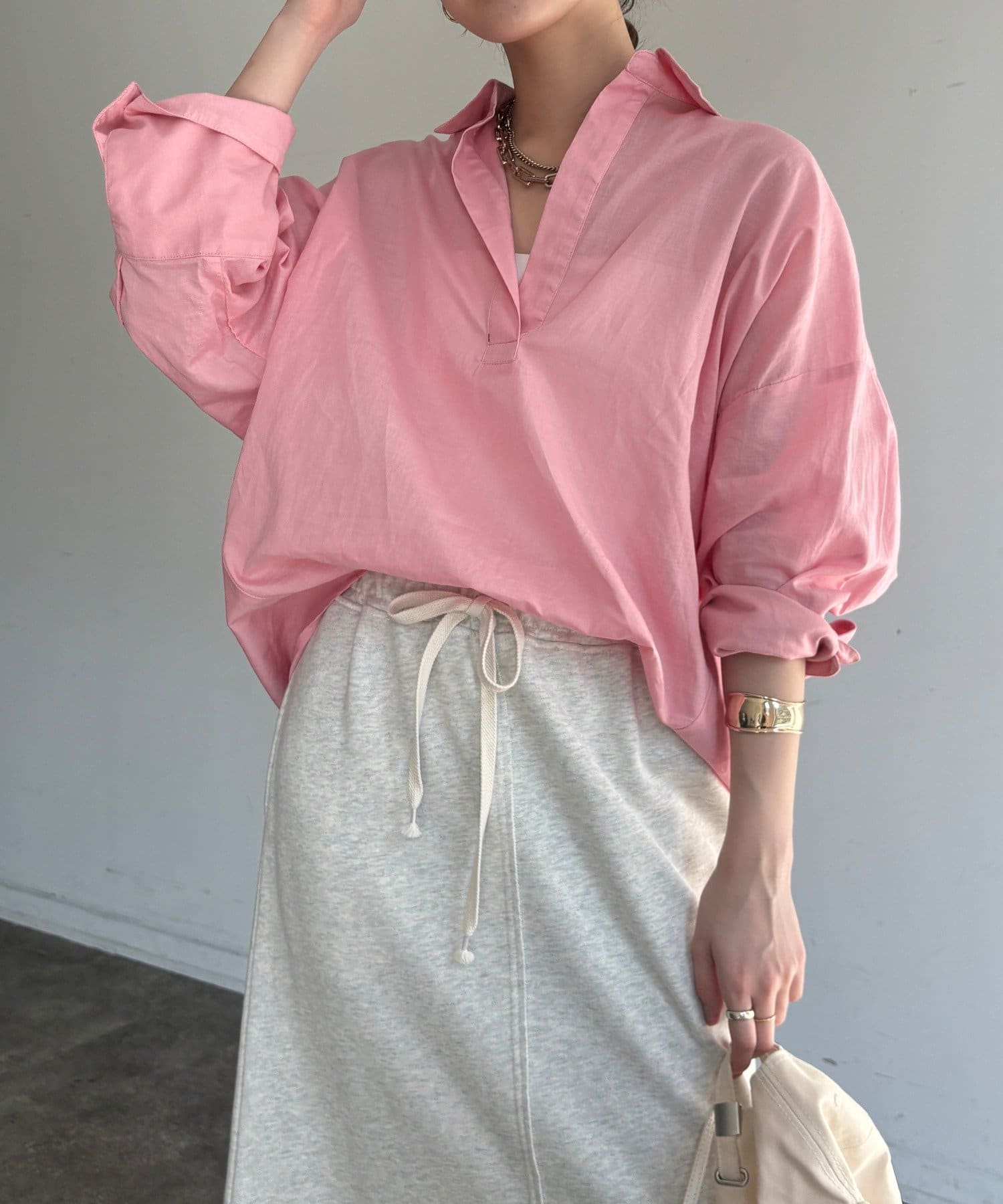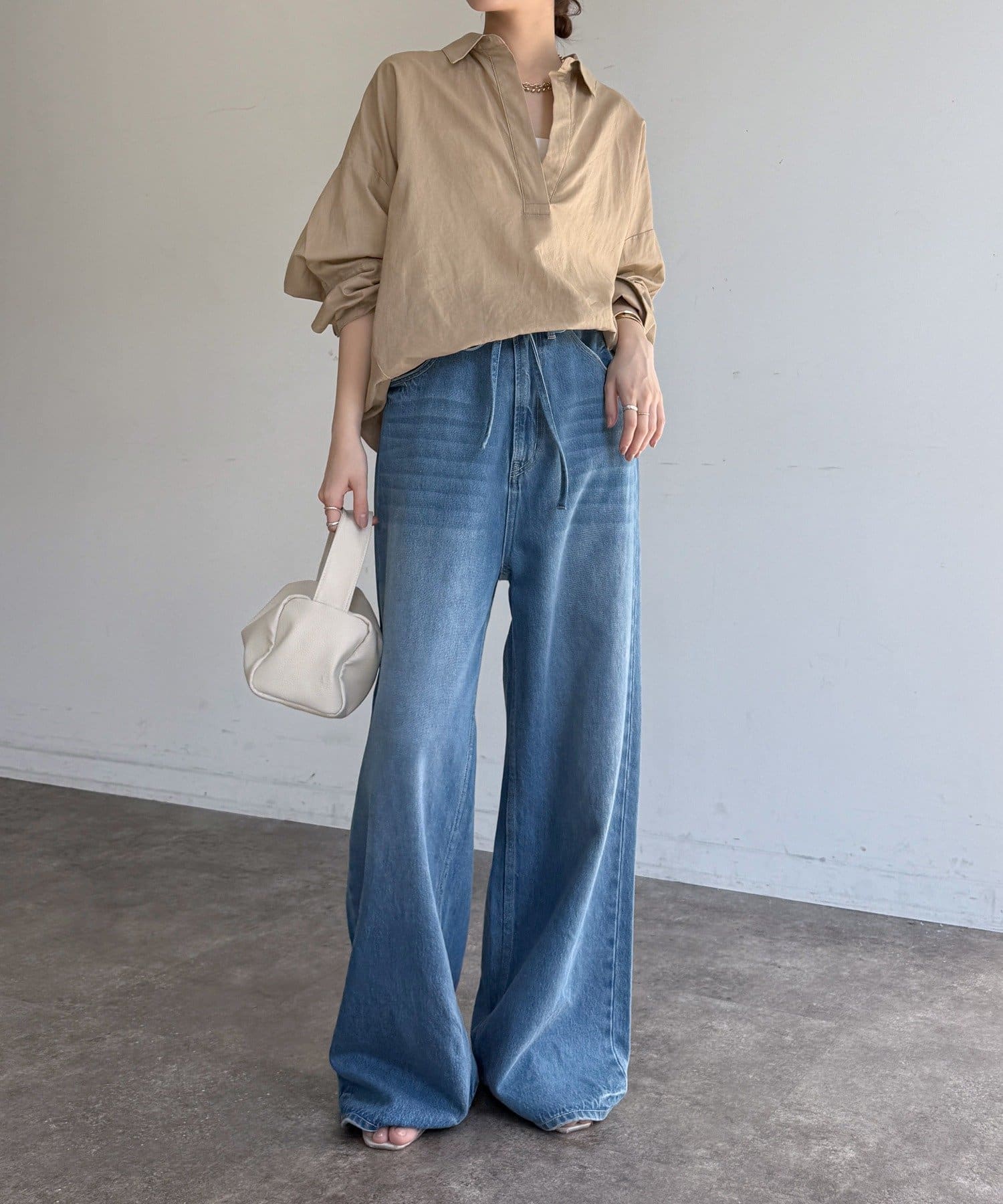 肩の力を抜いたオーバーシルエットで、大人の余裕を感じさせる一着です。