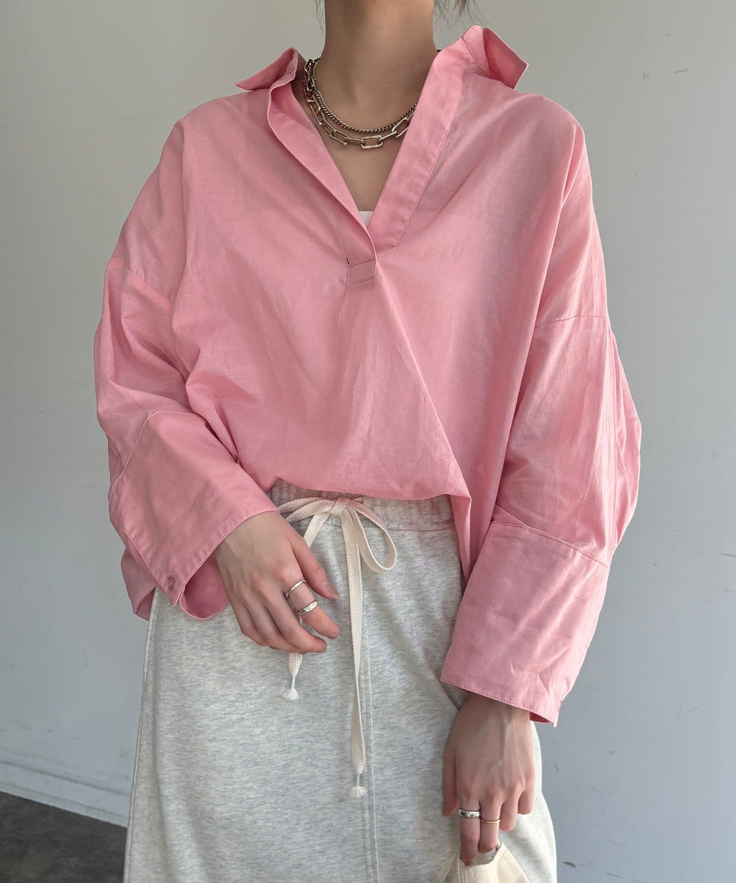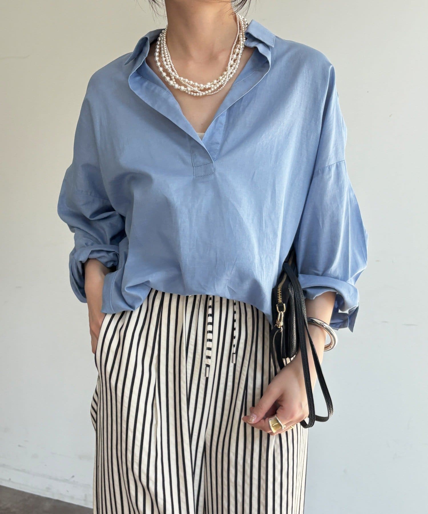 スキッパーデザインがシャープなV字ライン作り、鎖骨を美しく見せてくれるデザイン。