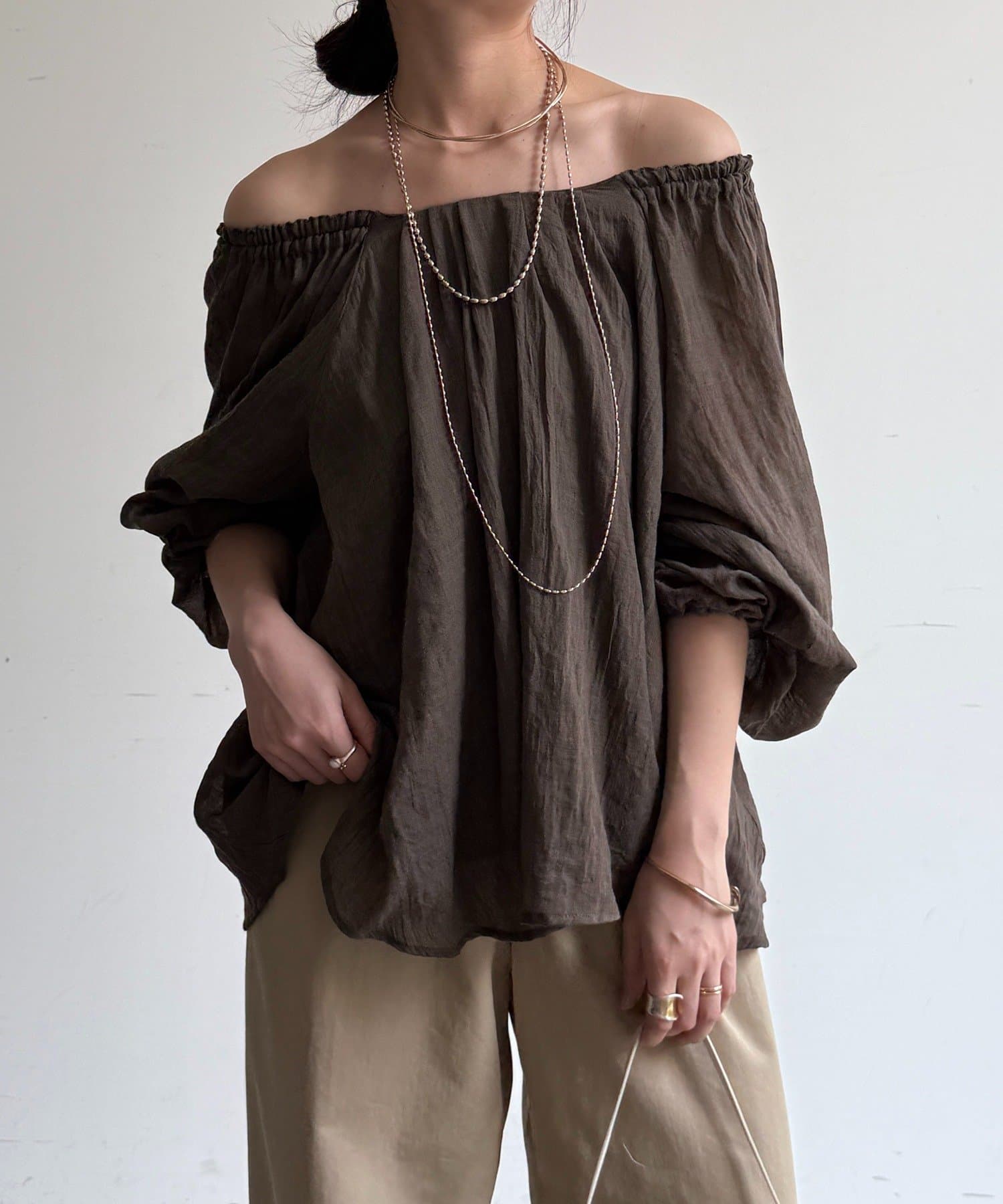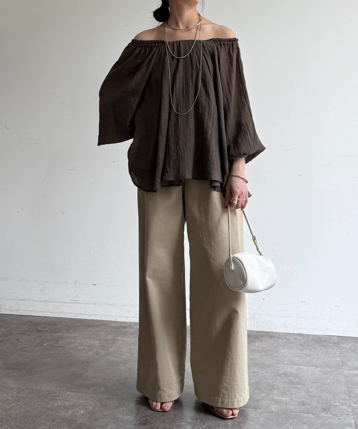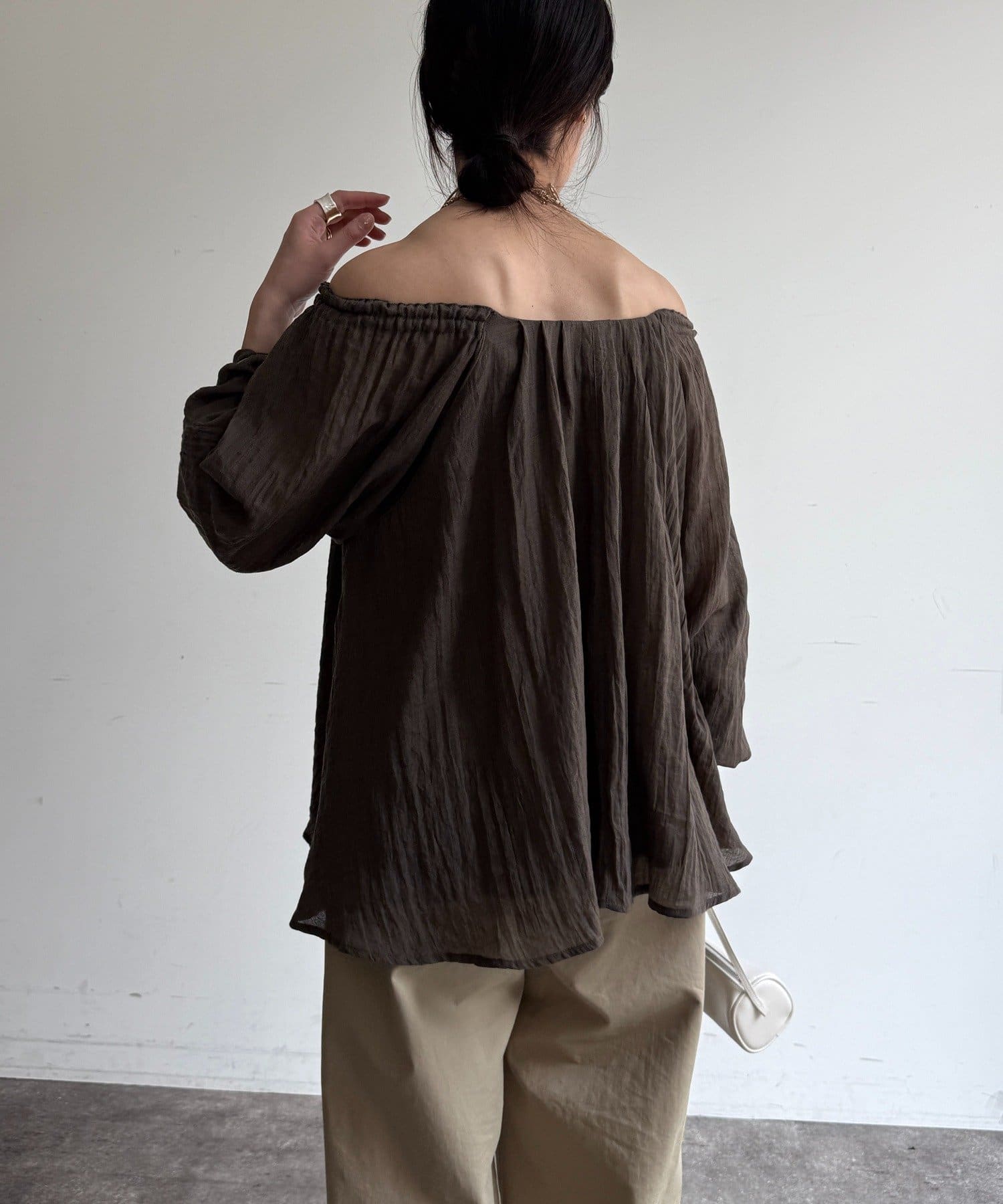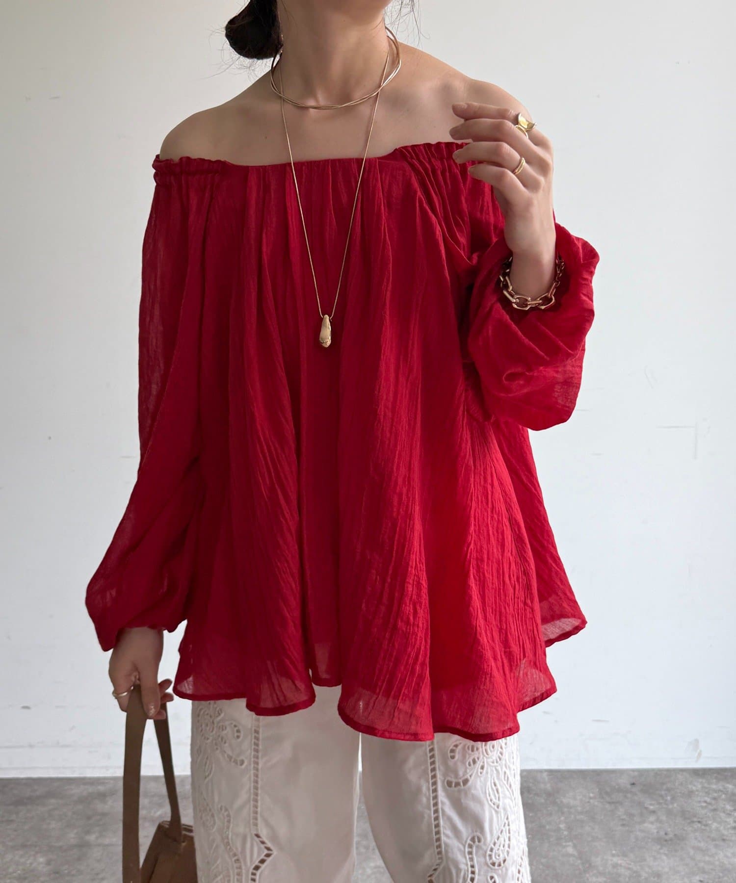 ふんわりとした軽やかな素材感と、女性らしいシルエットが魅力のオフショルダーブラウス。