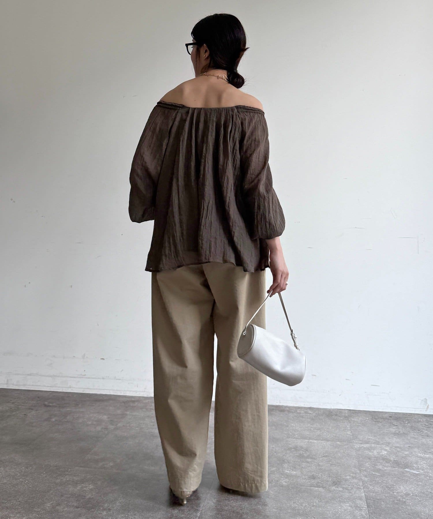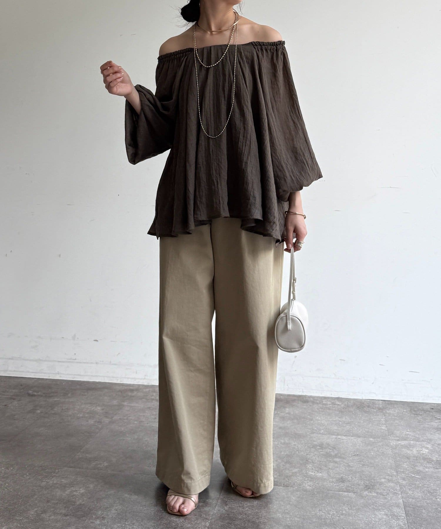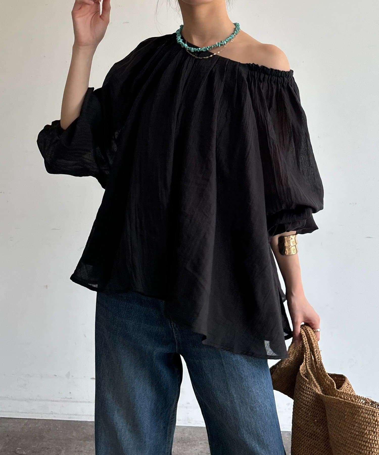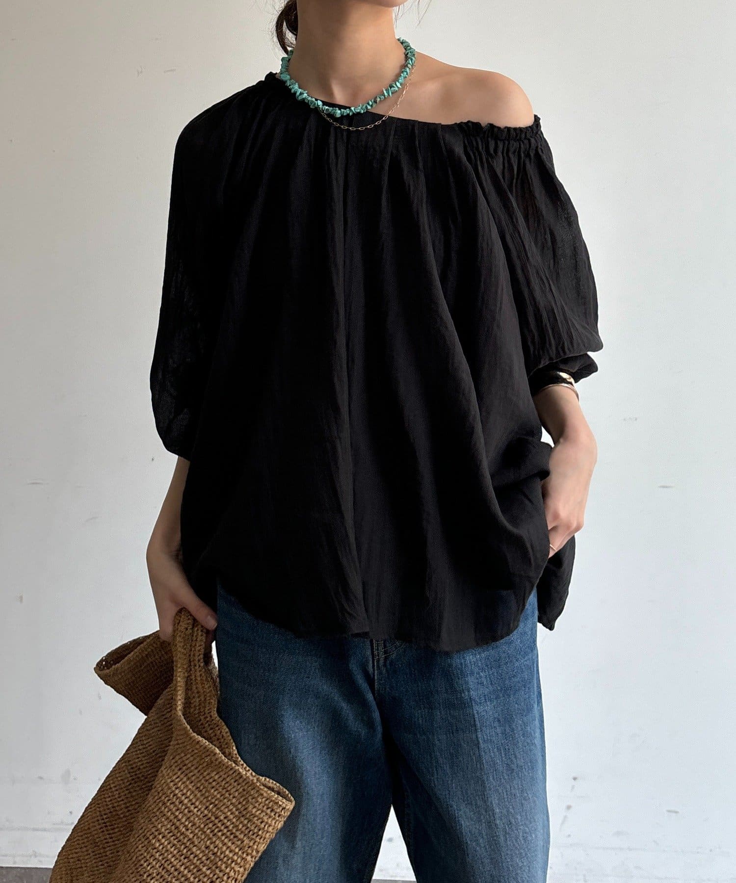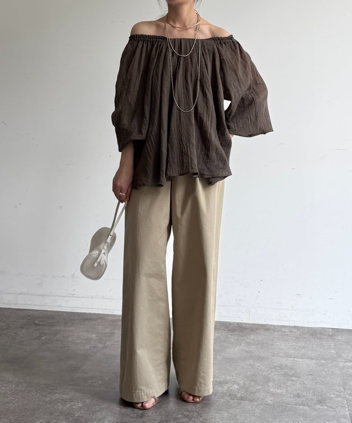ふんわりとした軽やかな素材感と、女性らしいシルエットが魅力のオフショルダーブラウス。
