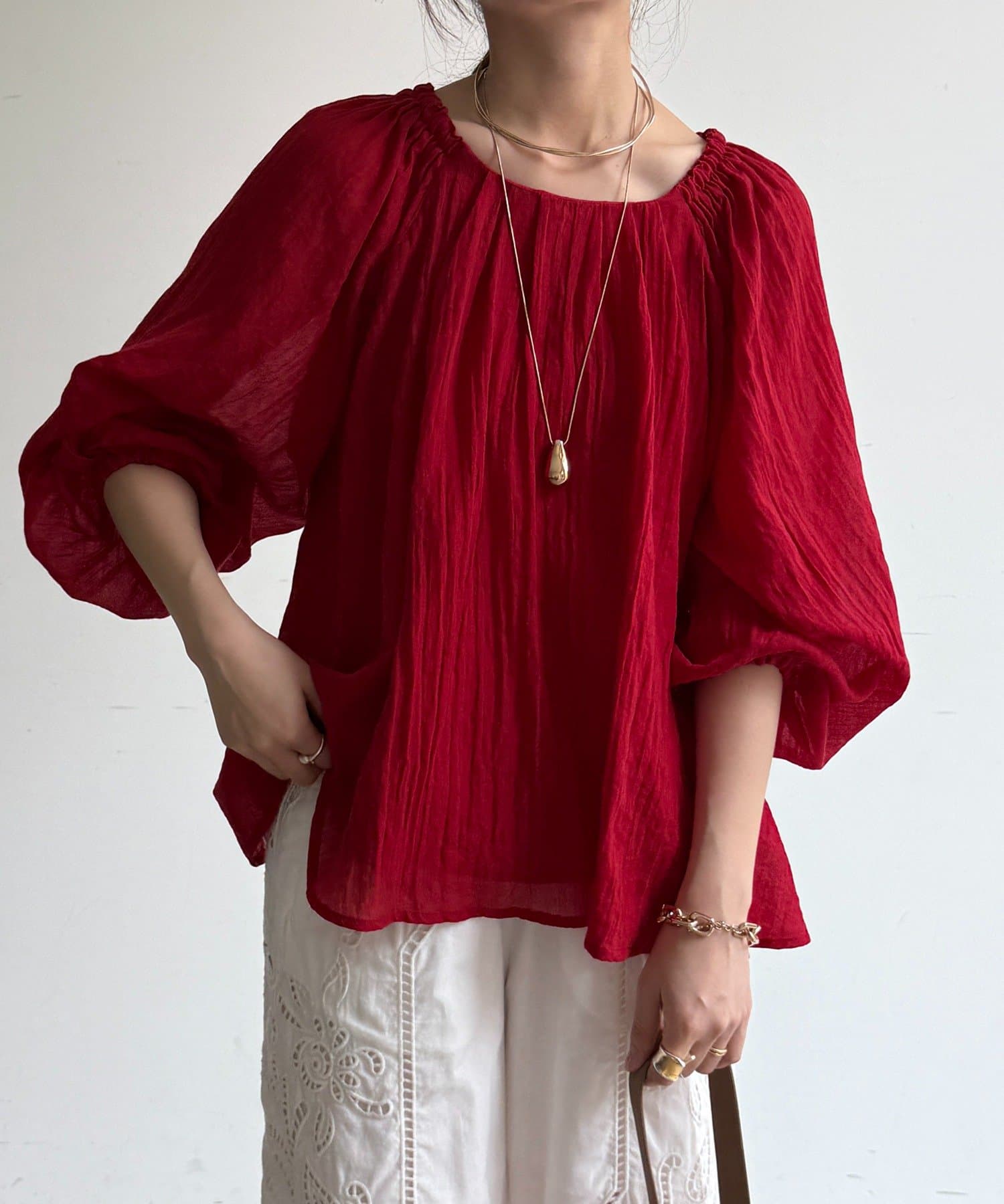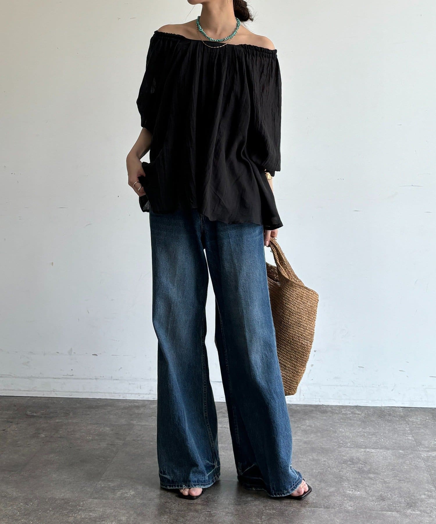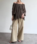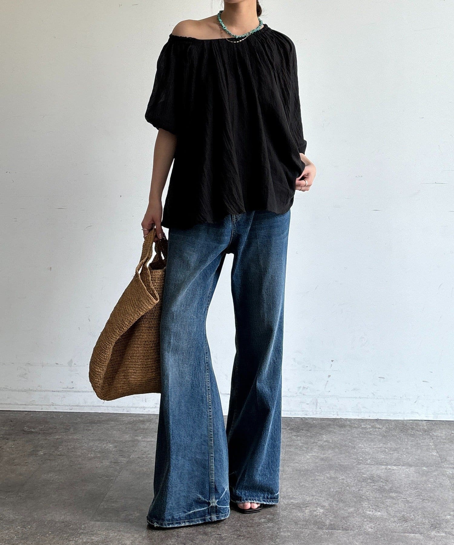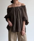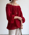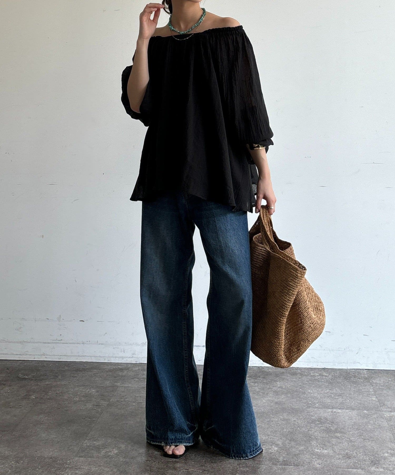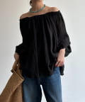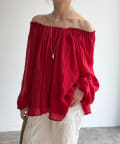 ふんわりとした軽やかな素材感と、女性らしいシルエットが魅力のオフショルダーブラウス。