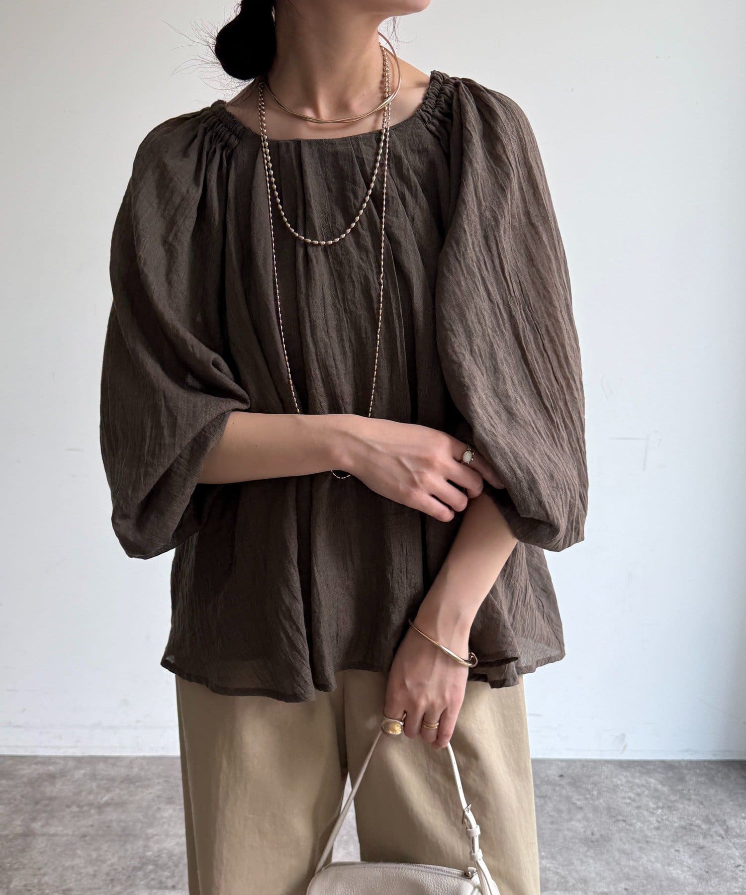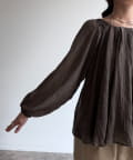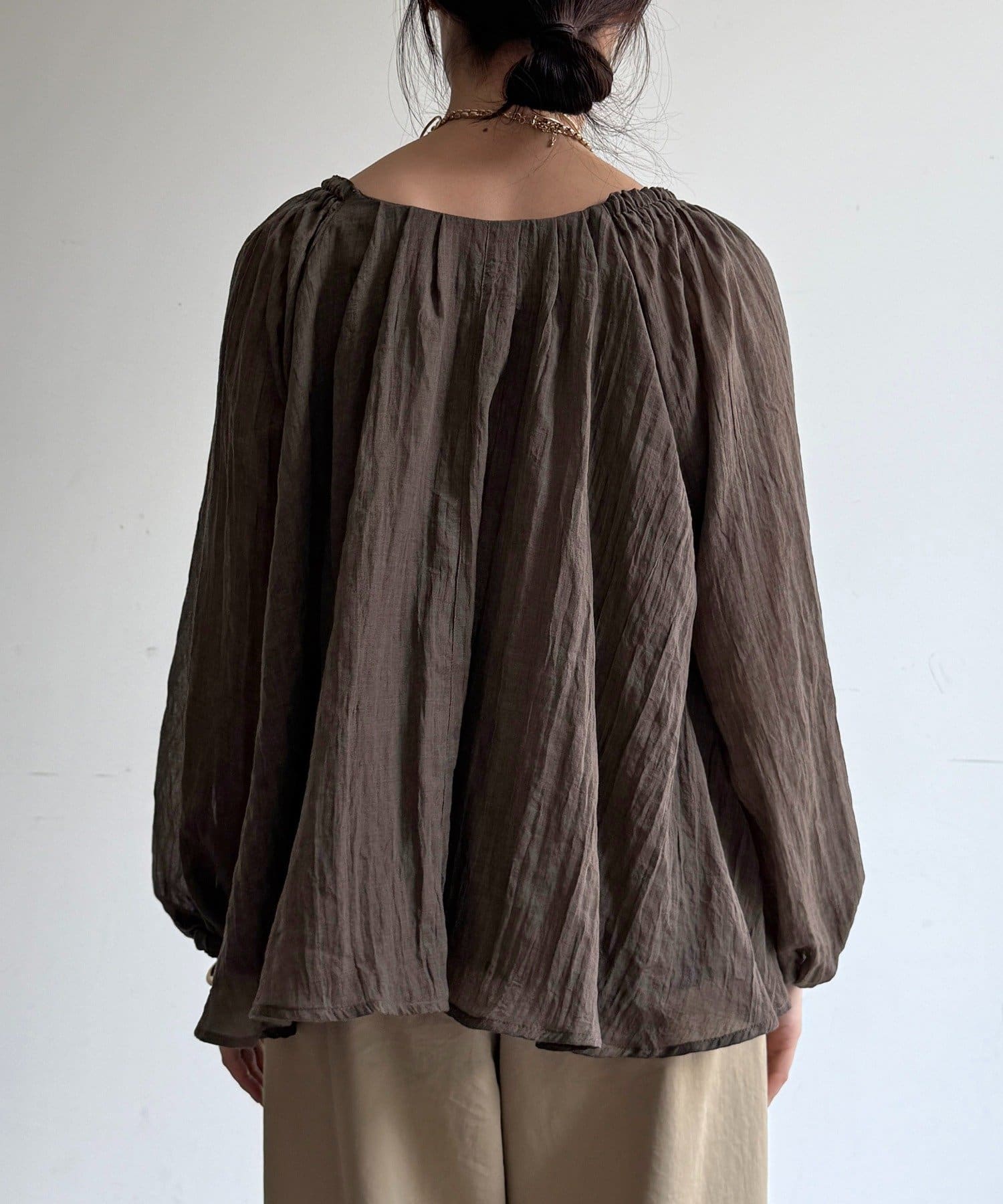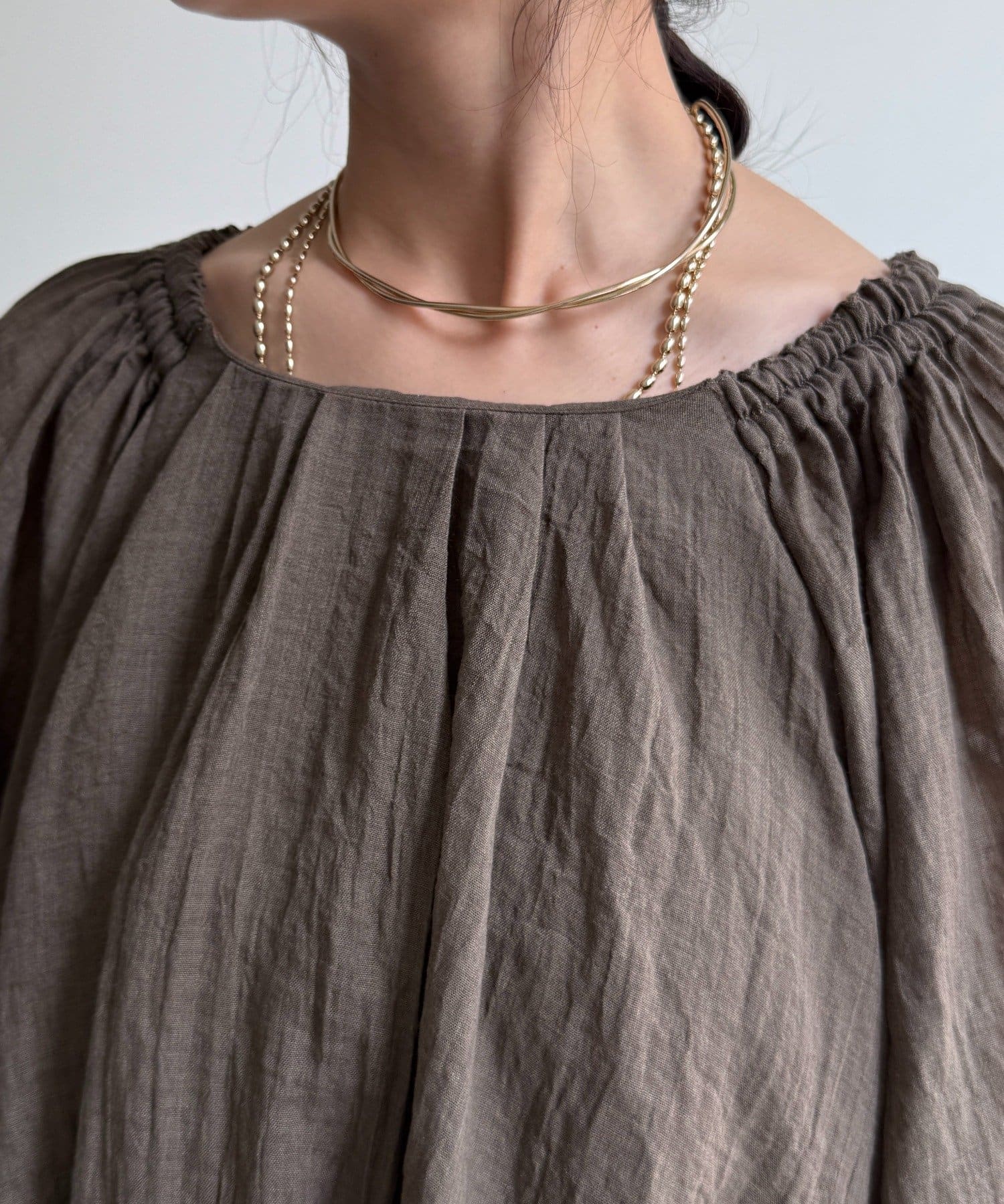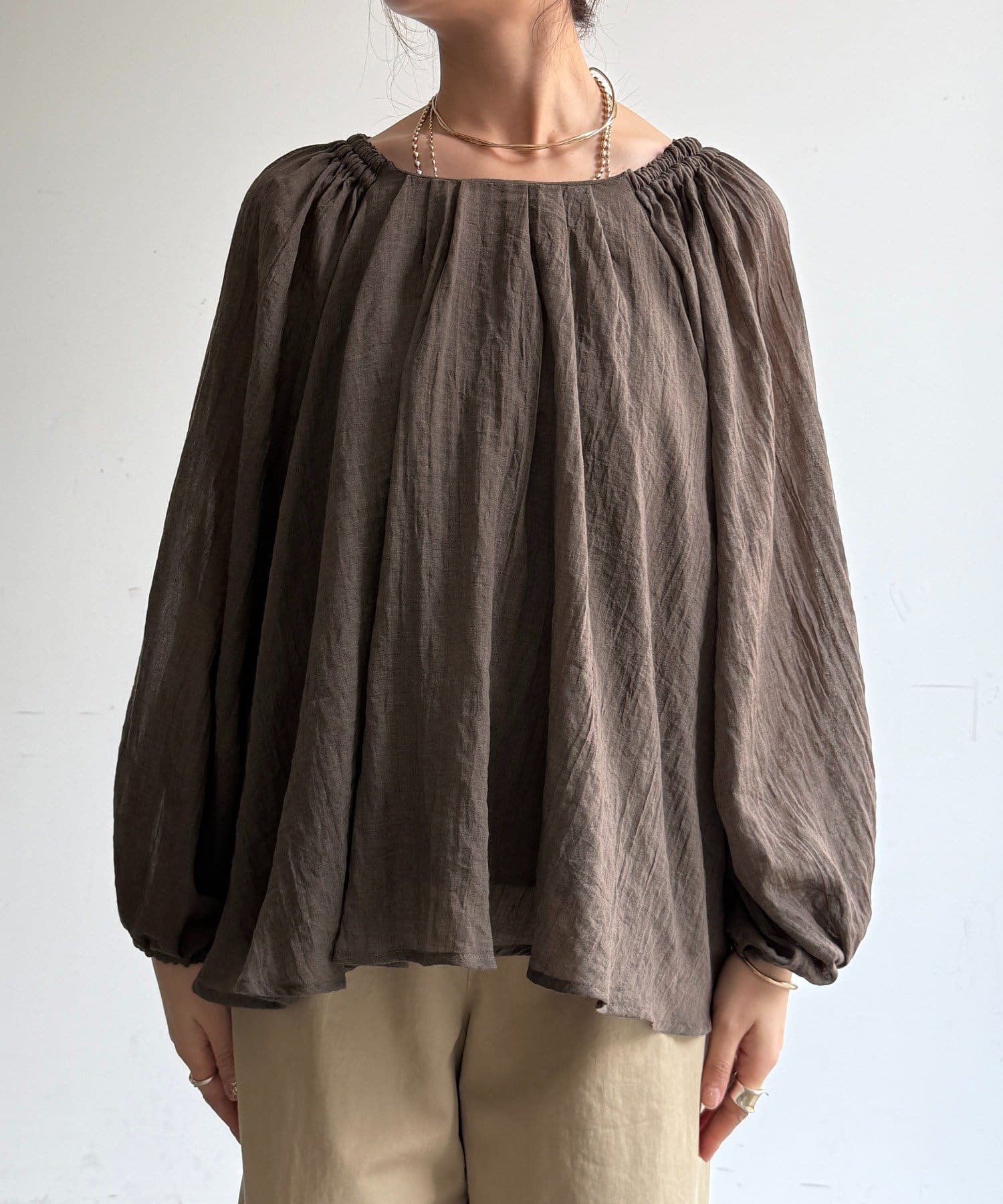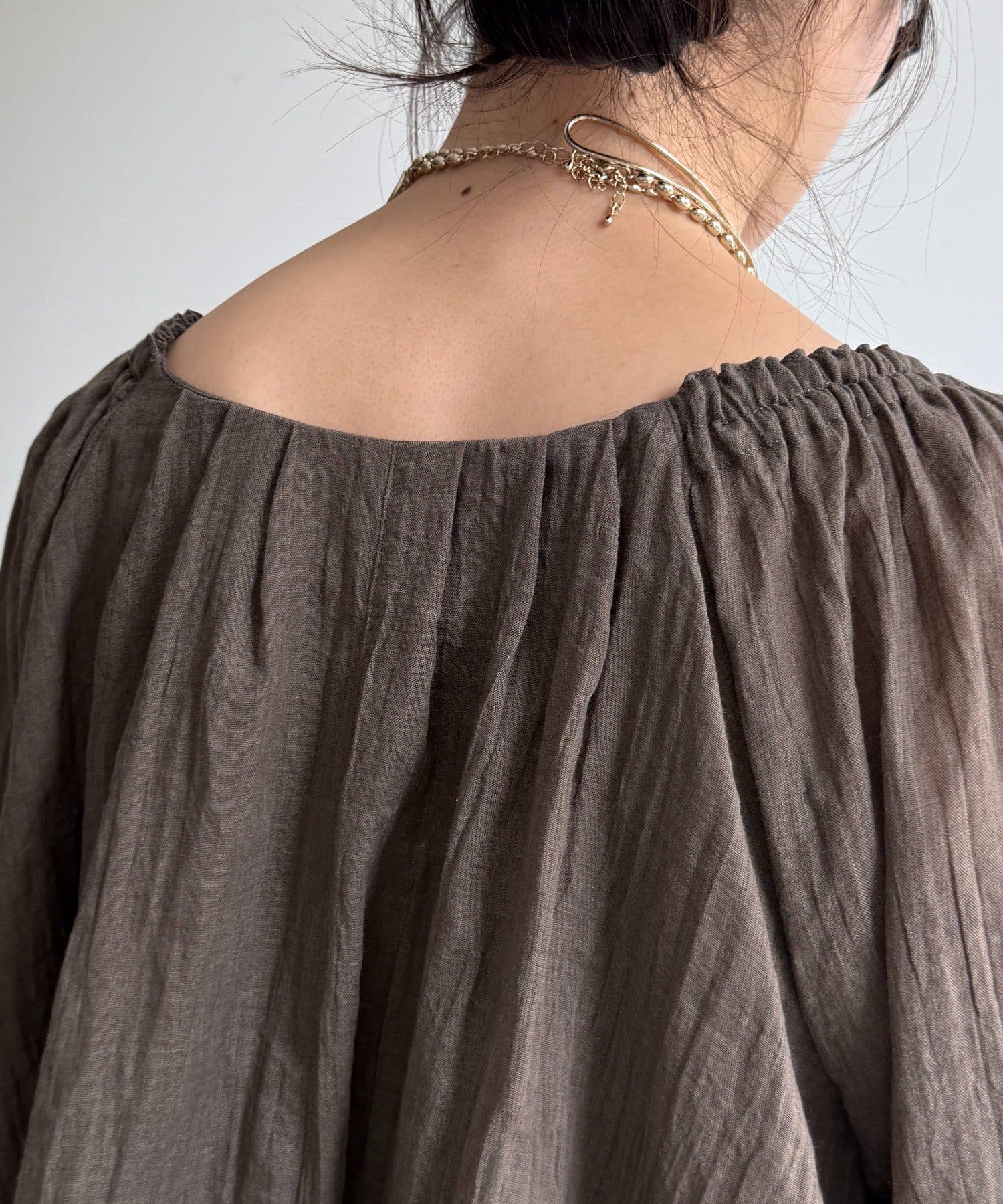 身頃にはたっぷりとギャザーが施されており、自然な立体感と柔らかなドレープを演出。