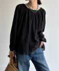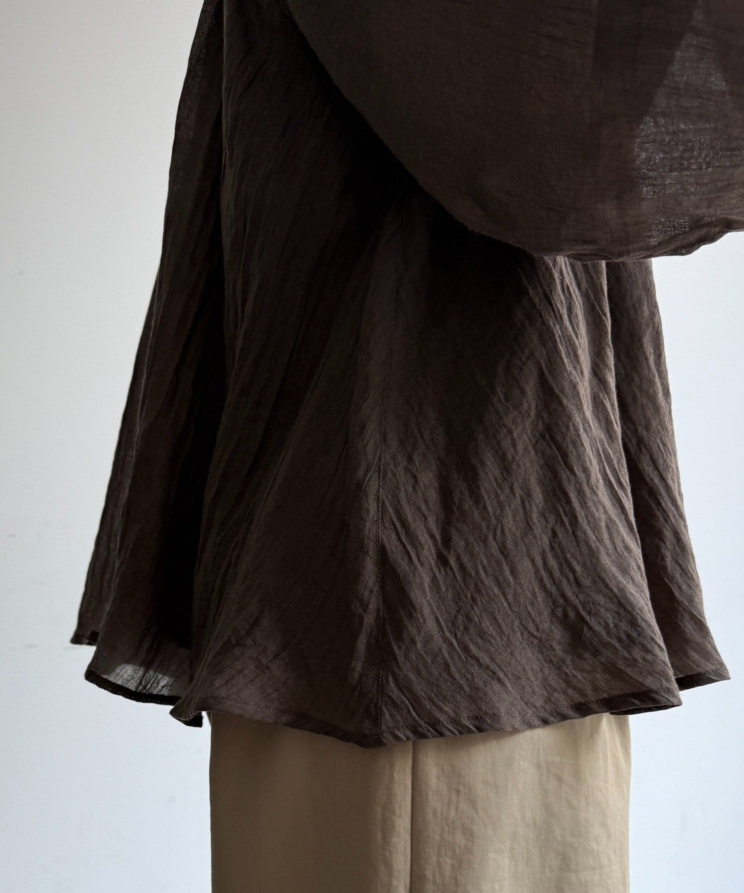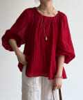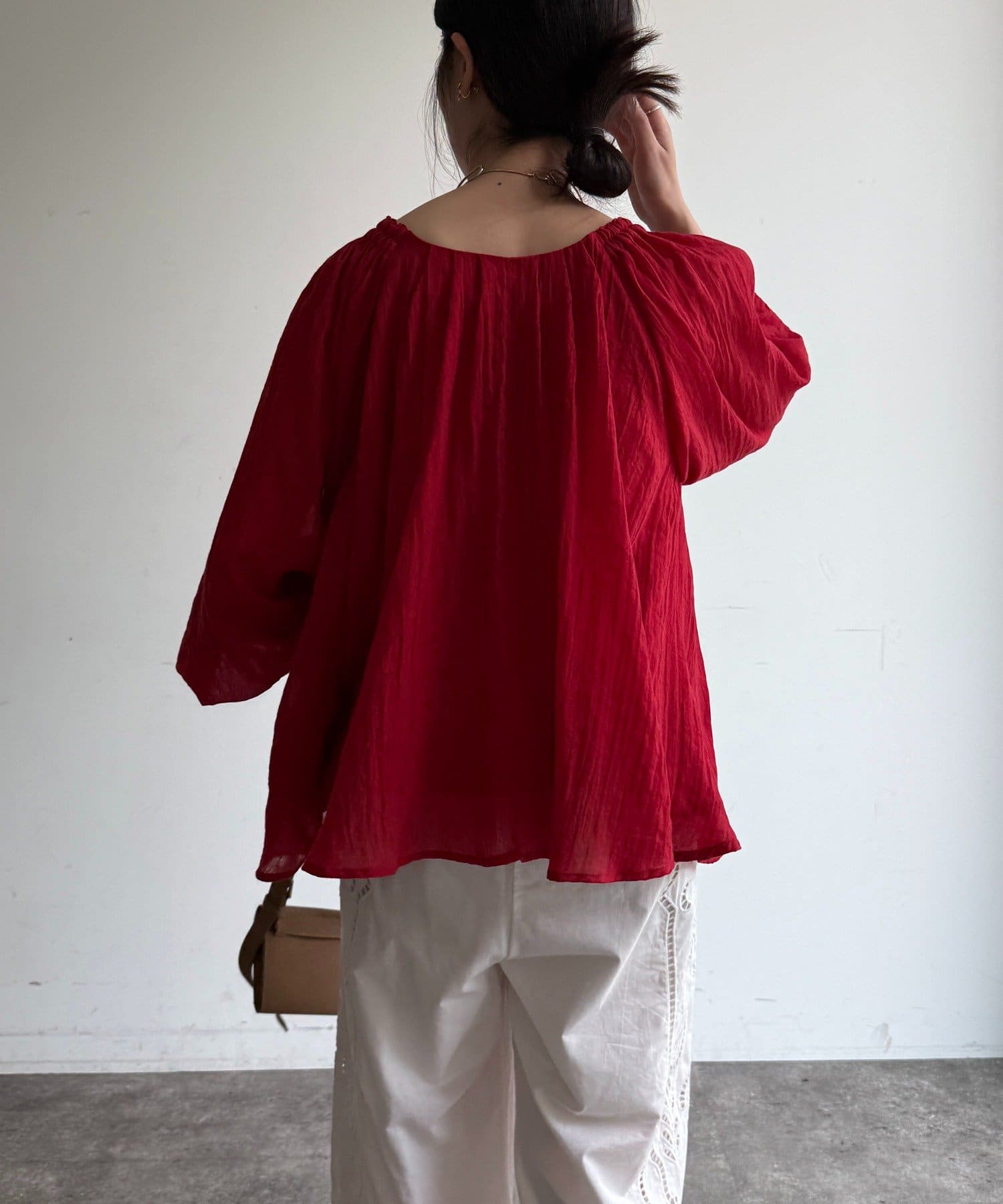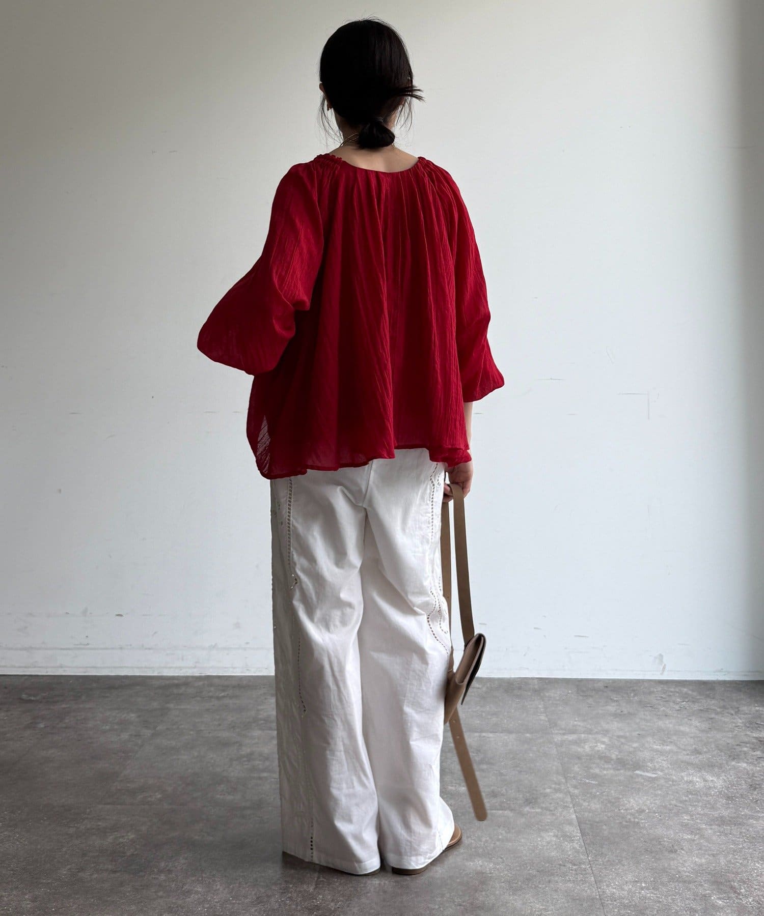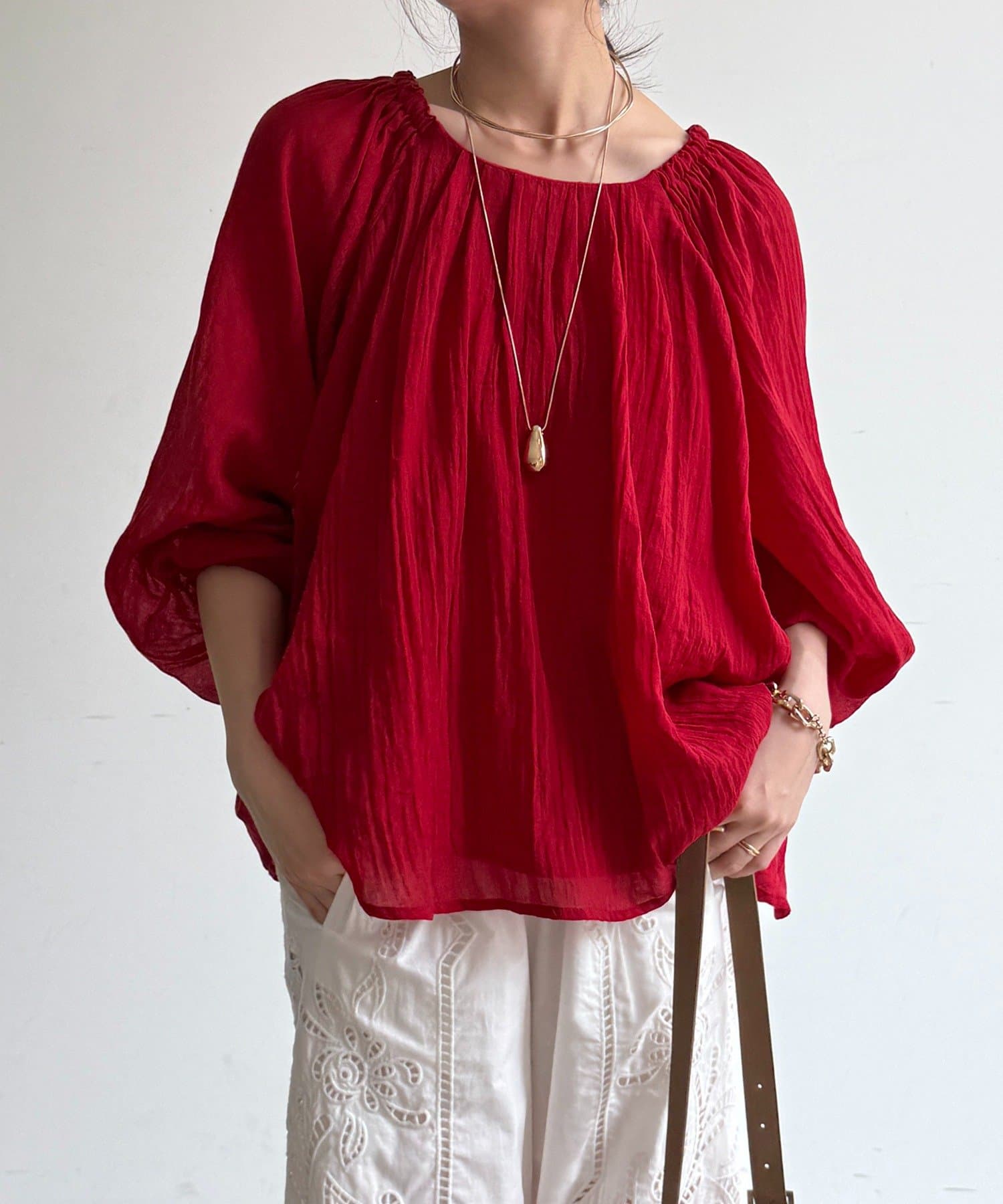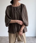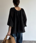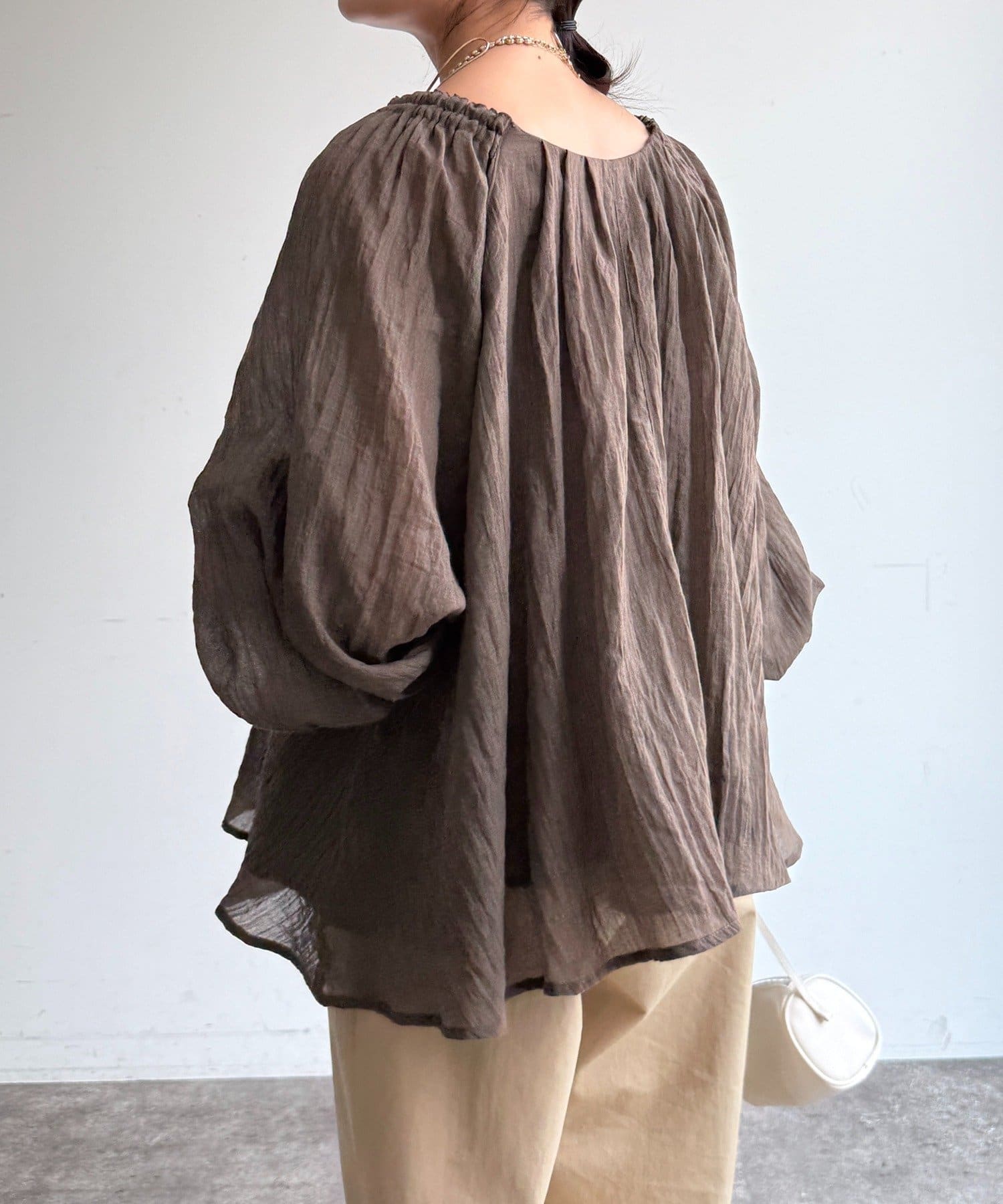 身頃にはたっぷりとギャザーが施されており、自然な立体感と柔らかなドレープを演出。