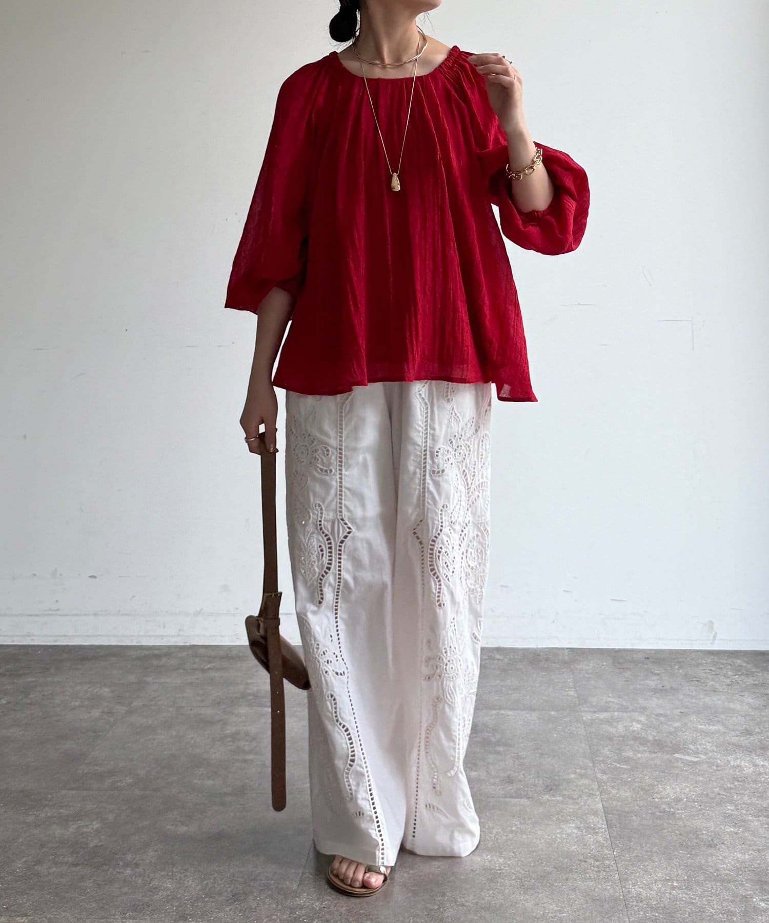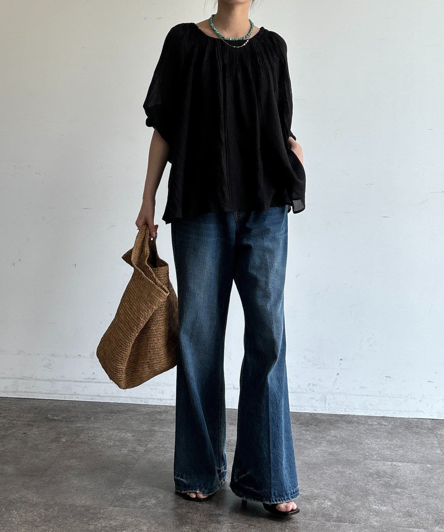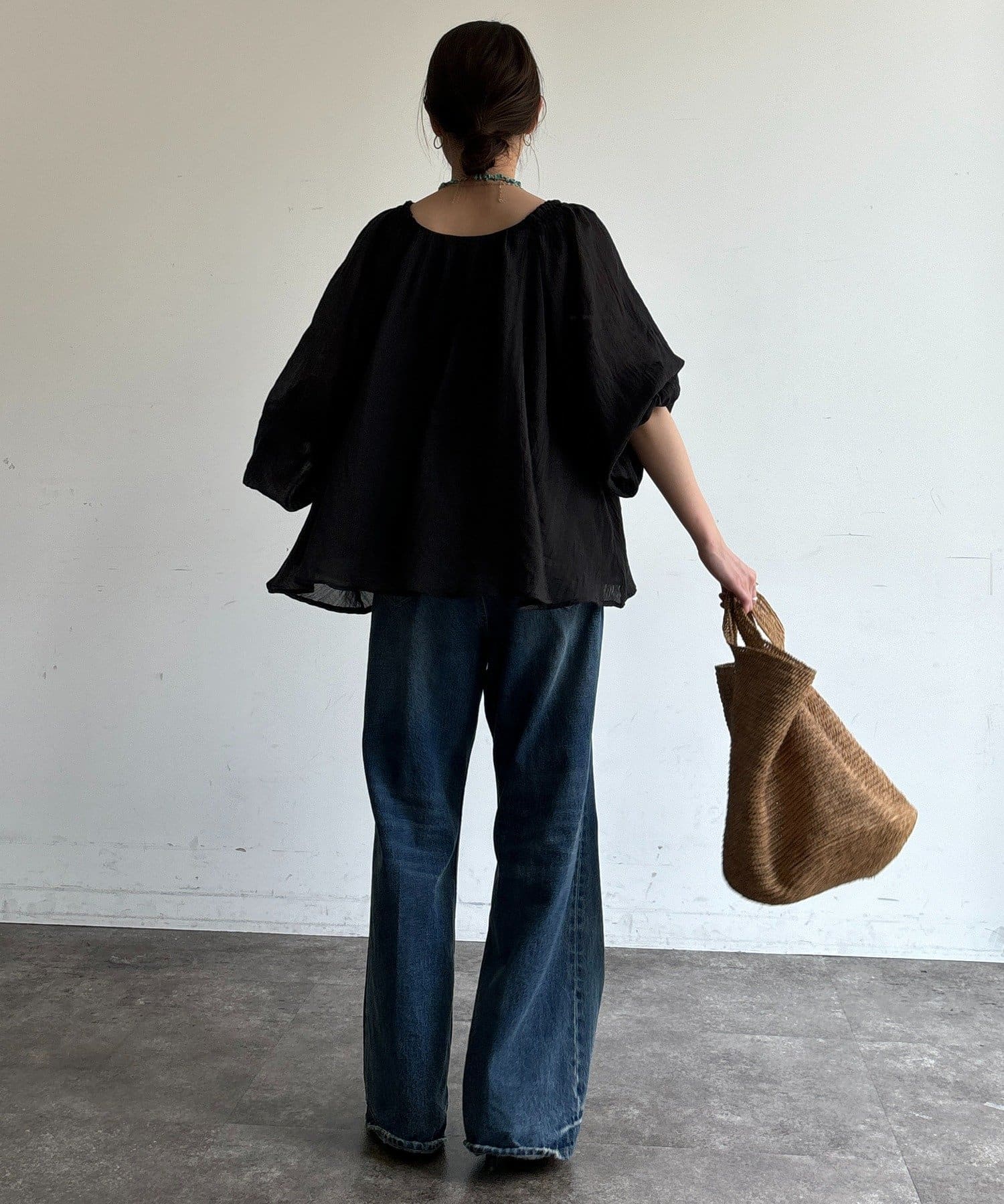 ふんわりとしたシルエットが身体のラインを拾いすぎず、軽やかで涼しげな印象に仕上げてくれます。
