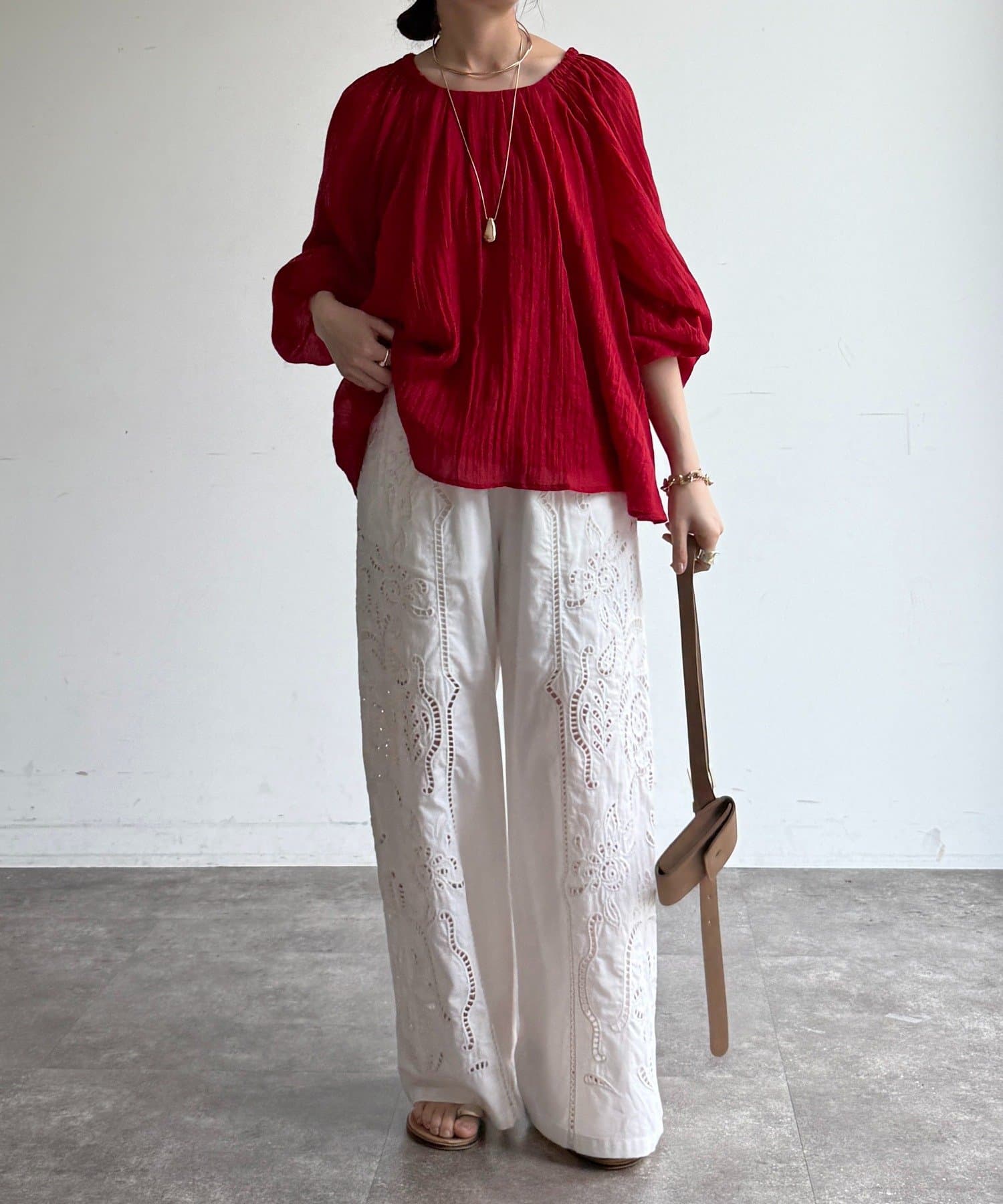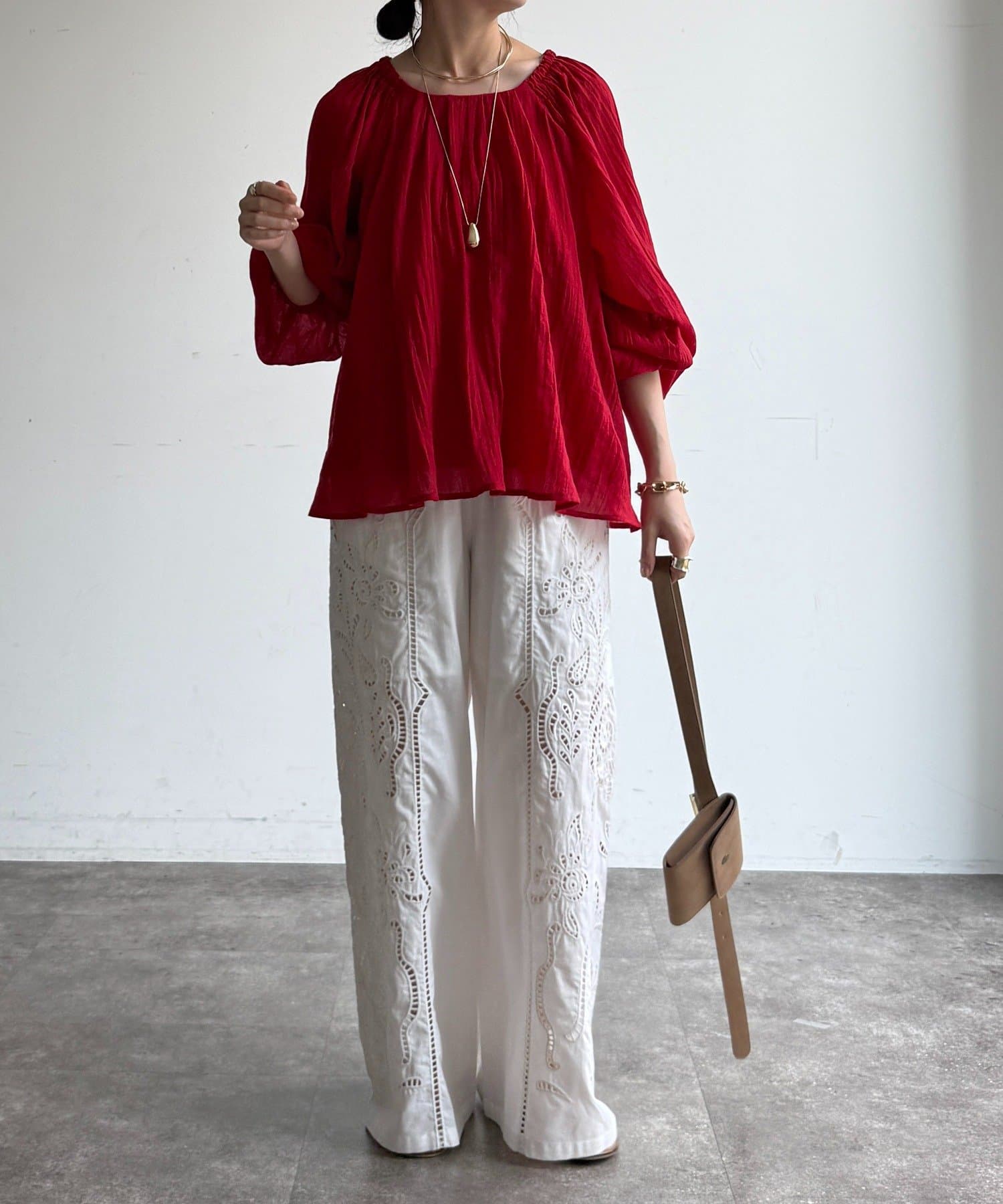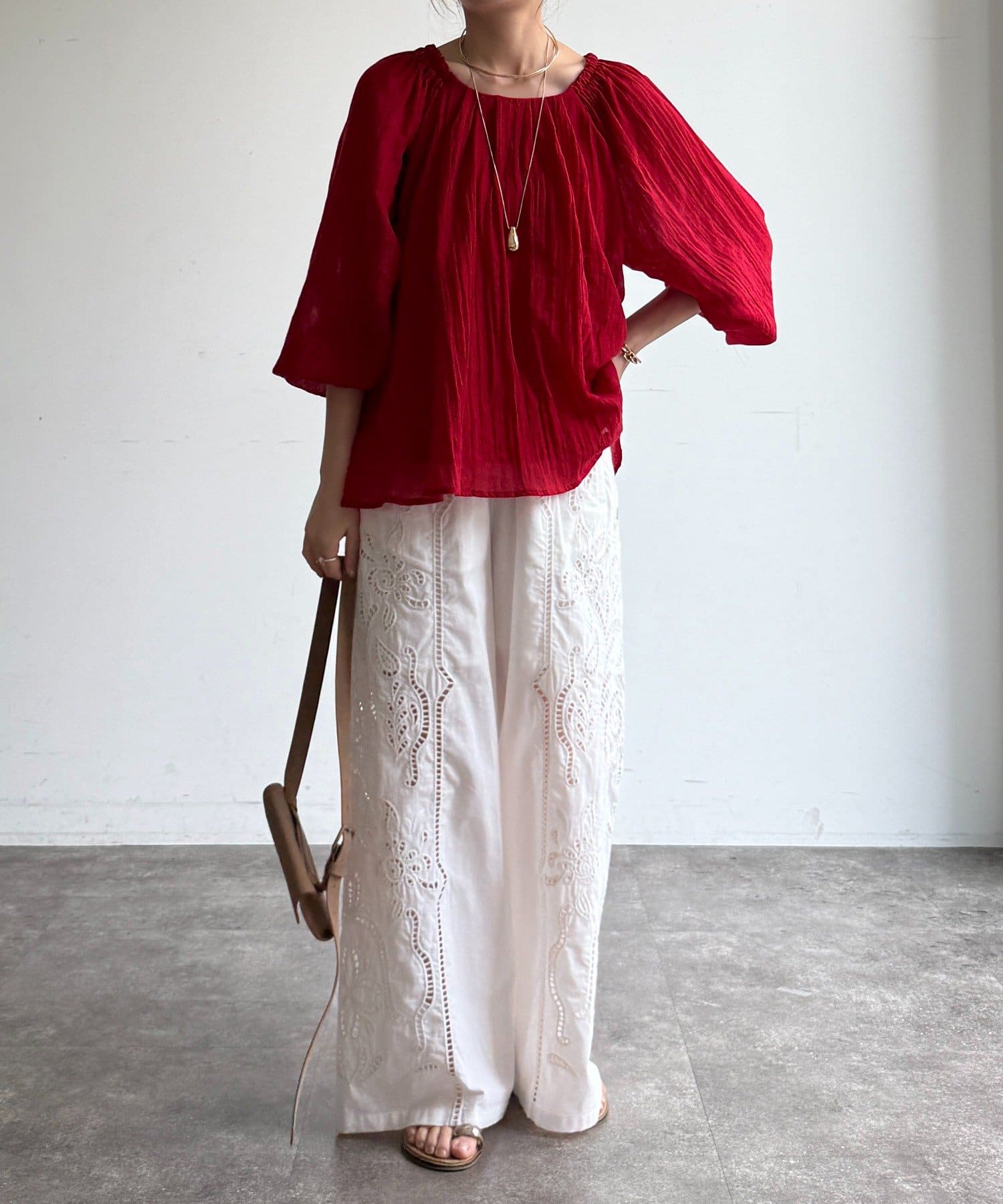 ふんわりとしたシルエットが身体のラインを拾いすぎず、軽やかで涼しげな印象に仕上げてくれます。