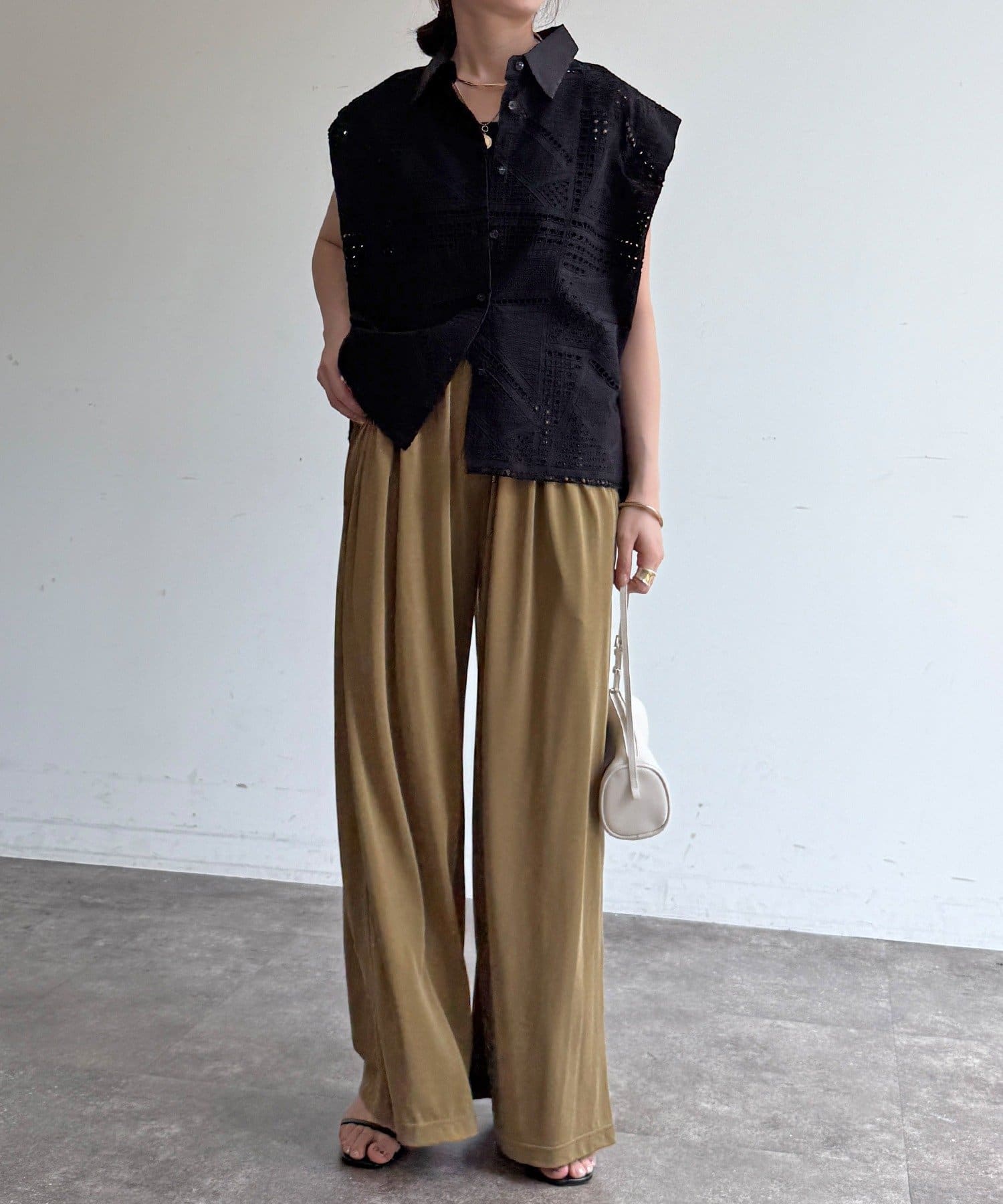 肩先を少し纏うデザインになっており、ノースリーブながらも