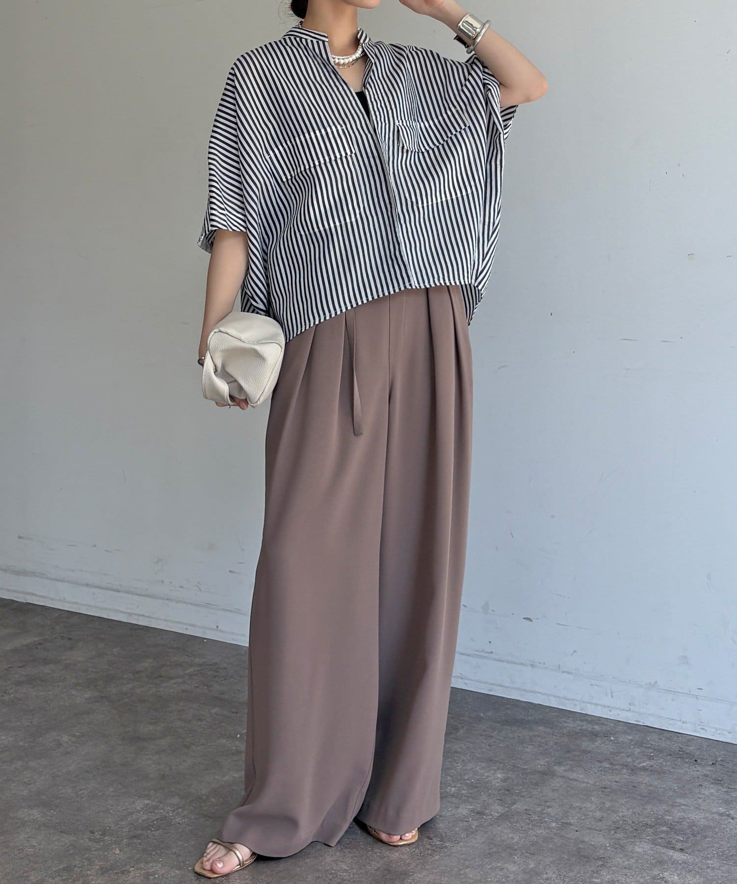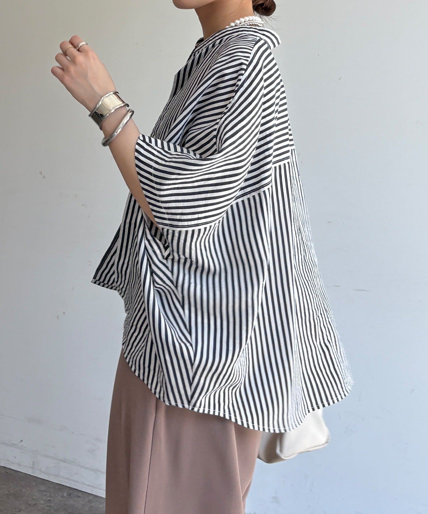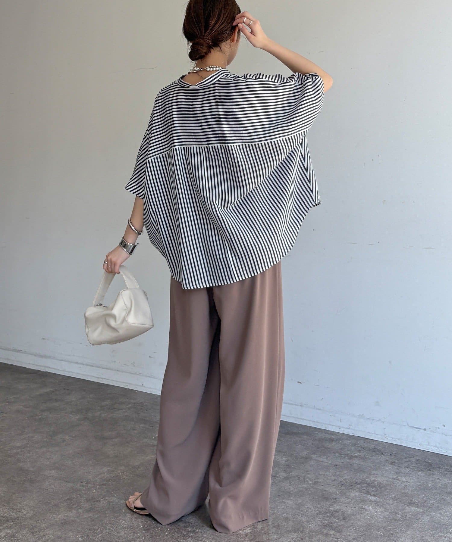 肩が落ちたドロップショルダーが二の腕を自然とカバーし、抜け感を演出します。