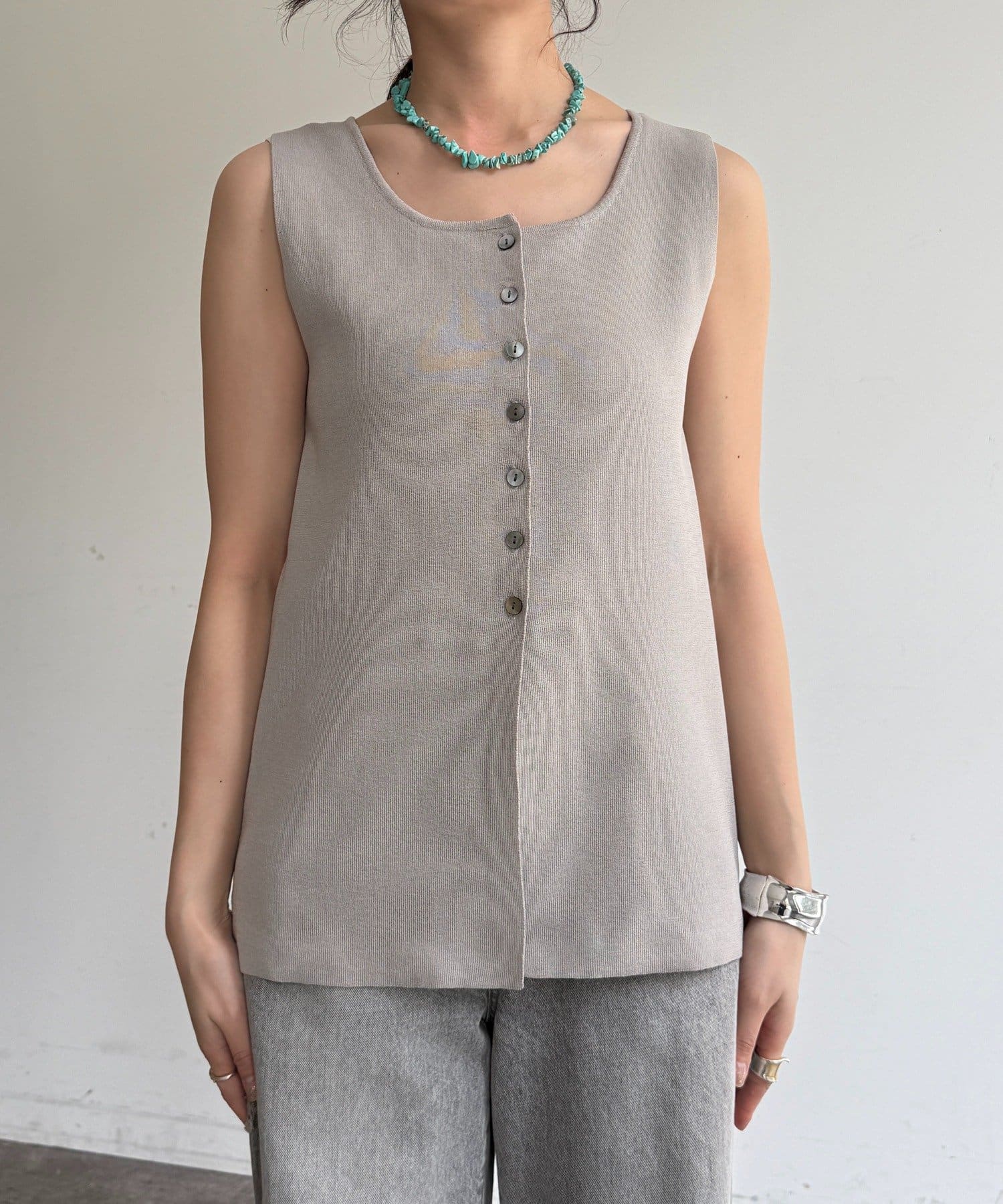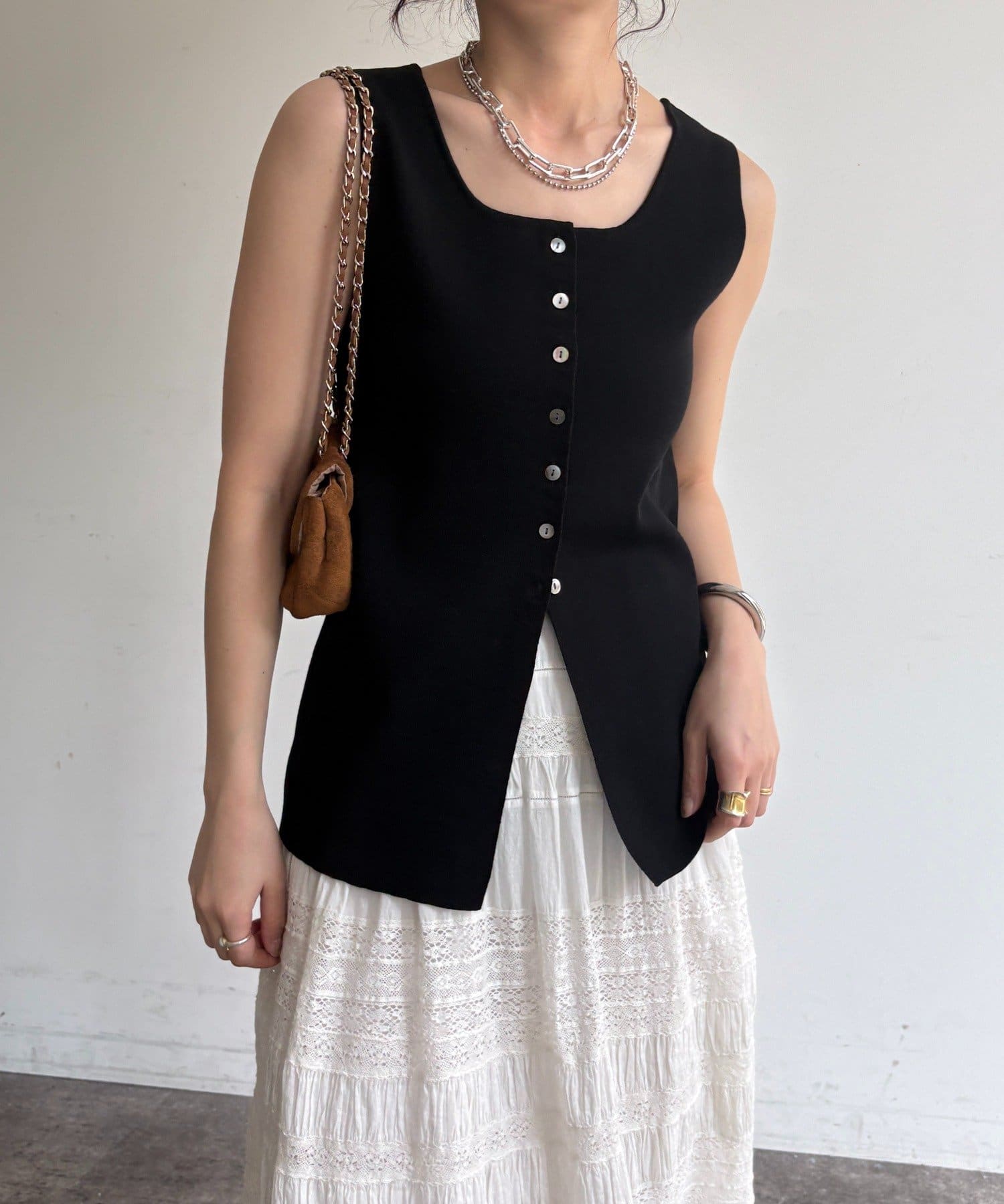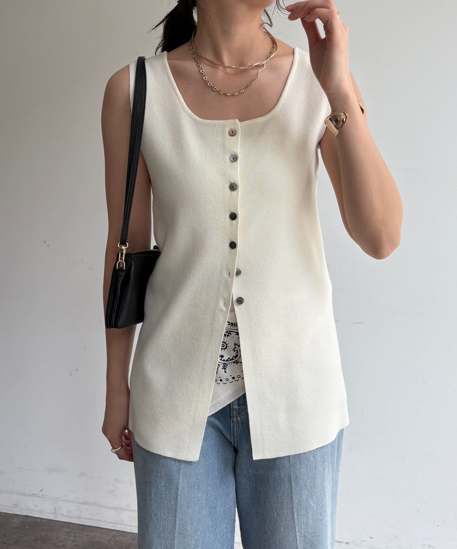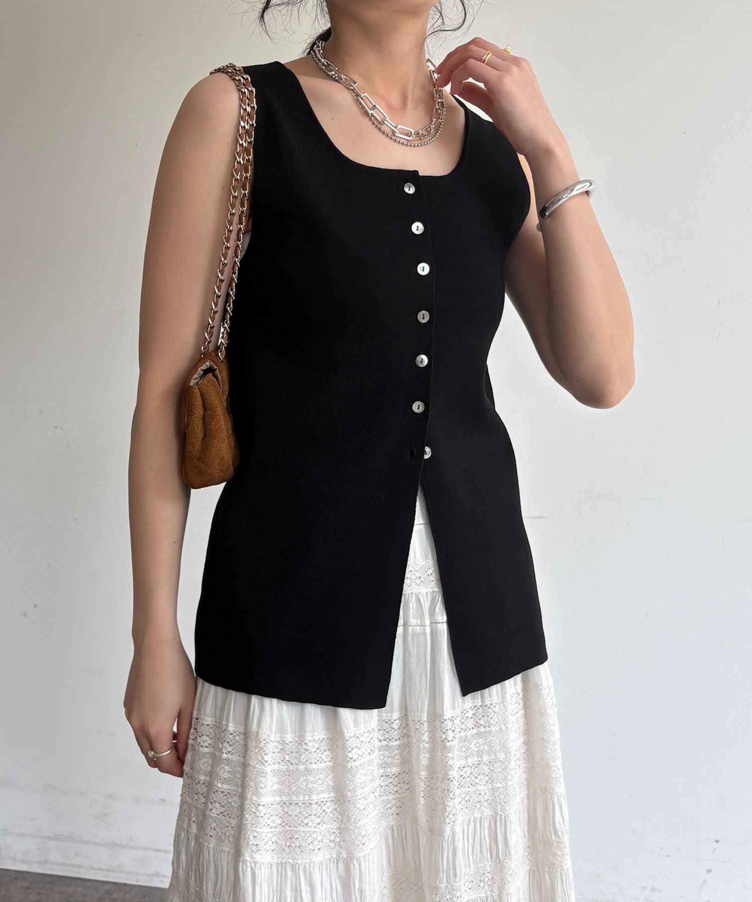 すっきりとしたシルエットと上品なディテールが魅力のフロントボタンスクエアニットタンク。