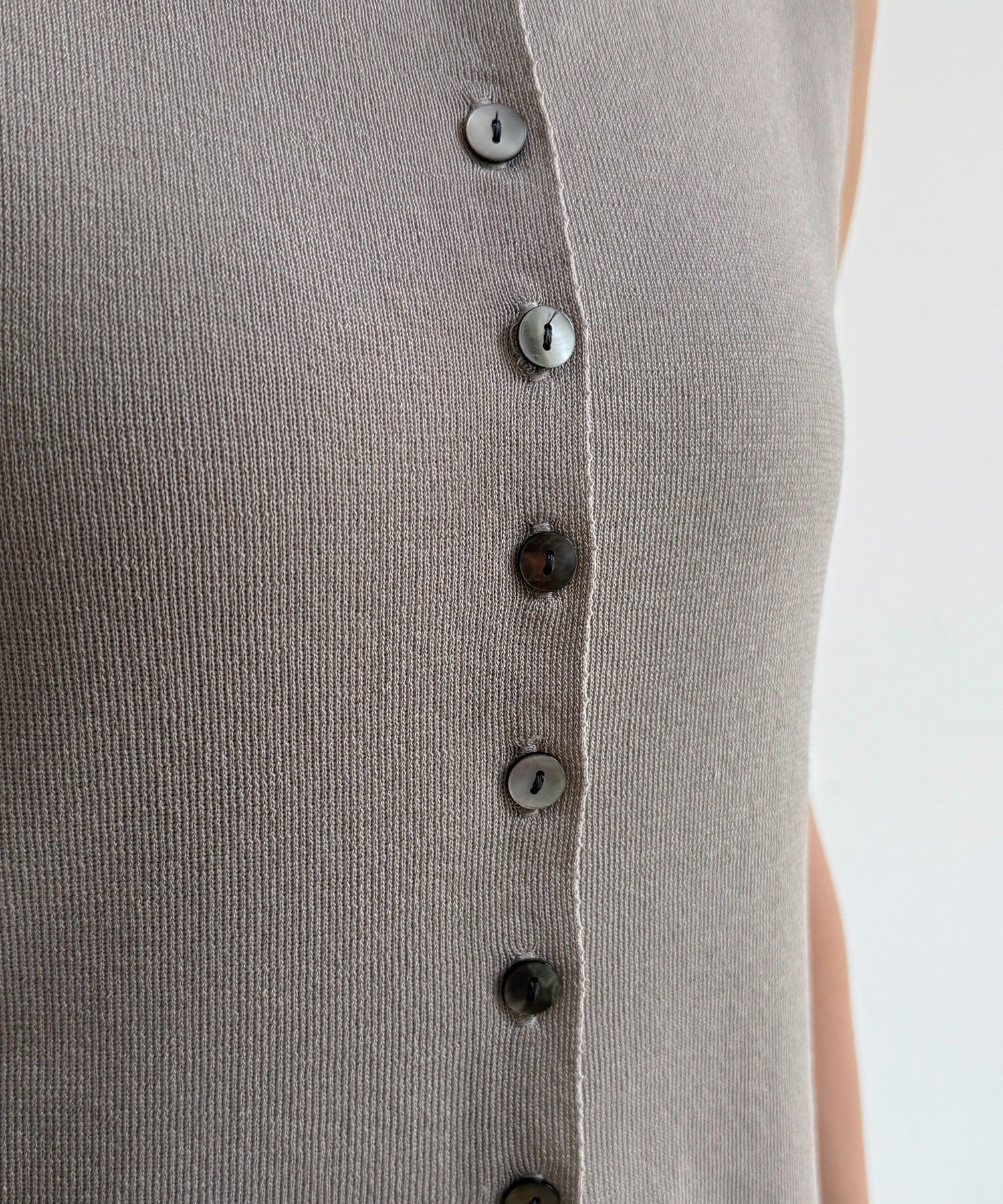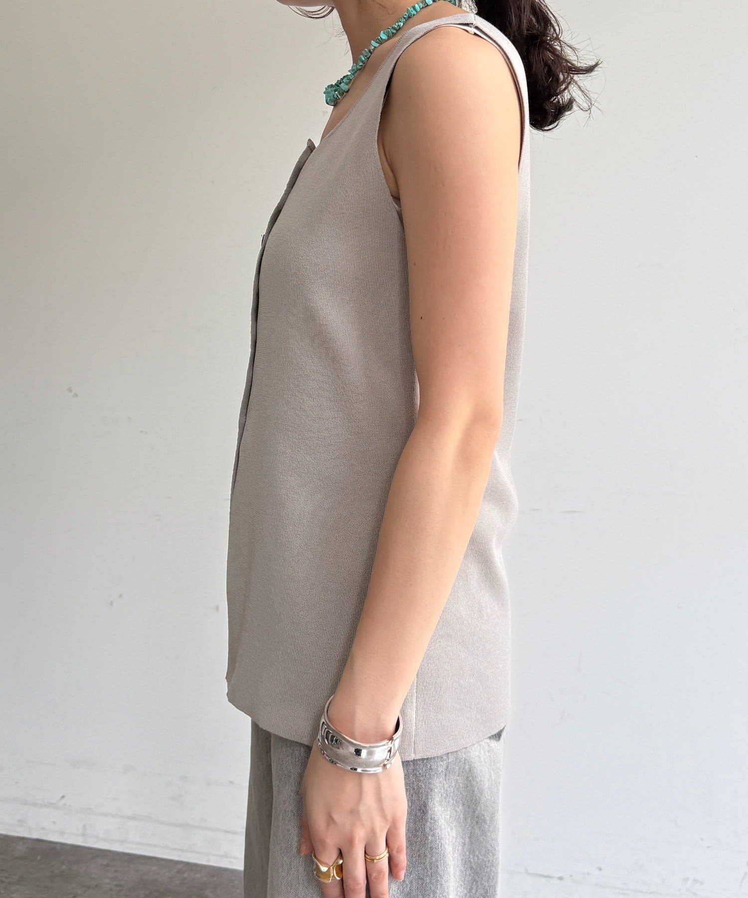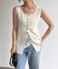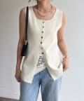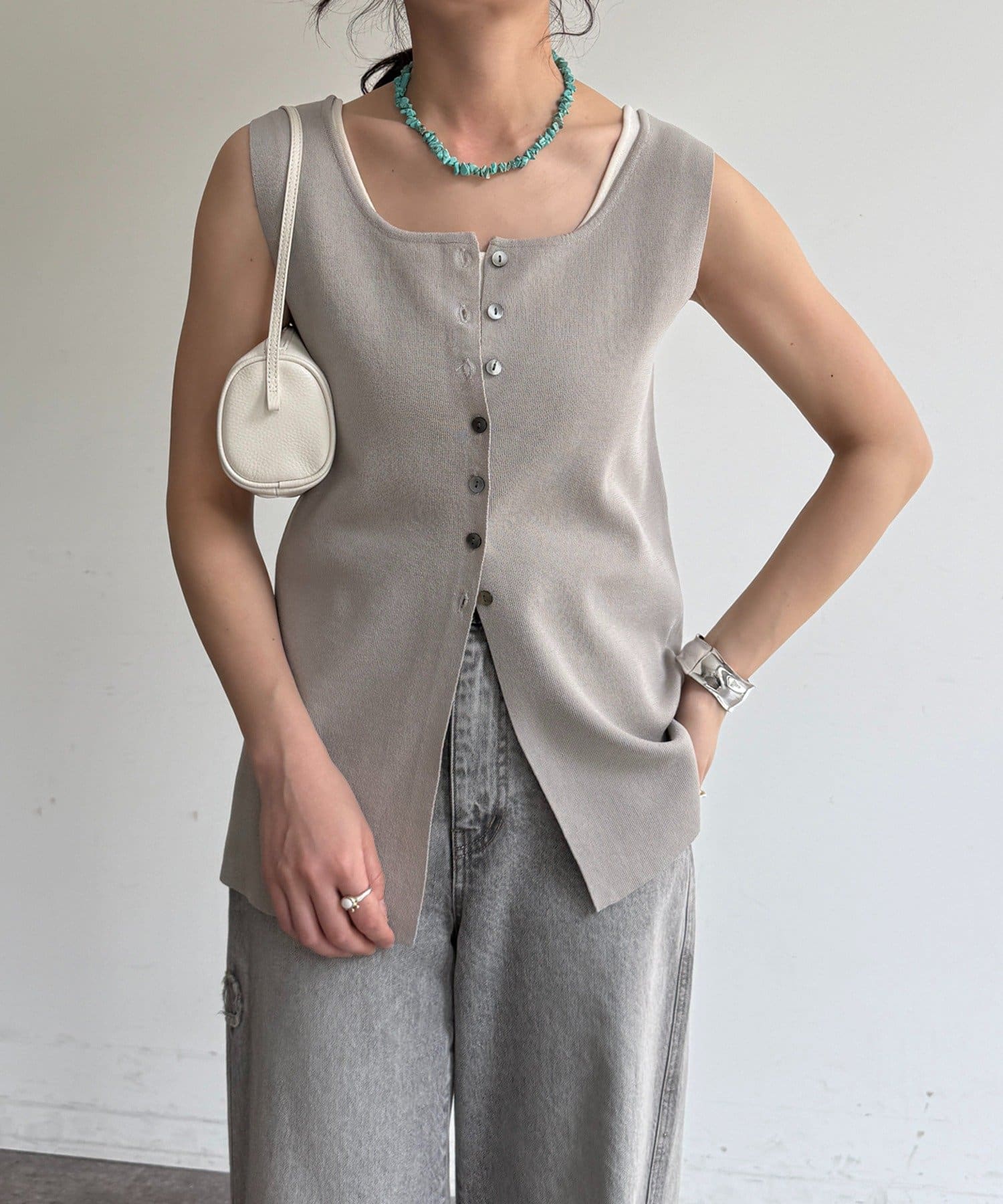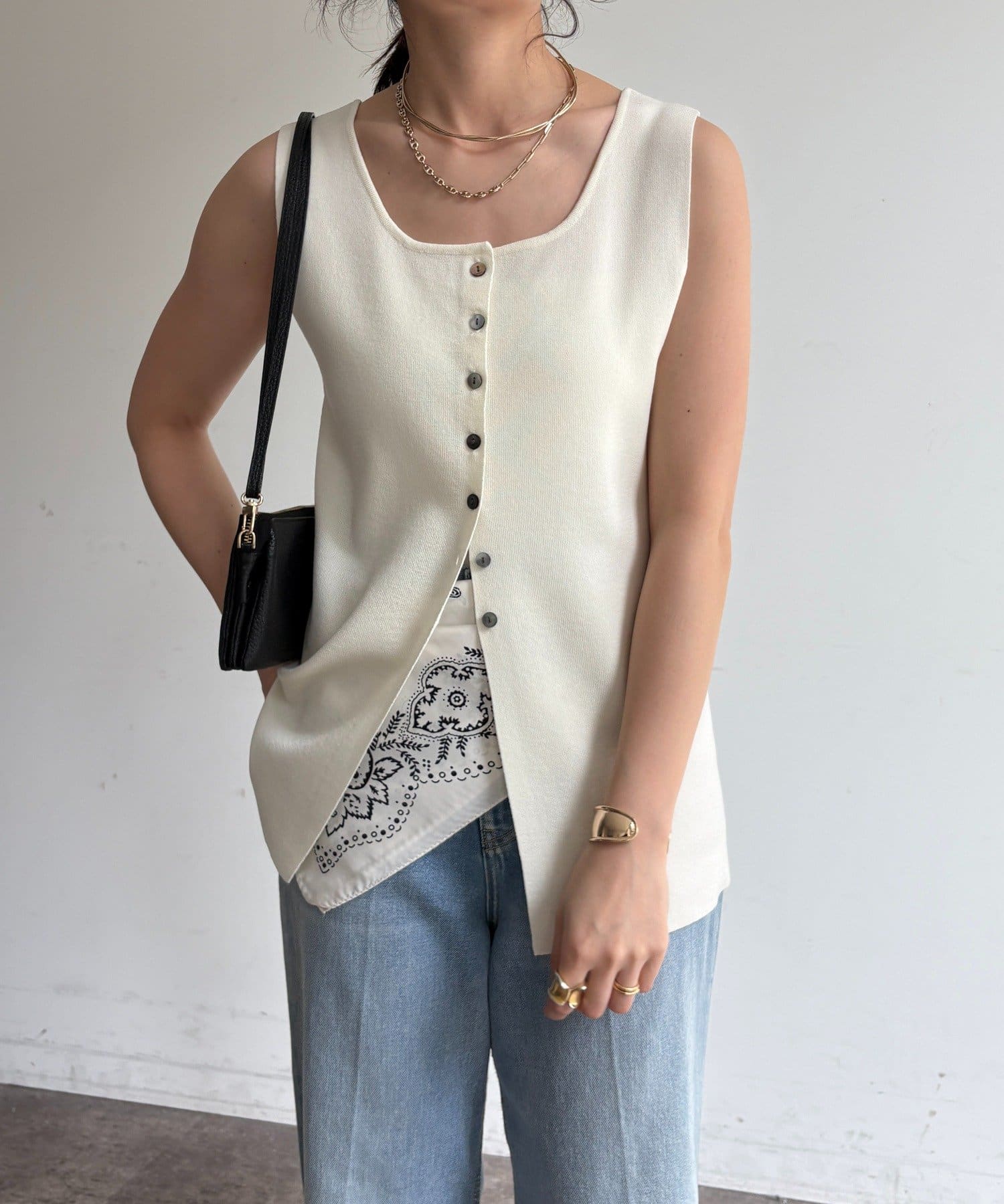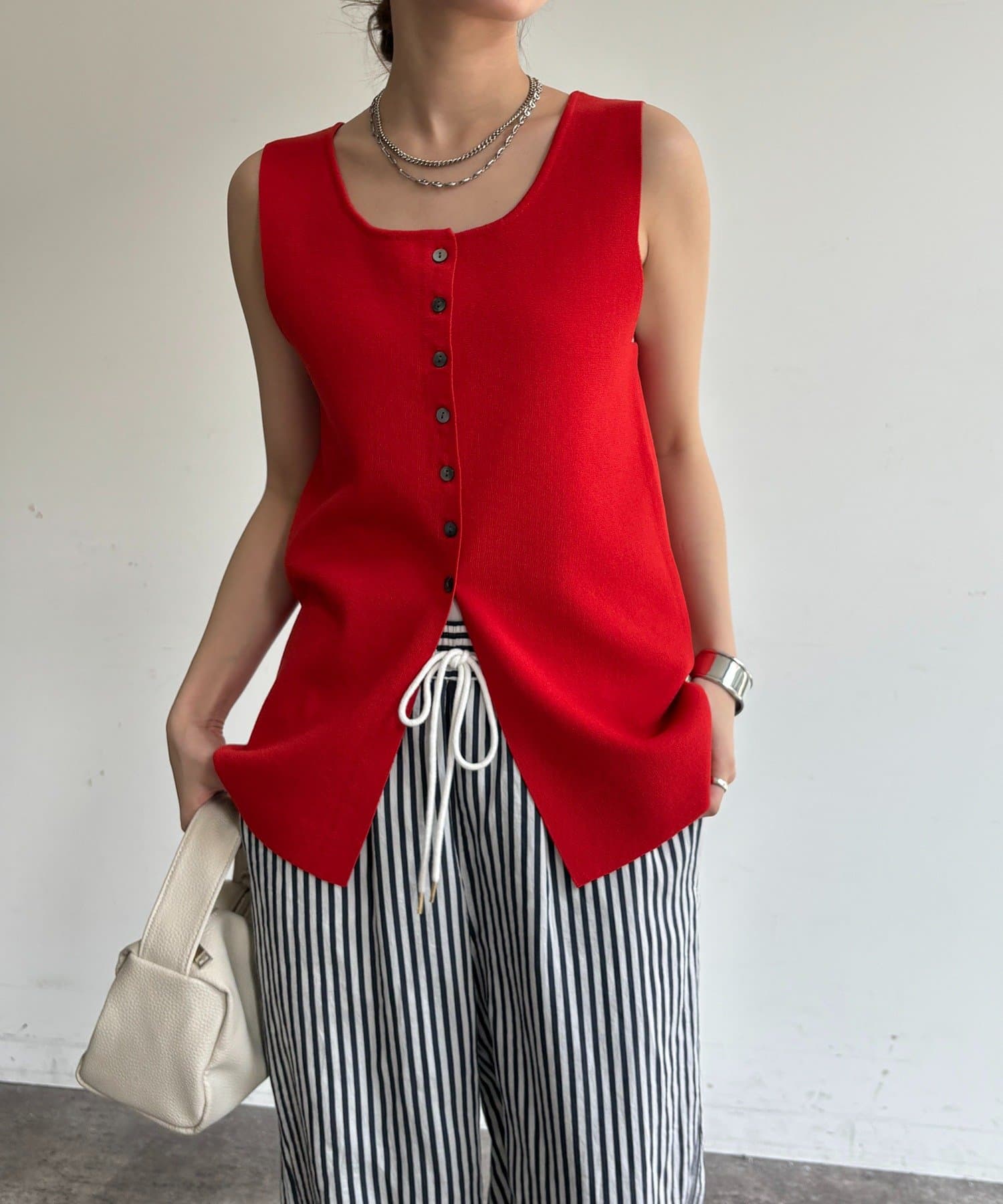 すっきりとしたシルエットと上品なディテールが魅力のフロントボタンスクエアニットタンク。