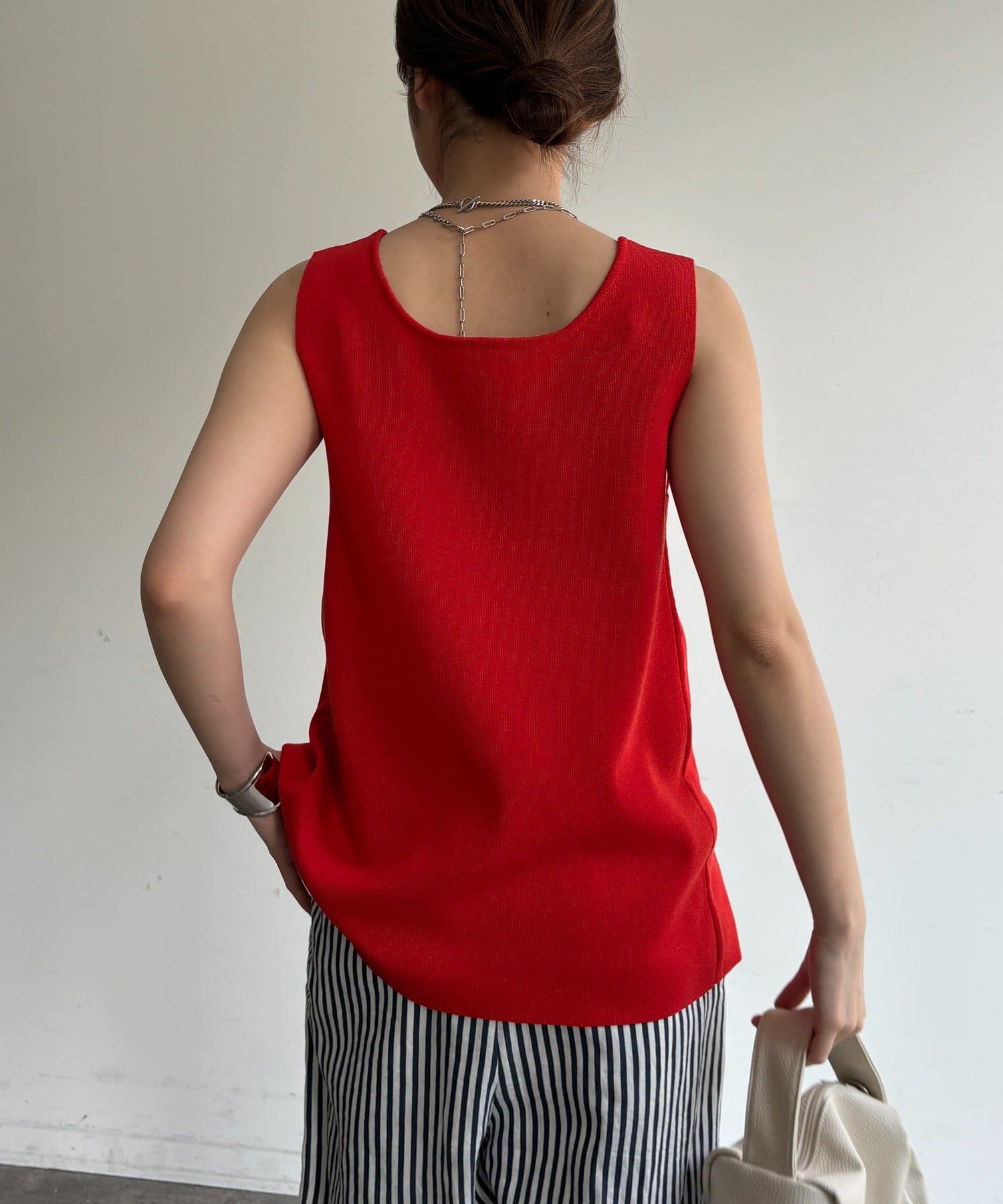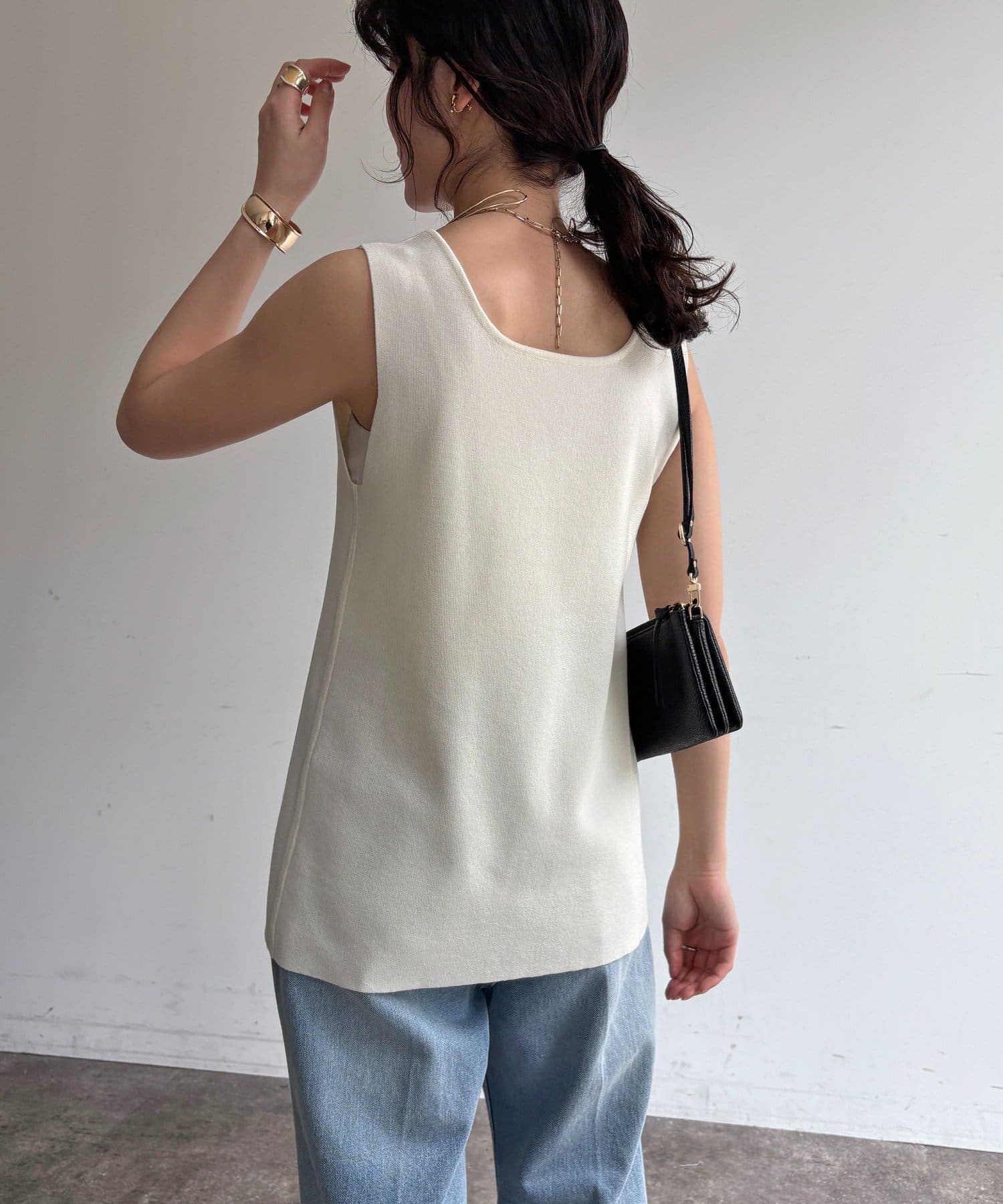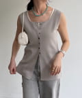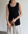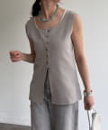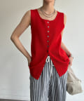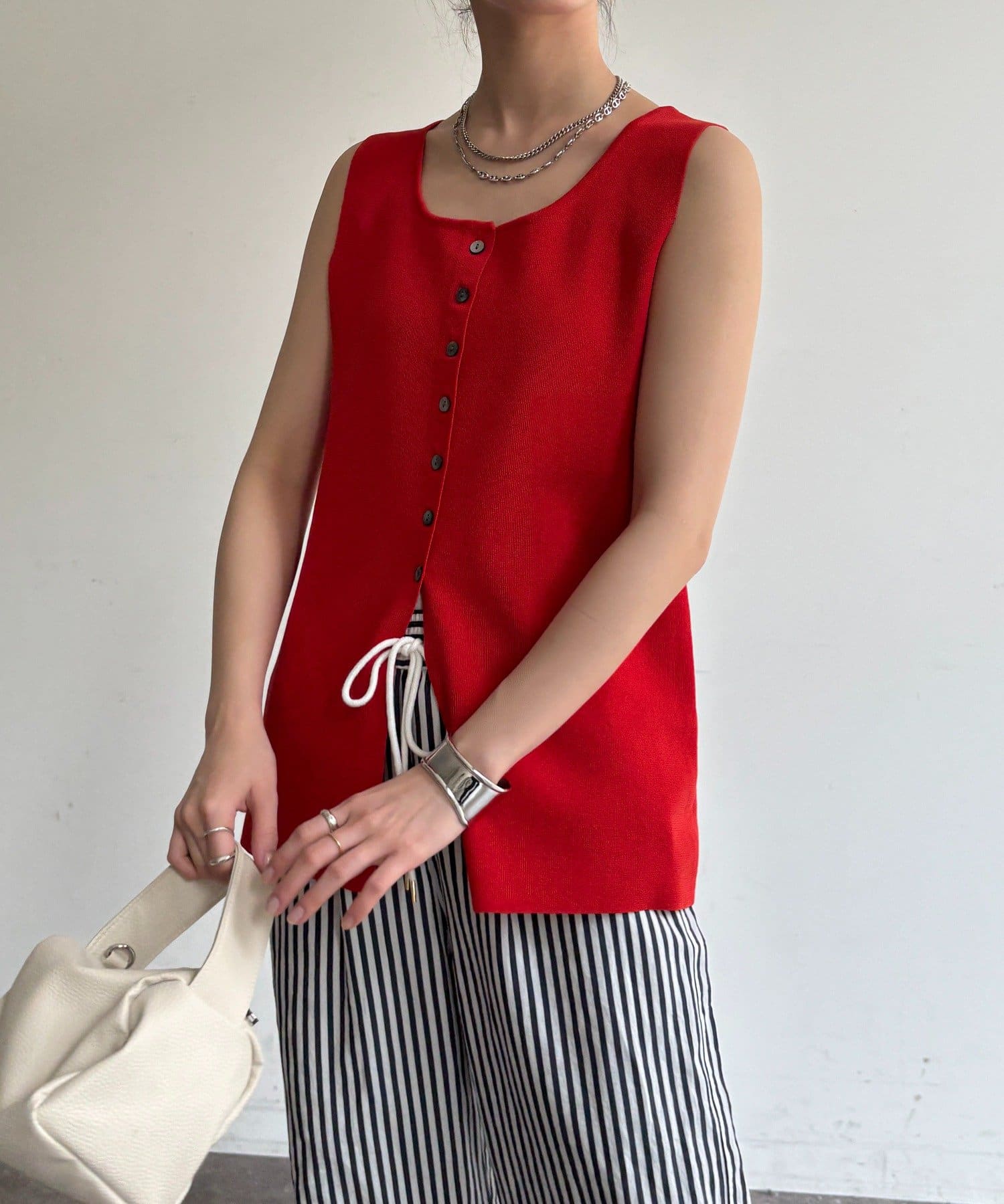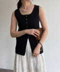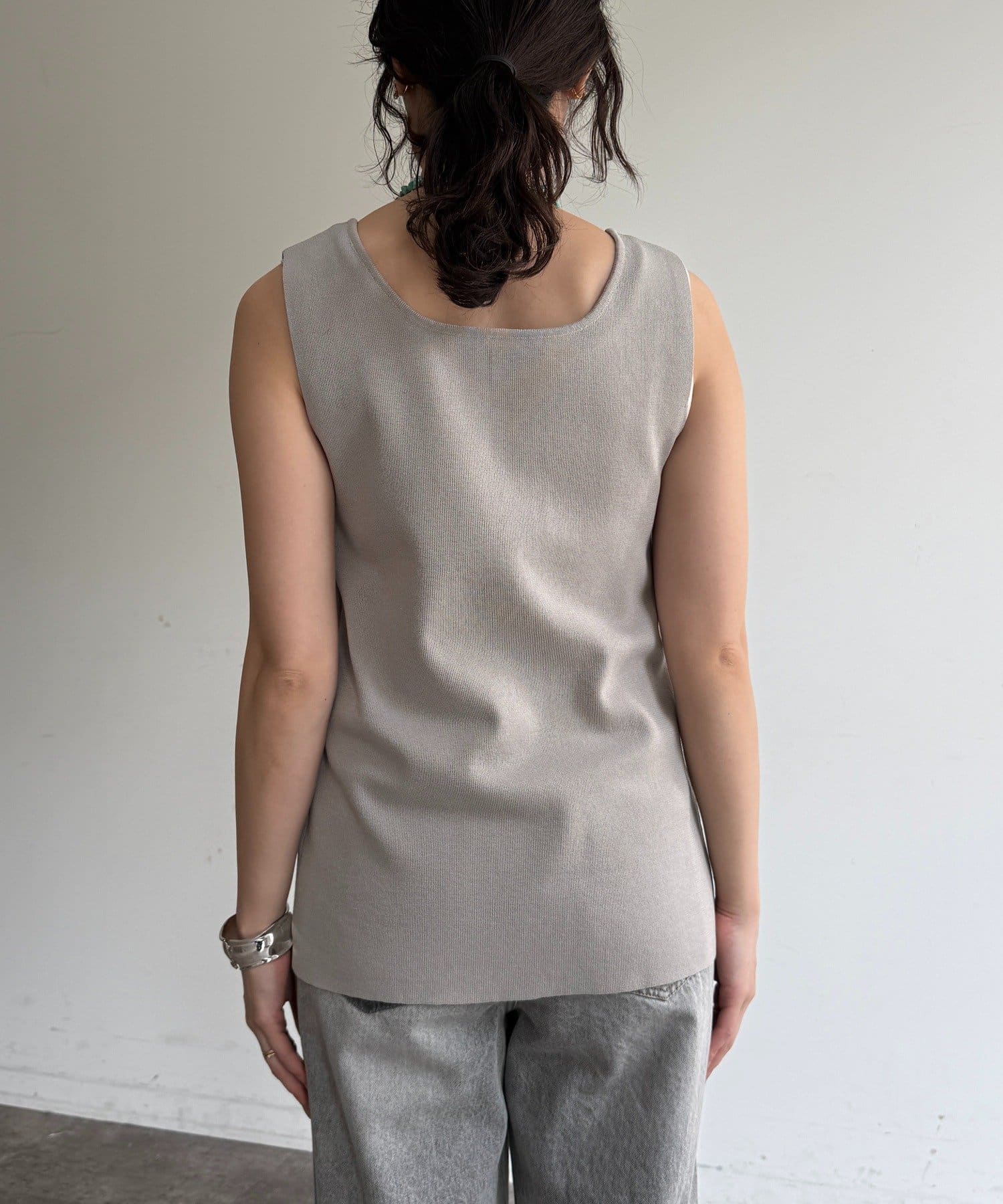 すっきりとしたシルエットと上品なディテールが魅力のフロントボタンスクエアニットタンク。